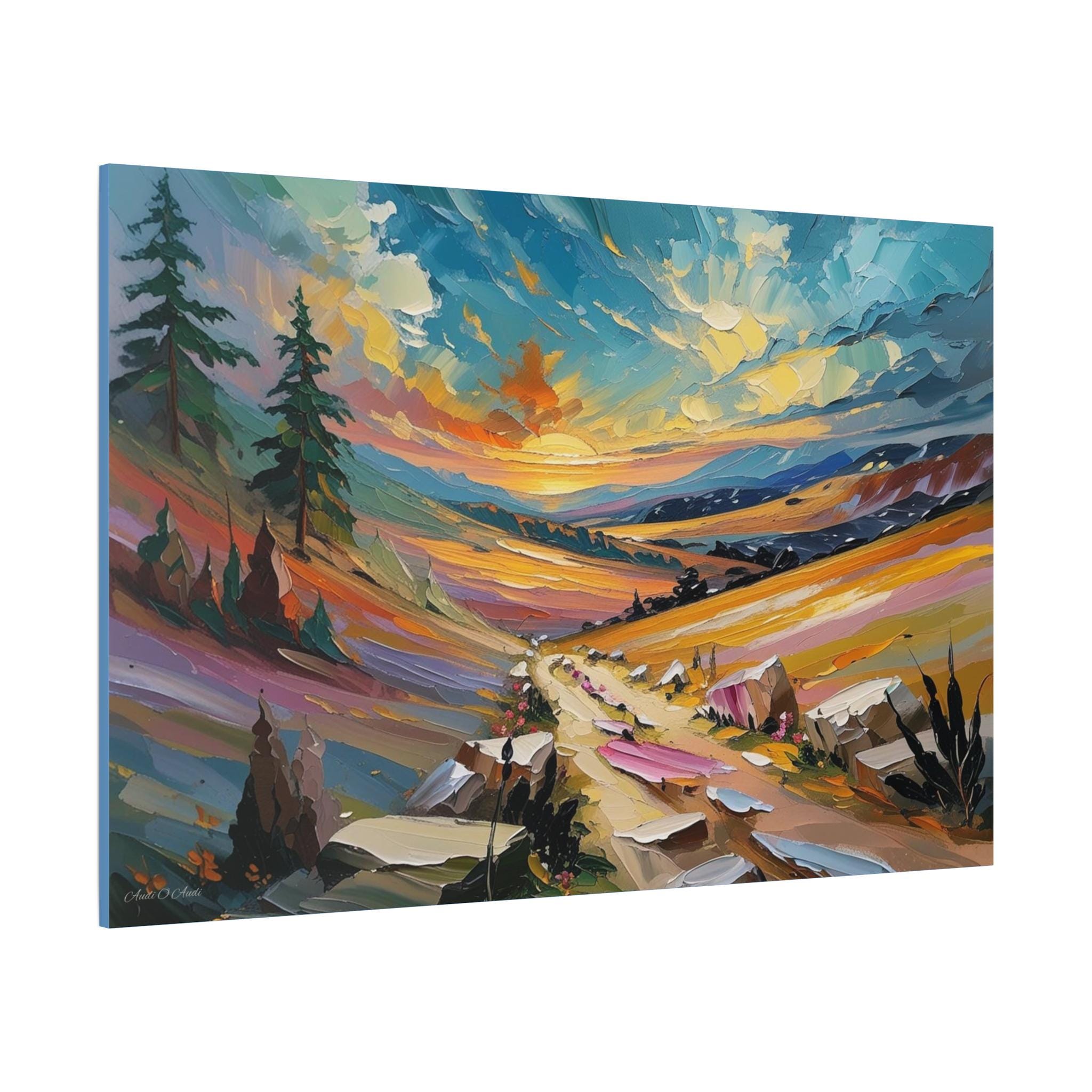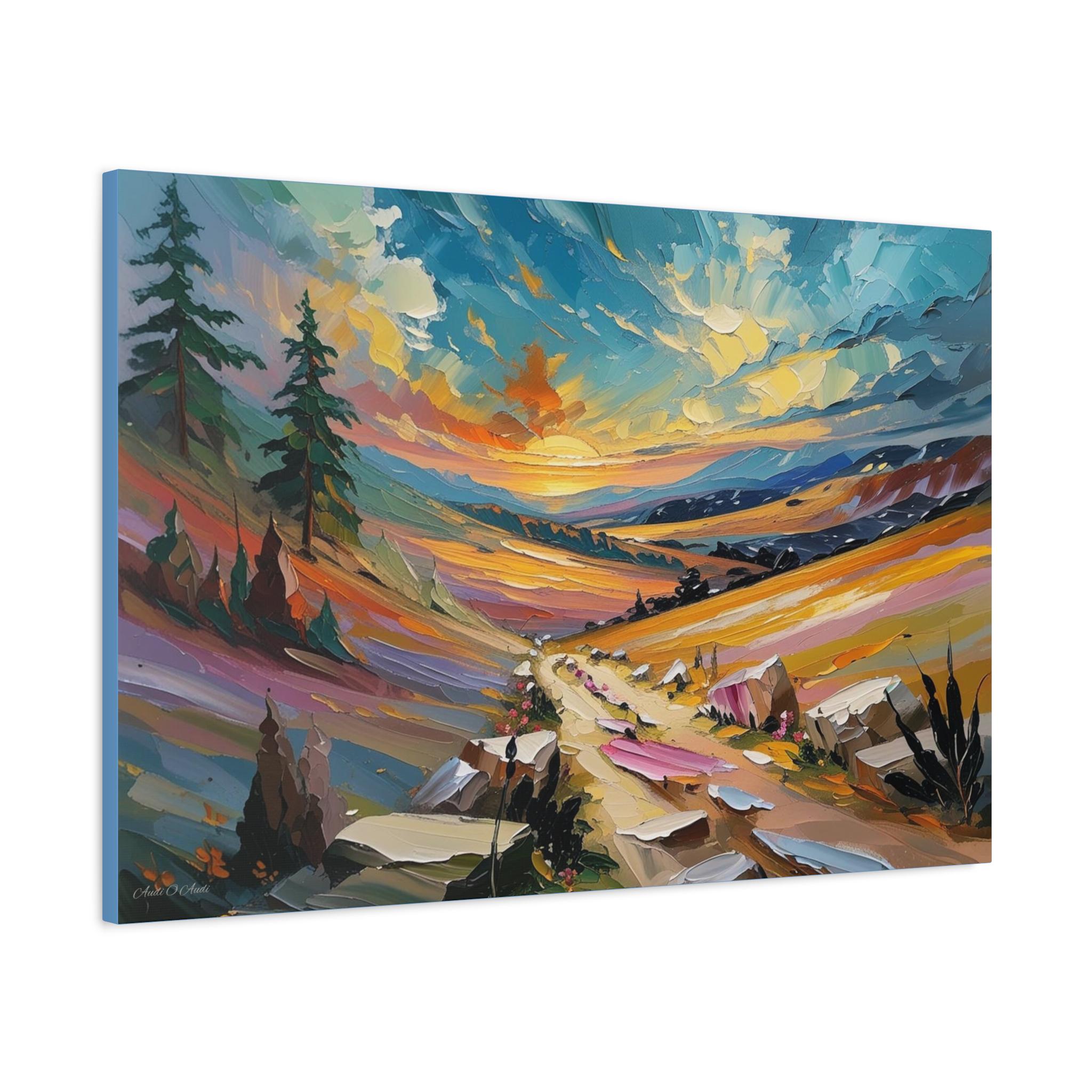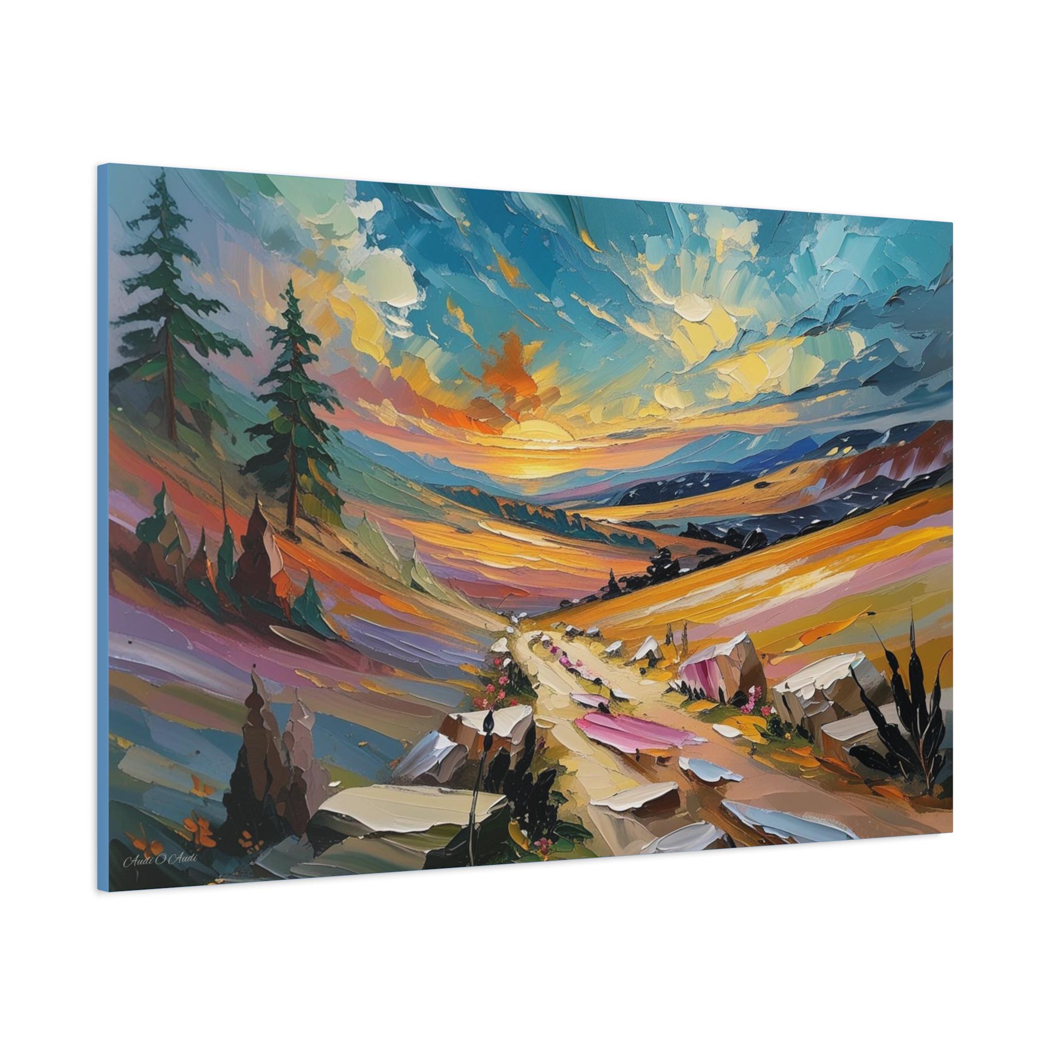 The print utilizes a dramatic low-angle perspective, featuring a small, rough path that draws the viewer into the vast distance. The vertical scale of the tall, stylized pine trees on the left provides a crucial compositional anchor against the sweeping horizontal bands of color. The final canvas print offers a vivid, hyper-sensory experience of nature, faithfully capturing the fleeting emotional power of the original dramatic sunset through brilliant color and sharp reproduction of the painted texture.Product features
