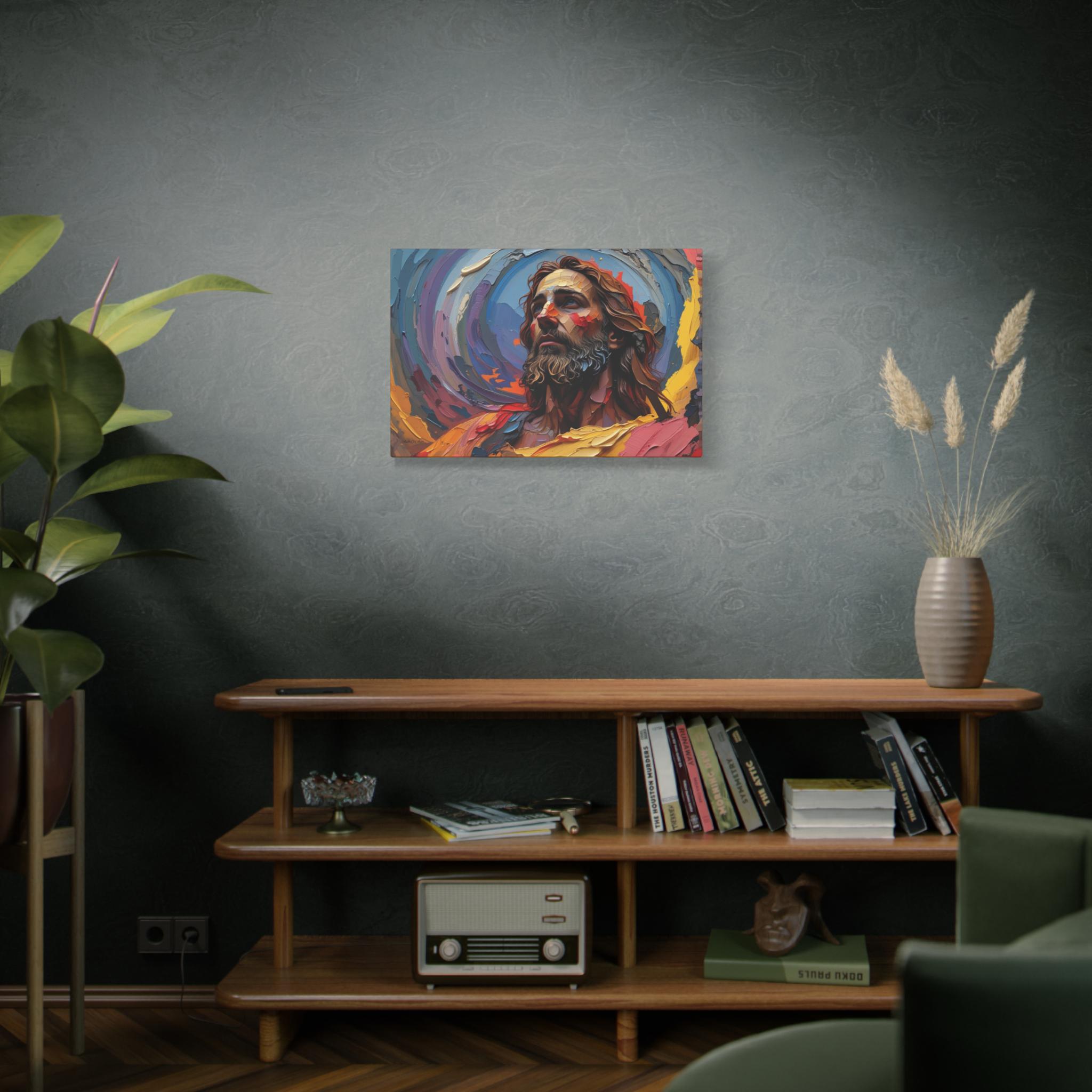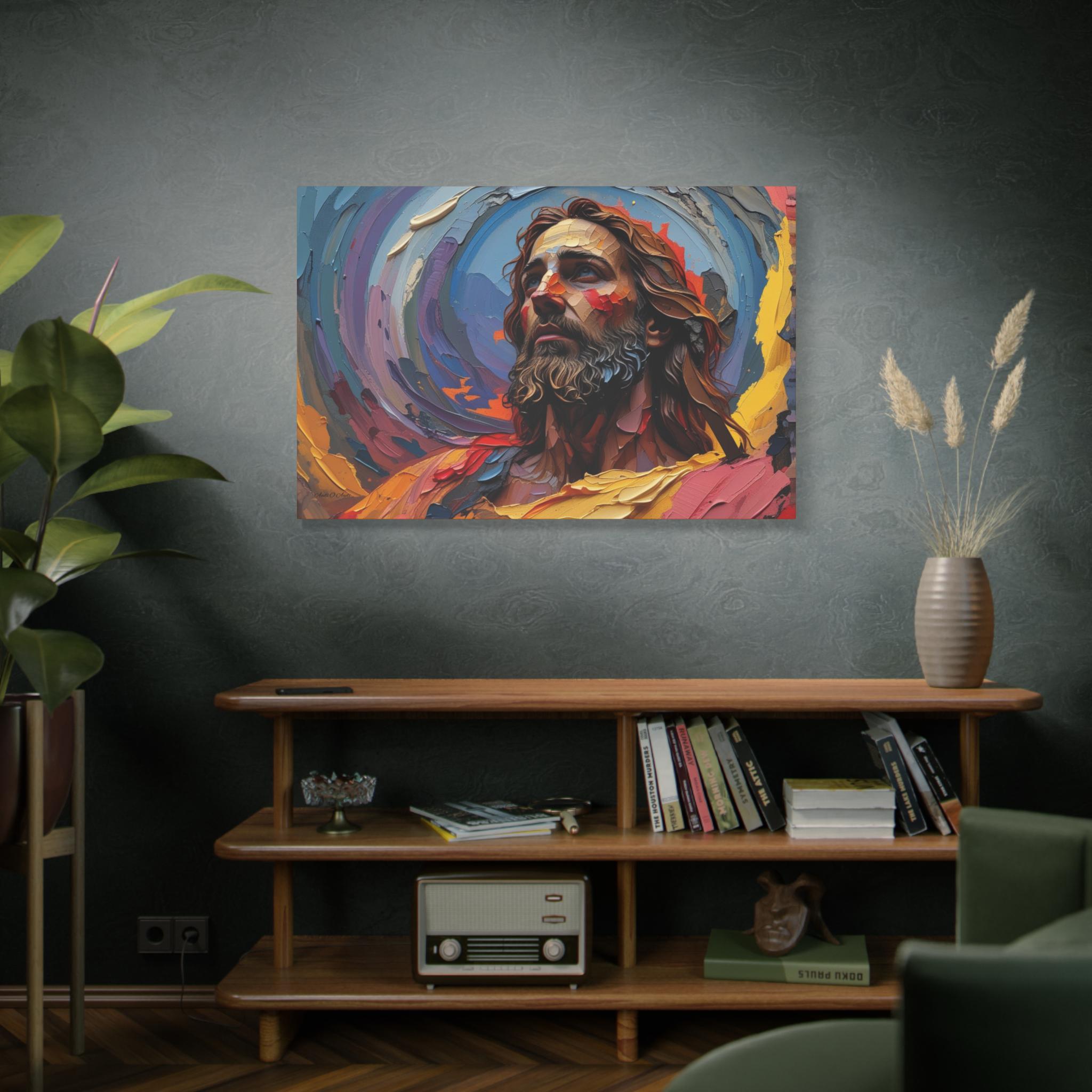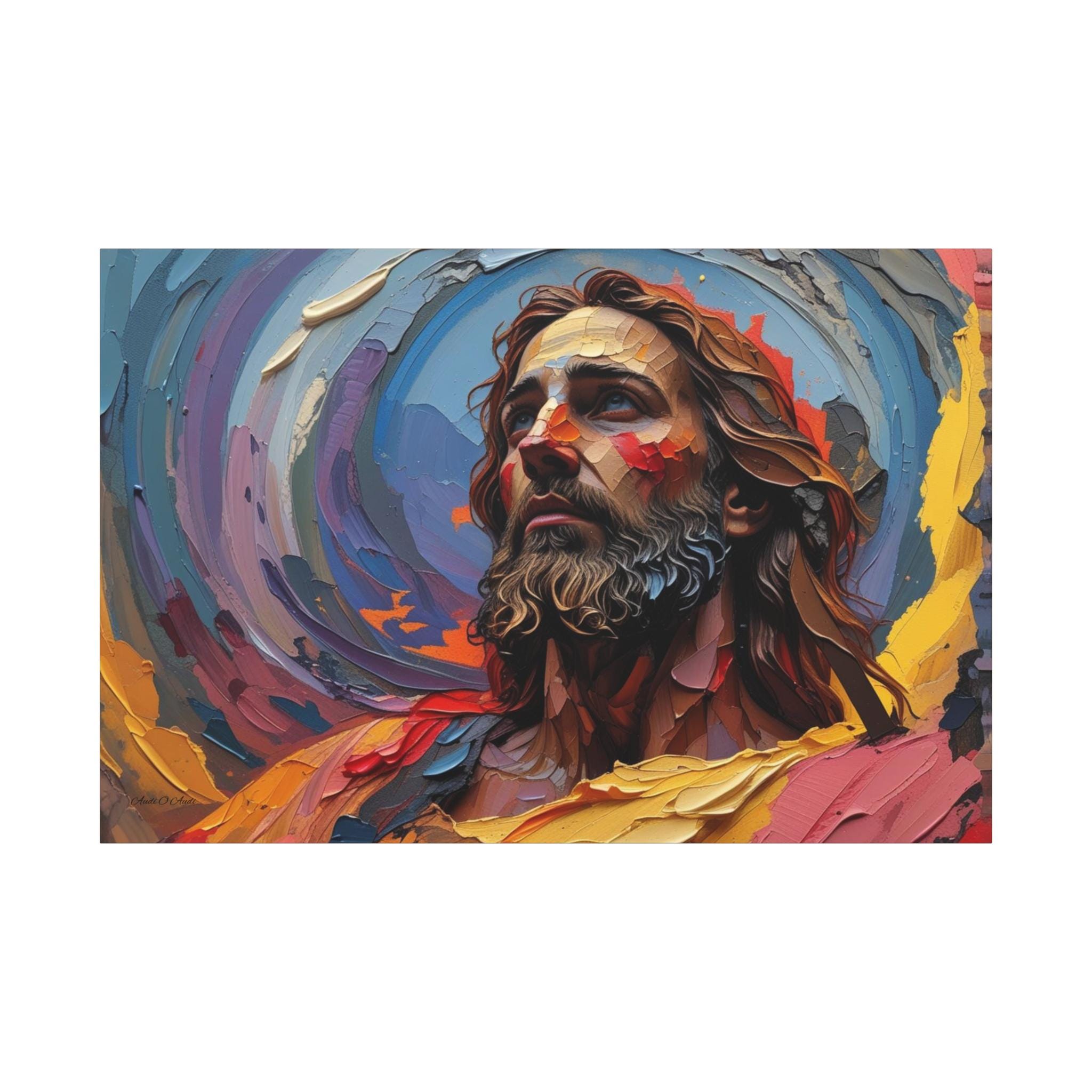 Technique and Color: The entire canvas print is dominated by thick, visible, and fragmented strokes of paint, which the print faithfully reproduces for maximum visual texture and depth. The subject is positioned against a turbulent background of saturated reds, deep blues, and oranges, symbolizing passion and divine power. The figure is framed by a blazing golden-yellow halo executed with thick, circular impasto, providing a focal point of intense light. The skin is contoured with rich, non-local color—shades of red, violet, and dark earth tones—creating a sense of sculpted, heroic form. The bright, upturned blue eyes provide a calm, spiritual contrast to the surrounding chromatic storm.