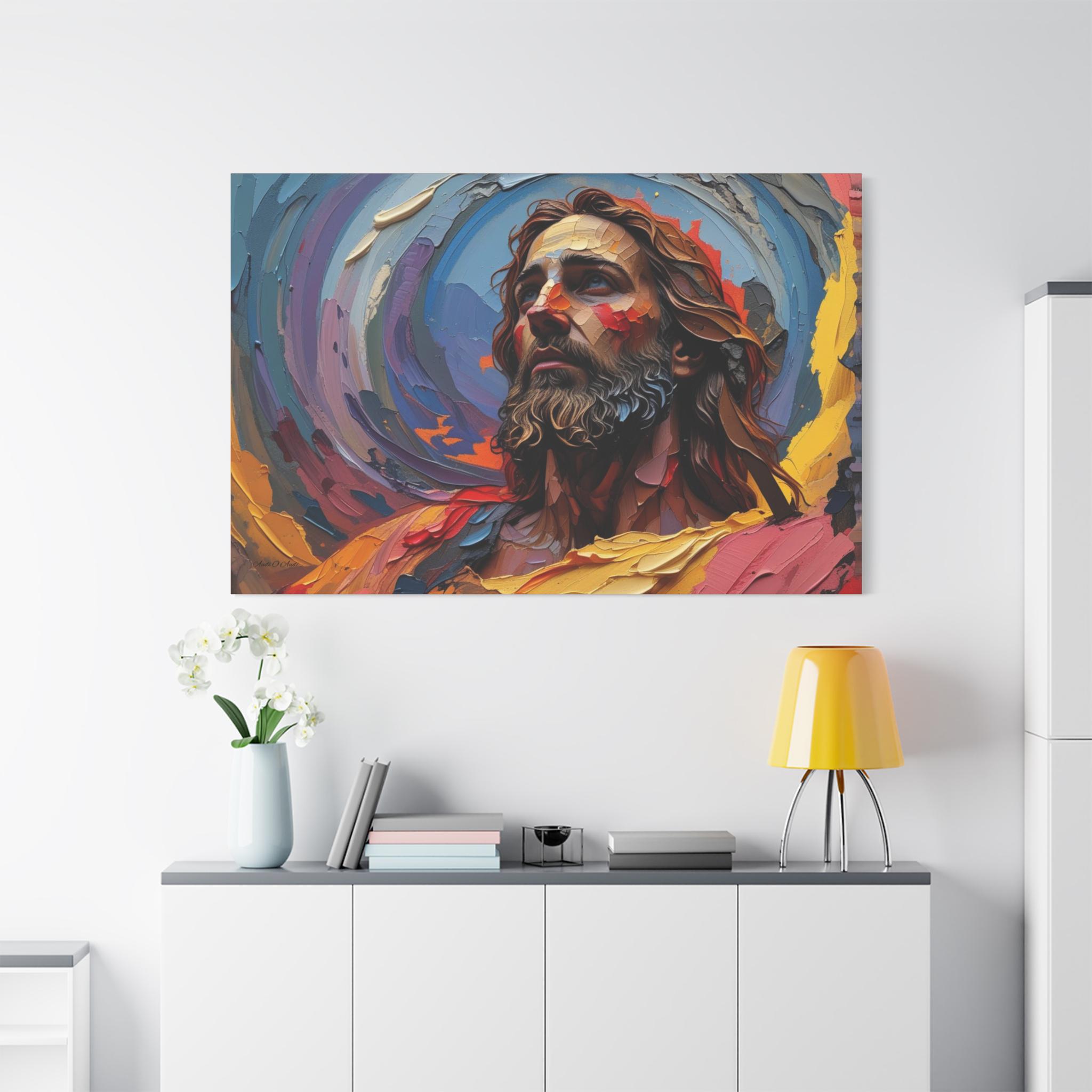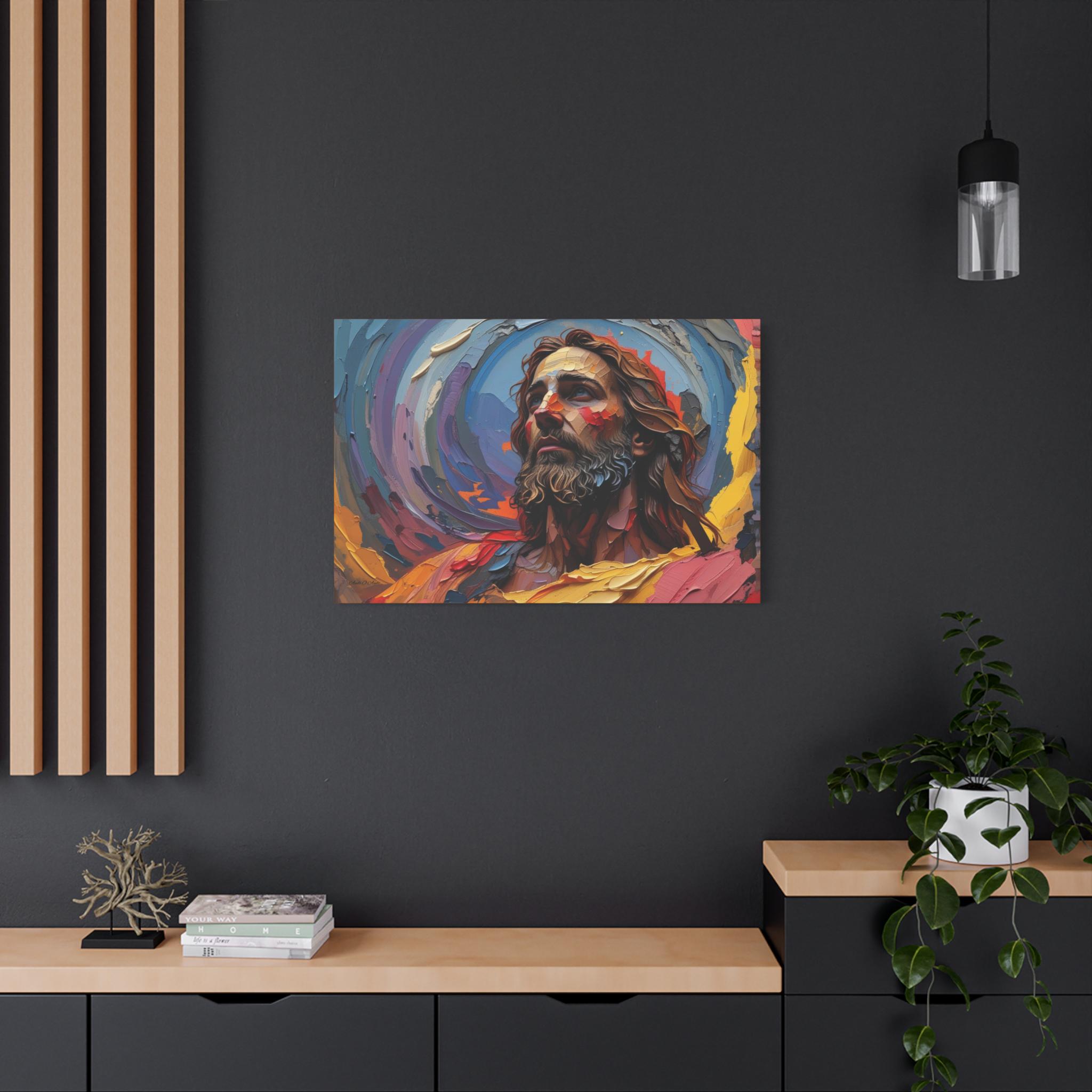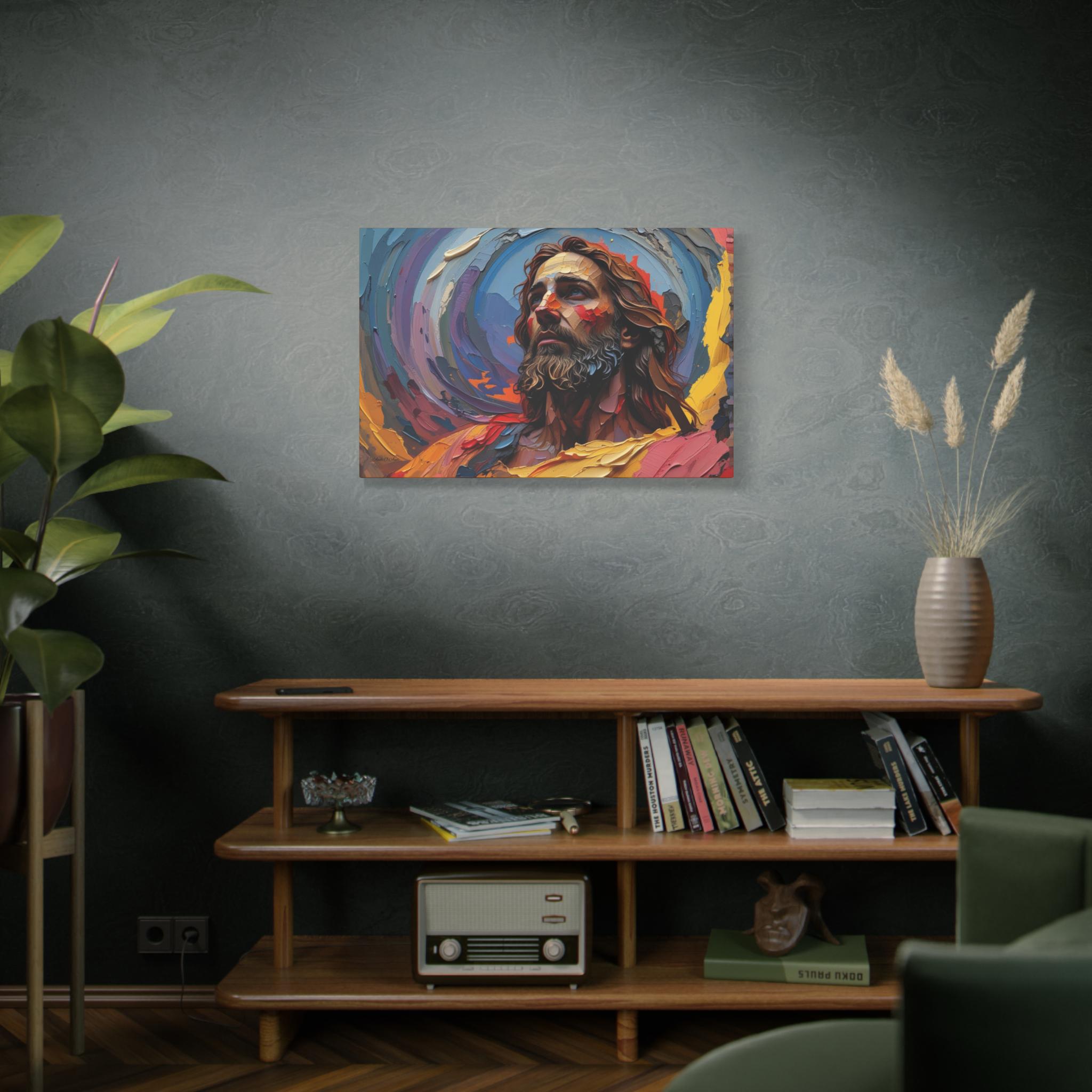 Technique and Color: The entire canvas print is dominated by thick, visible, and fragmented strokes of paint, which the print faithfully reproduces for maximum visual texture and depth. The subject is positioned against a turbulent background of saturated reds, deep blues, and oranges, symbolizing passion and divine power. The figure is framed by a blazing golden-yellow halo executed with thick, circular impasto, providing a focal point of intense light. The skin is contoured with rich, non-local color—shades of red, violet, and dark earth tones—creating a sense of sculpted, heroic form. The bright, upturned blue eyes provide a calm, spiritual contrast to the surrounding chromatic storm.