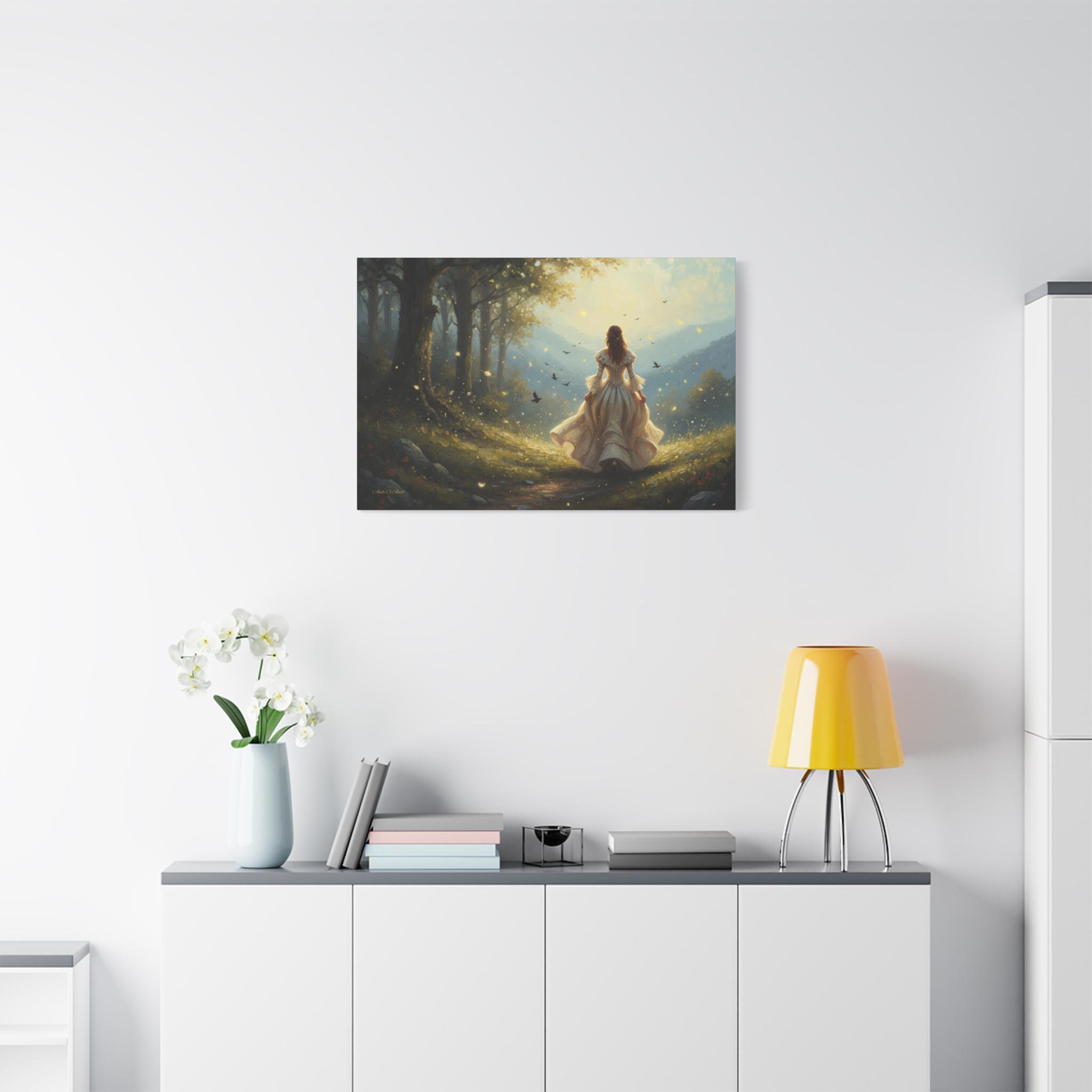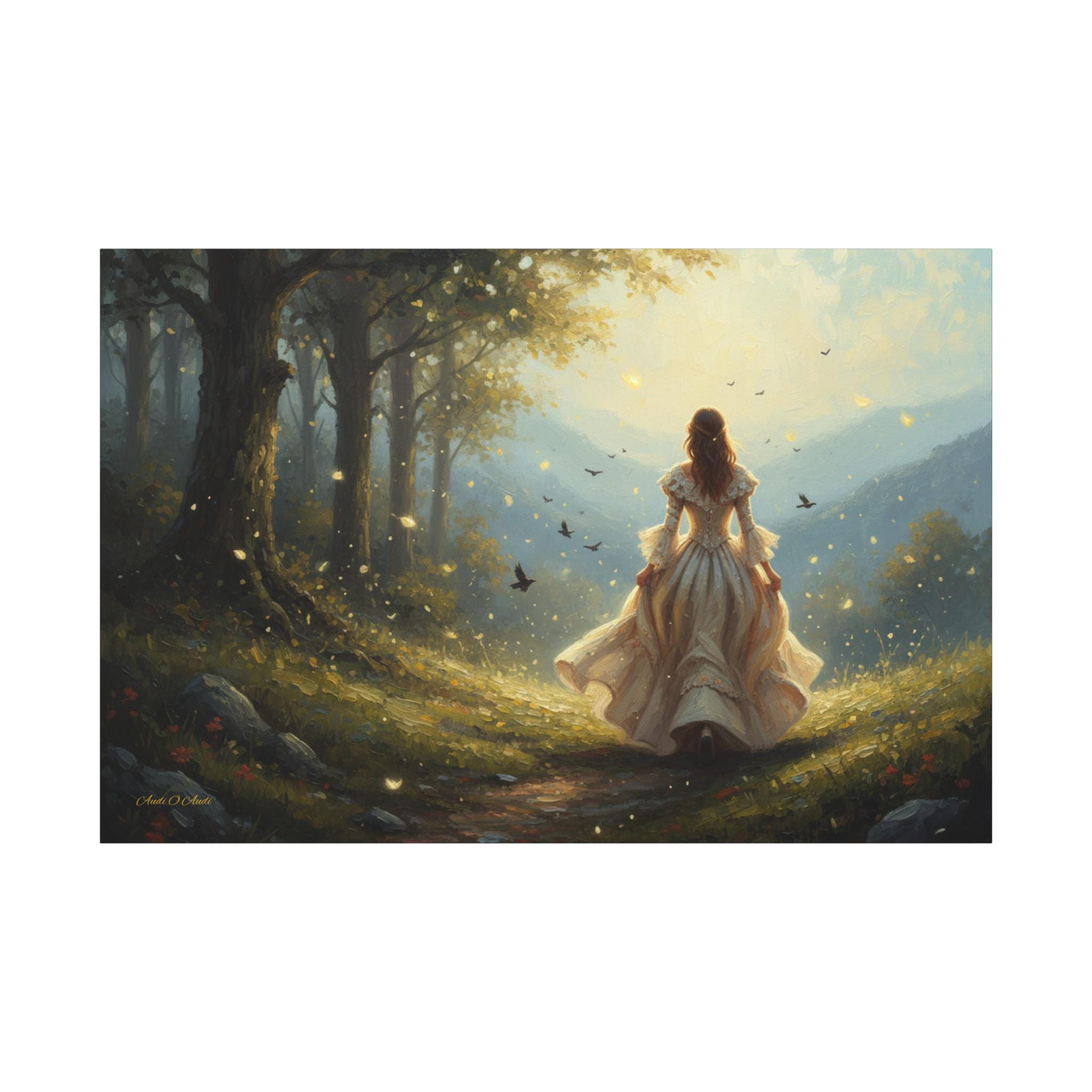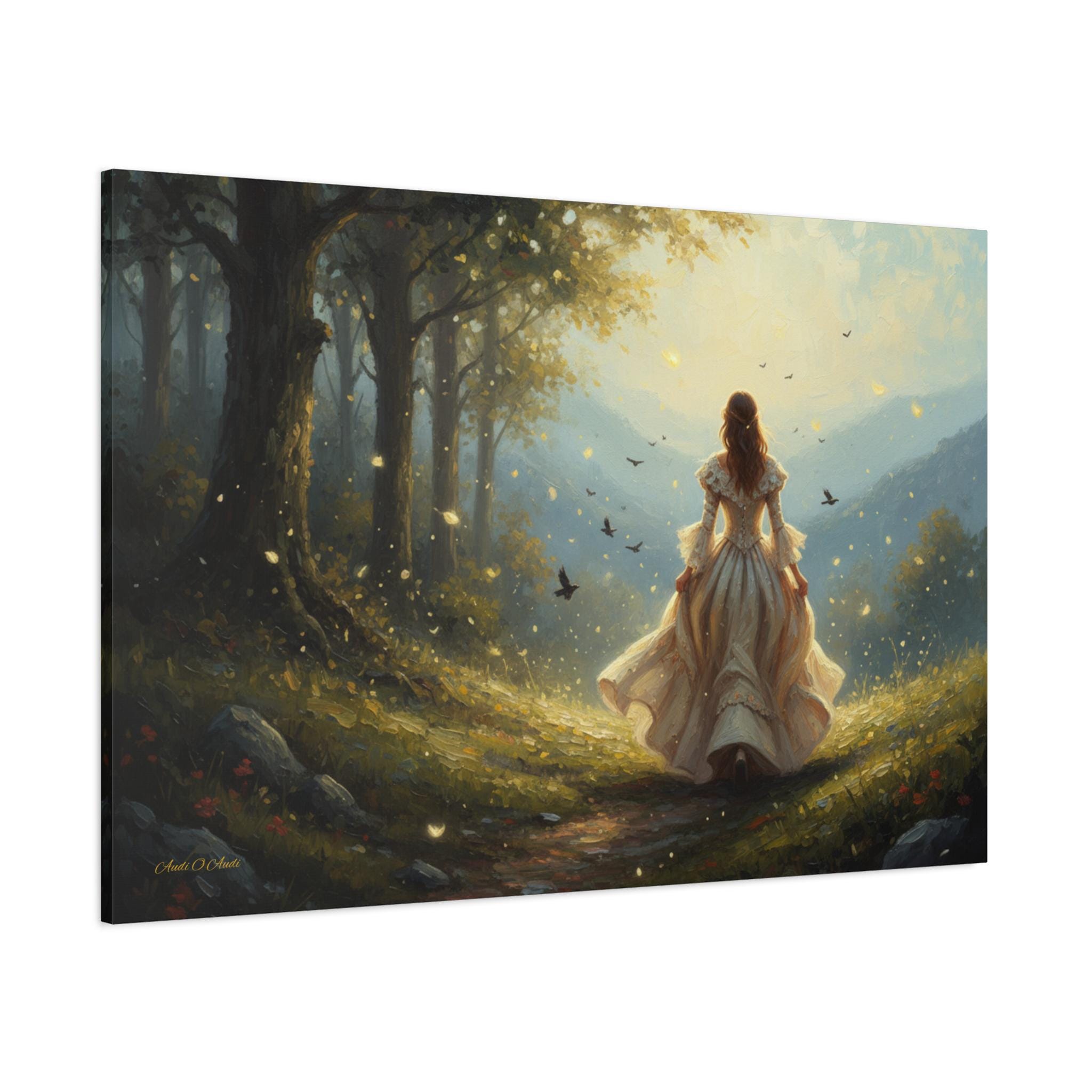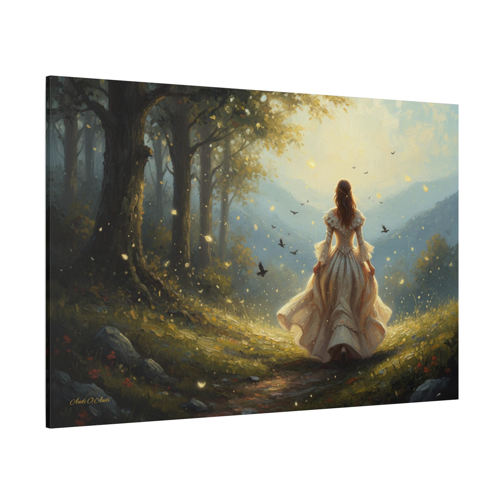 Subject: The central figure is a woman with long, flowing hair, wearing an ornate, antique-style white or cream gown with bell sleeves and a voluminous skirt, suggesting a fairy tale or Victorian-era aesthetic. Her pose is one of confident, purposeful movement, inviting the viewer to follow her journey.