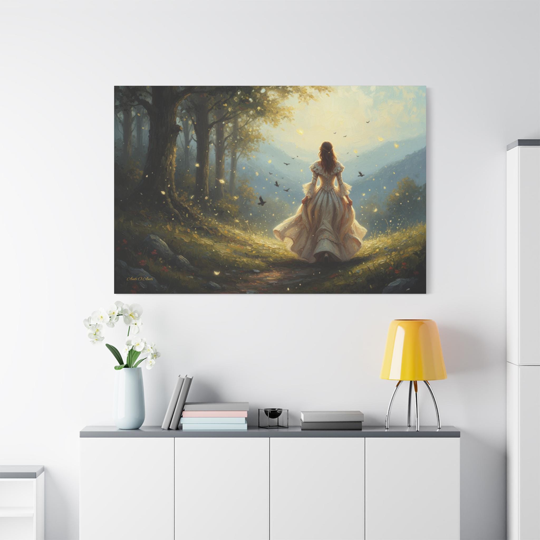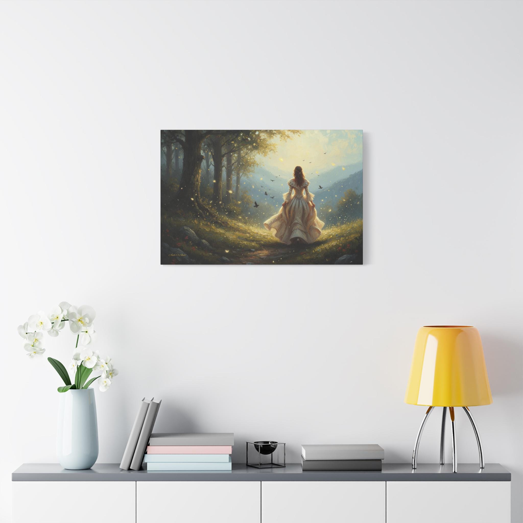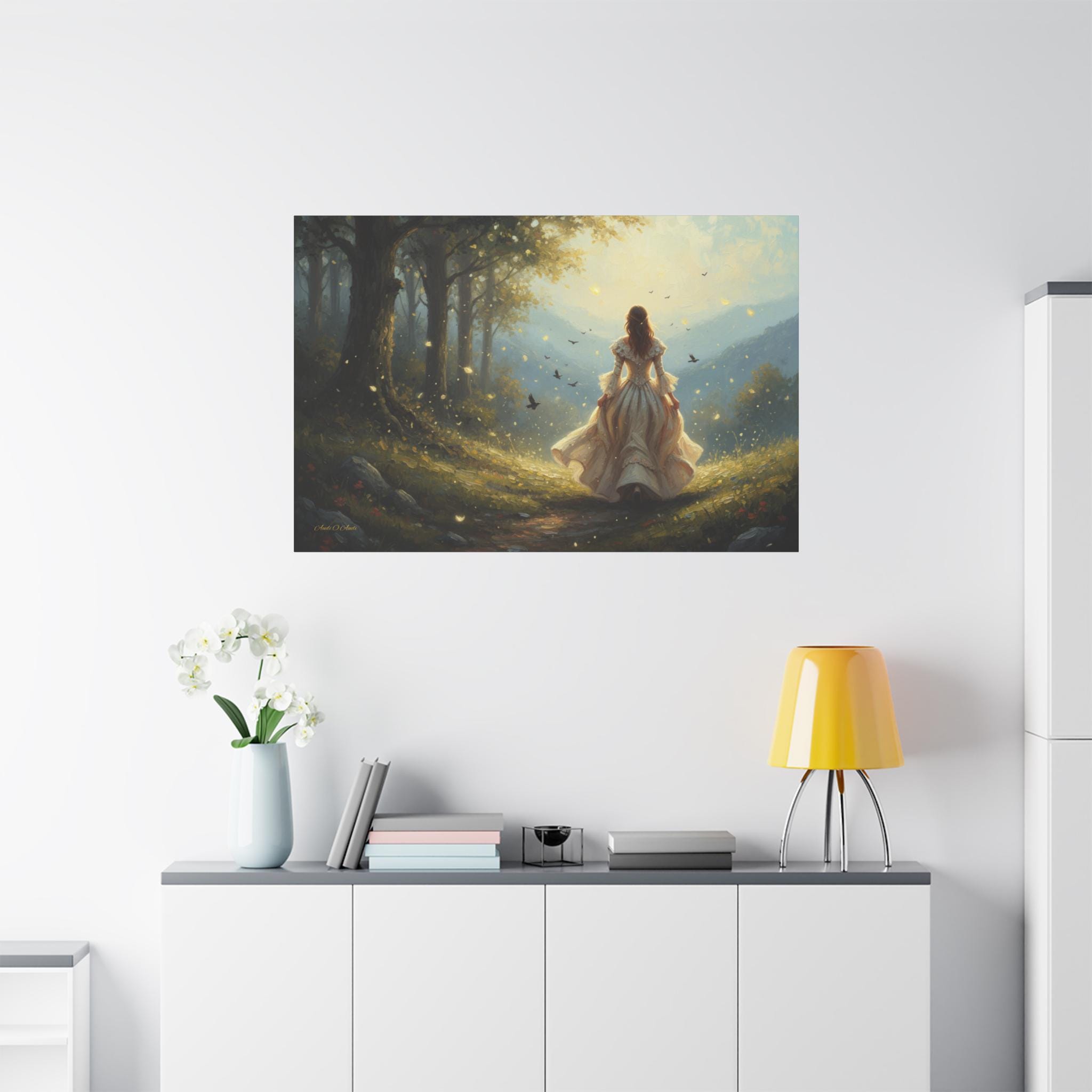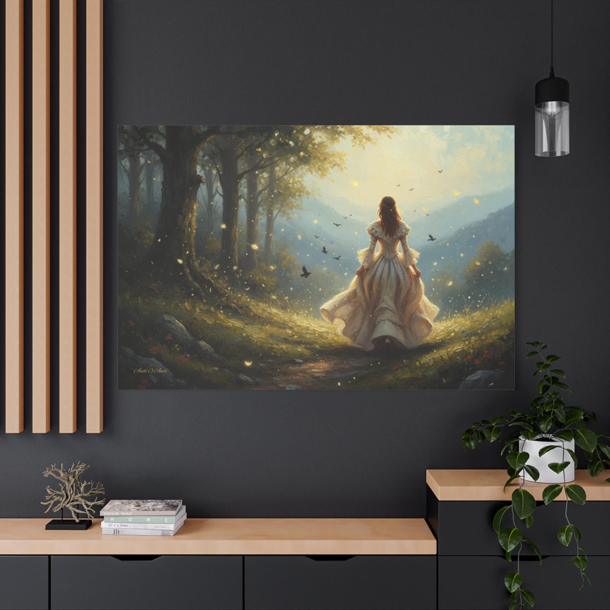 Subject: The central figure is a woman with long, flowing hair, wearing an ornate, antique-style white or cream gown with bell sleeves and a voluminous skirt, suggesting a fairy tale or Victorian-era aesthetic. Her pose is one of confident, purposeful movement, inviting the viewer to follow her journey.