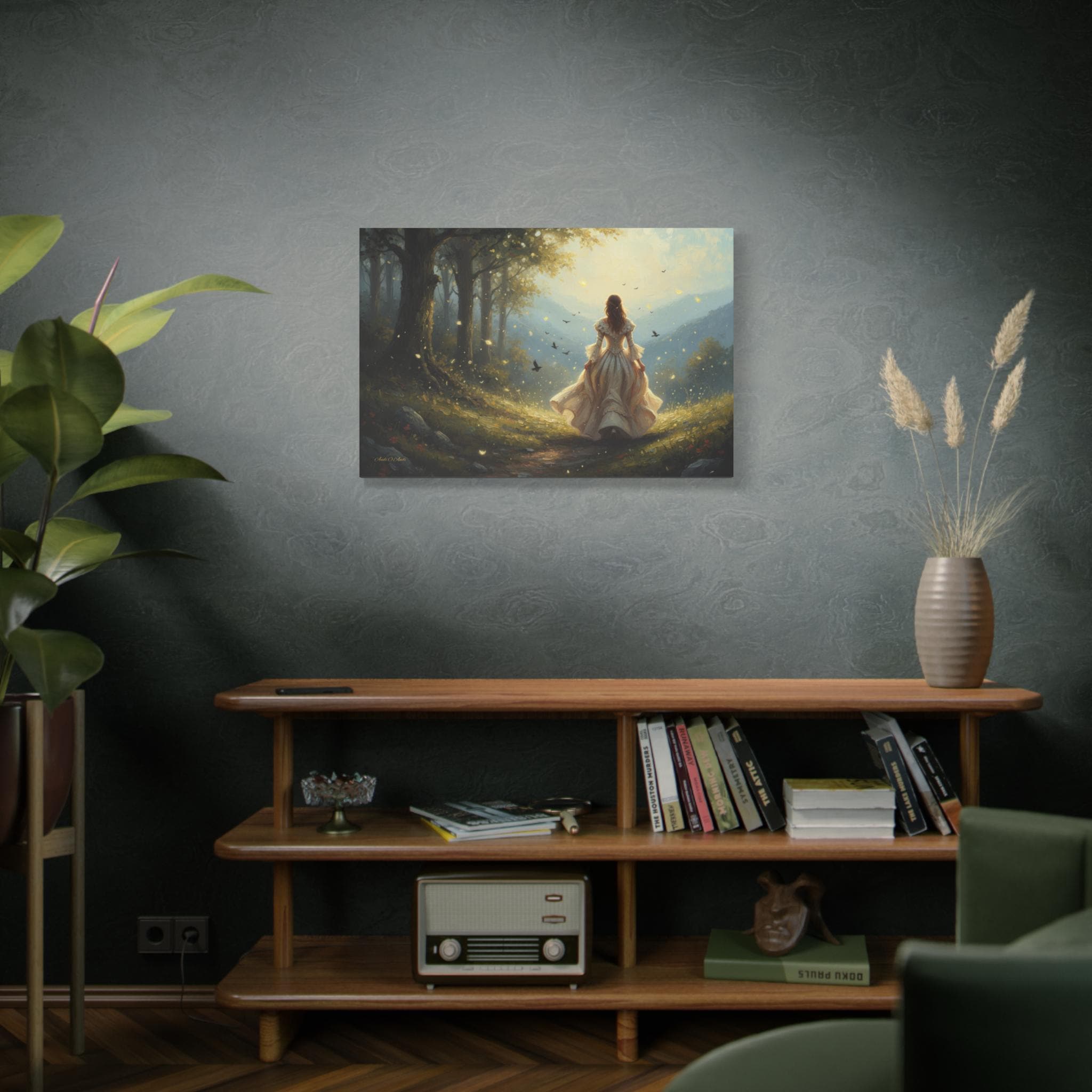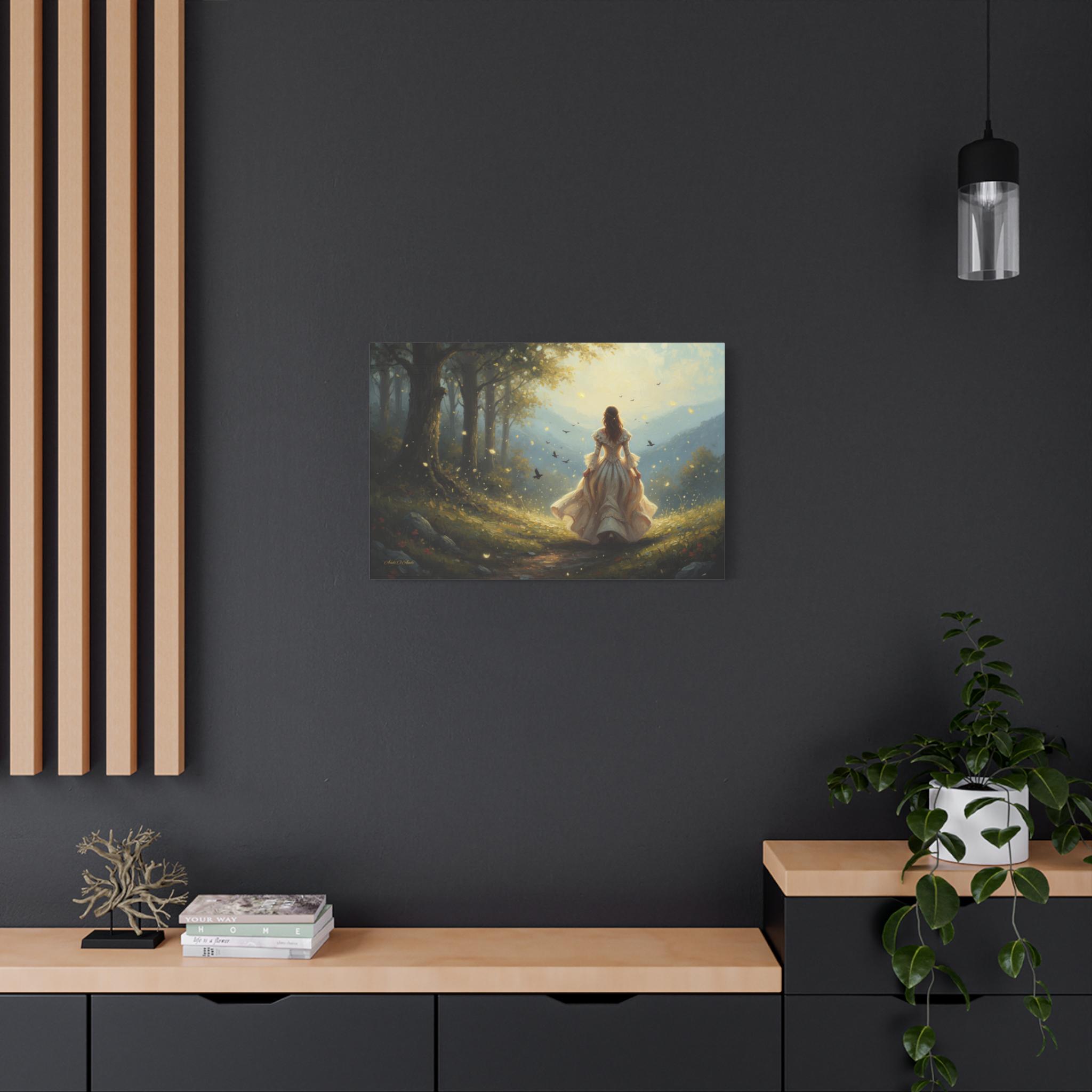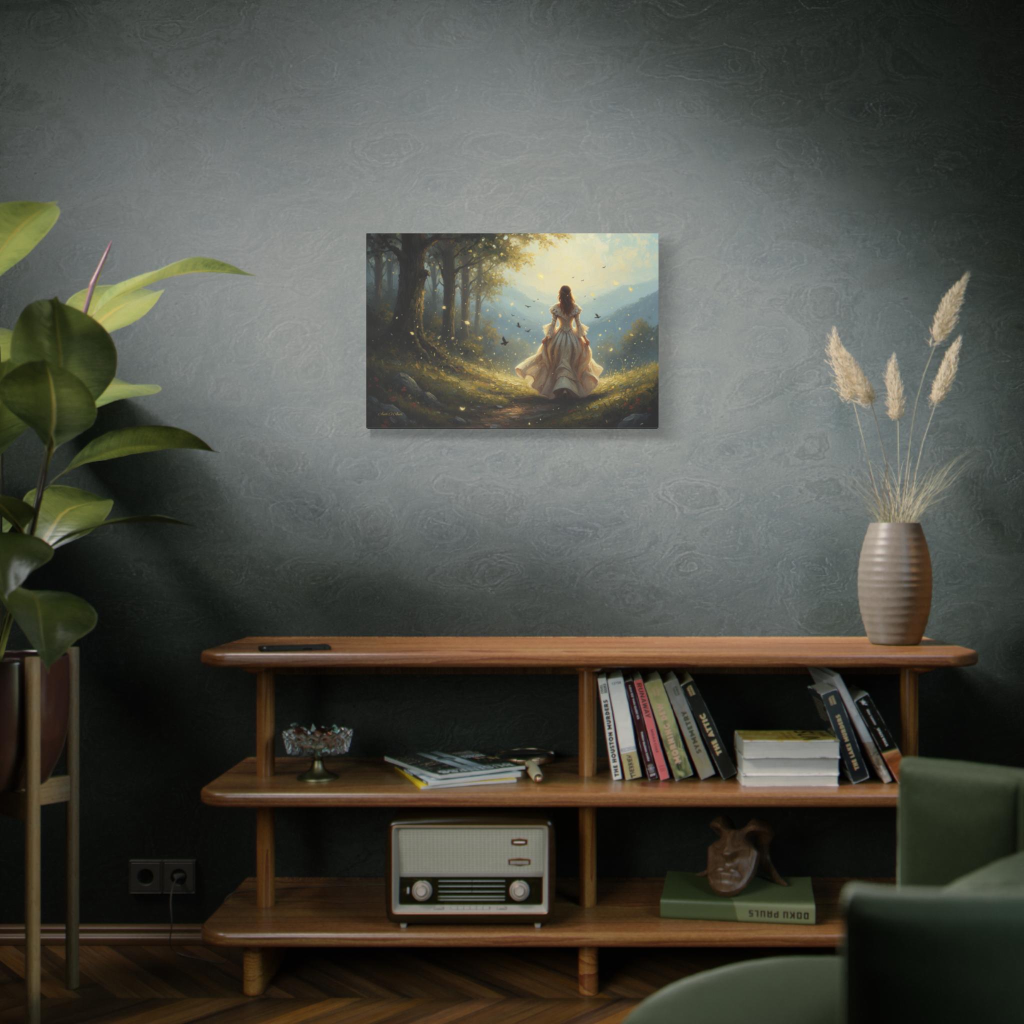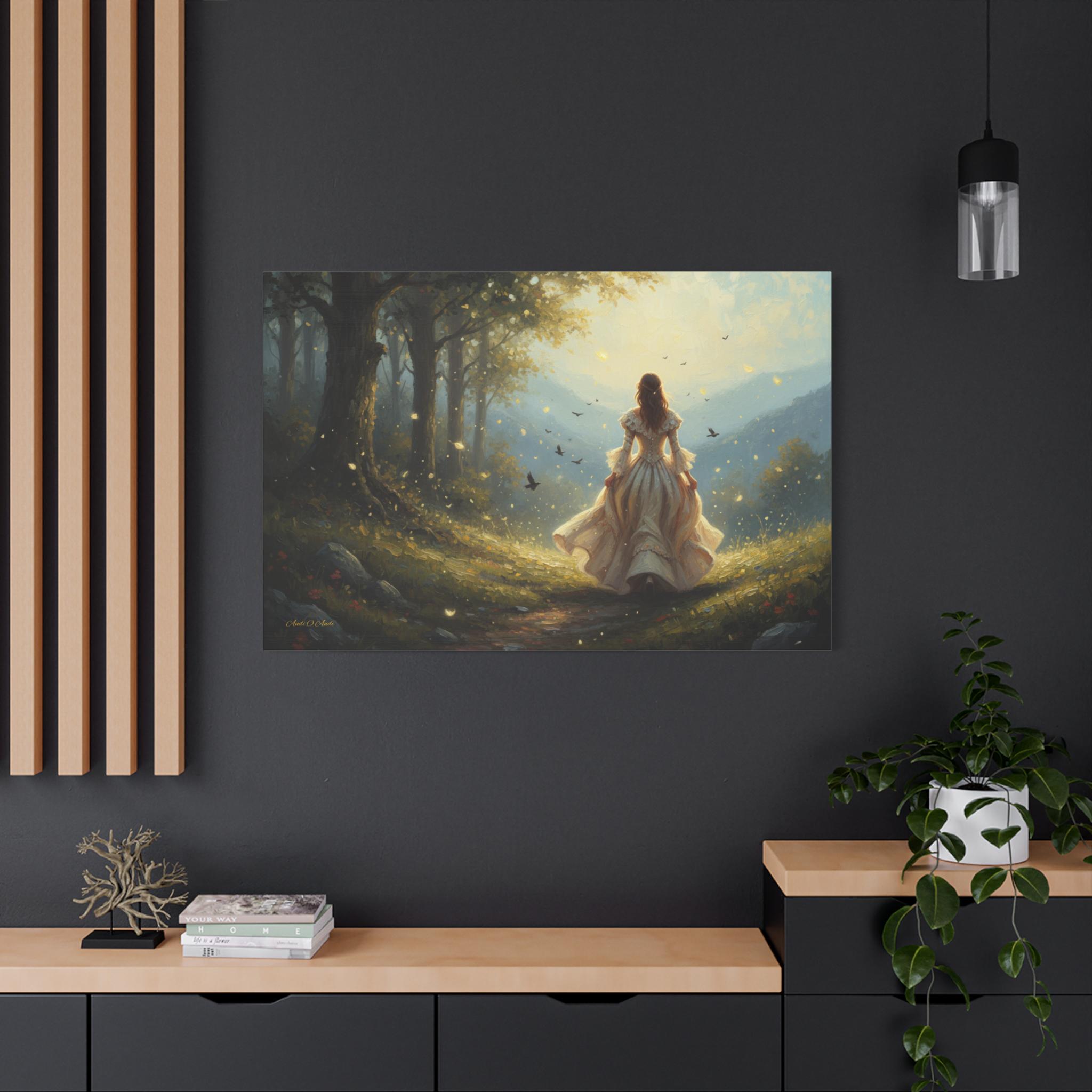 Subject: The central figure is a woman with long, flowing hair, wearing an ornate, antique-style white or cream gown with bell sleeves and a voluminous skirt, suggesting a fairy tale or Victorian-era aesthetic. Her pose is one of confident, purposeful movement, inviting the viewer to follow her journey.