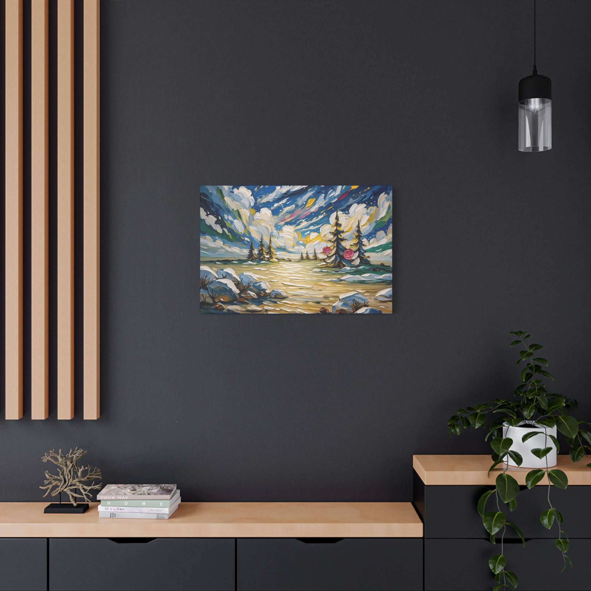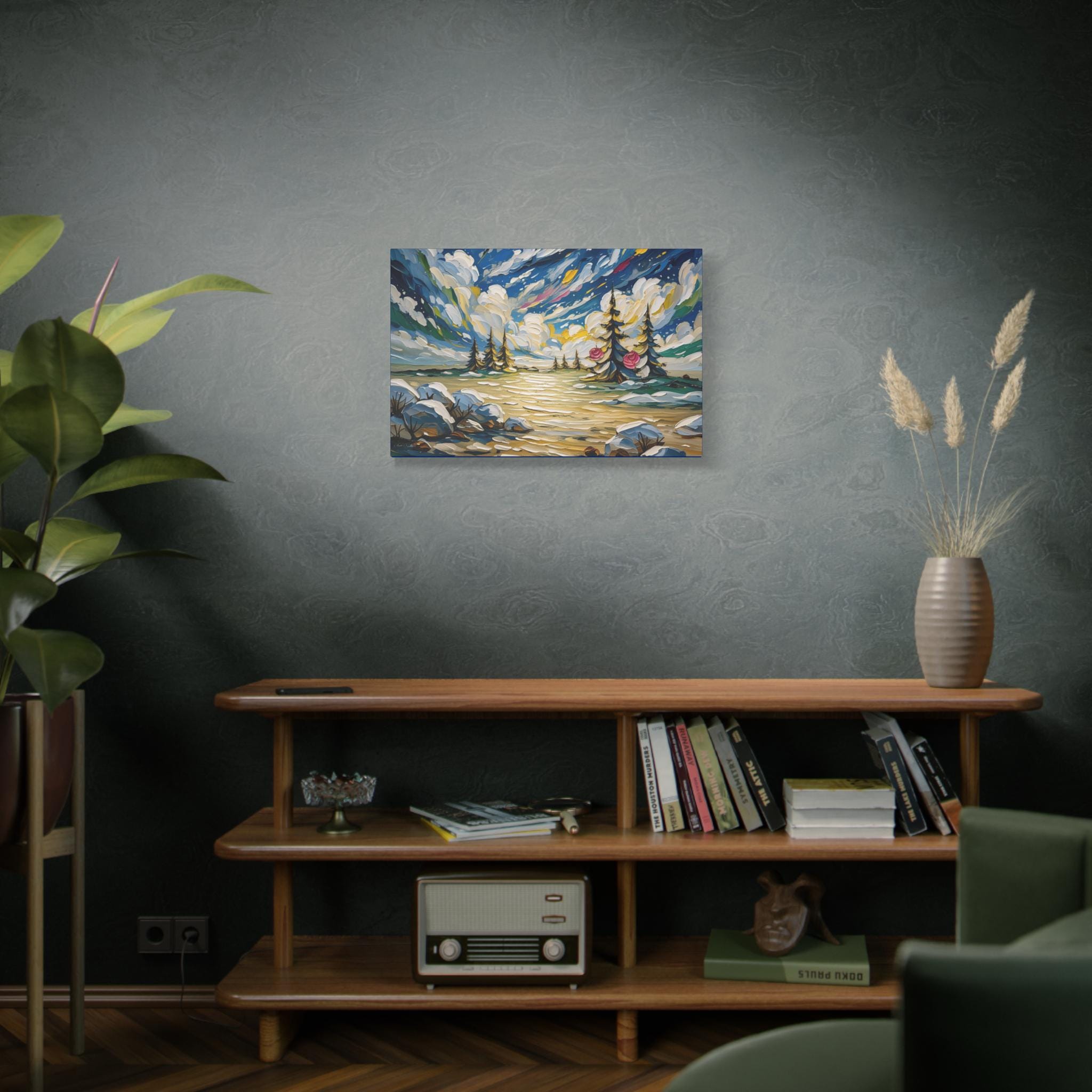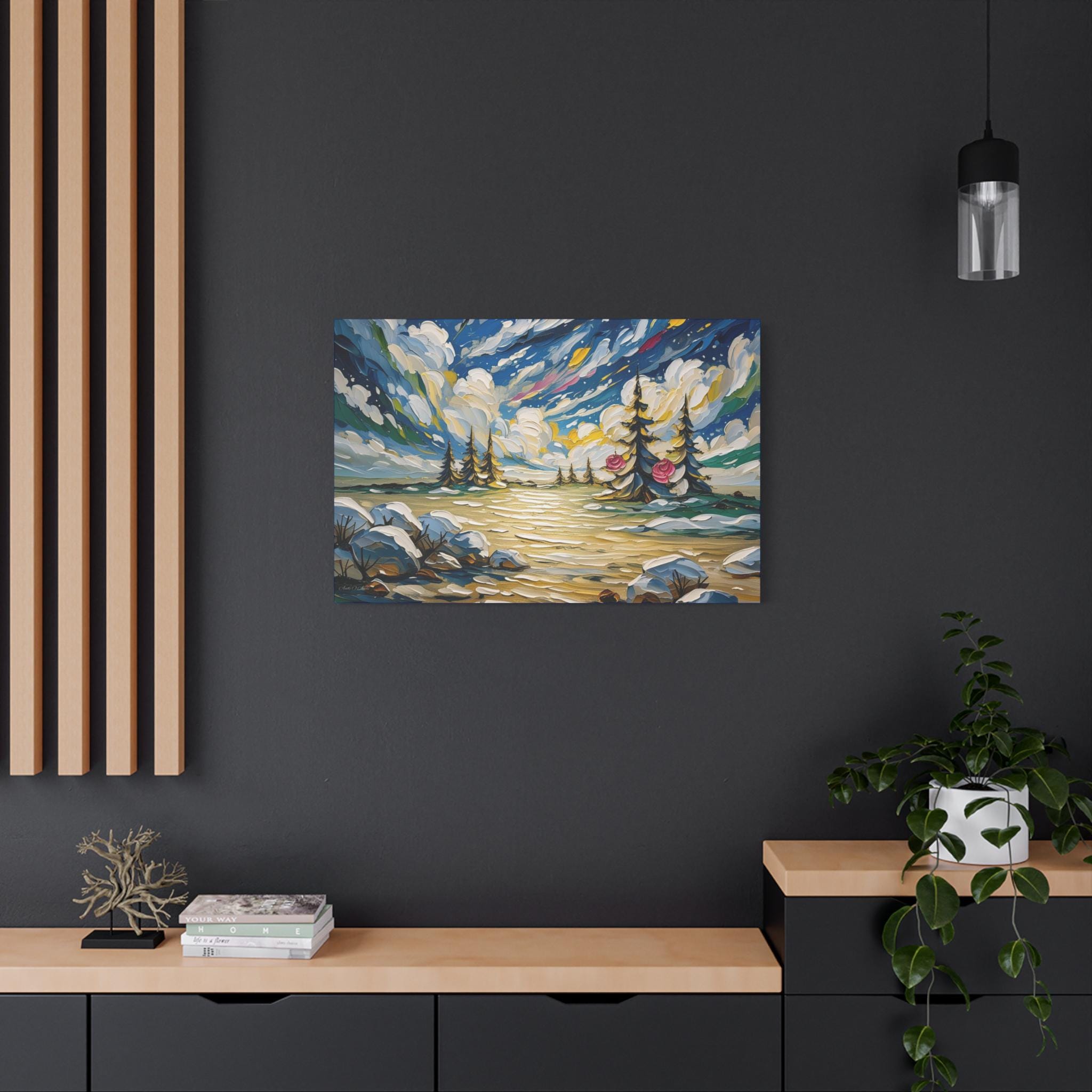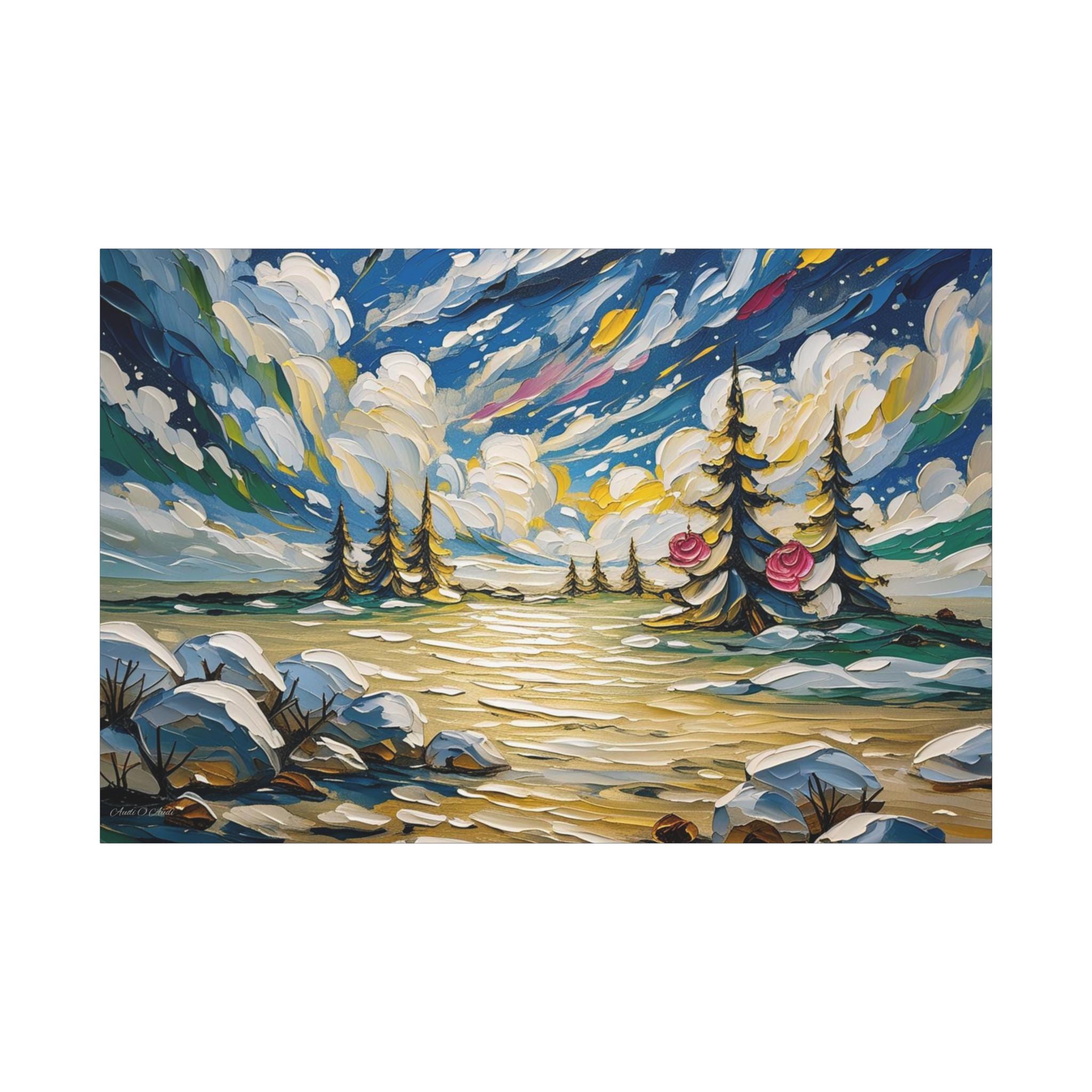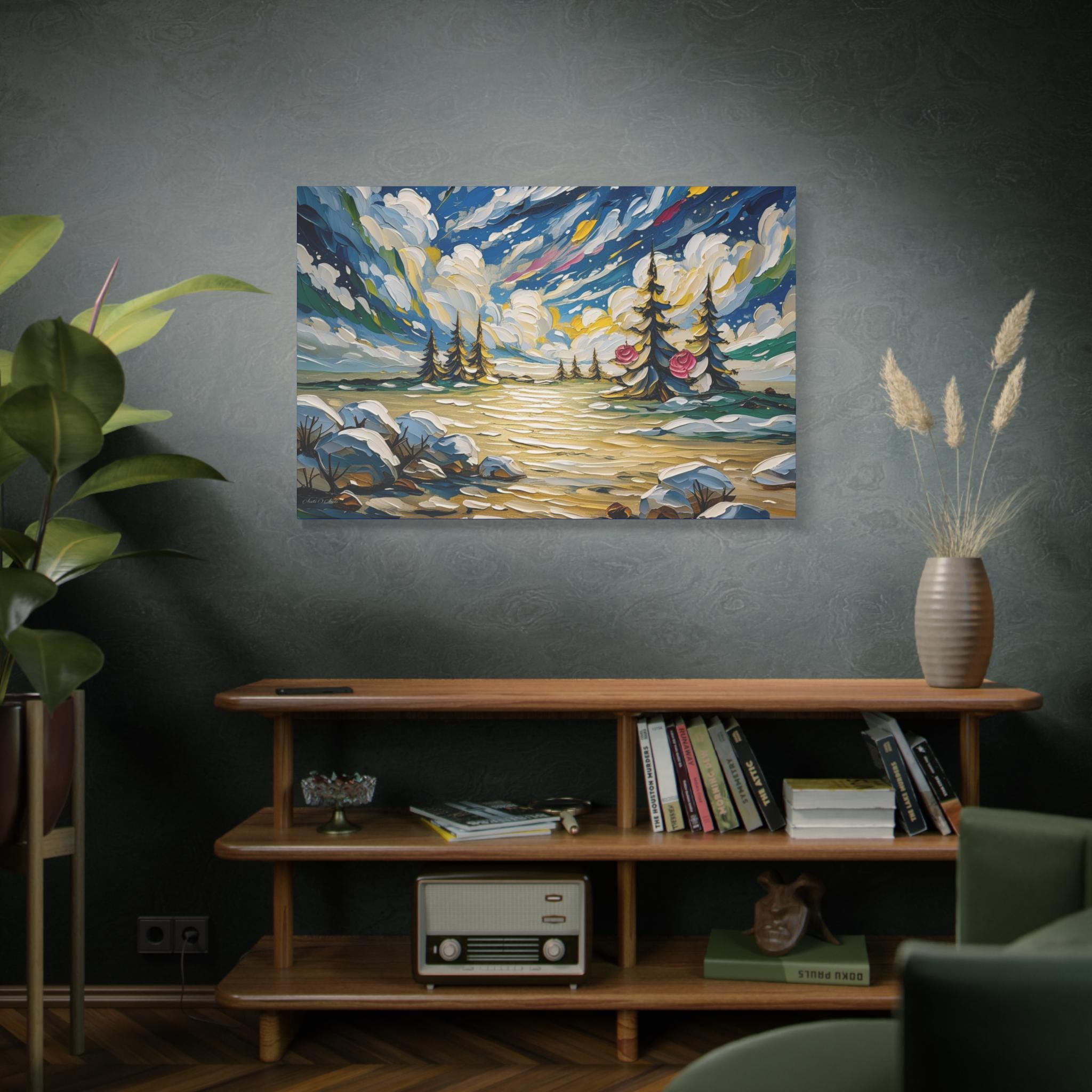 This Golden Snowdrift Whimsical Winter Landscape Canvas adds a cozy and magical touch to any living room decor. Perfect as a housewarming gift, this wall art creates a warm and inviting atmosphere. Ideal for those who love winter landscapes and whimsical designs, this canvas is relevant for Christmas, winter celebrations, and housewarmings.
