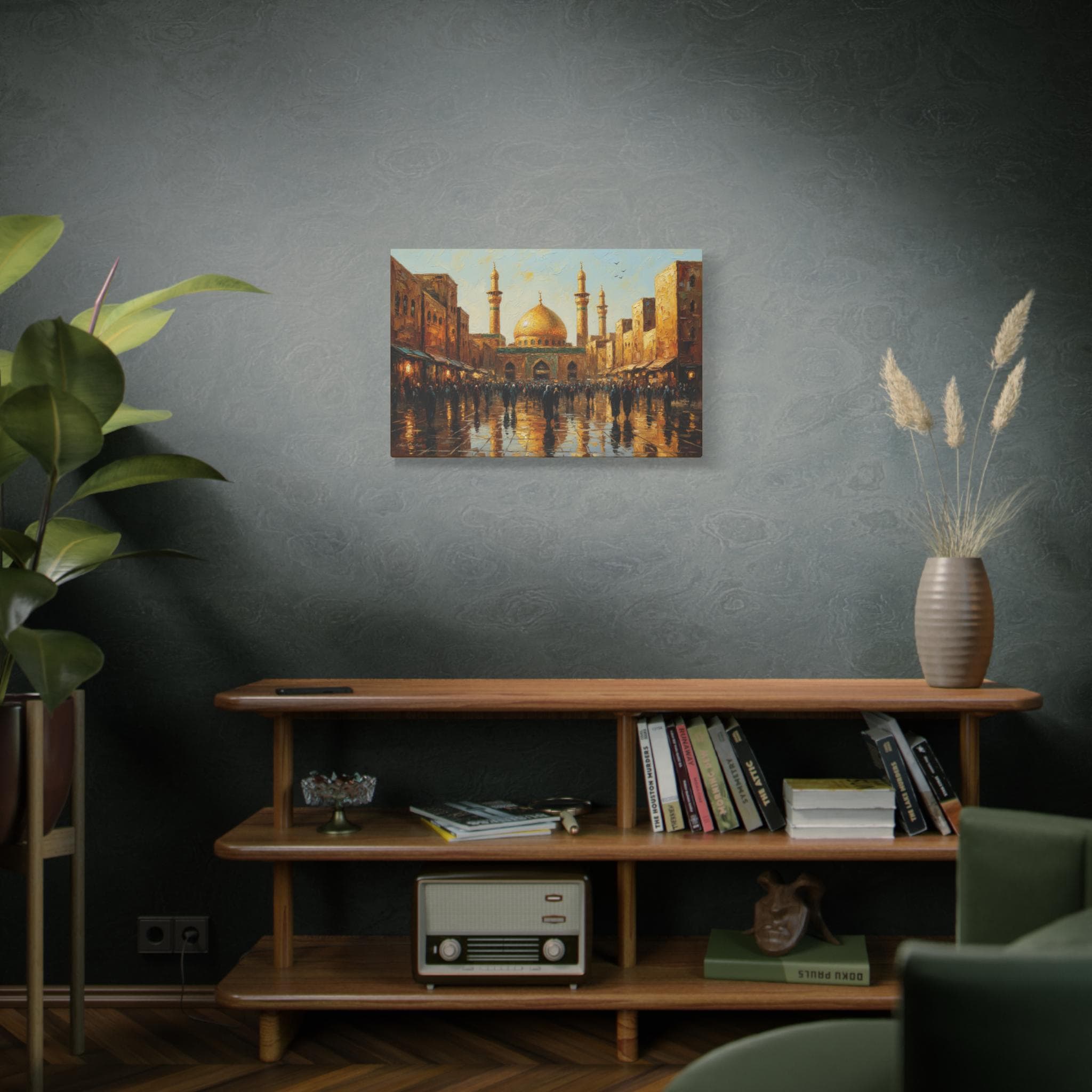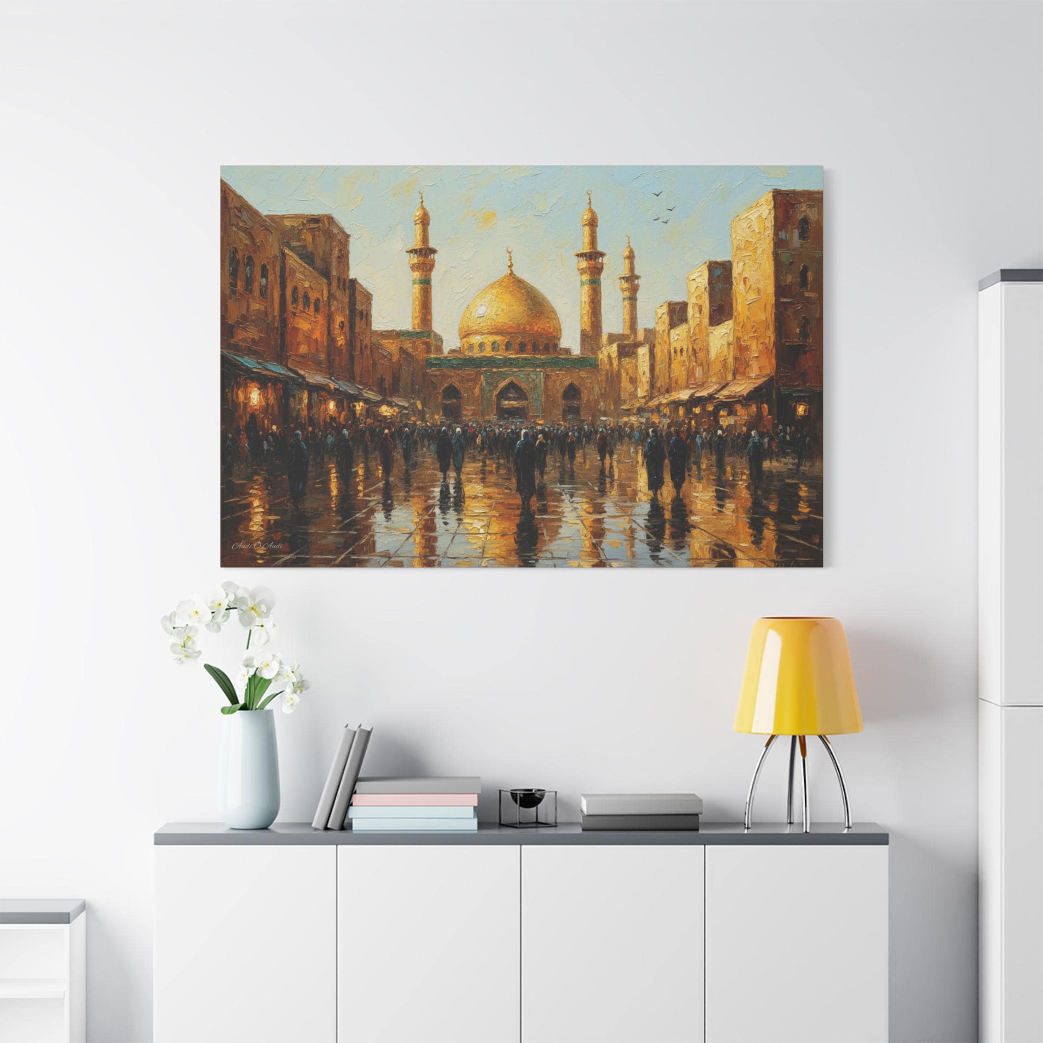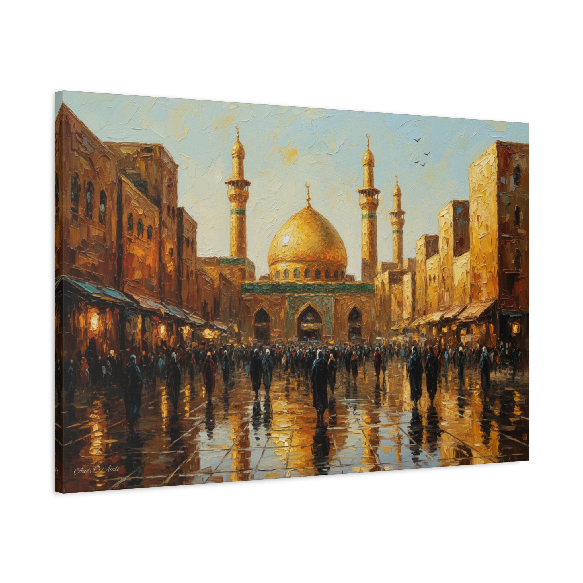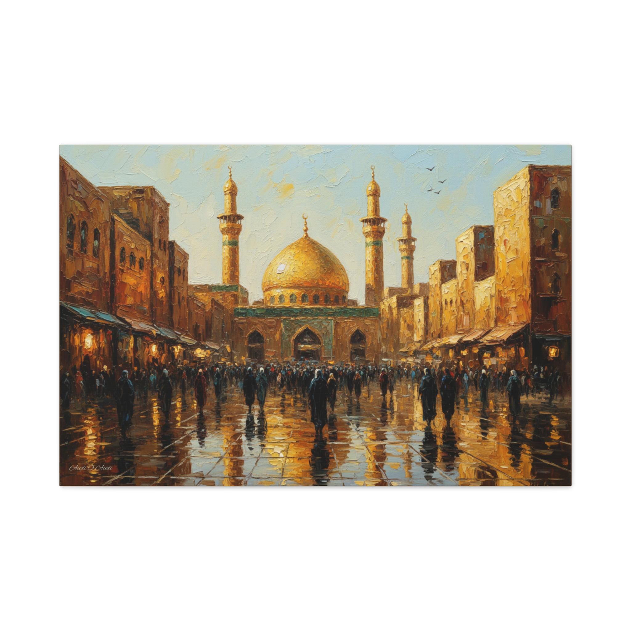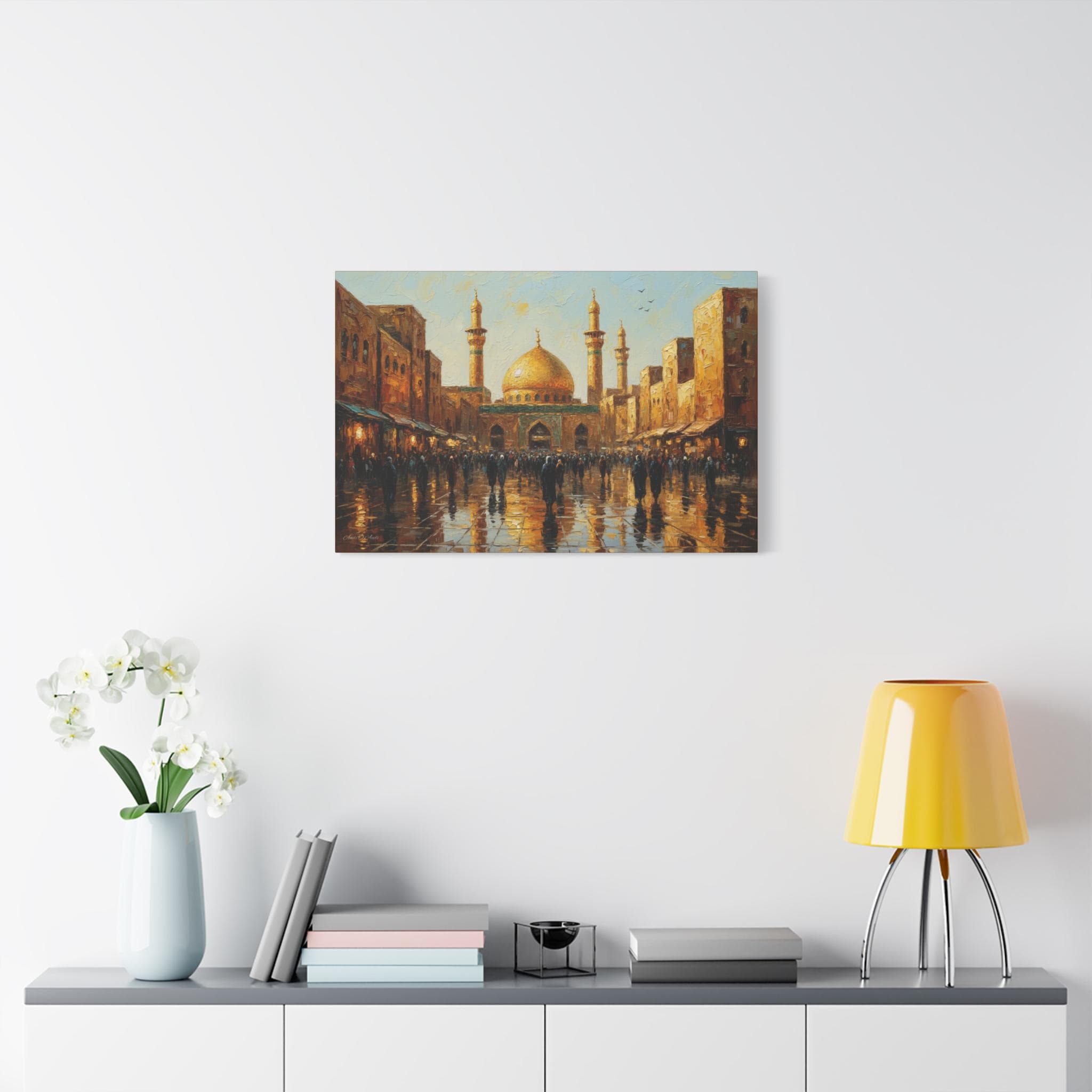 Golden Hour Pilgrimage, Golden Mosque Street Scene Canvas Print, Matte Stretched Wall Art, Islamic Art, Middle East Art.