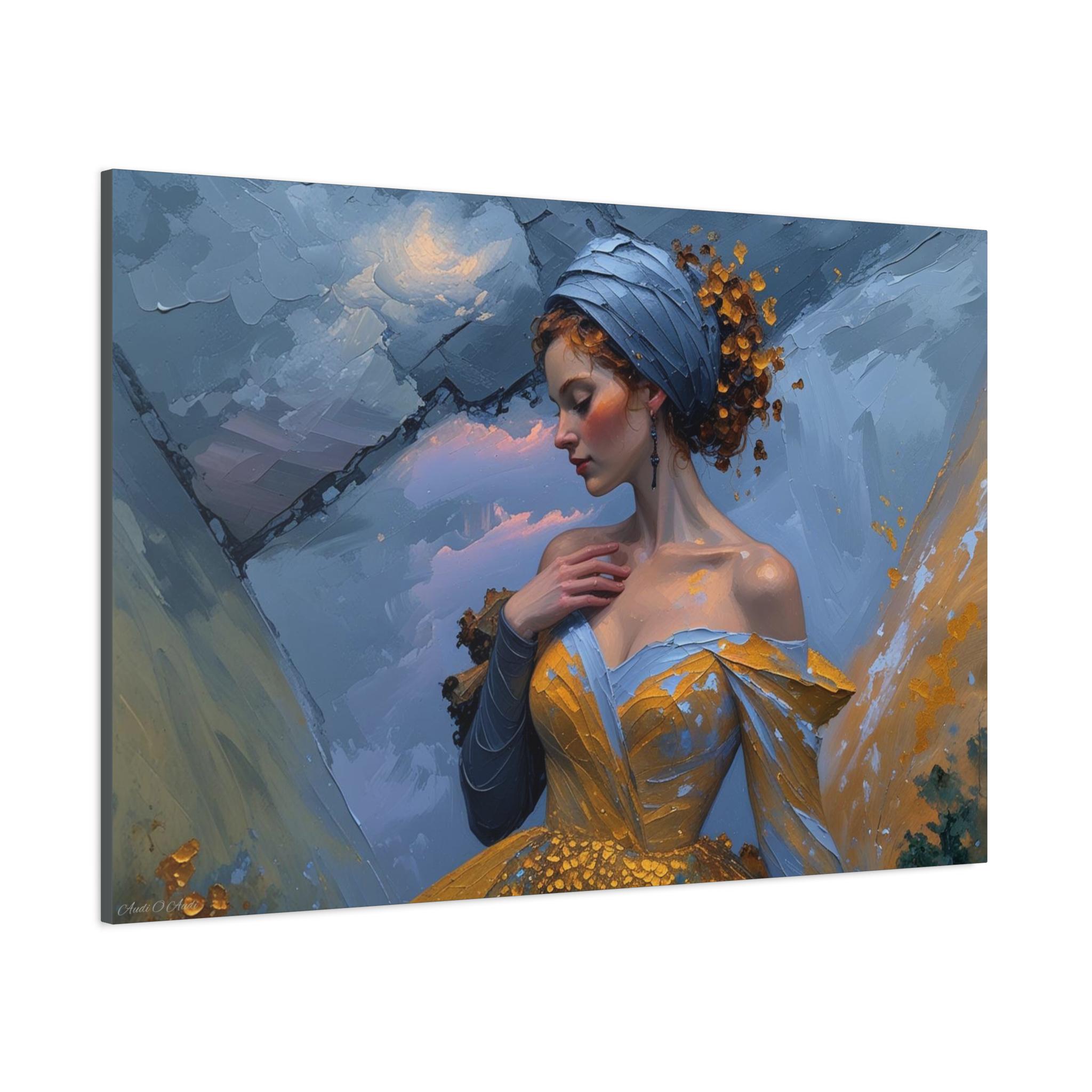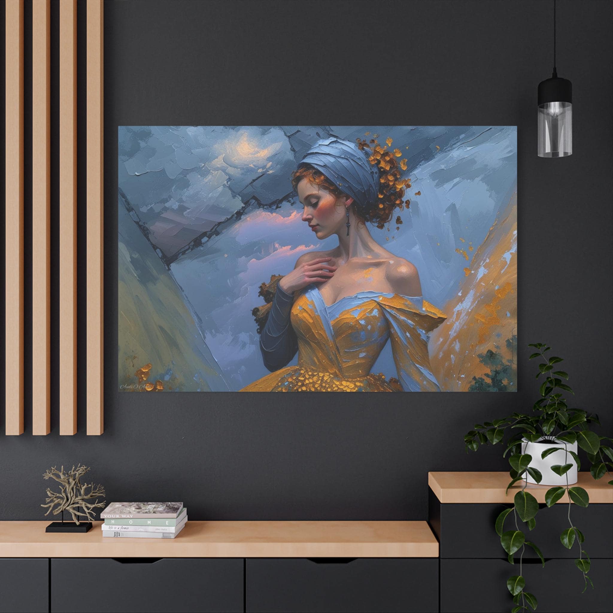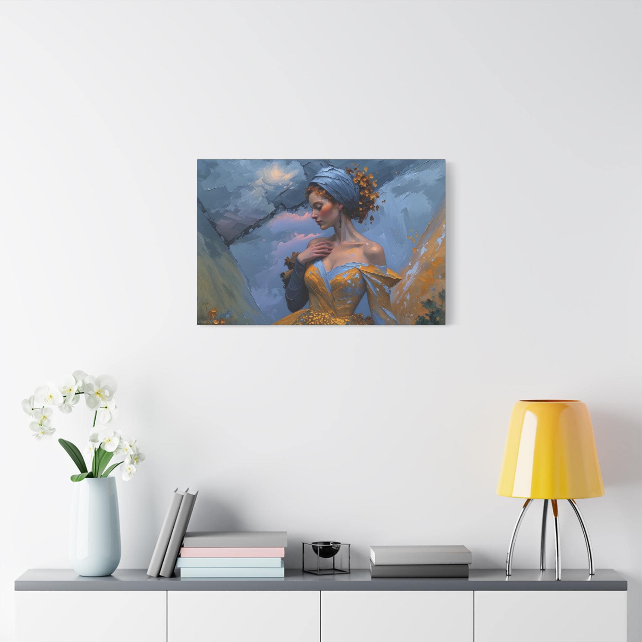 Azure & Gold Reverie, Elegiac Woman Portrait Matte Canvas Print.