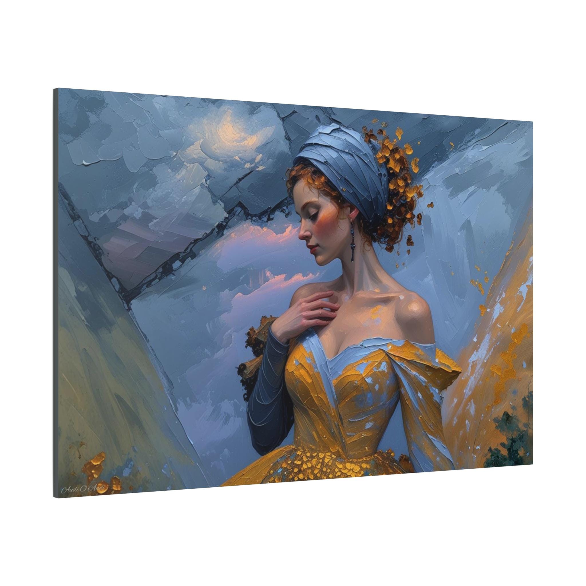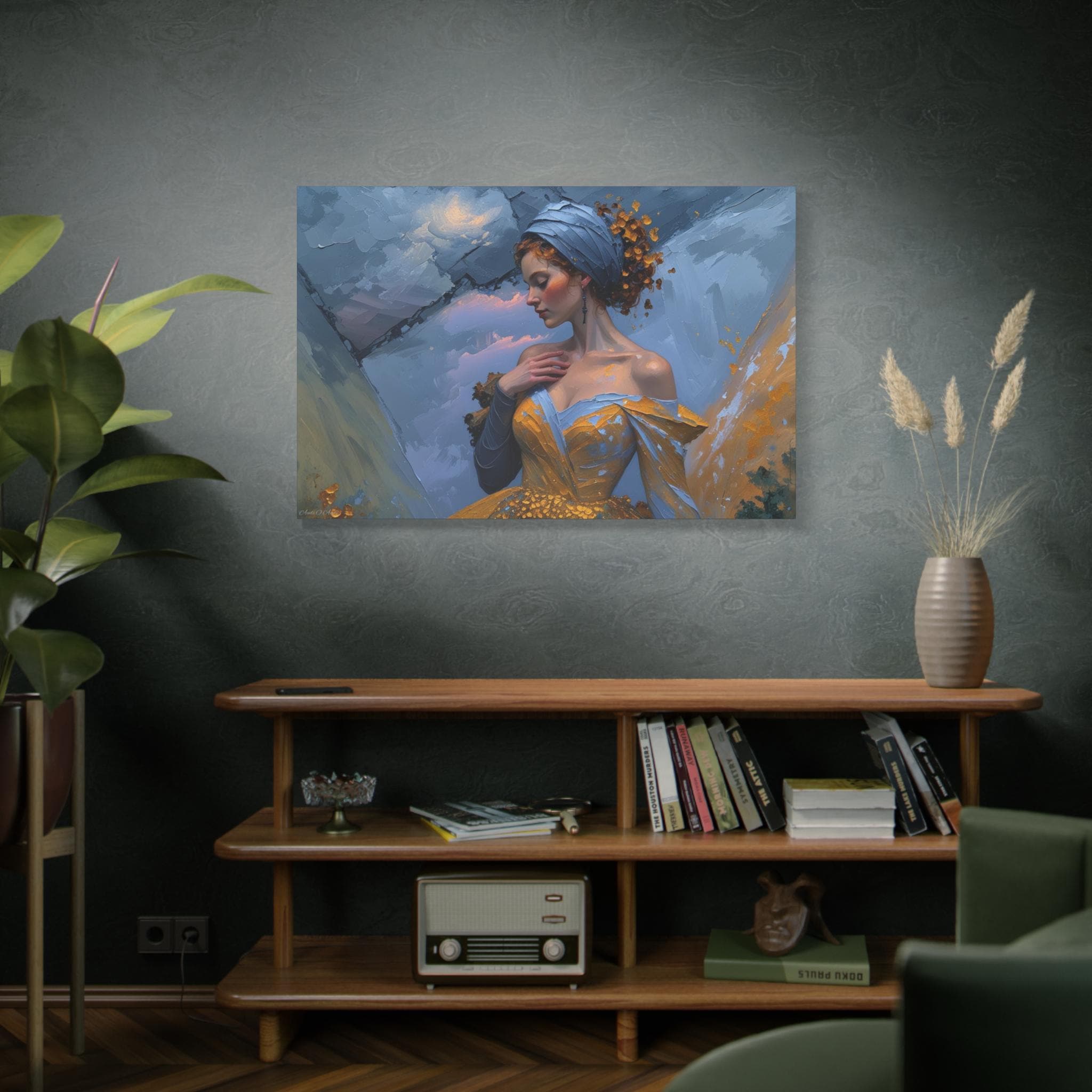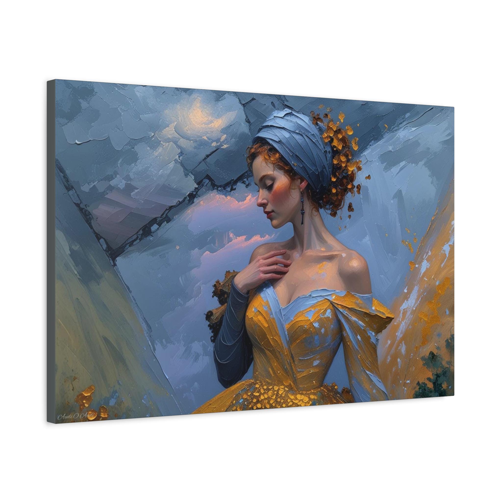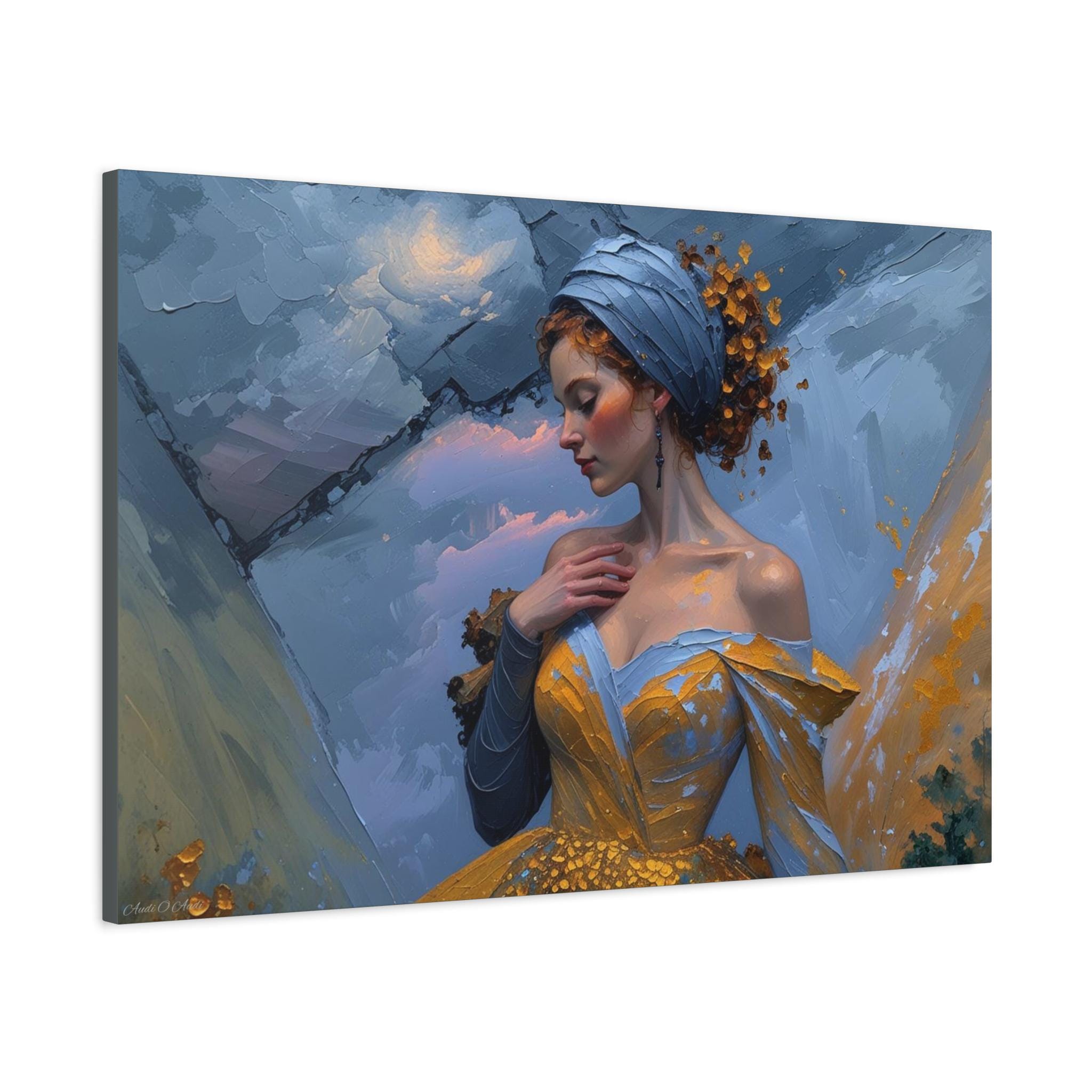 Azure & Gold Reverie, Elegiac Woman Portrait Matte Canvas Print.