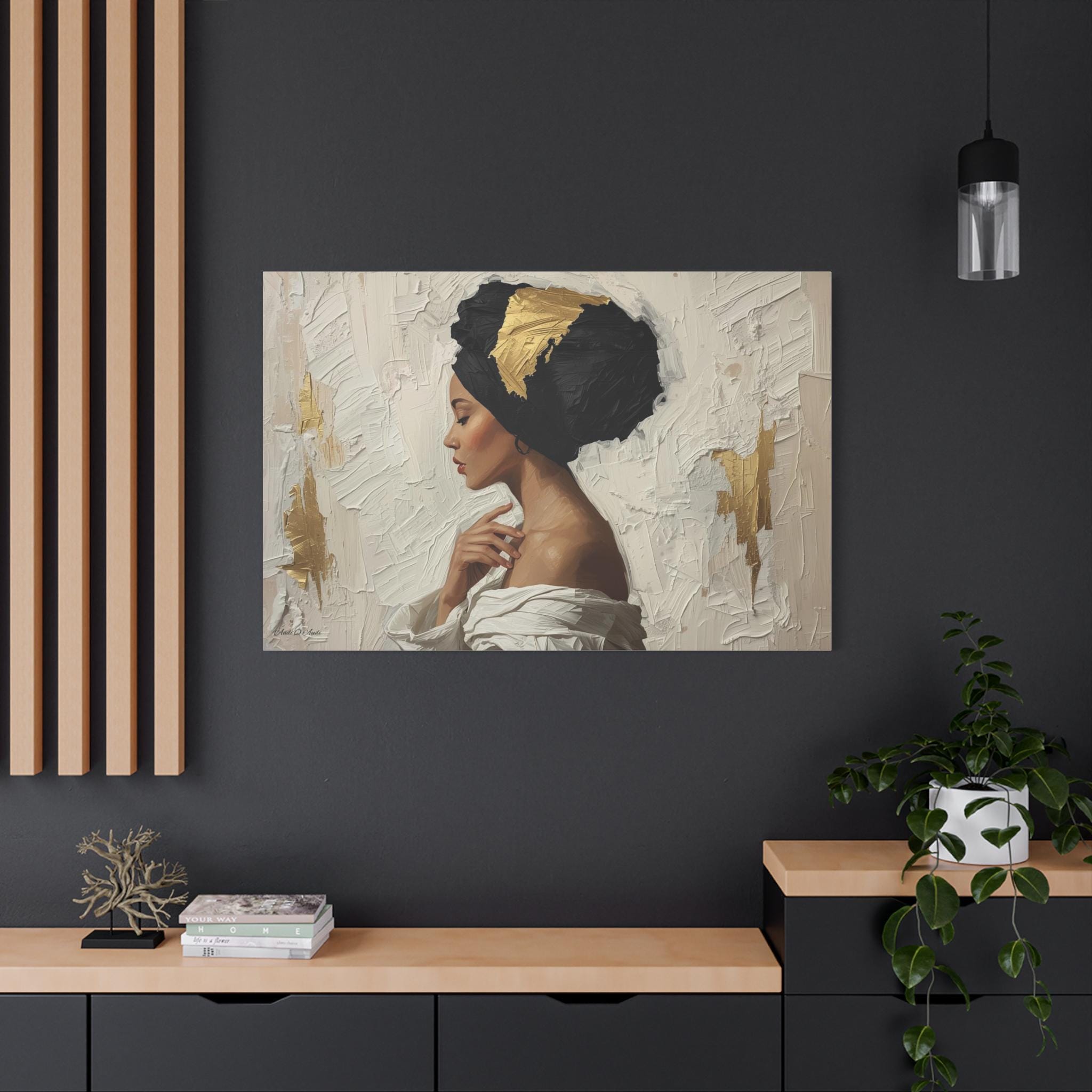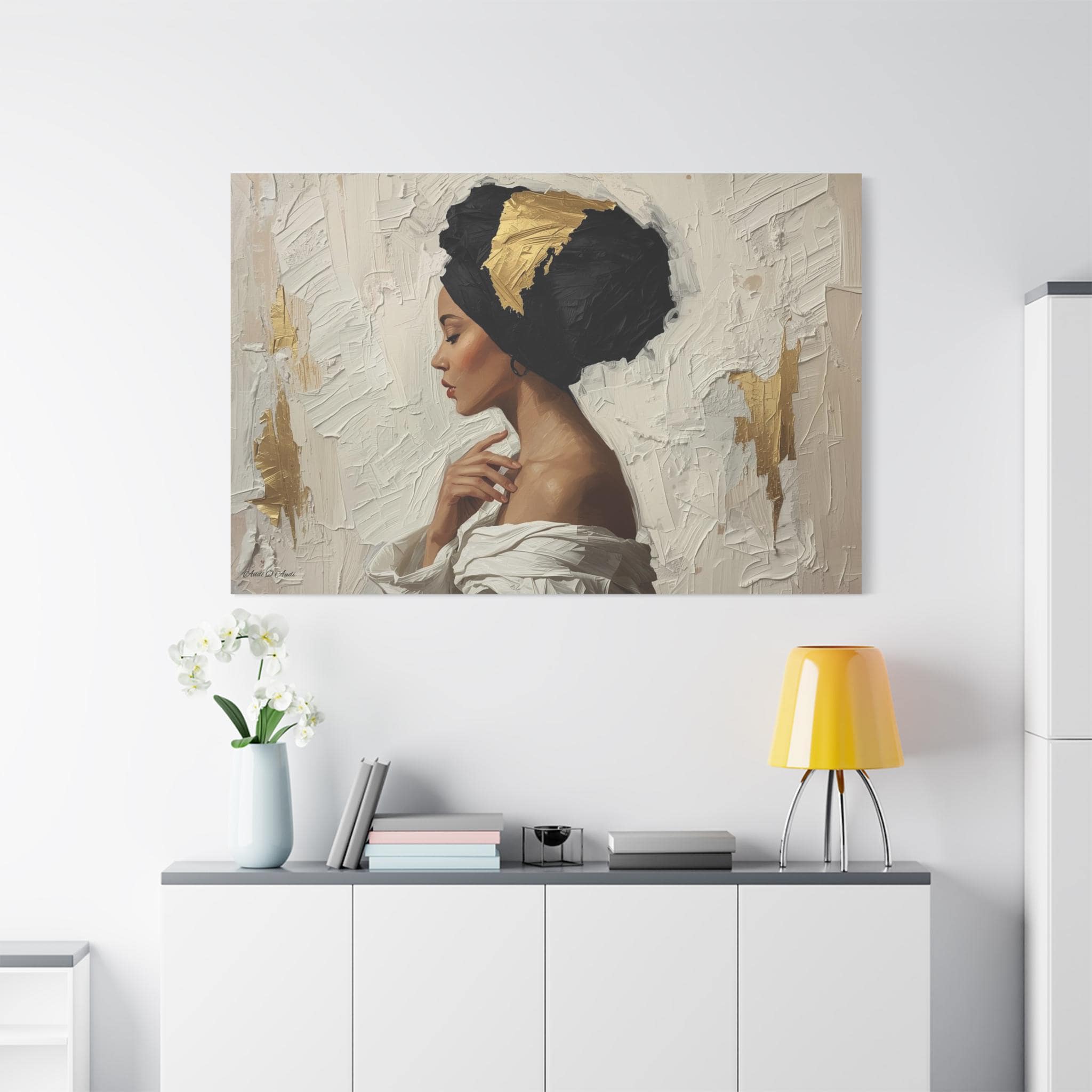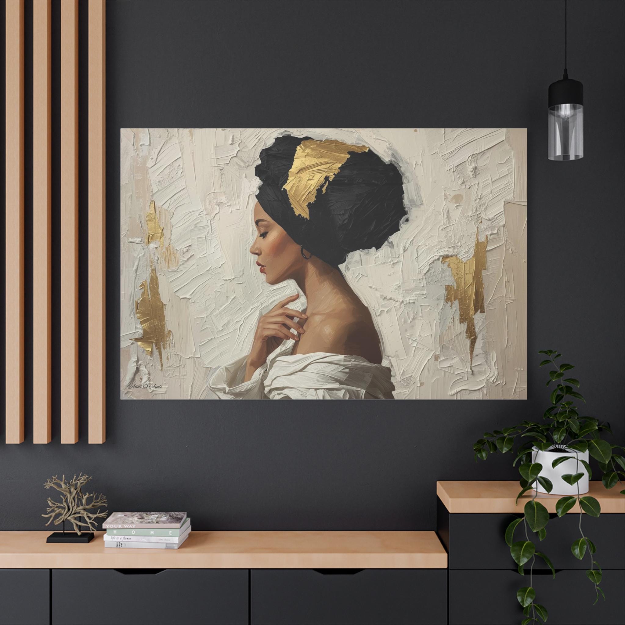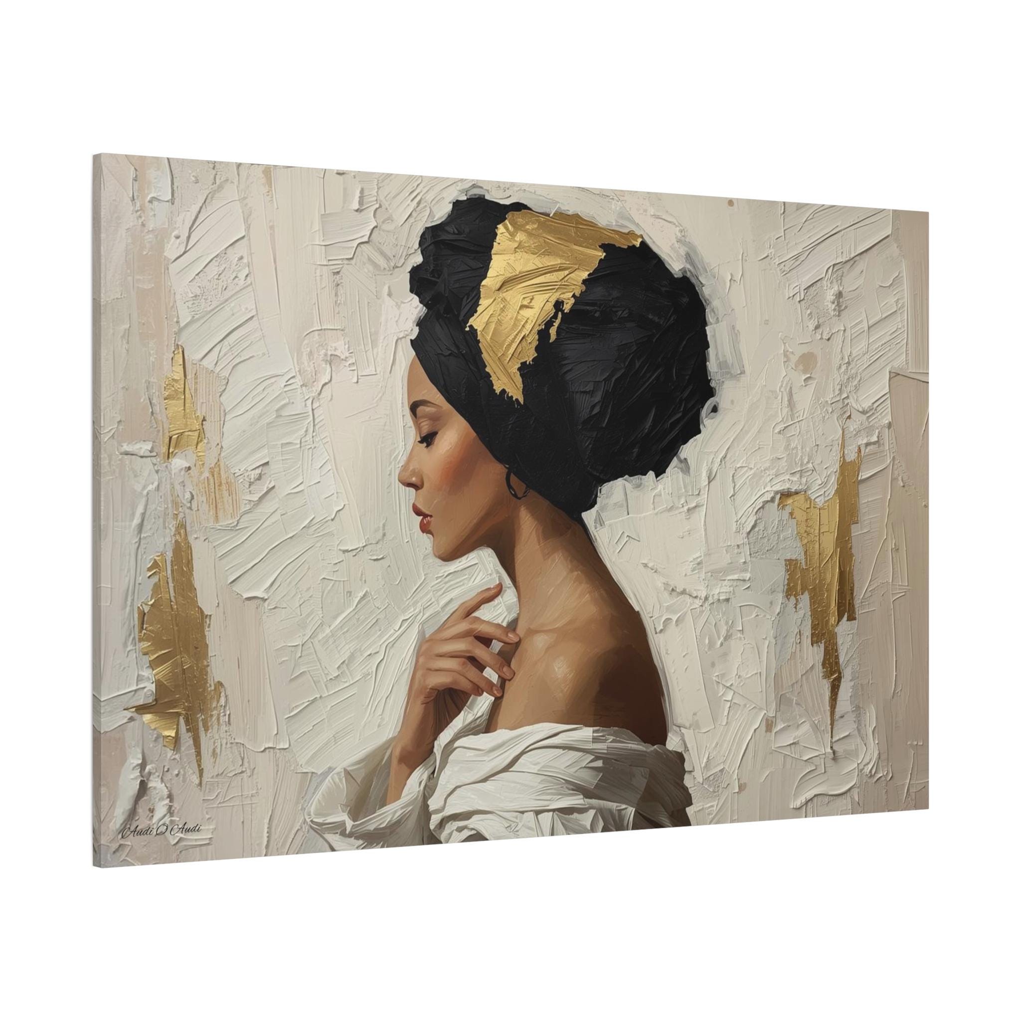 "Golden Silence" is a masterclass in striking contrast and elegant simplicity, rendered in a powerful, contemporary figurative style. The composition centers on a serene woman in profile, her gaze lowered, enveloped by a thick, sculpted black headwrap dramatically accented with bold streaks of metallic gold leaf.