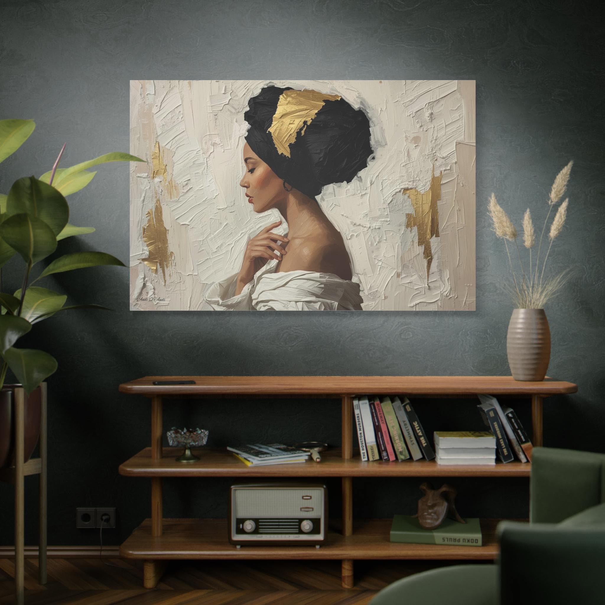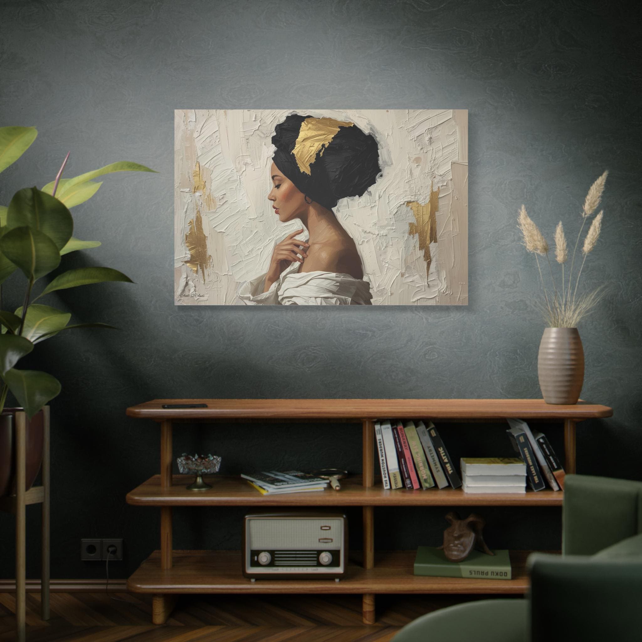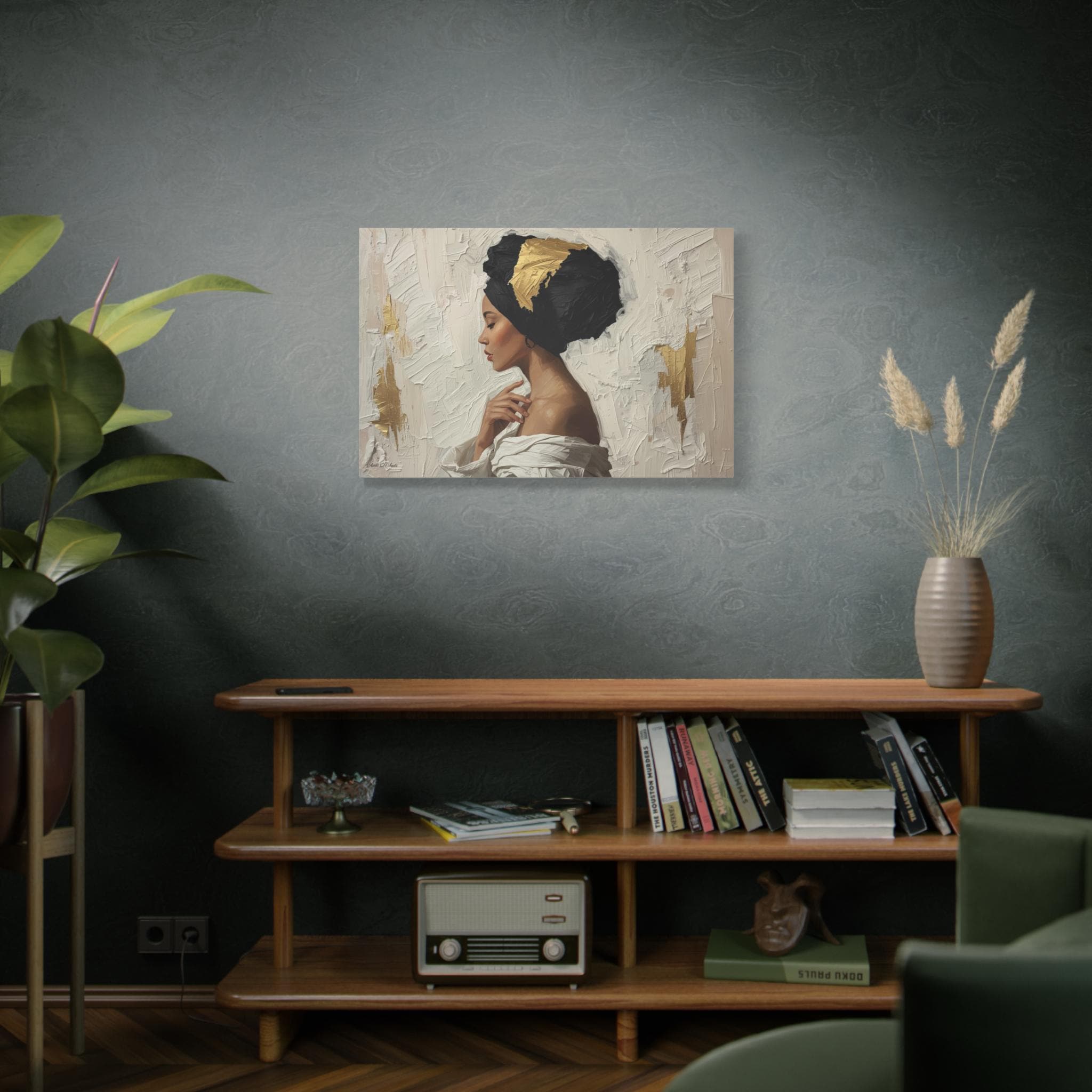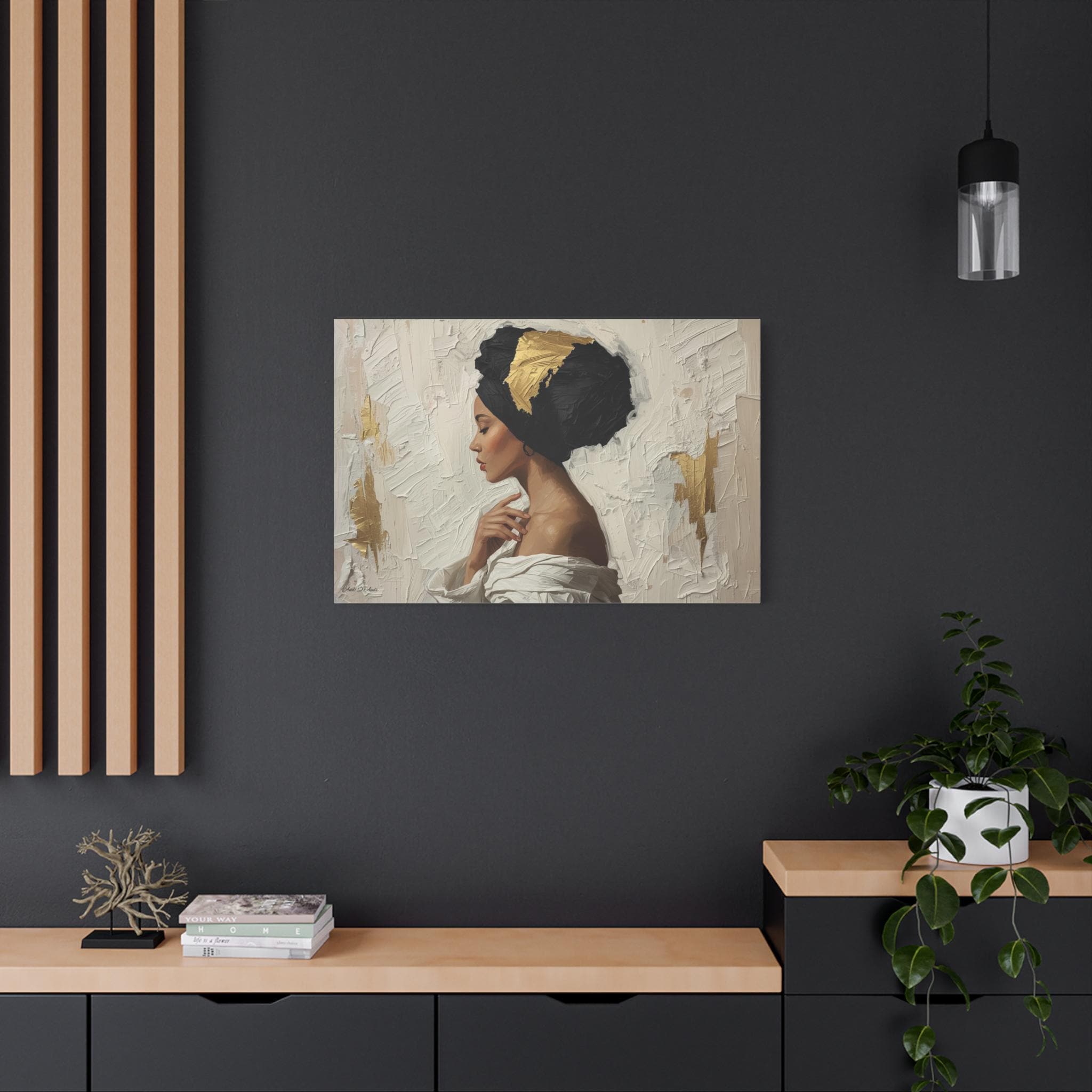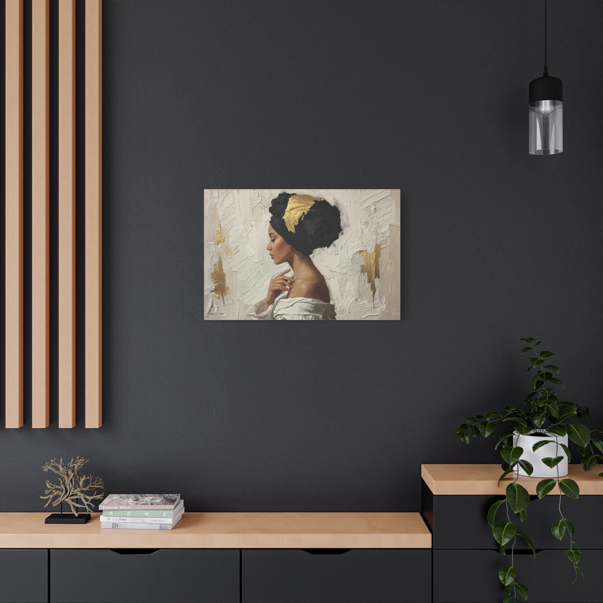 "Golden Silence" is a masterclass in striking contrast and elegant simplicity, rendered in a powerful, contemporary figurative style. The composition centers on a serene woman in profile, her gaze lowered, enveloped by a thick, sculpted black headwrap dramatically accented with bold streaks of metallic gold leaf.