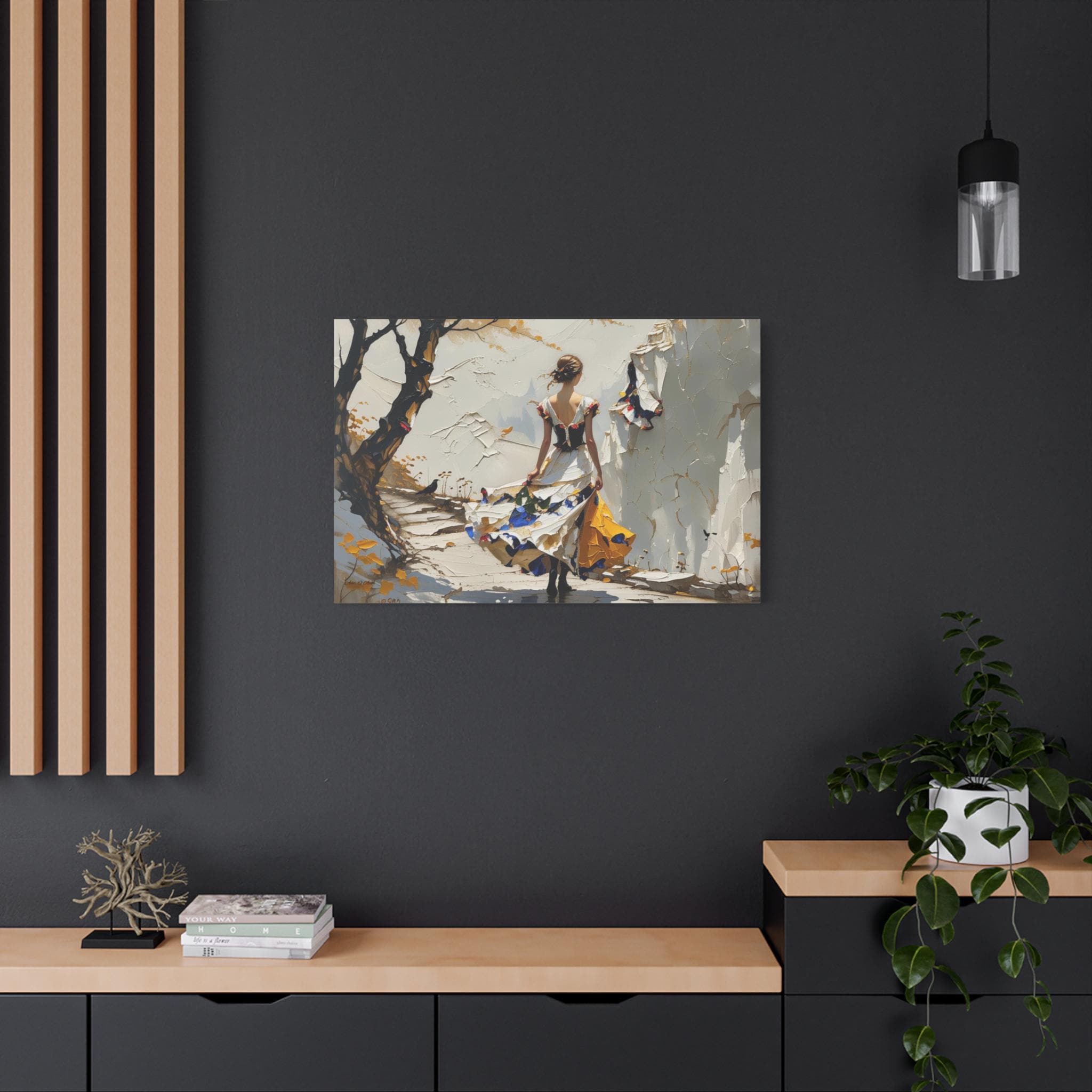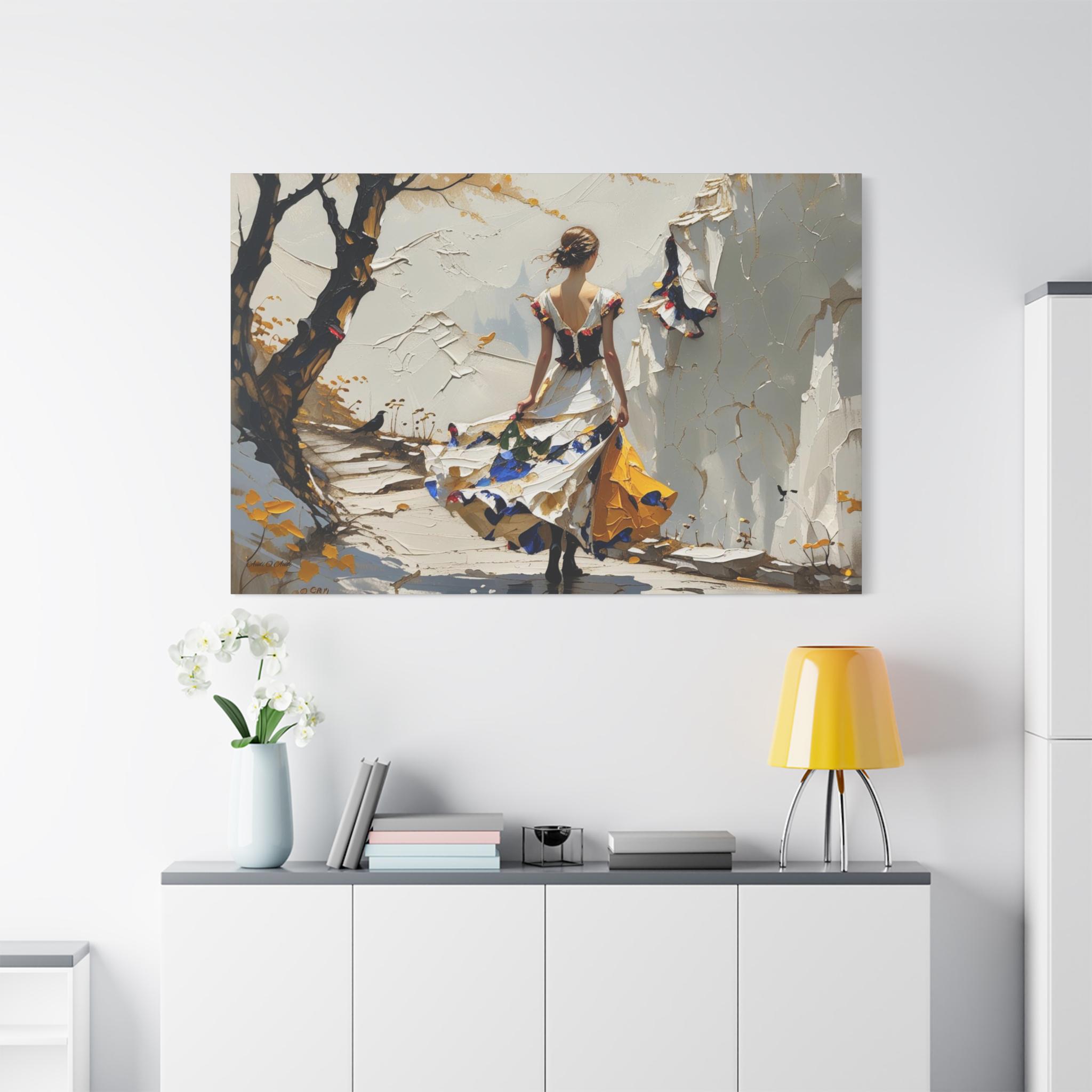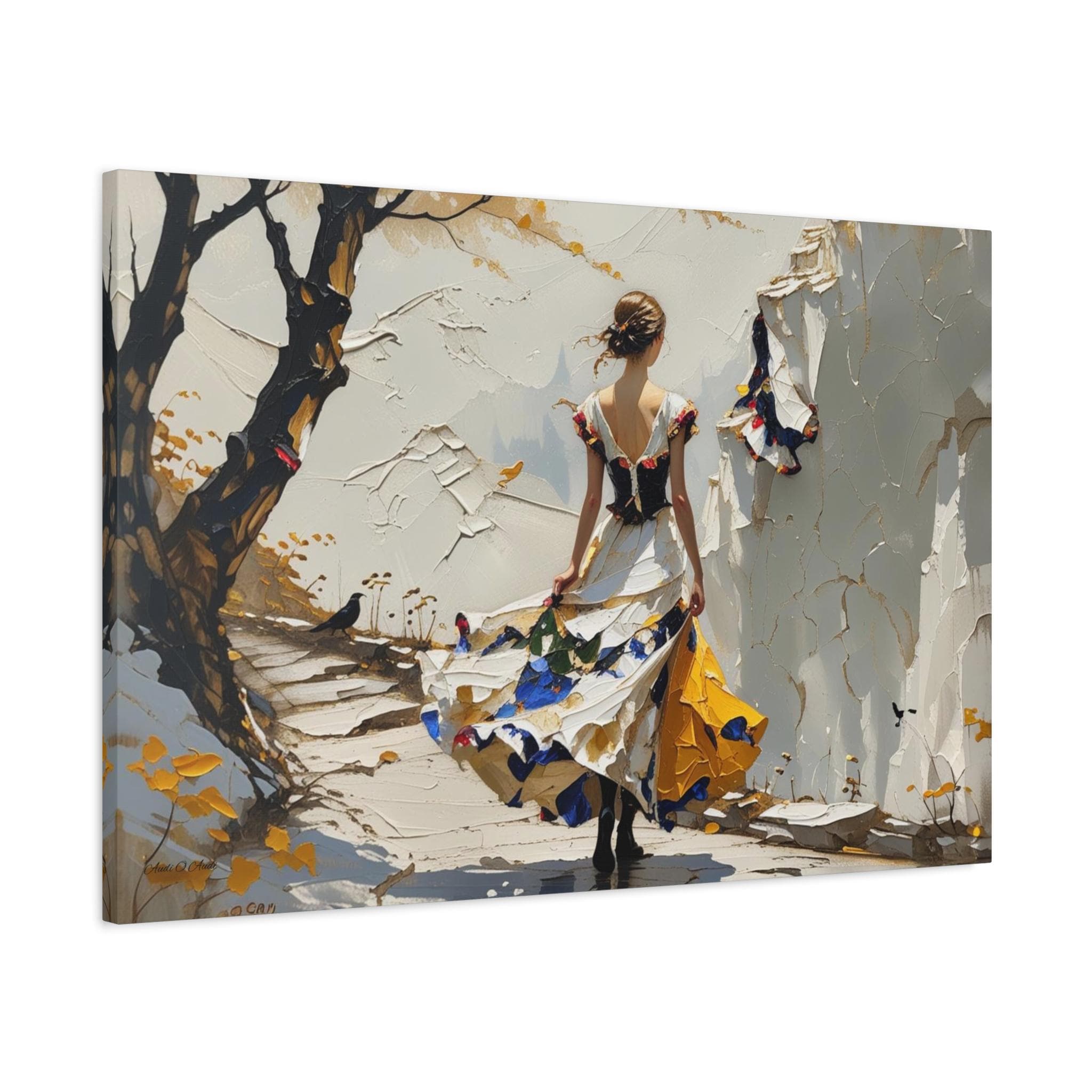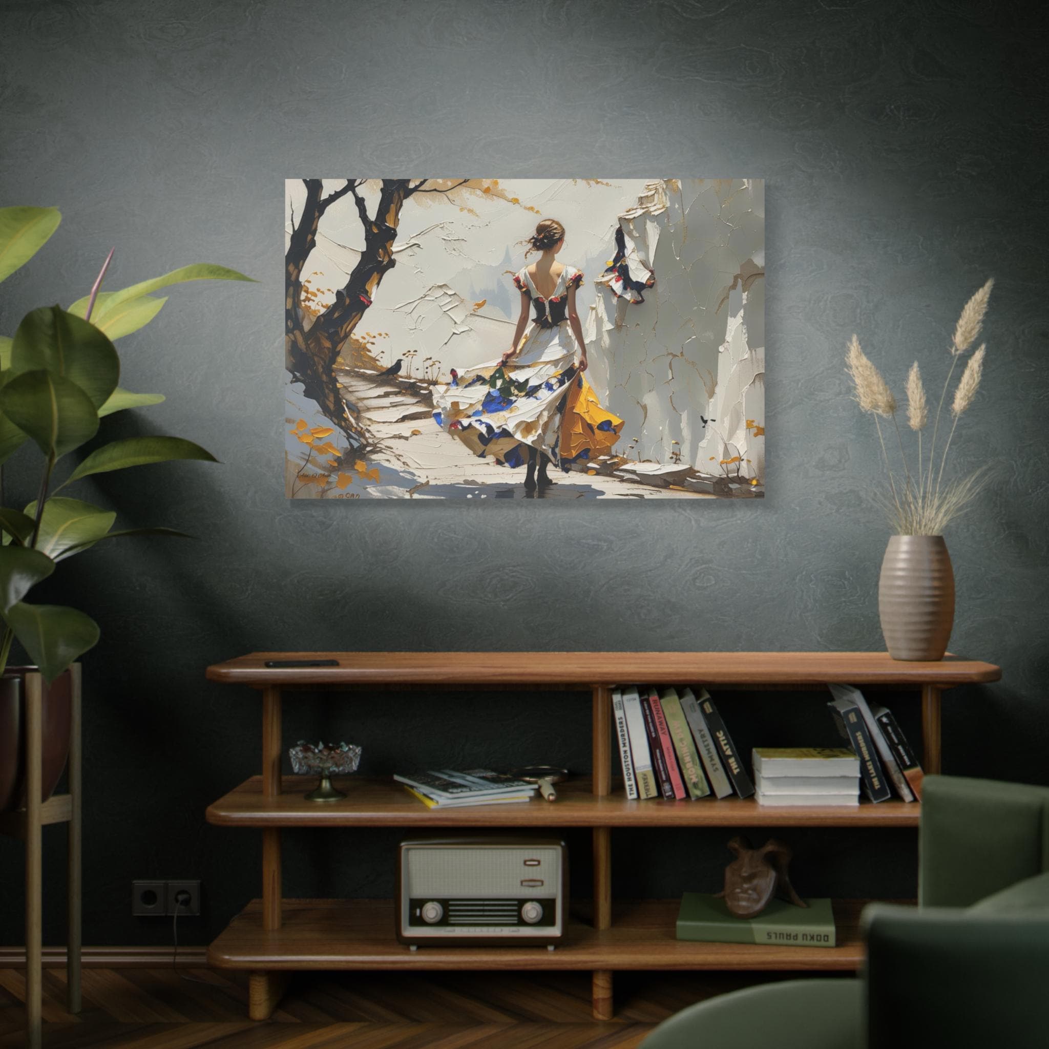 Impasto Stroll, Woman in Floral Dress walking canvas Print.