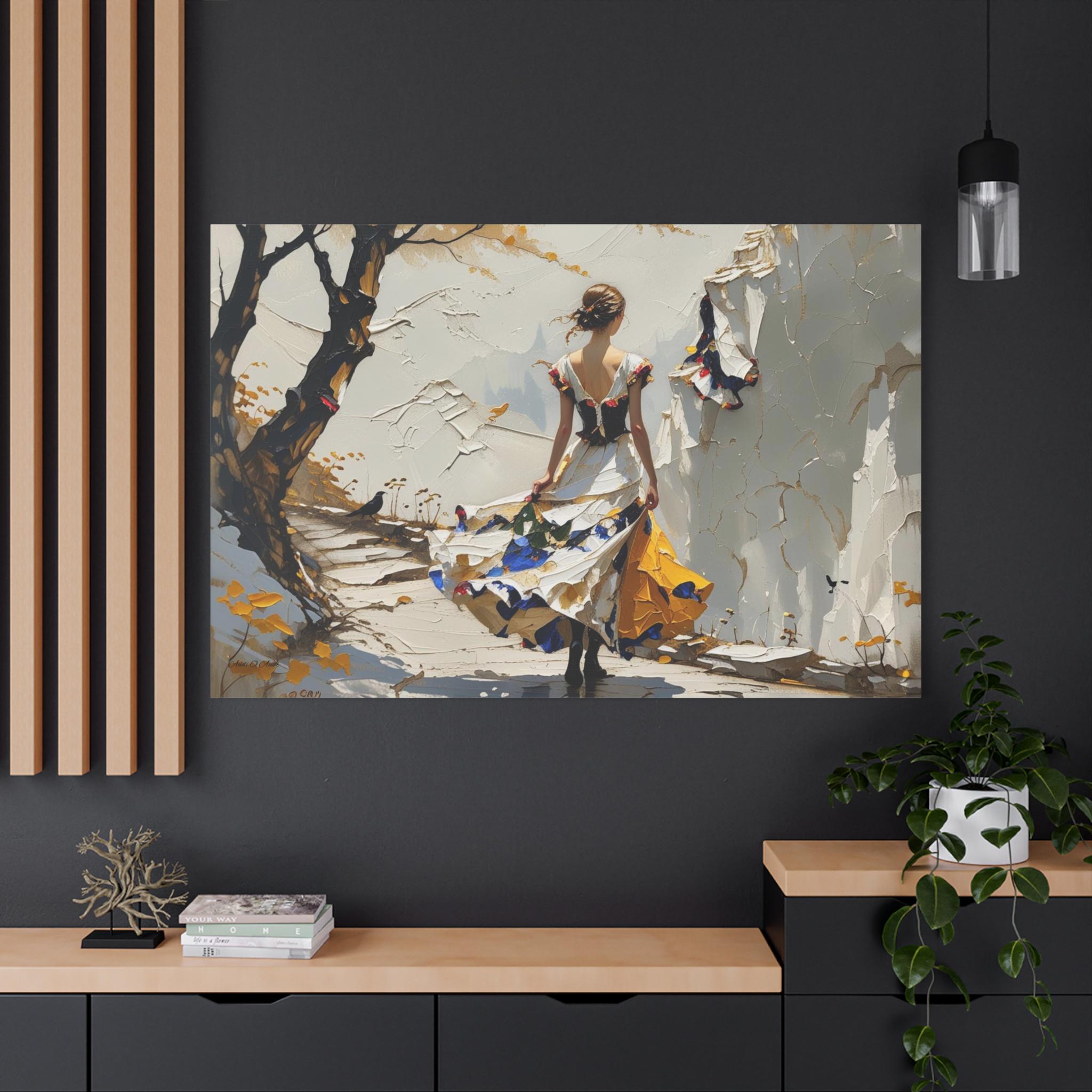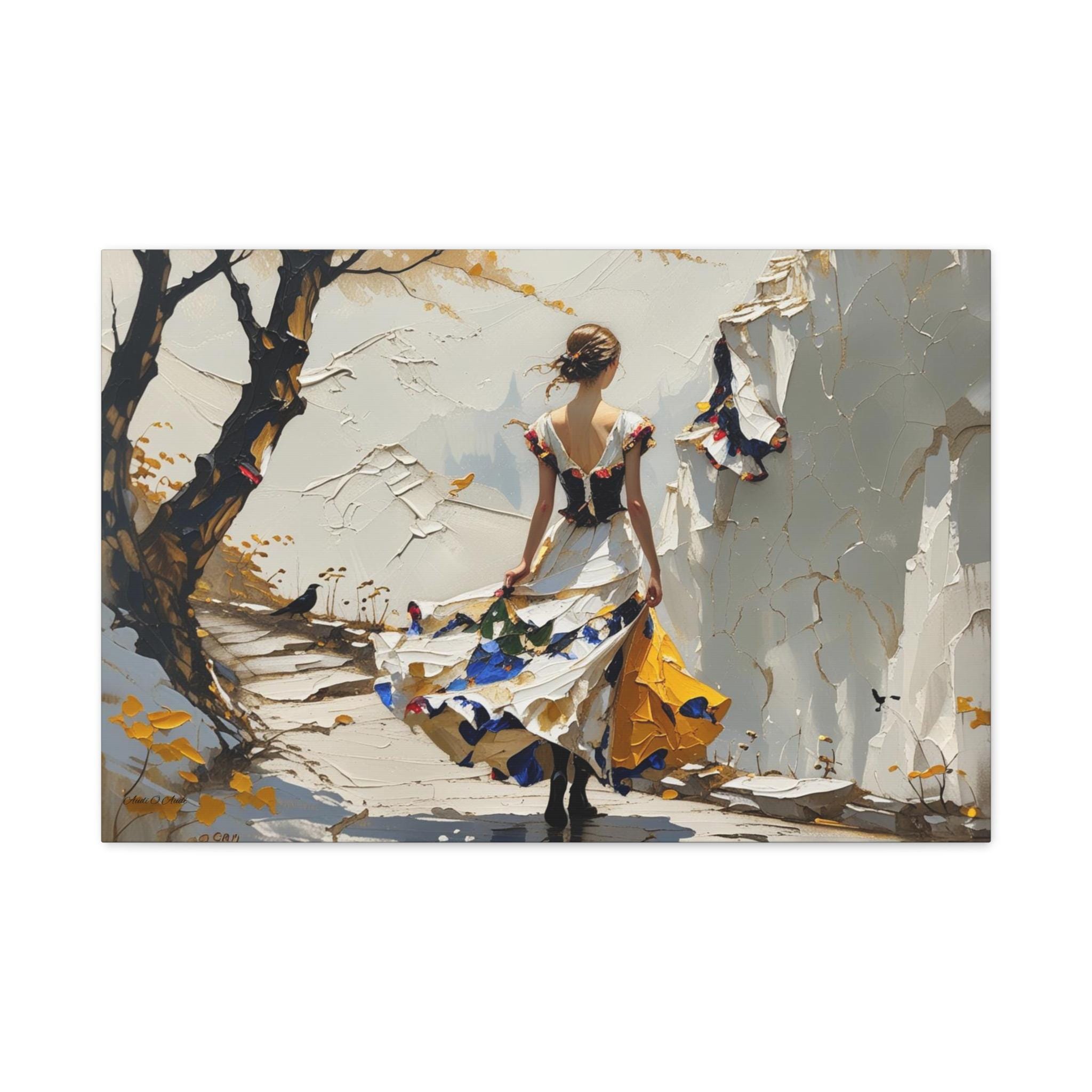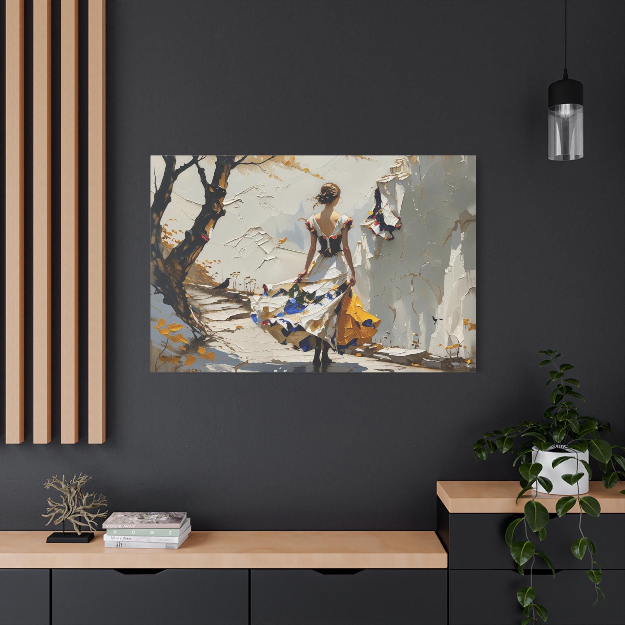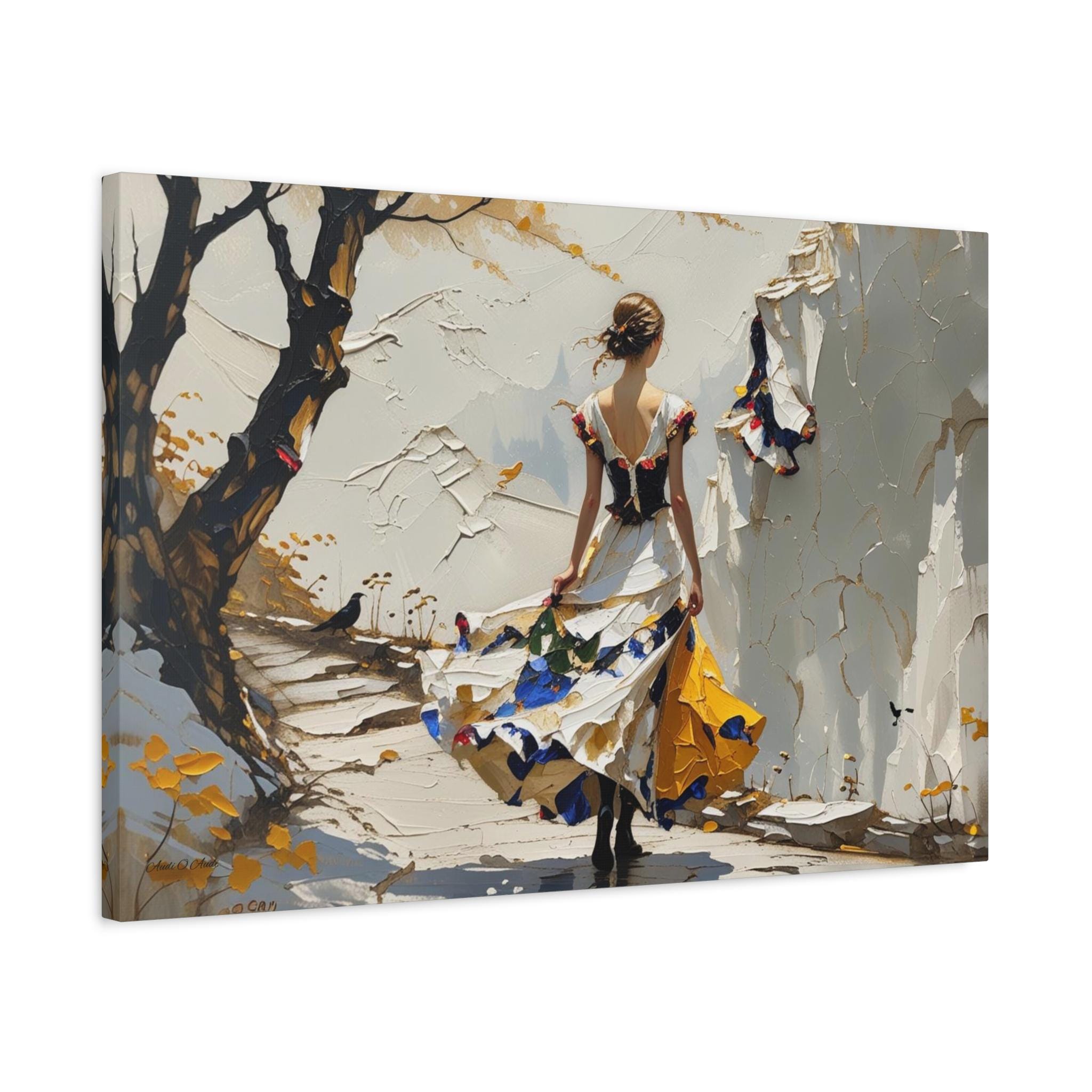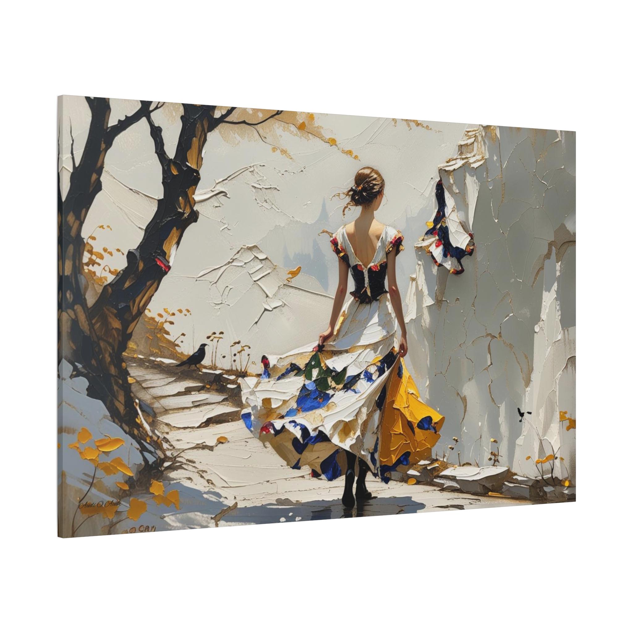 Impasto Stroll, Woman in Floral Dress walking canvas Print.