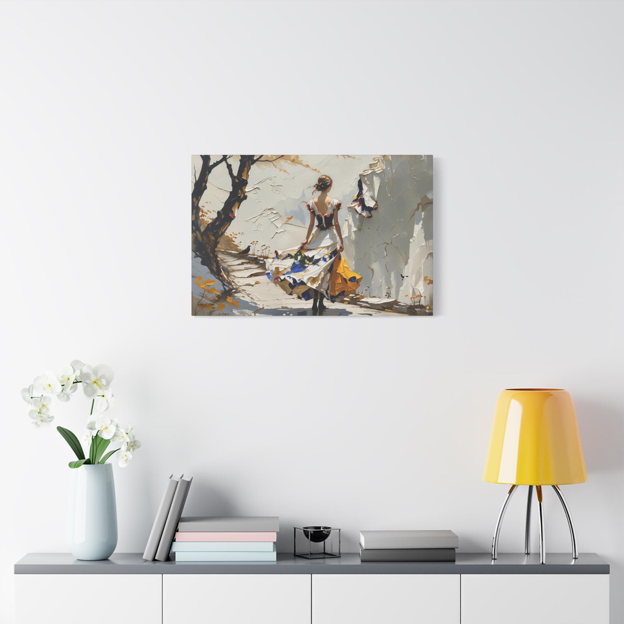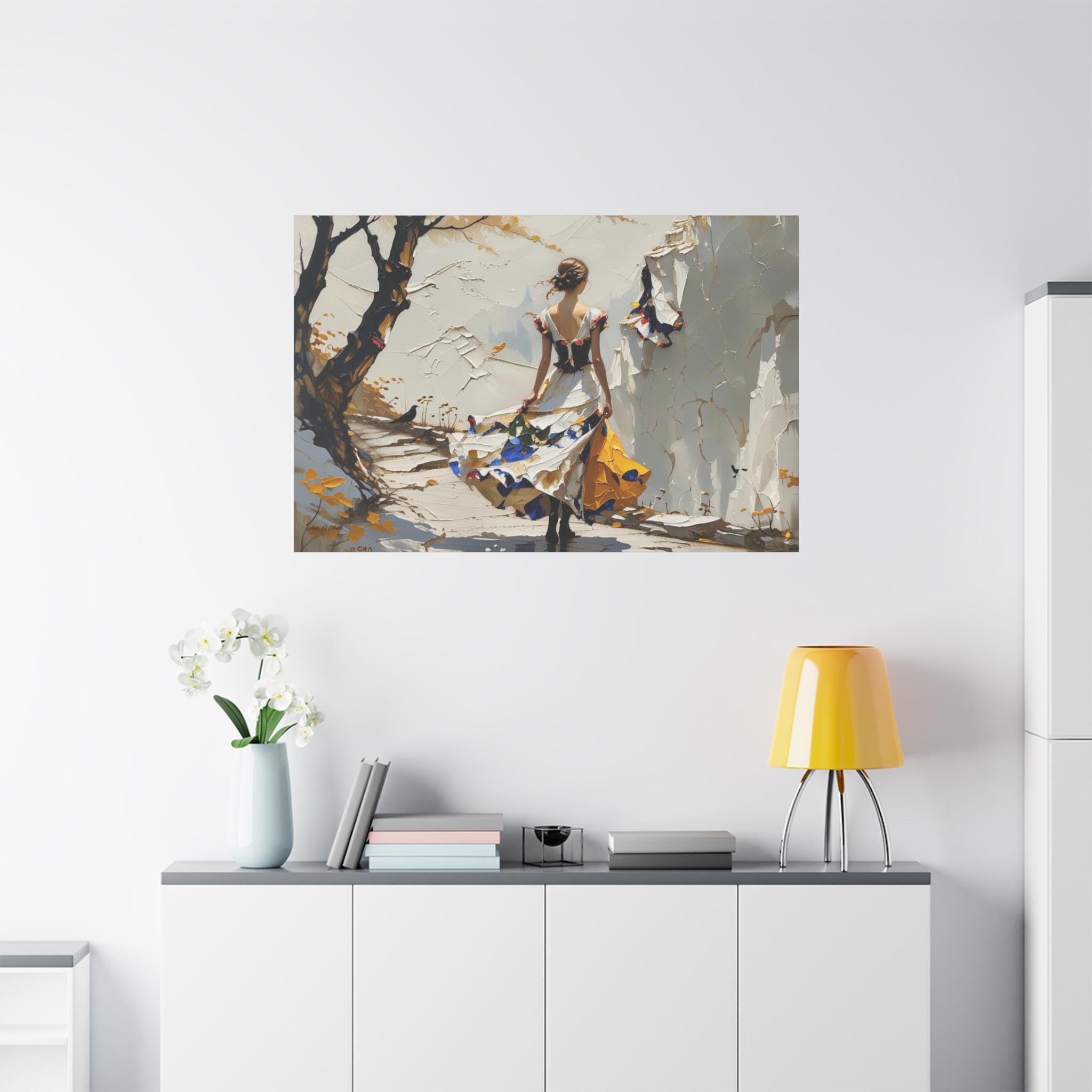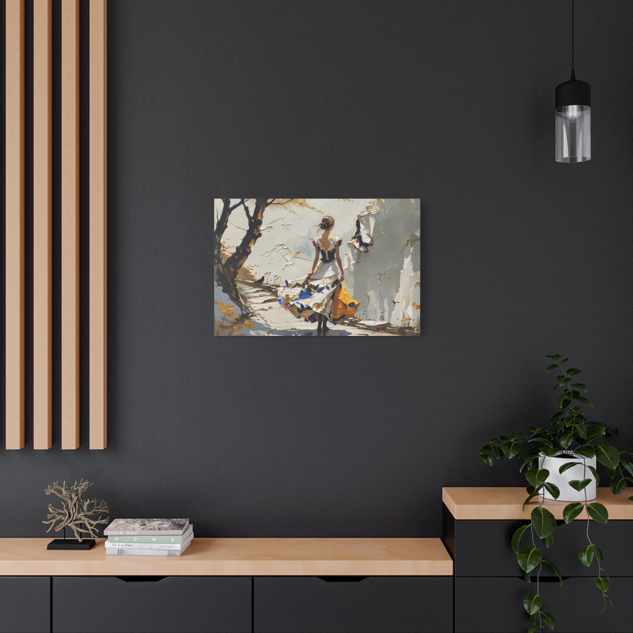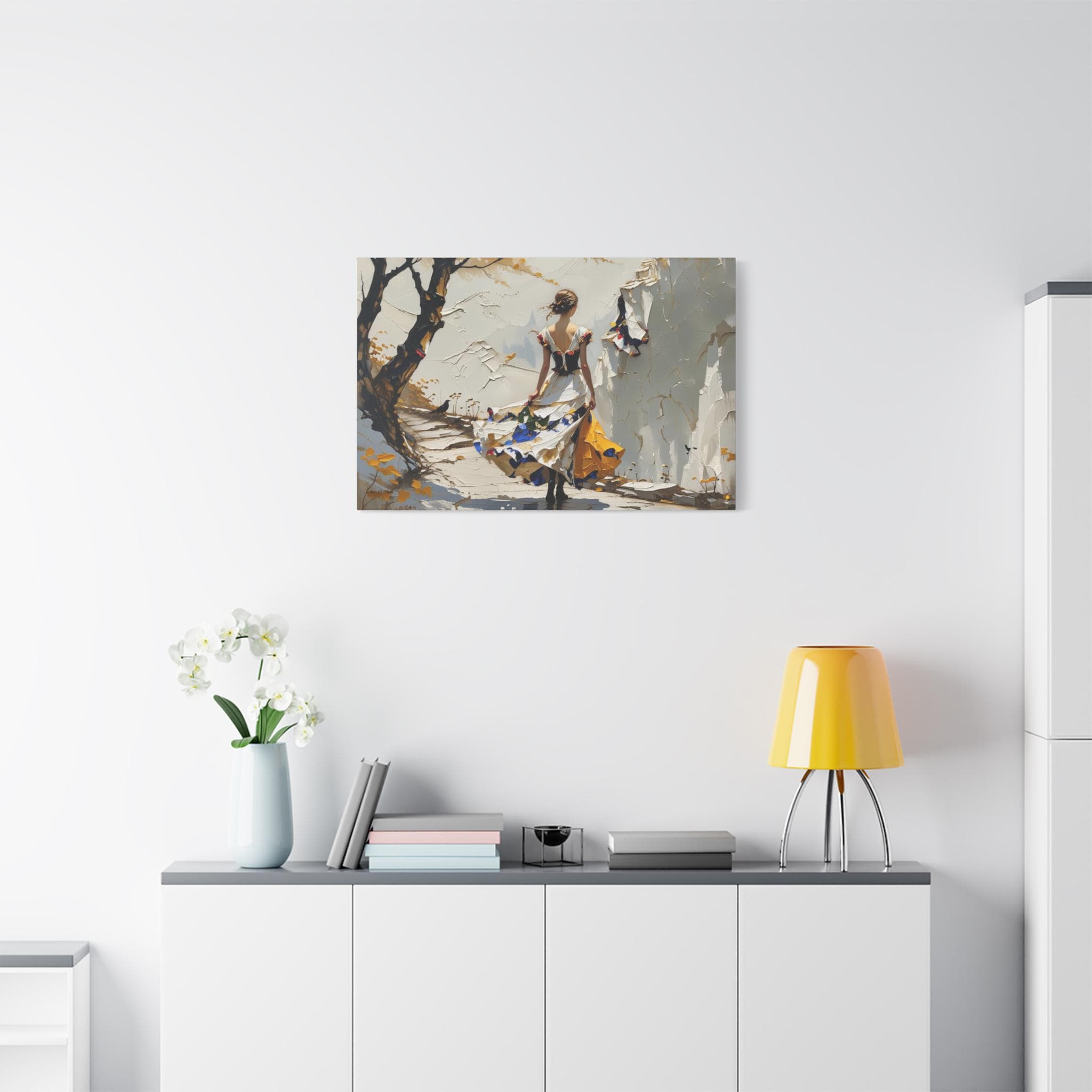 Impasto Stroll, Woman in Floral Dress walking canvas Print.
