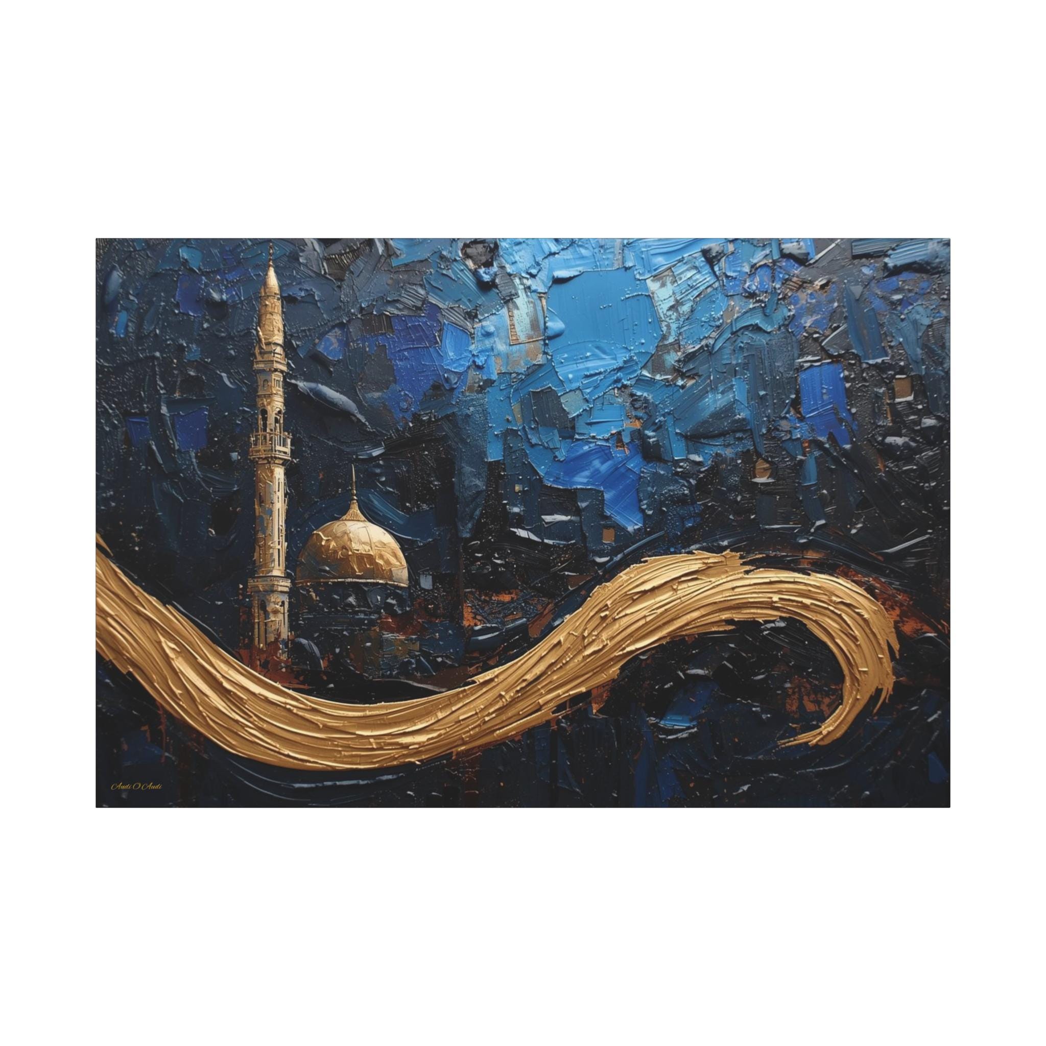 The scene features a stately minaret and dome, rendered in luminous, rich gold, which appears to glow from an inner light. These elements are set against a background of deep midnight blues, textured blacks, and vivid cobalt, applied with thick, energetic strokes that convey a sense of movement and drama.