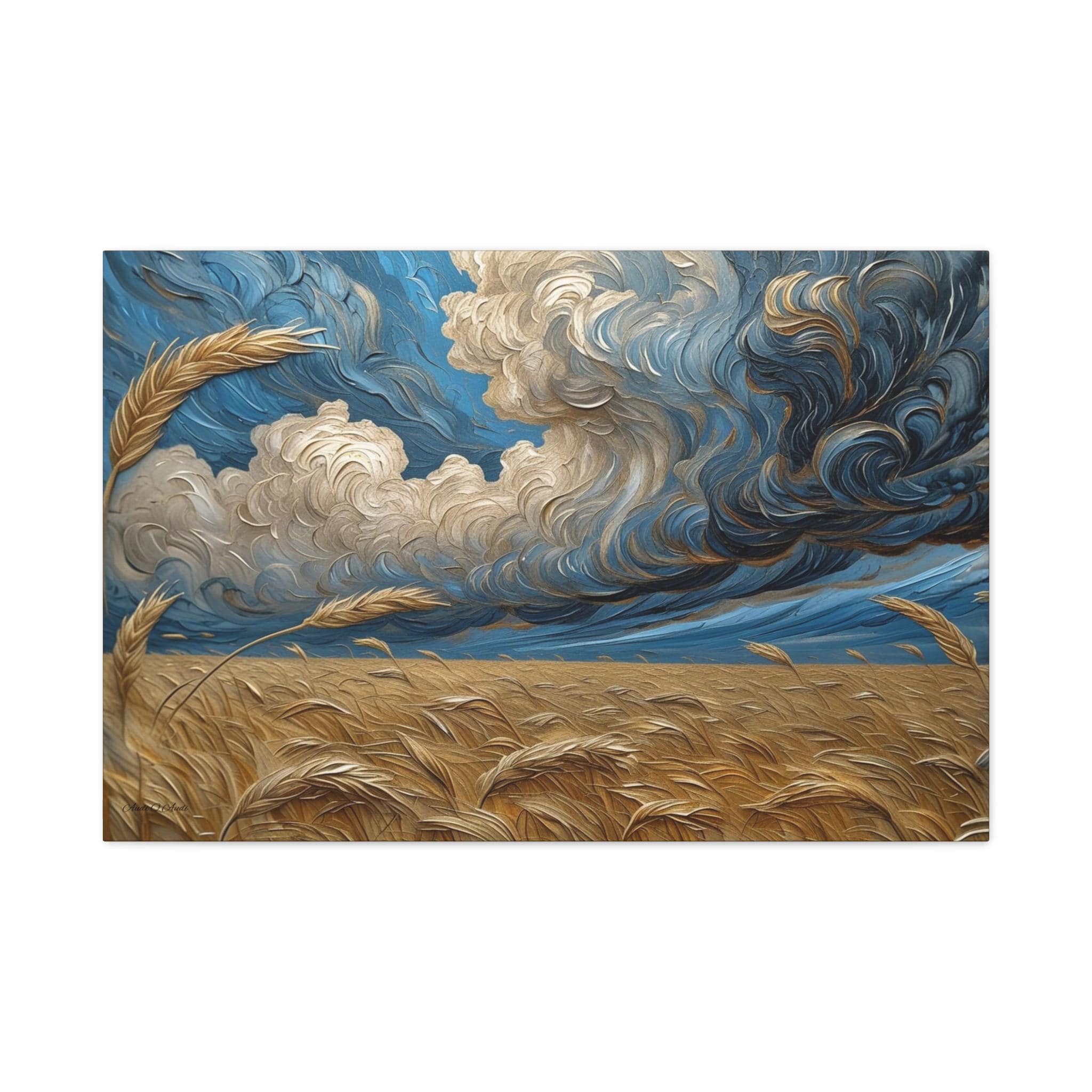The sky is a dramatic, turbulent symphony of deep cobalt, midnight blues, and swirling white clouds, rendered with thick, expressionistic strokes that capture the energy of a brewing storm. Below, a vast field of ripe wheat stretches to the horizon in rich tones of gold, amber, and ochre. The wheat stalks are also depicted with textural strokes, suggesting they are being swept by the same strong winds captured in the clouds above. This piece is a powerful ode to the elemental forces of nature, providing a focal point of dramatic energy and rich, earthy color.