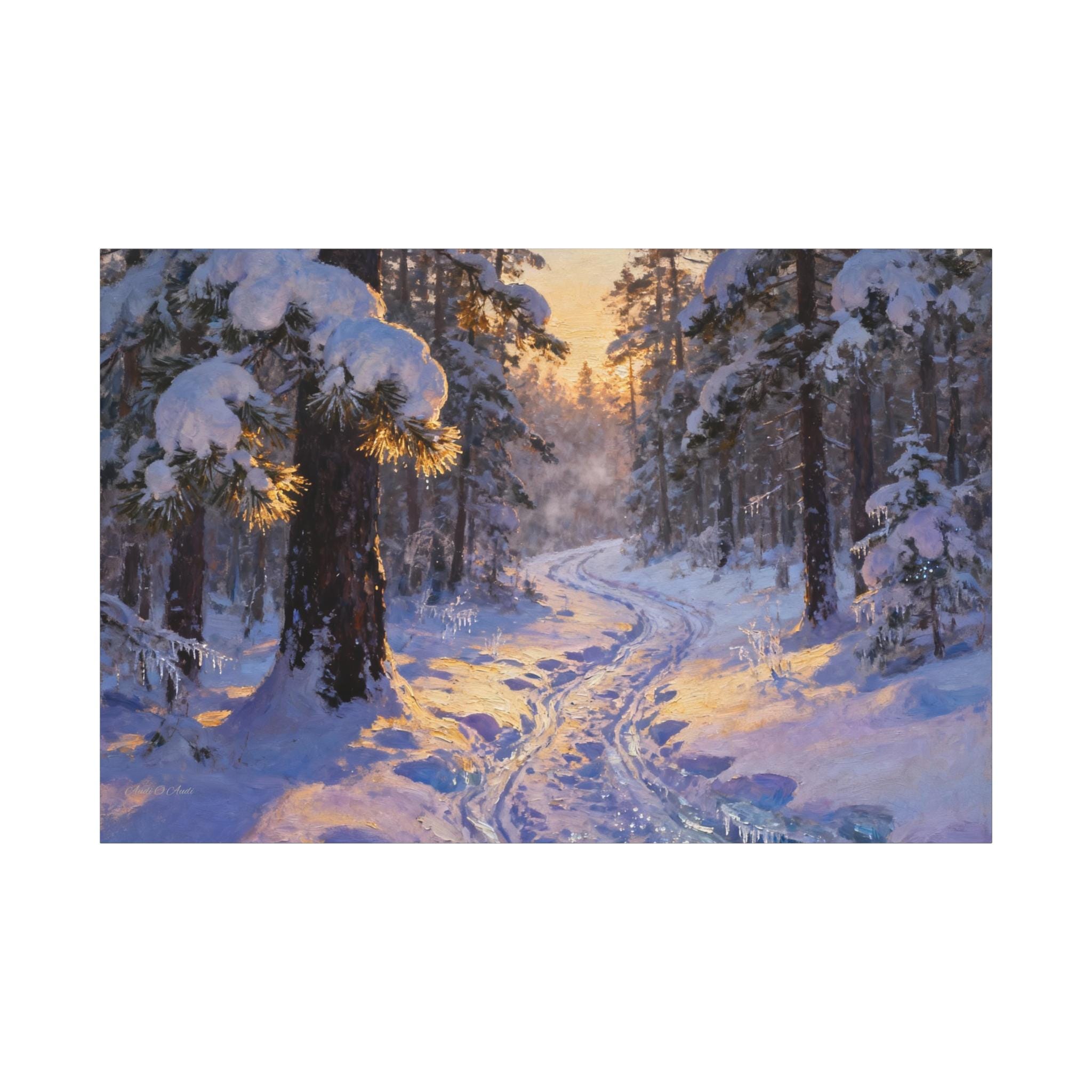 Aesthetic & Style: The piece captures a dramatic Impressionistic winter landscape. The rich, saturated colors and clear brushstrokes translate beautifully, offering a painterly depth that distinguishes it from a standard photograph or poster.