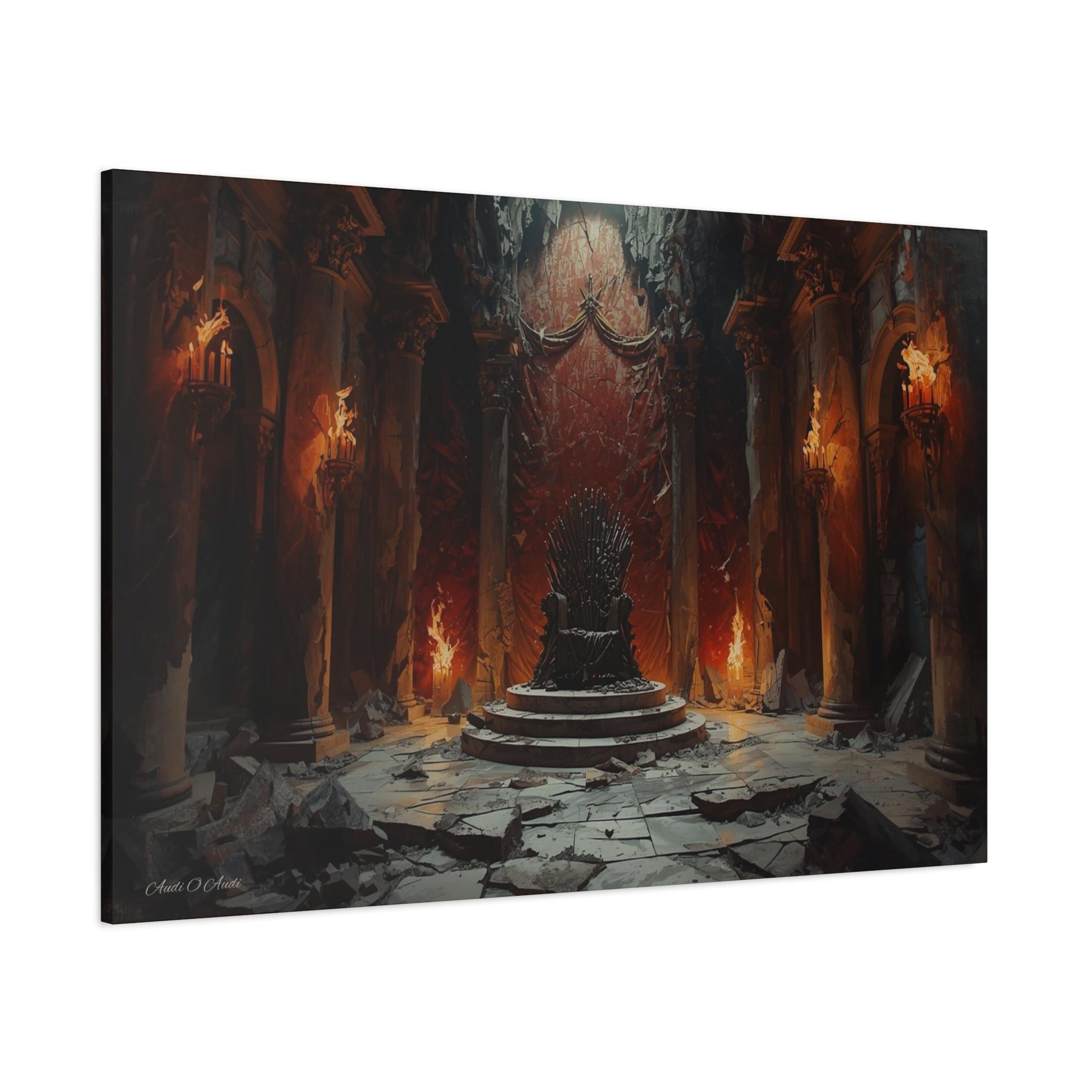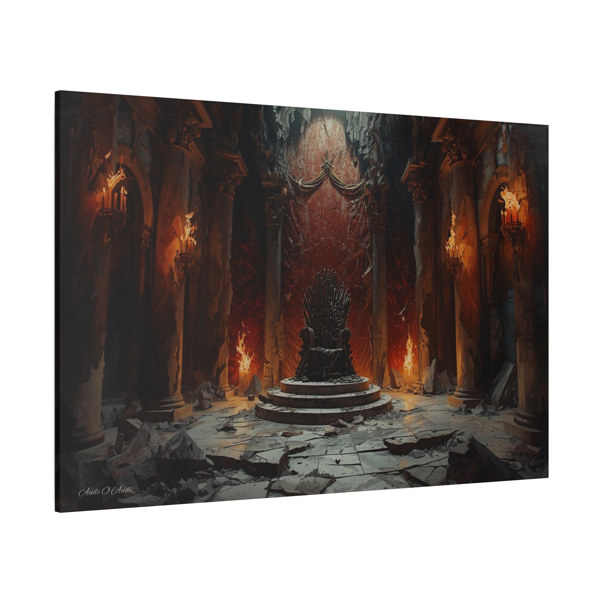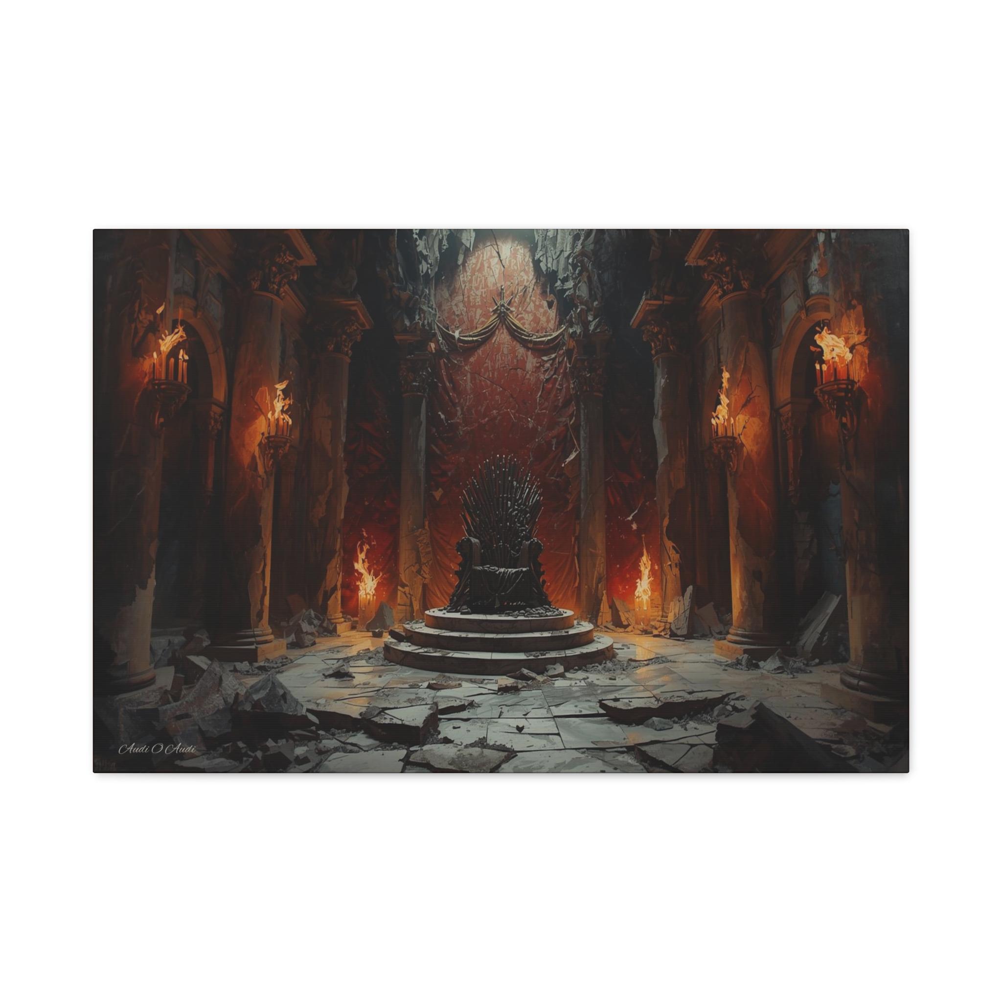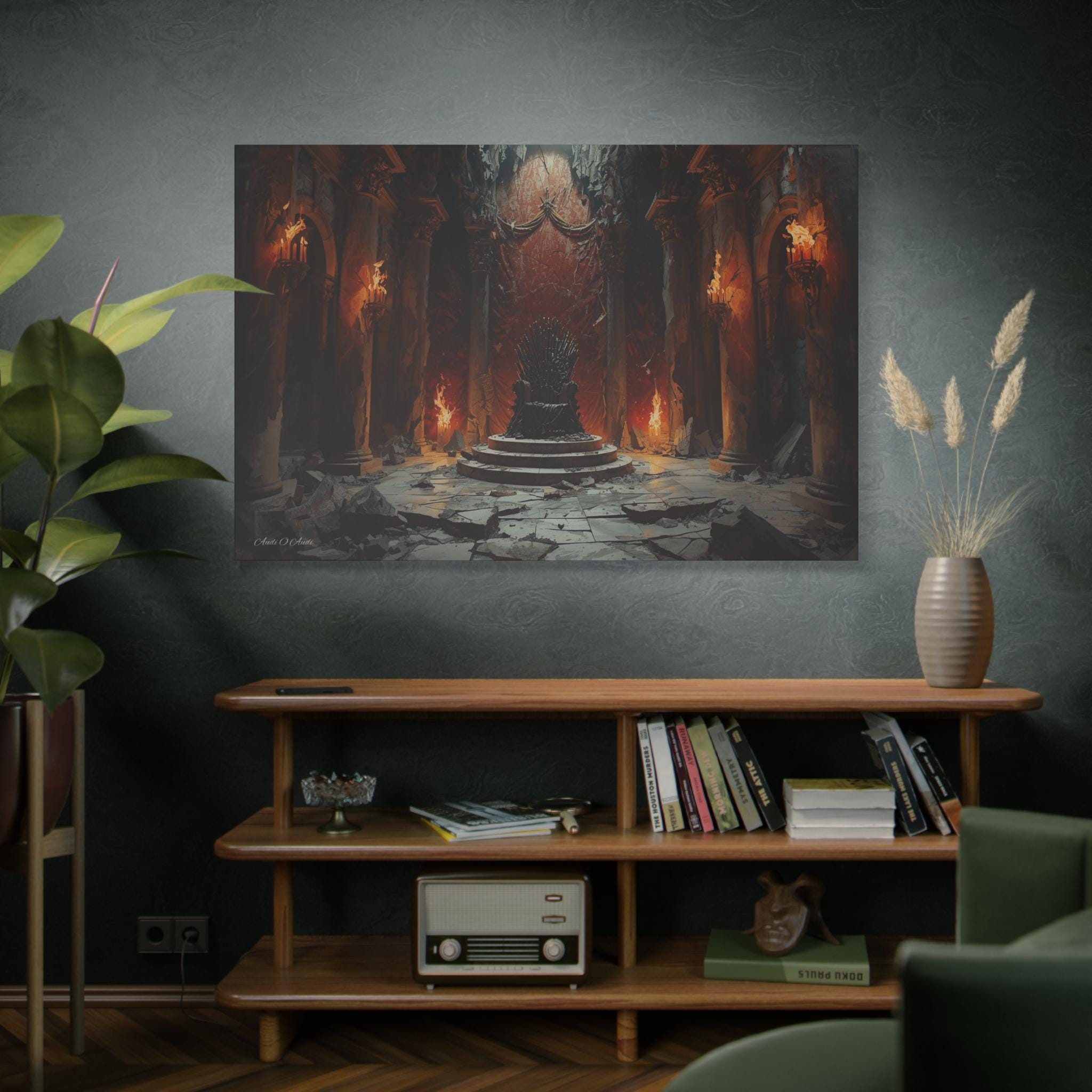 At the center, raised upon a broken dais, sits an intimidating, intricate throne of forged iron or blades, symbolizing a fierce and brutal power now abandoned. Behind it, a dramatic backdrop of fiery red and cracked stone hints at the violent end of the dynasty. The floor is strewn with rubble, emphasizing the overwhelming decay. This piece is a powerful focal point for spaces seeking an epic, narrative, and visually intense statement about the inevitable ruin of human ambition. This piece has a highly sophisticated aesthetic that perfectly blends architectural ruins with dark fantasy. Its size and mood make it an excellent investment for high-end man caves, luxury media rooms, or contemporary spaces seeking a bold, narrative focus.