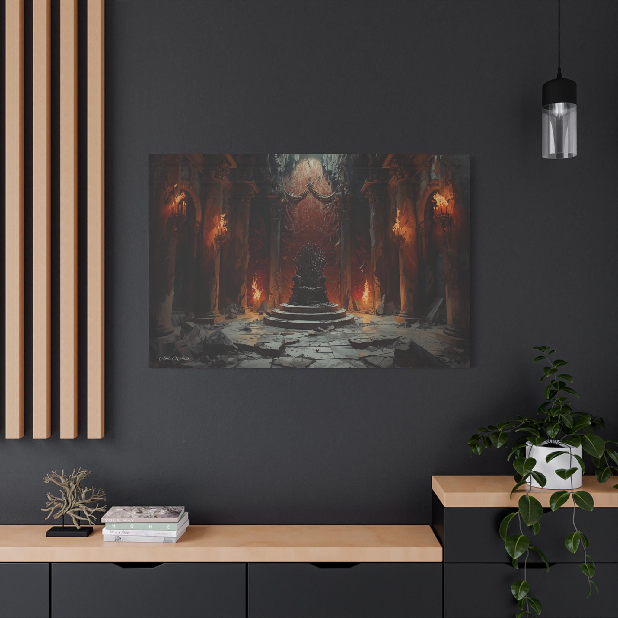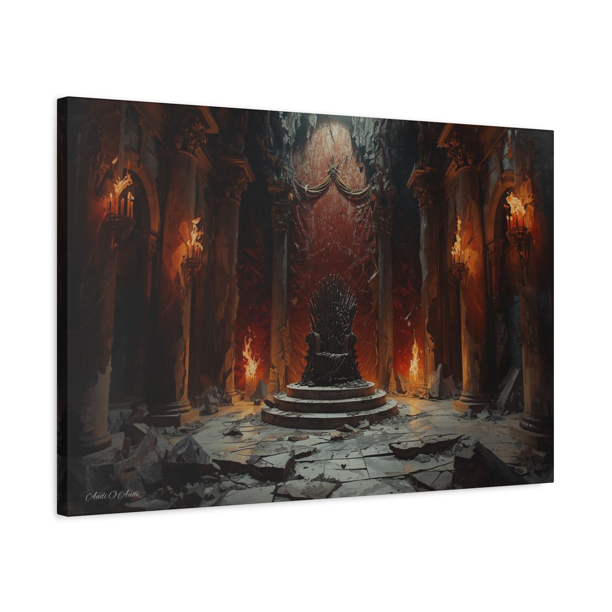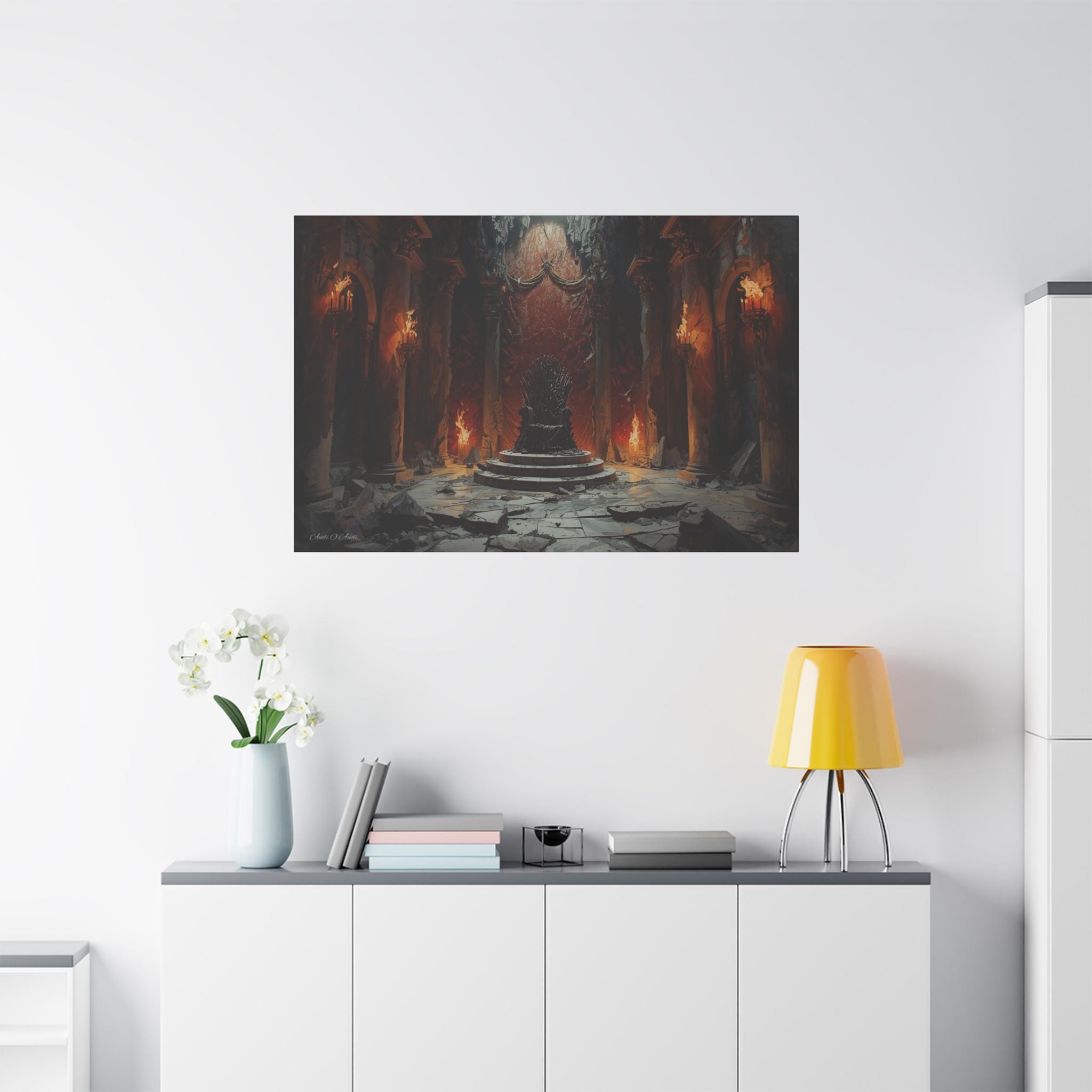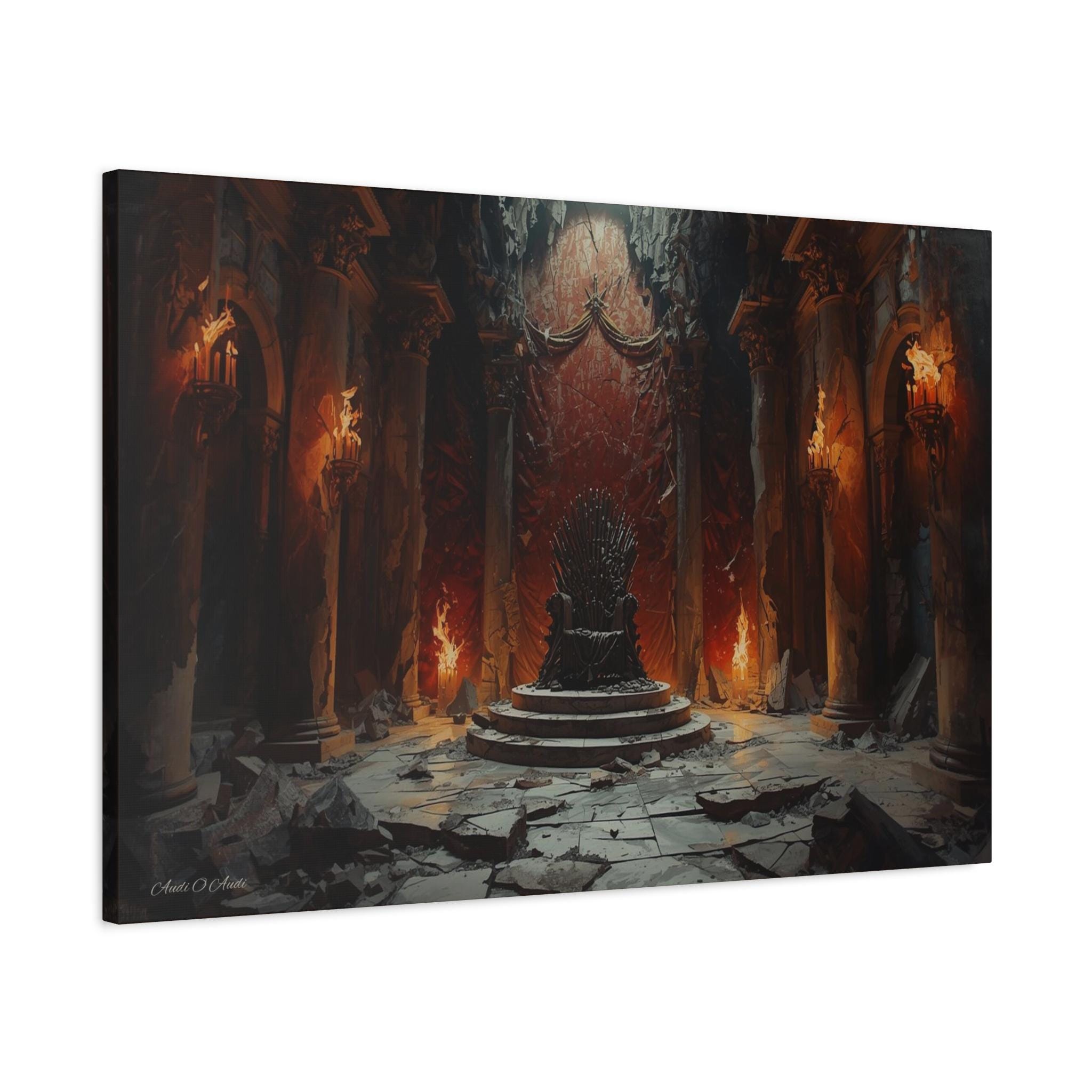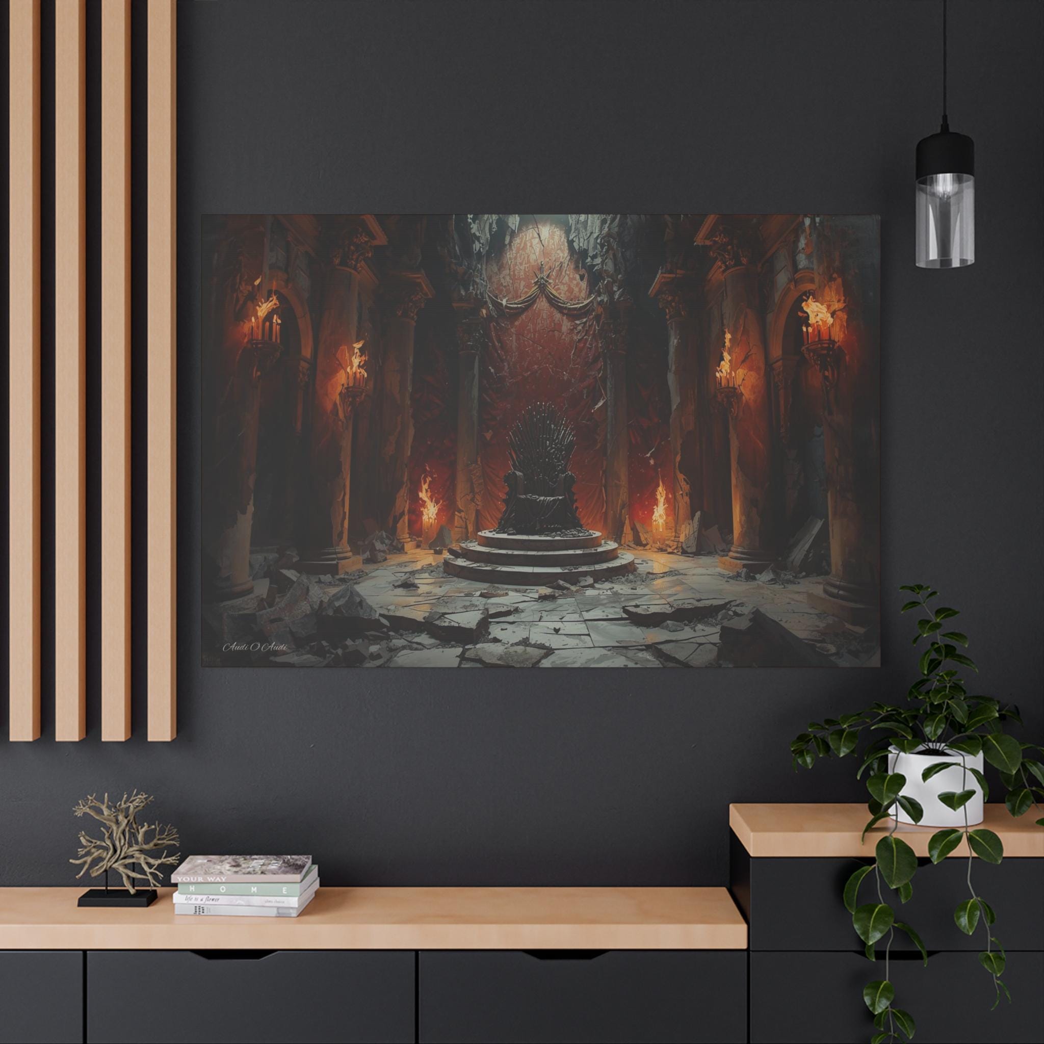 At the center, raised upon a broken dais, sits an intimidating, intricate throne of forged iron or blades, symbolizing a fierce and brutal power now abandoned. Behind it, a dramatic backdrop of fiery red and cracked stone hints at the violent end of the dynasty. The floor is strewn with rubble, emphasizing the overwhelming decay. This piece is a powerful focal point for spaces seeking an epic, narrative, and visually intense statement about the inevitable ruin of human ambition. This piece has a highly sophisticated aesthetic that perfectly blends architectural ruins with dark fantasy. Its size and mood make it an excellent investment for high-end man caves, luxury media rooms, or contemporary spaces seeking a bold, narrative focus.