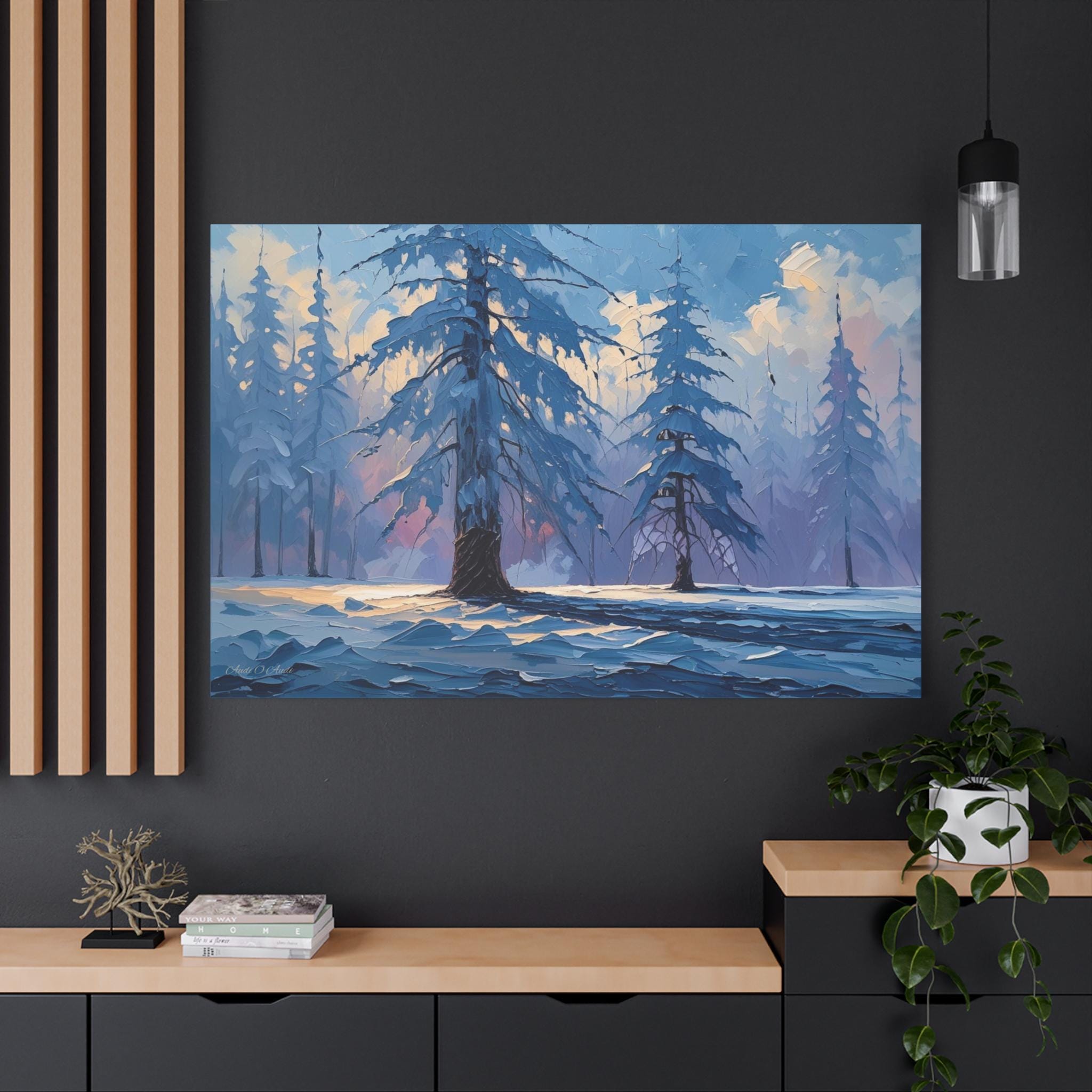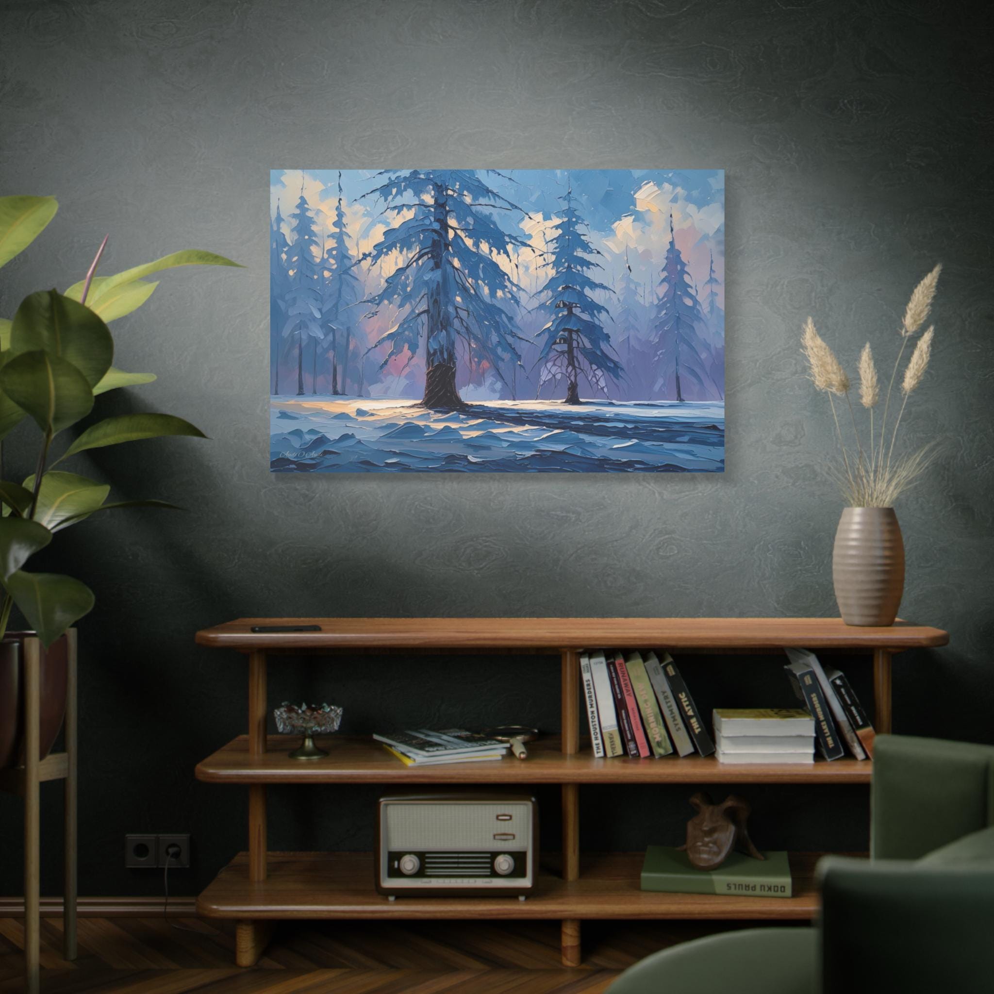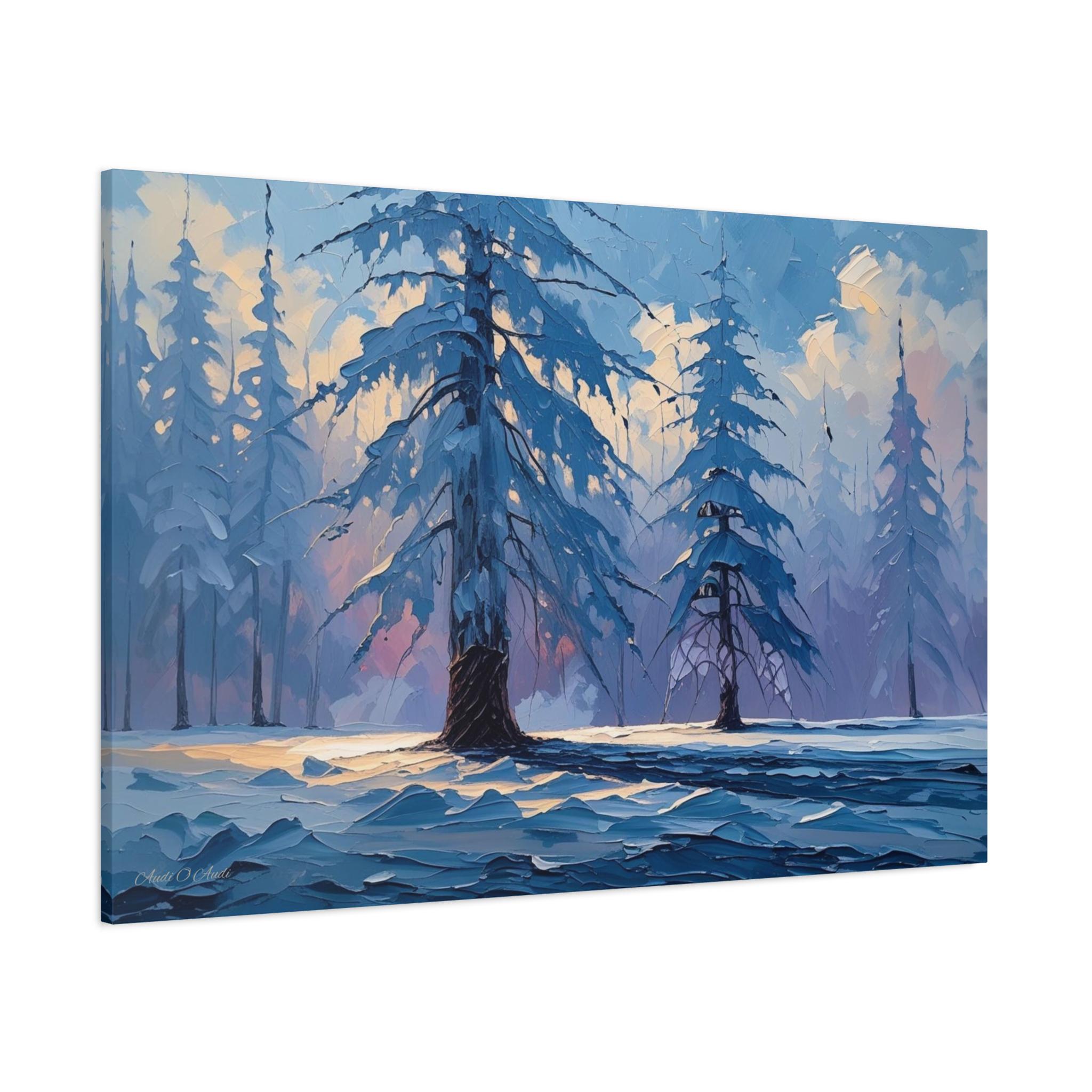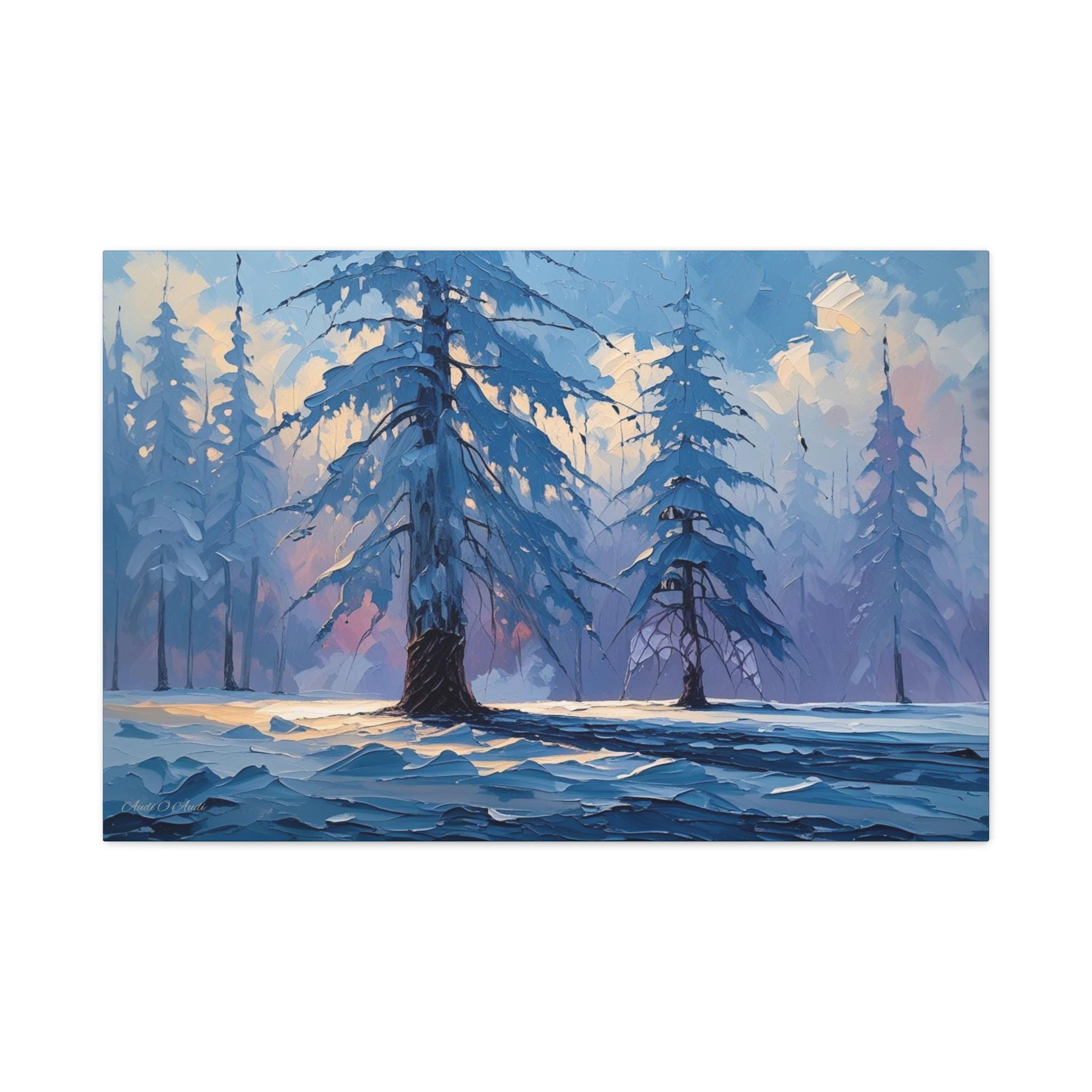 This breathtaking canvas print captures the silent majesty of a winter forest at dawn, rendered in a stunning, tactile heavy impasto style. The landscape is dominated by a deep, cool palette of cobalt blue, ice white, and soft sky blue, which perfectly conveys the intense chill of the air.