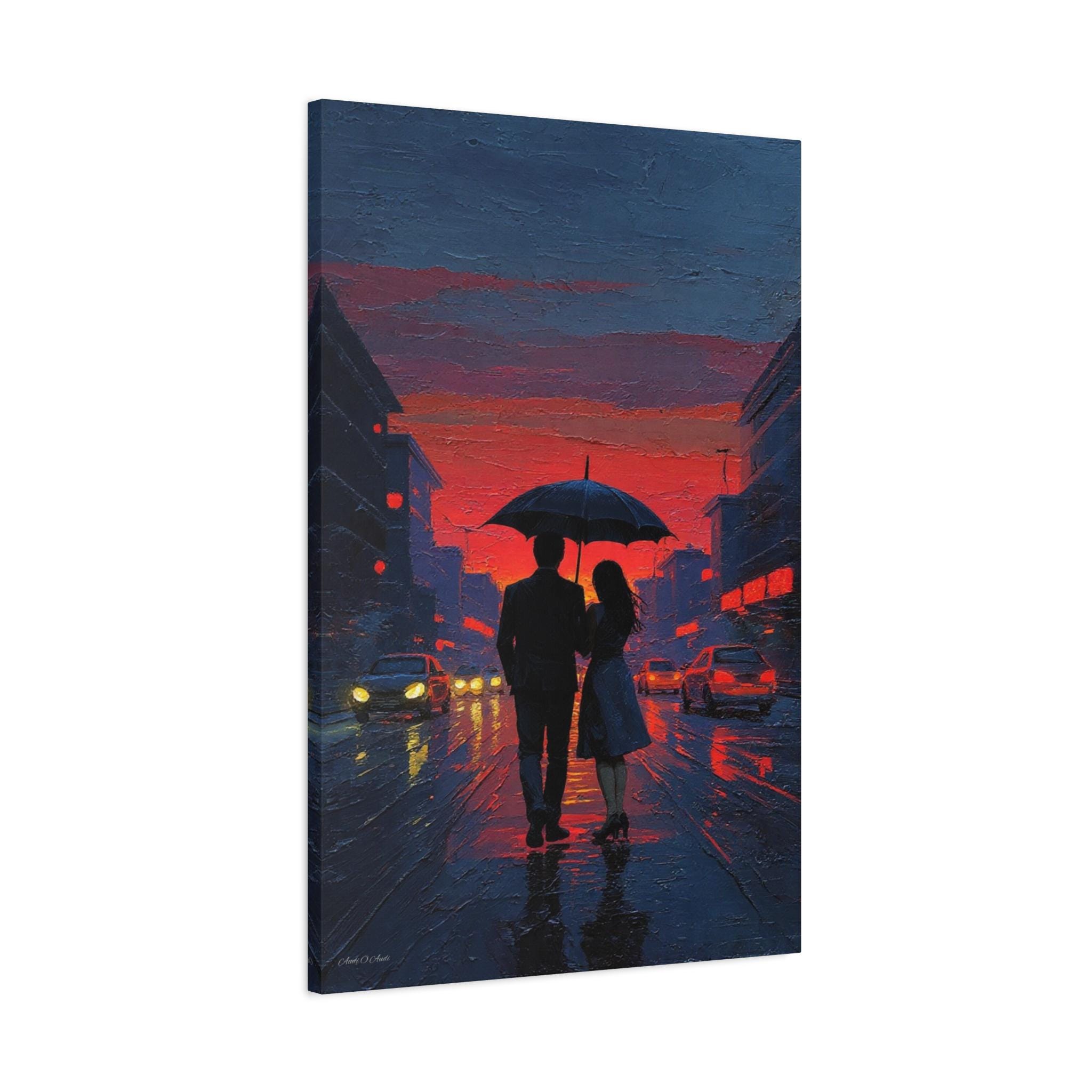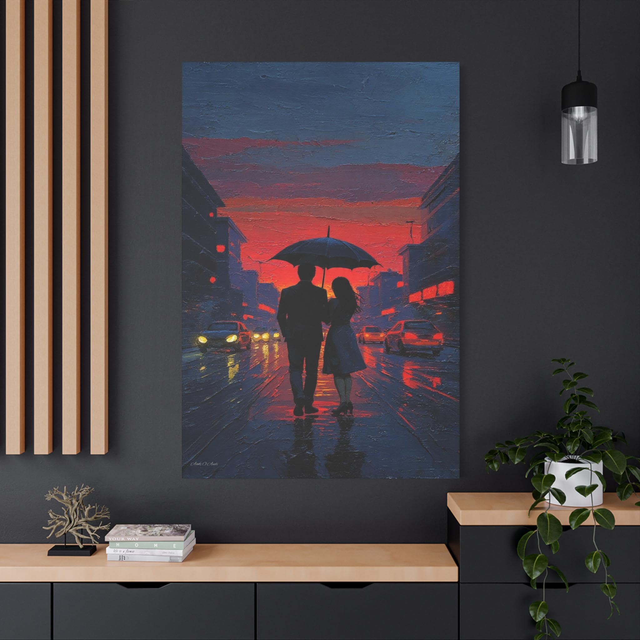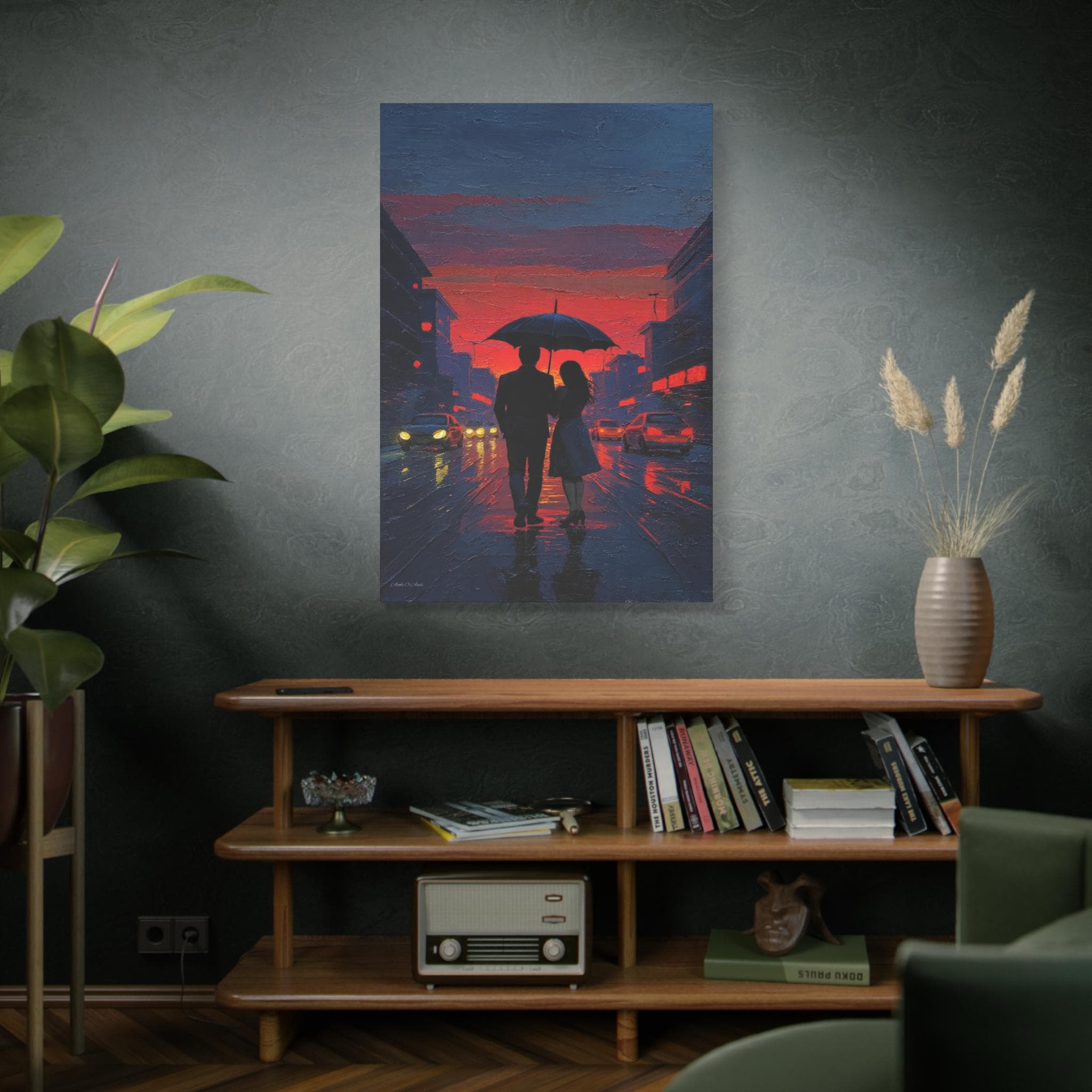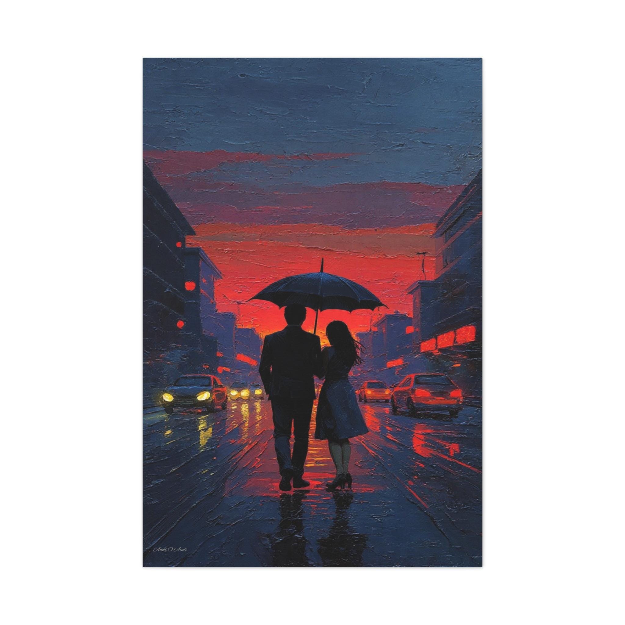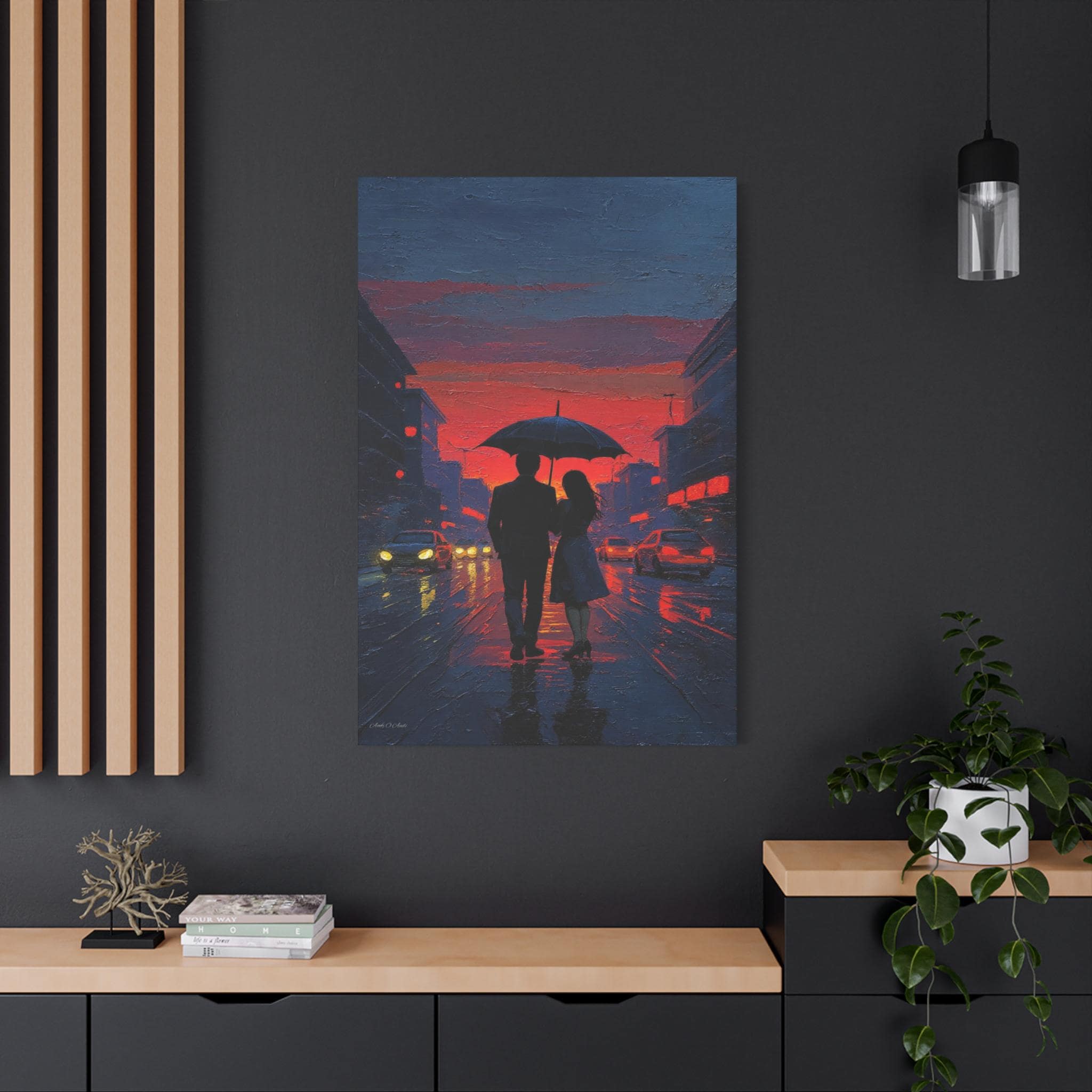 The Crimson Boulevard, Couple Under Umbrella Sunset Canvas Print, Rainy City, Urban Romance, Living Room Decor, Anniversary Gift.