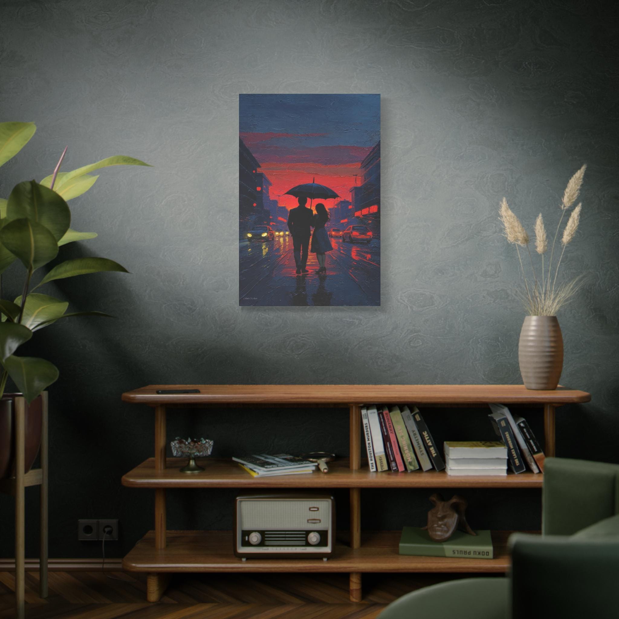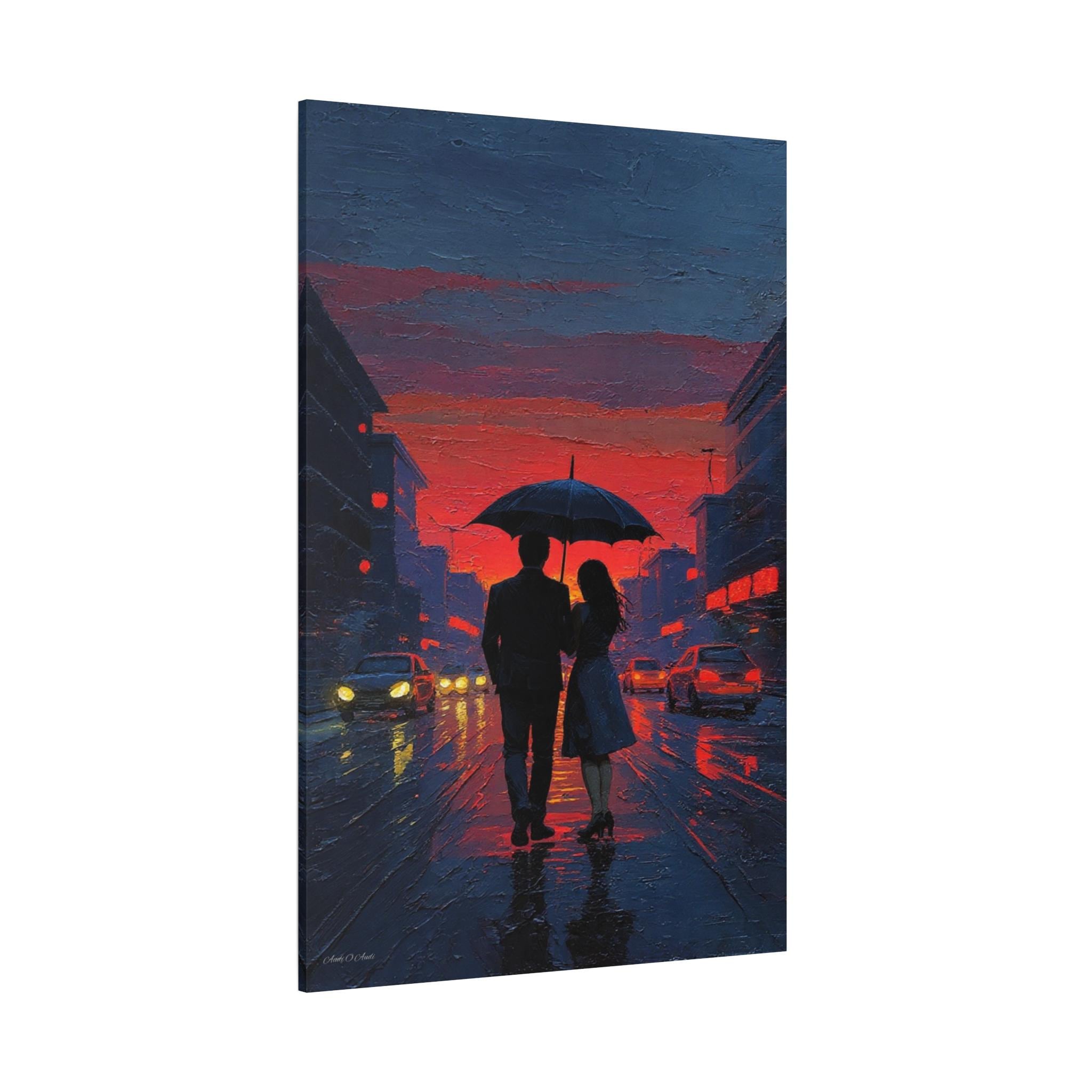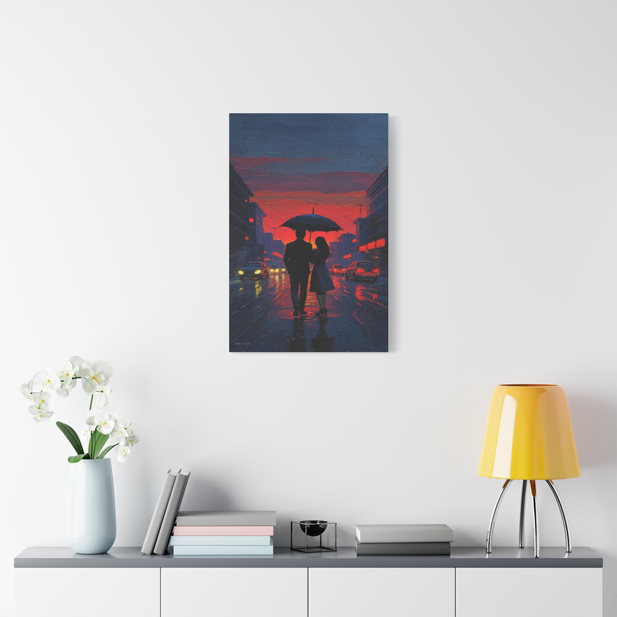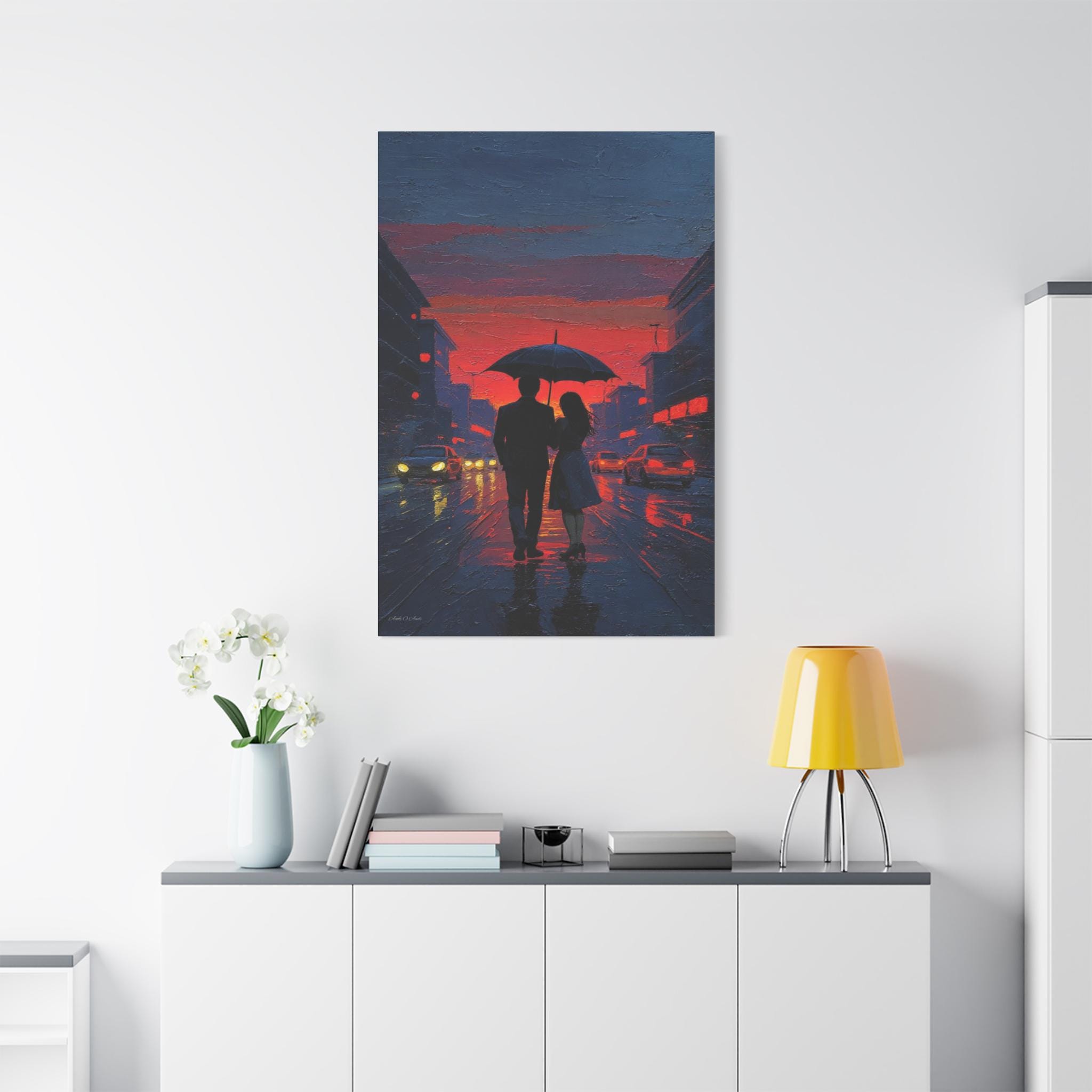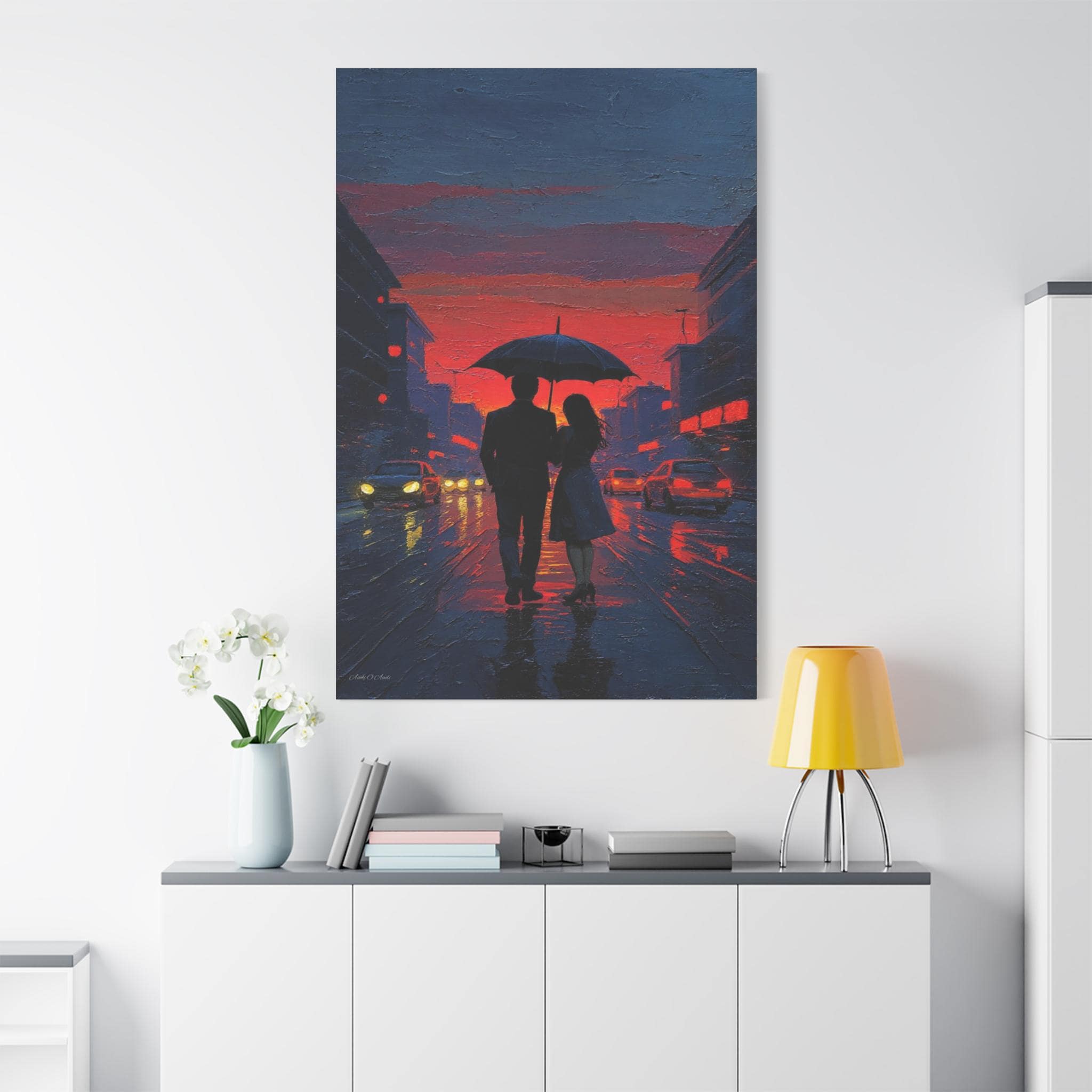The Crimson Boulevard, Couple Under Umbrella Sunset Canvas Print, Rainy City, Urban Romance, Living Room Decor, Anniversary Gift.