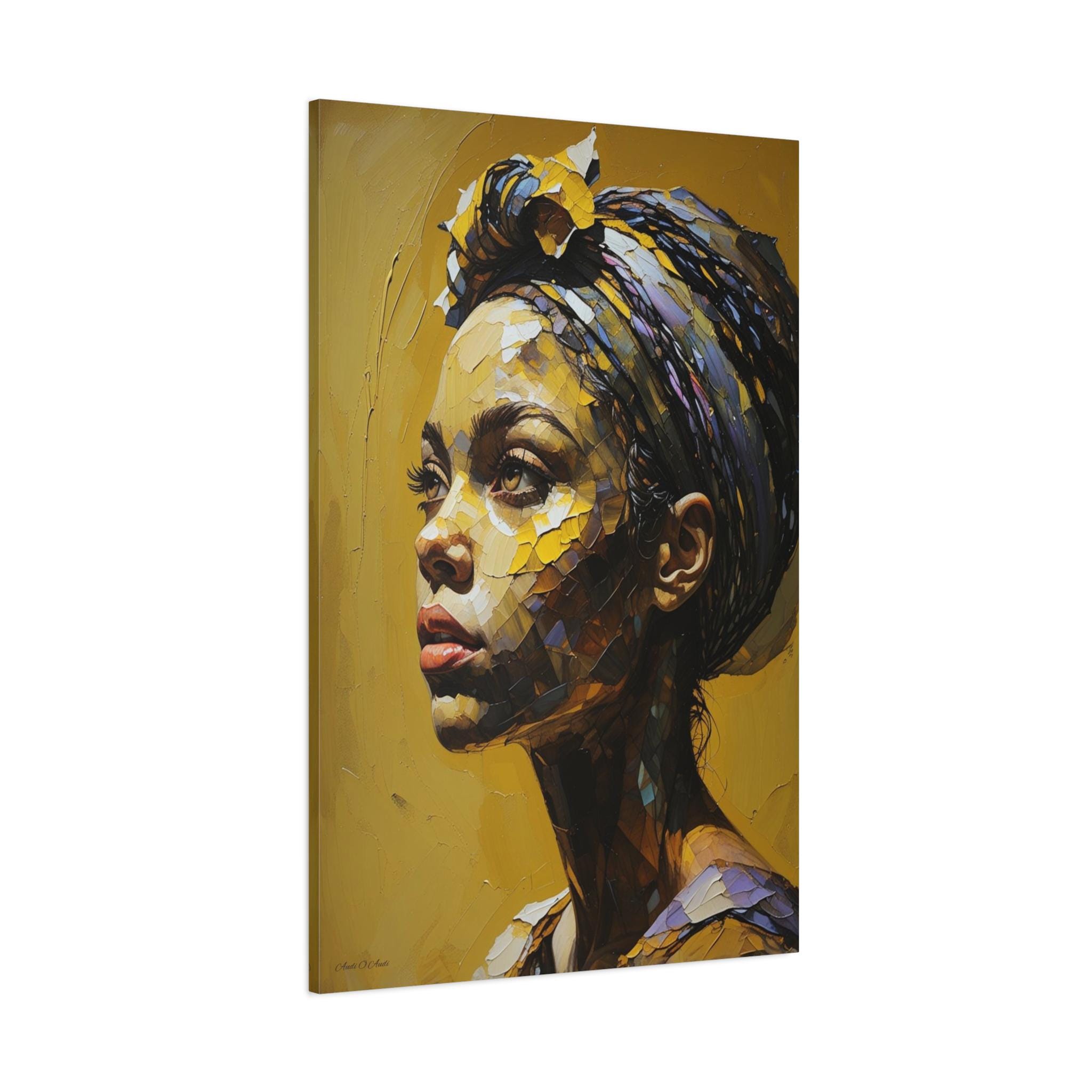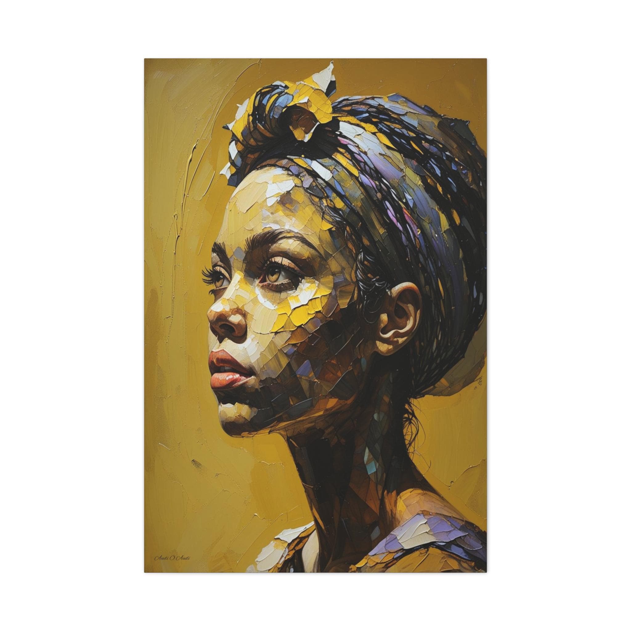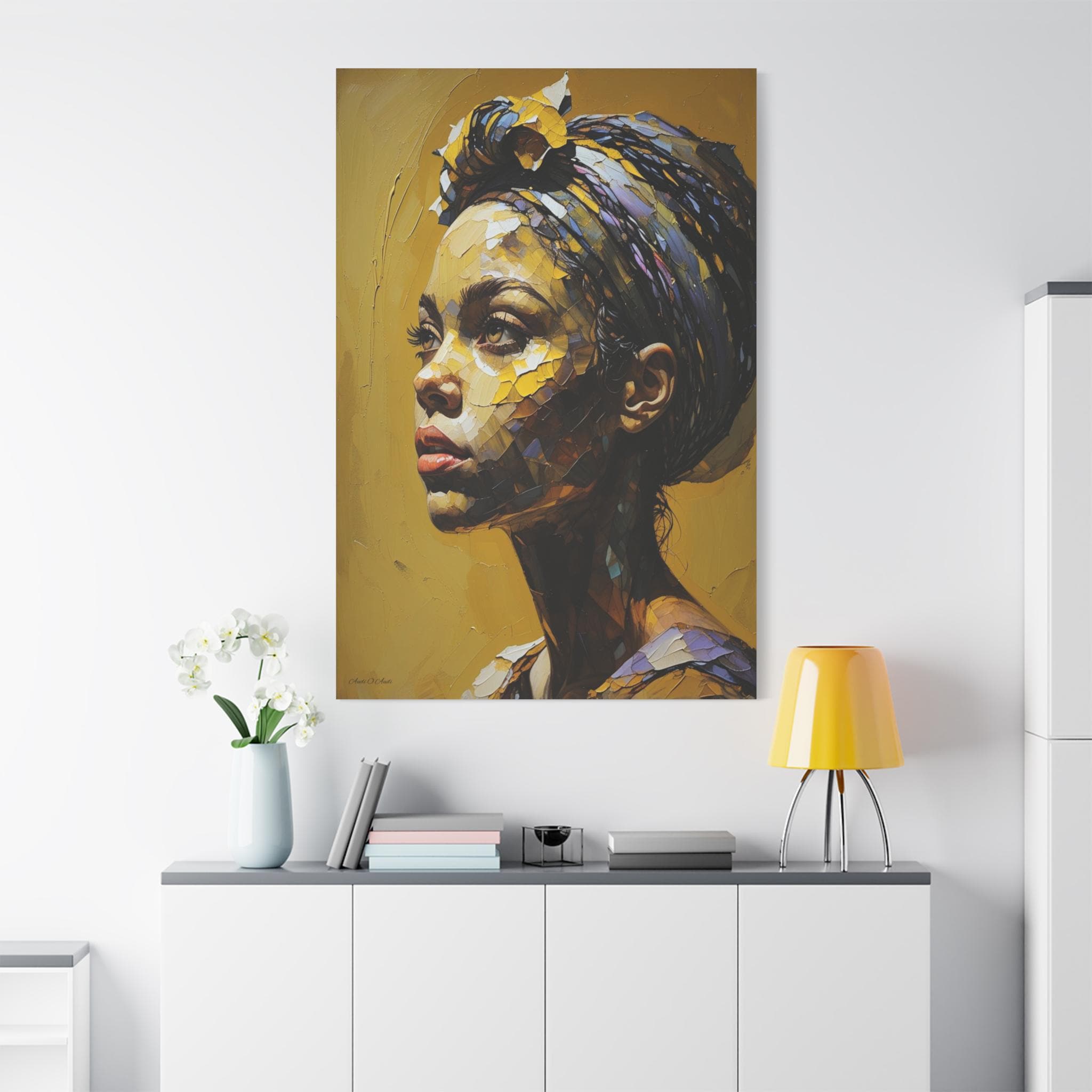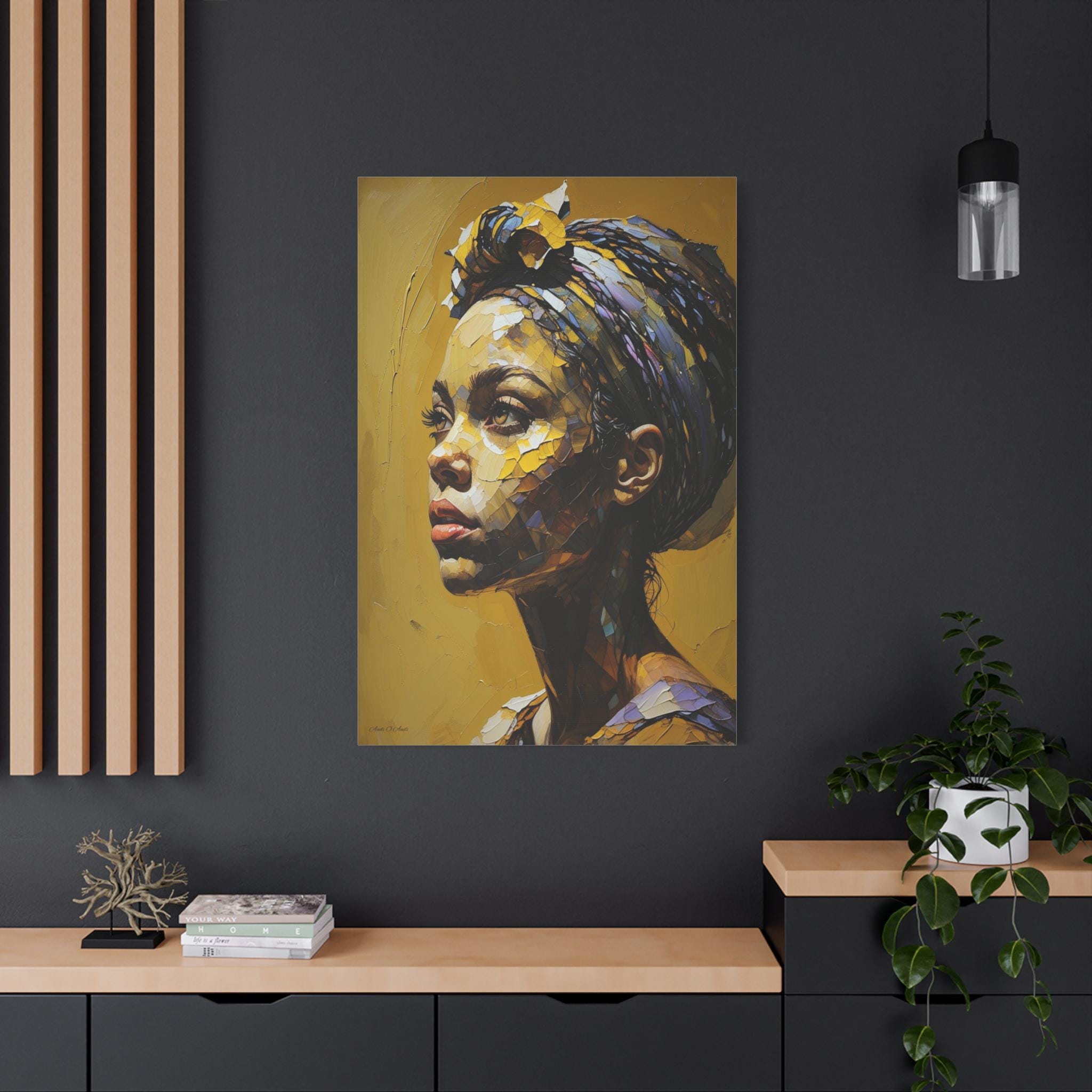 This extraordinary canvas print is a captivating, close-up profile portrait that pushes the boundaries of texture and form. The subject, a woman wearing a richly textured headwrap, is rendered in a complex style that fuses the heavy, thick strokes of impasto oil painting with the fragmented geometry of a mosaic.