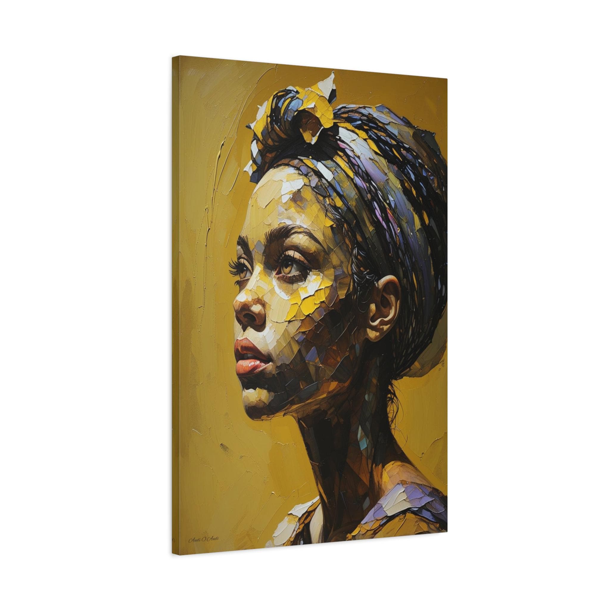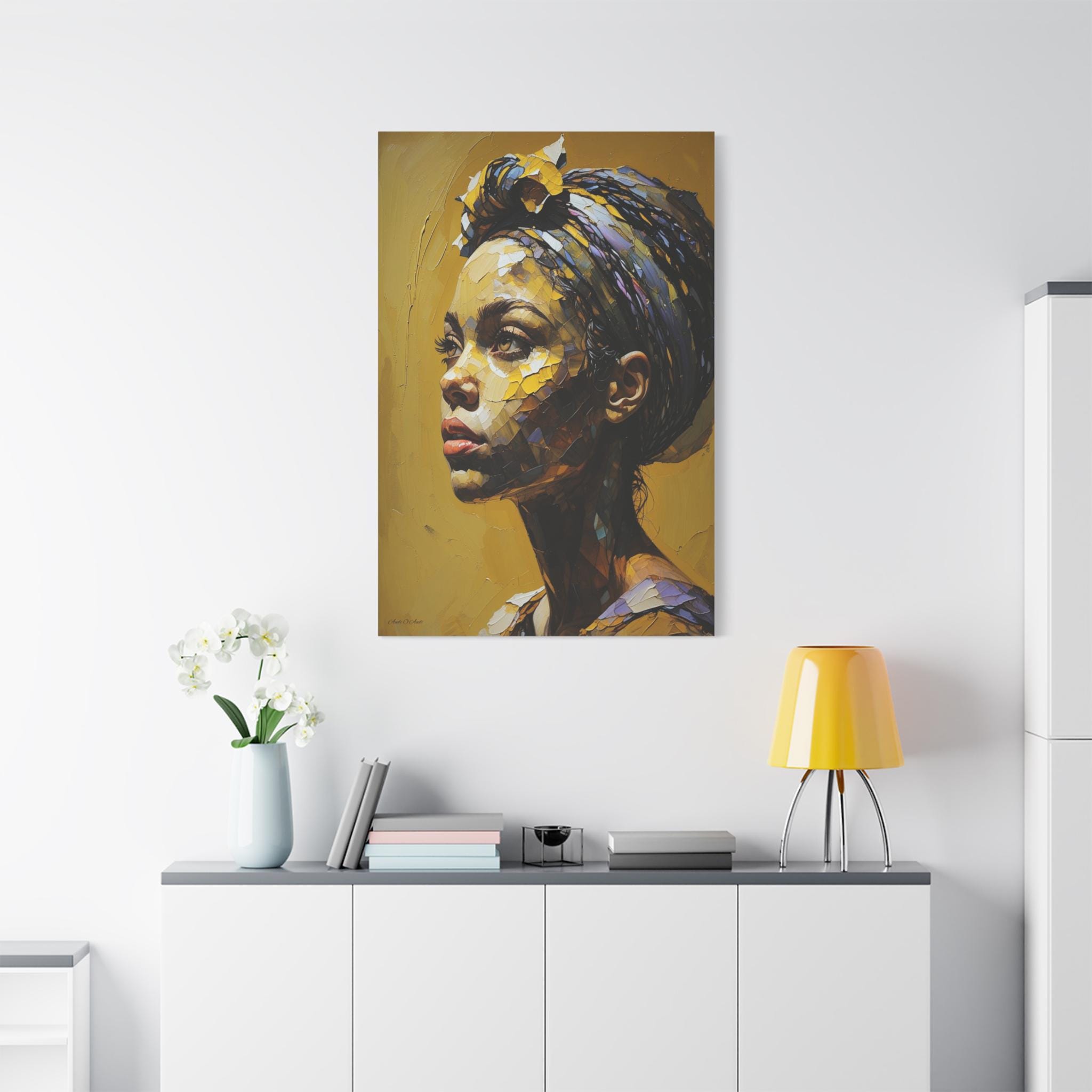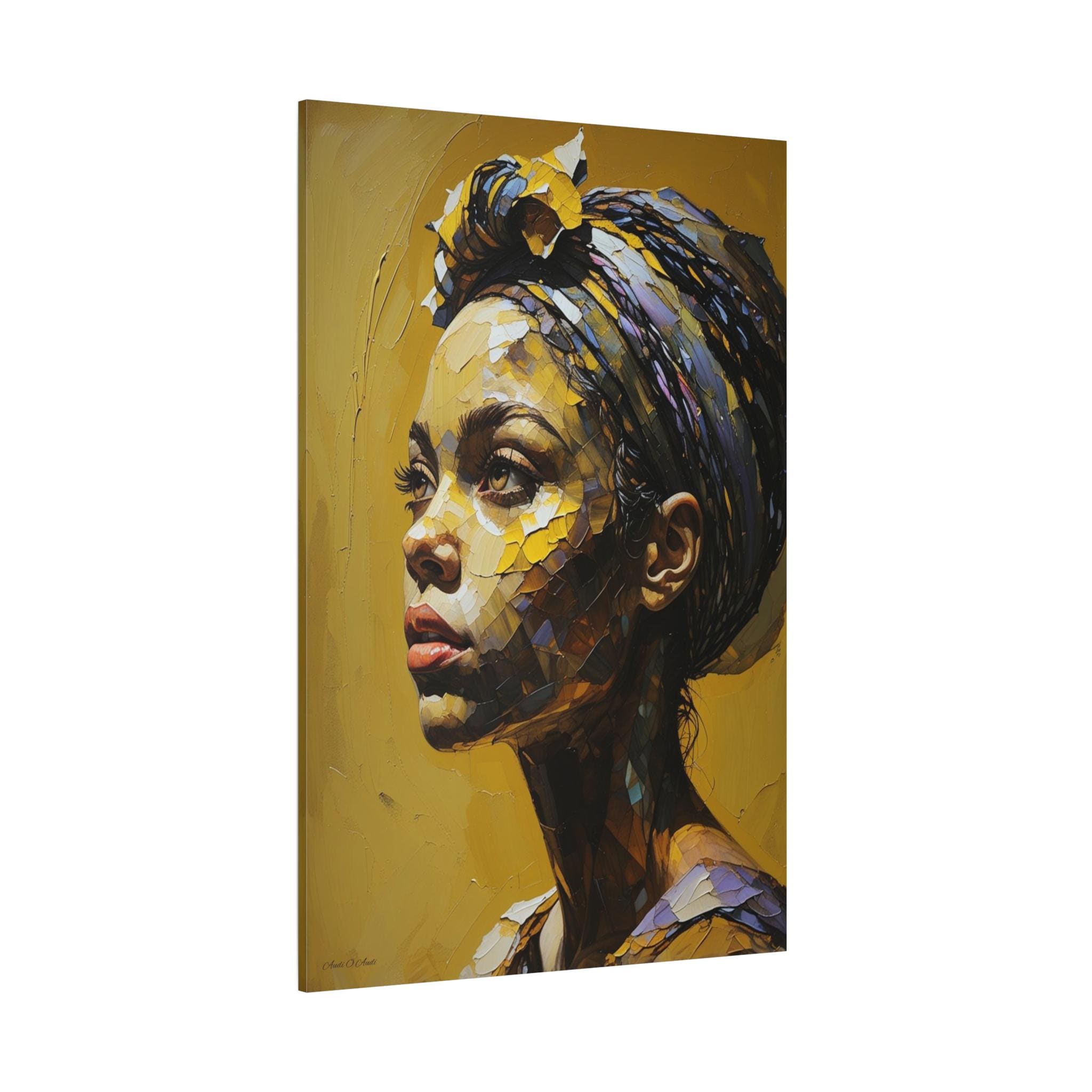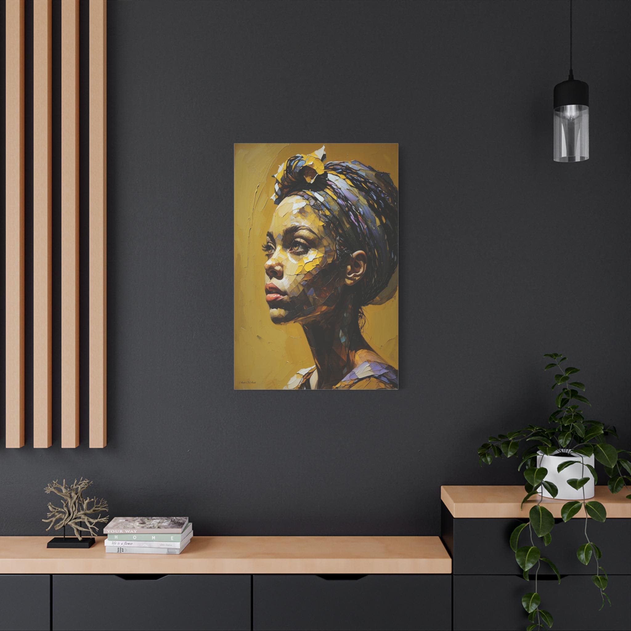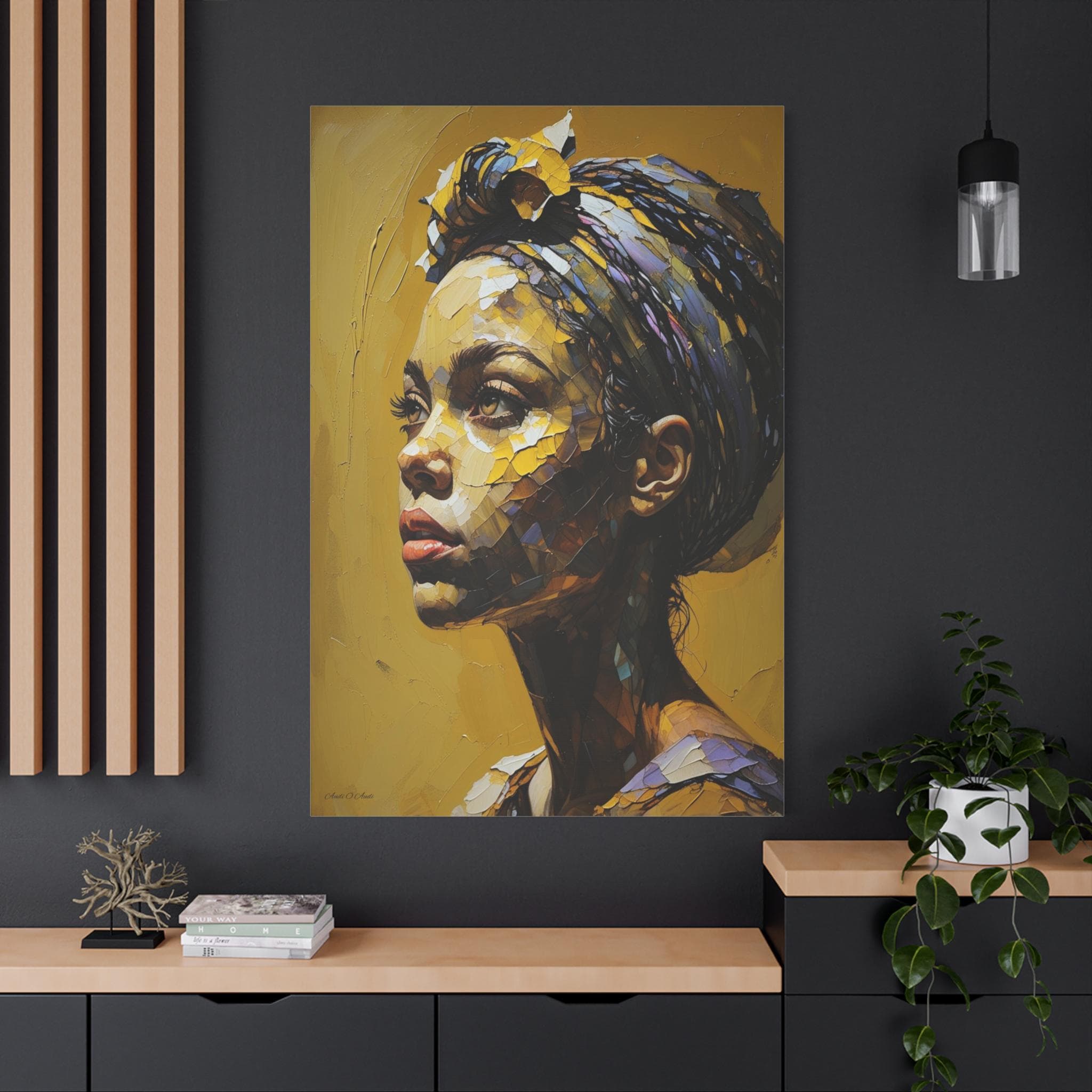This extraordinary canvas print is a captivating, close-up profile portrait that pushes the boundaries of texture and form. The subject, a woman wearing a richly textured headwrap, is rendered in a complex style that fuses the heavy, thick strokes of impasto oil painting with the fragmented geometry of a mosaic.
