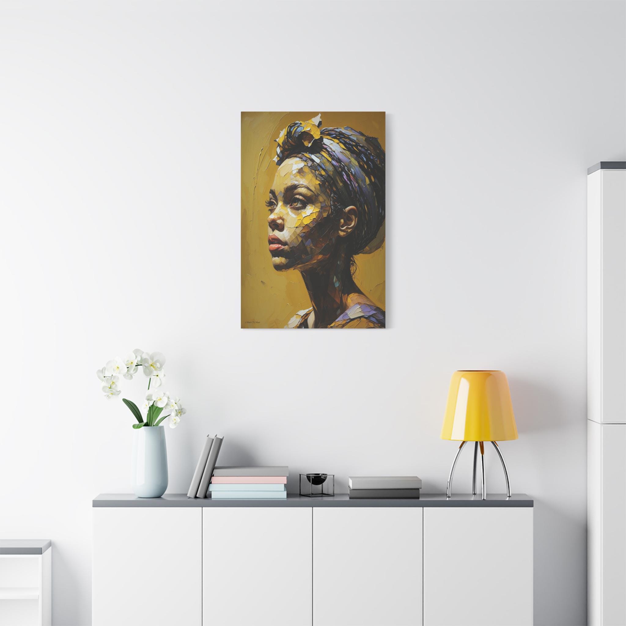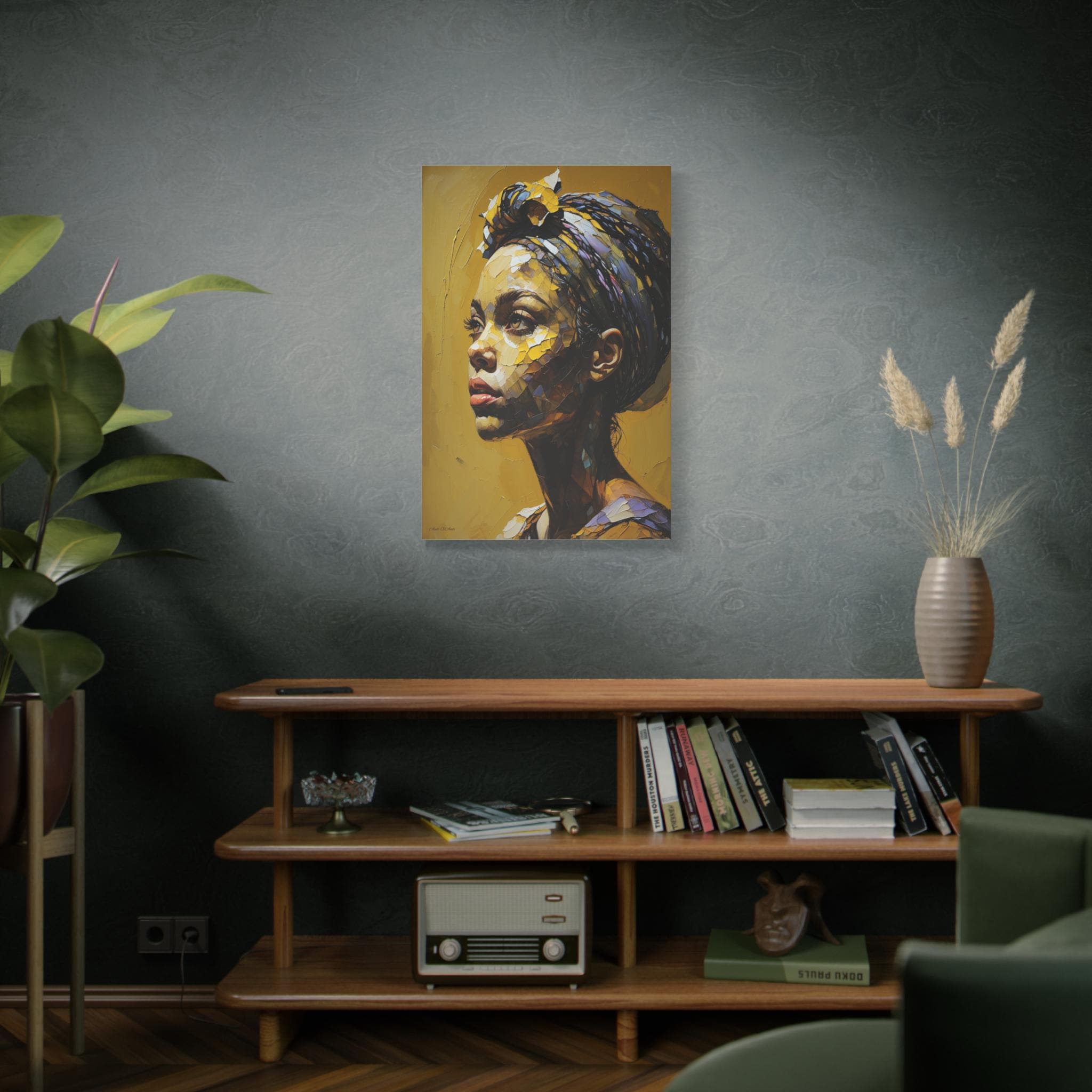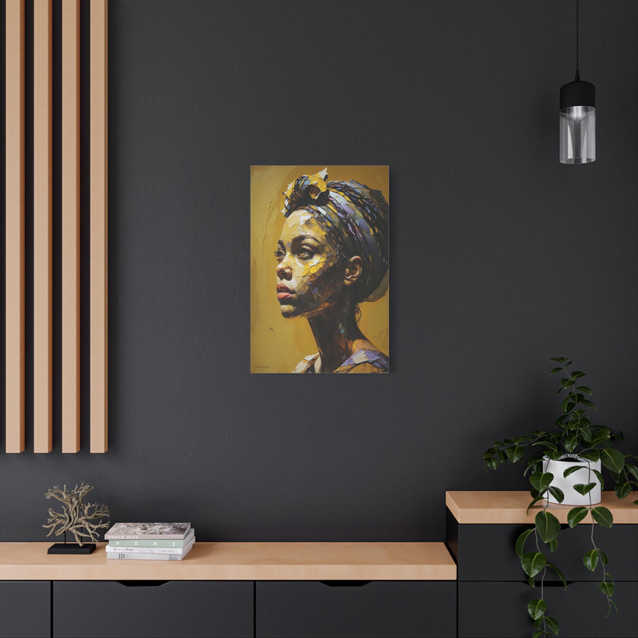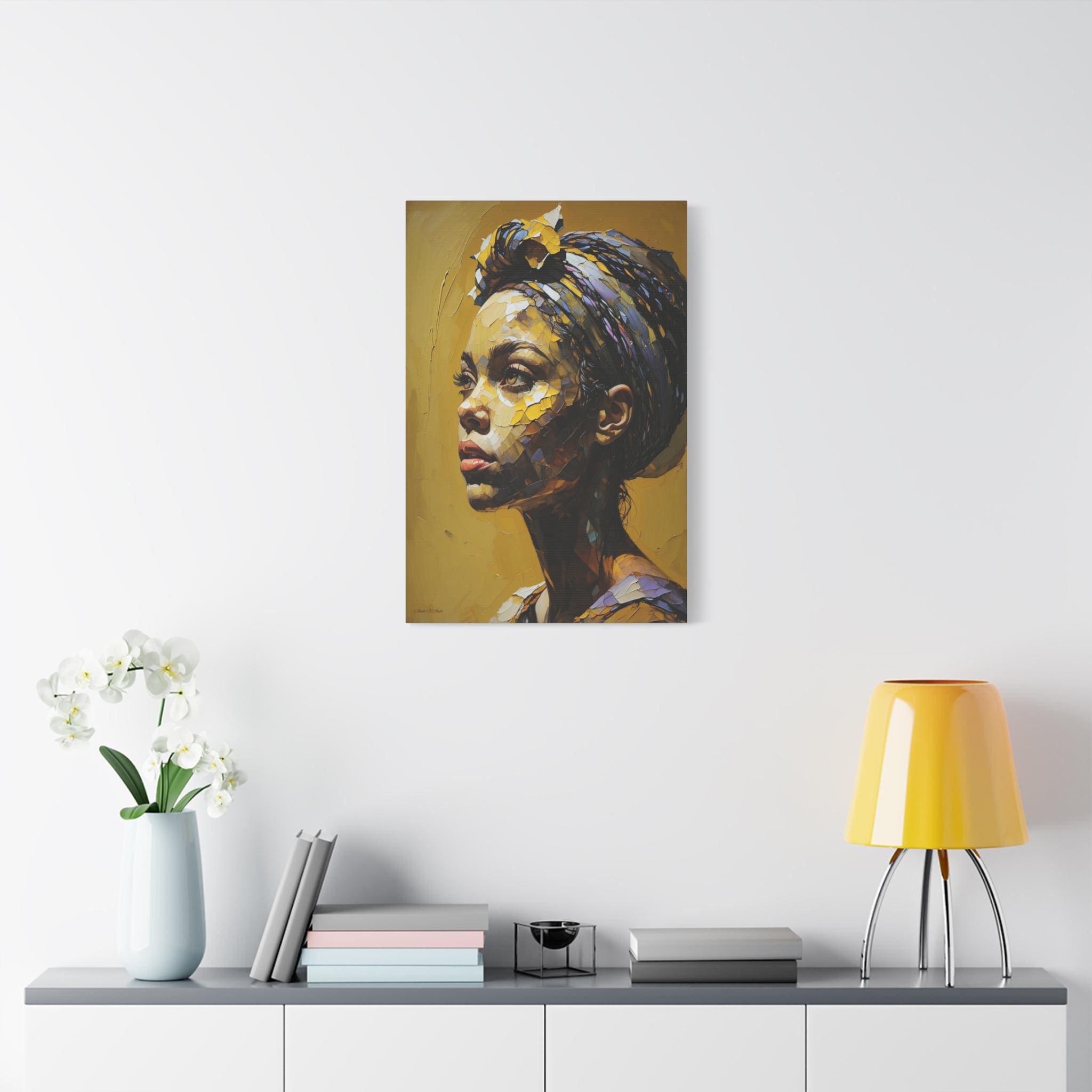This extraordinary canvas print is a captivating, close-up profile portrait that pushes the boundaries of texture and form. The subject, a woman wearing a richly textured headwrap, is rendered in a complex style that fuses the heavy, thick strokes of impasto oil painting with the fragmented geometry of a mosaic.