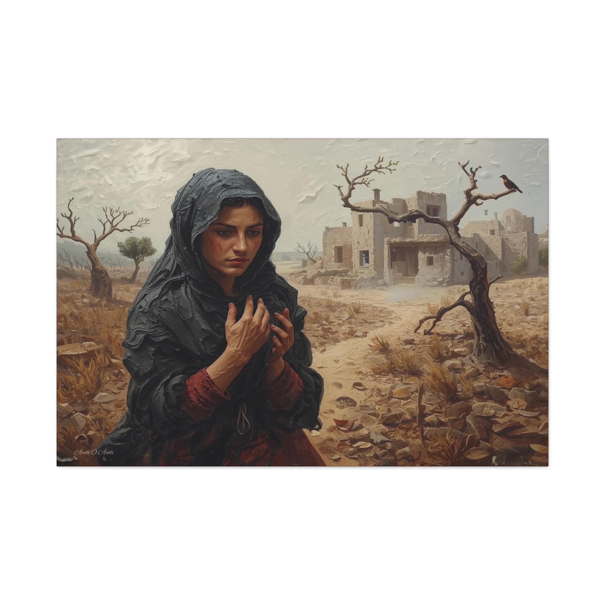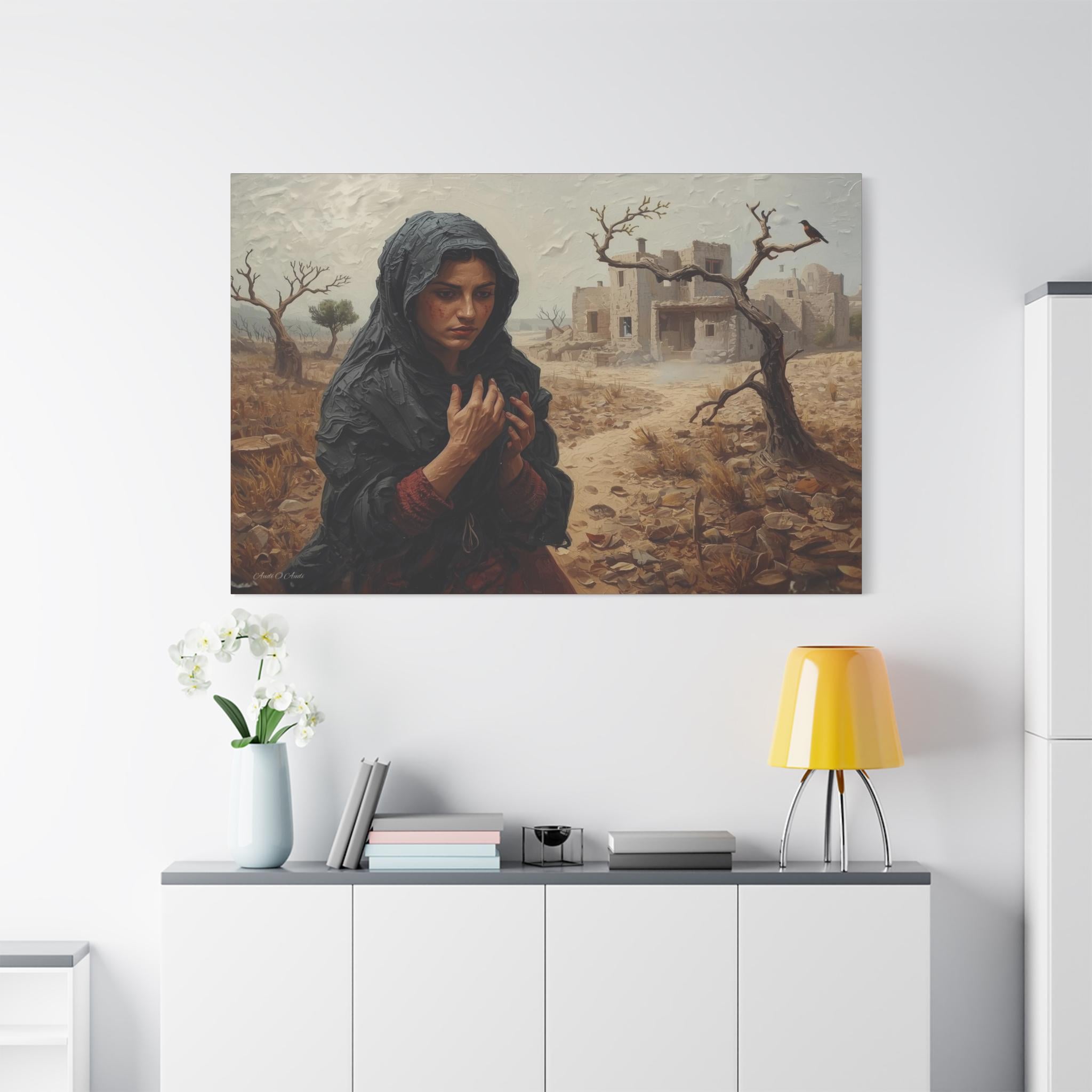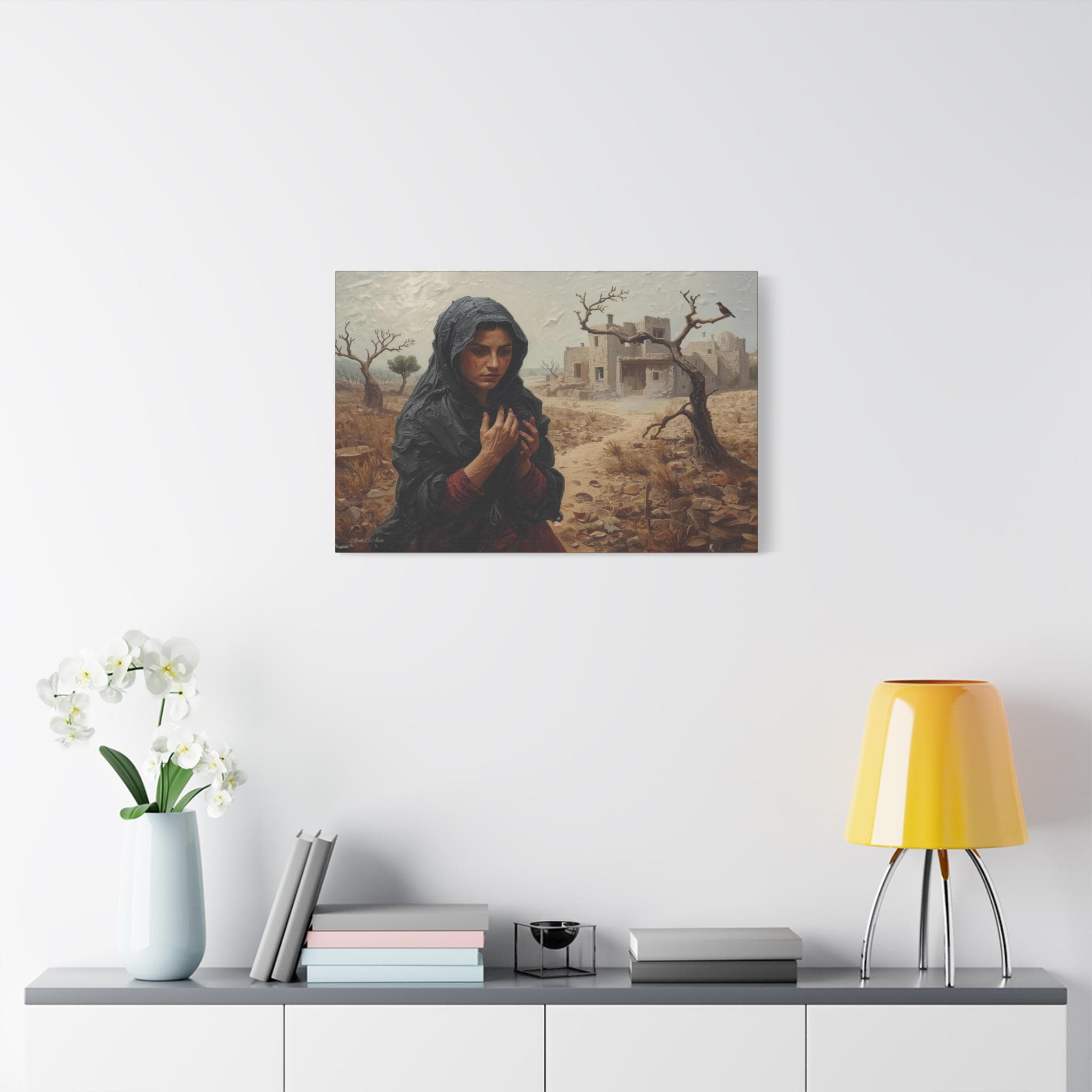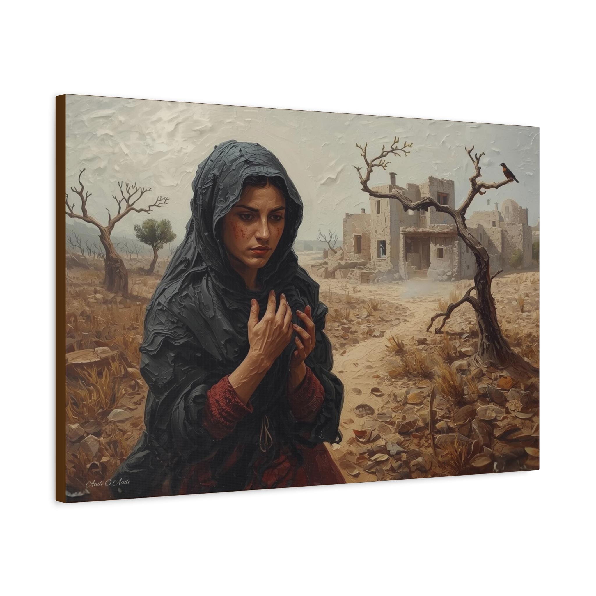 he Catastrophe, Solitary Woman in Torn Landscape Canvas Print, Middle East Art, Emotive Portrait, Rustic Decor, Gallery Wrap.