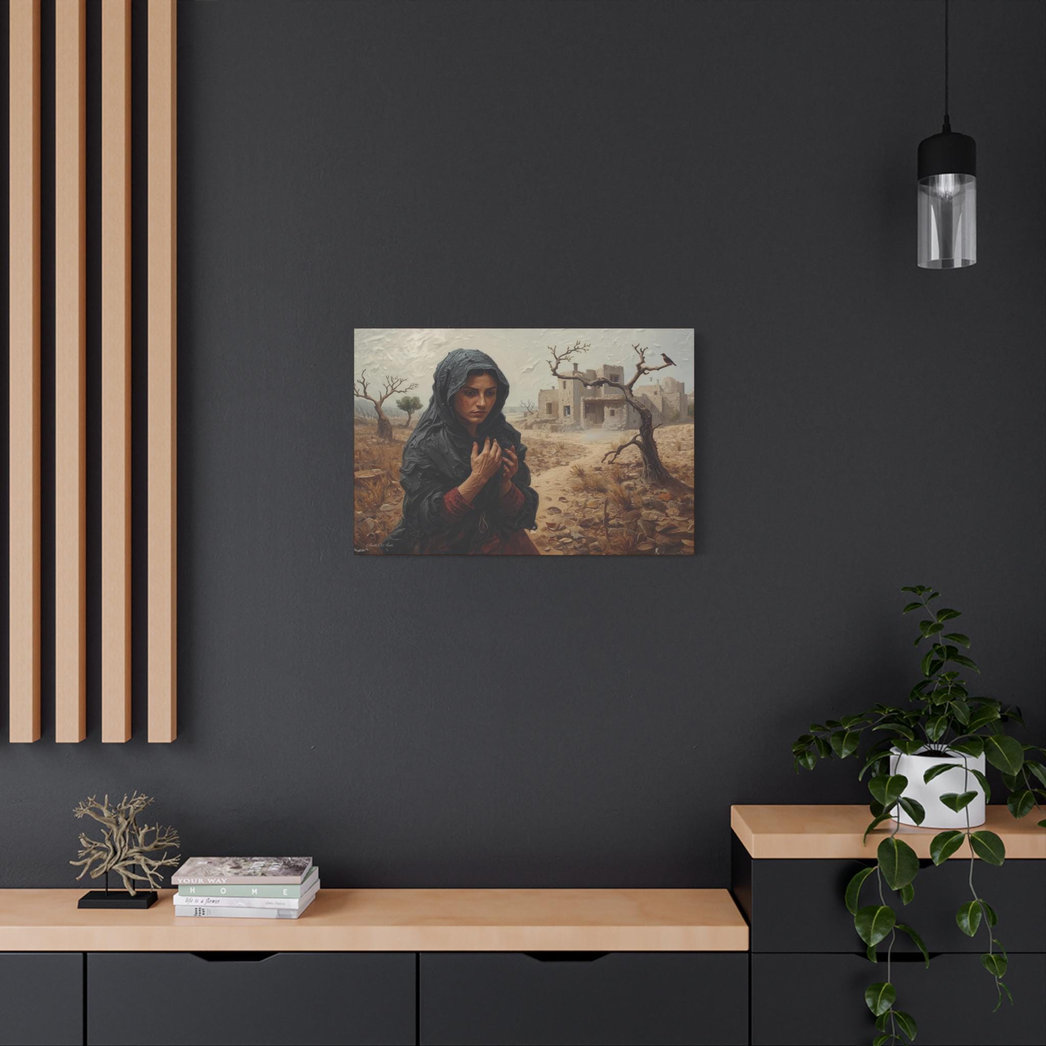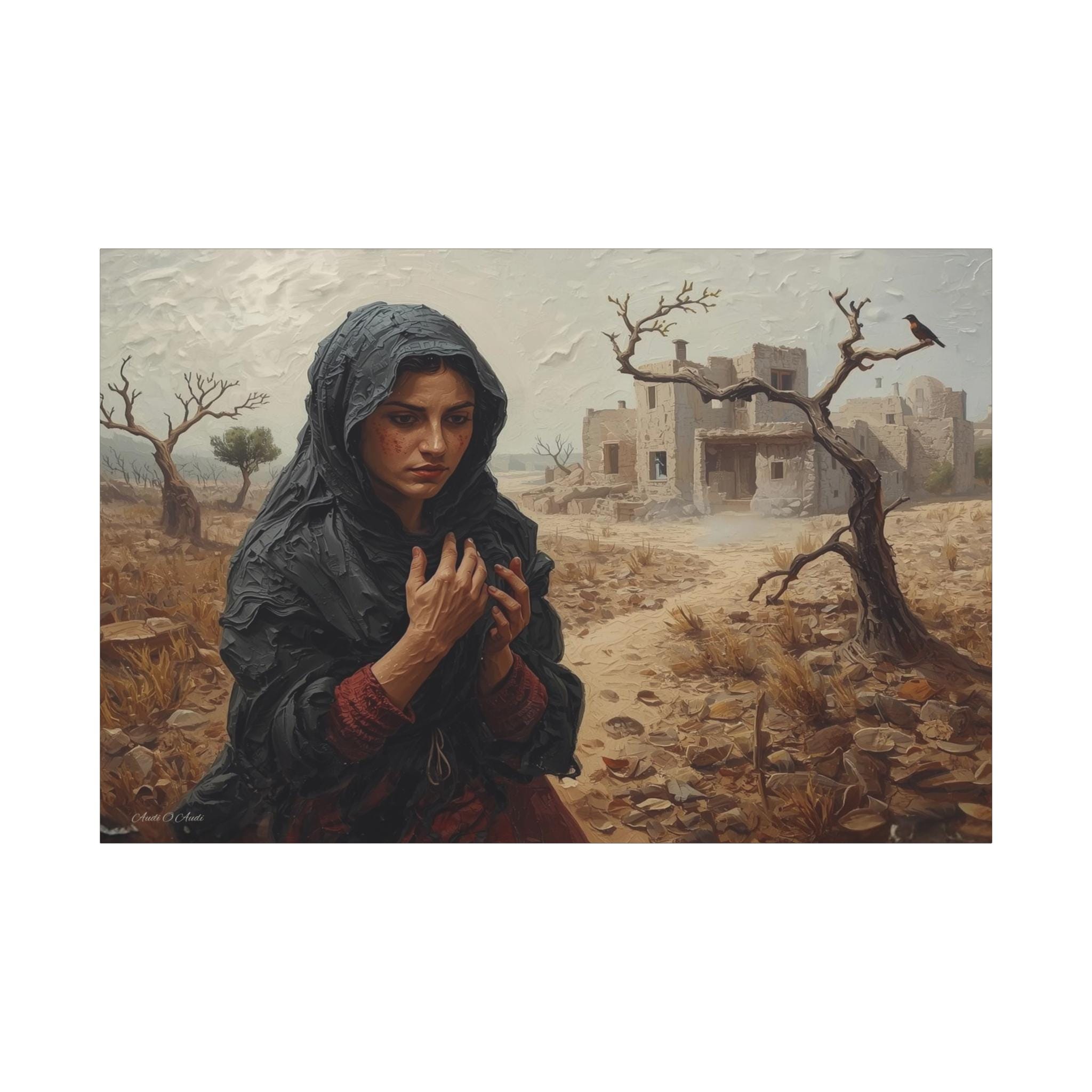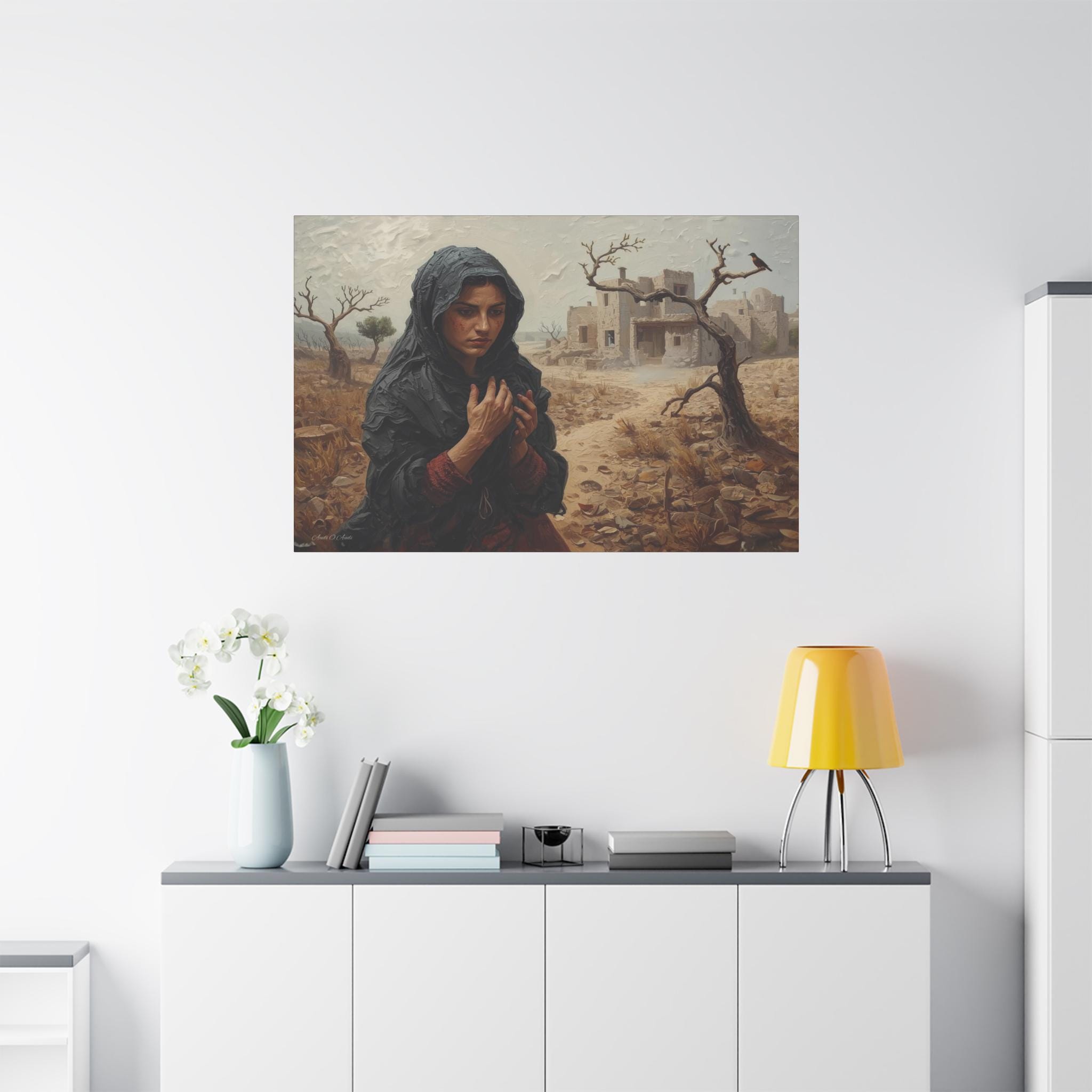 he Catastrophe, Solitary Woman in Torn Landscape Canvas Print, Middle East Art, Emotive Portrait, Rustic Decor, Gallery Wrap.