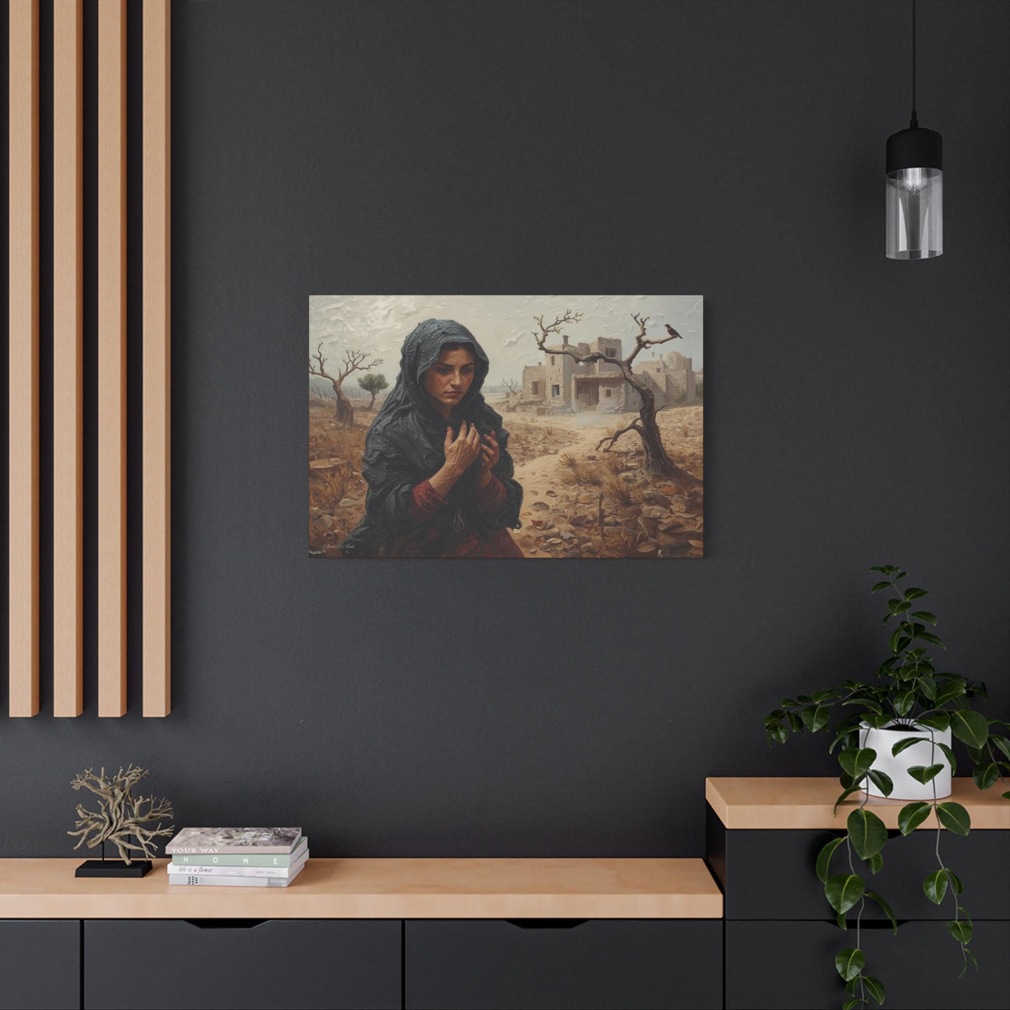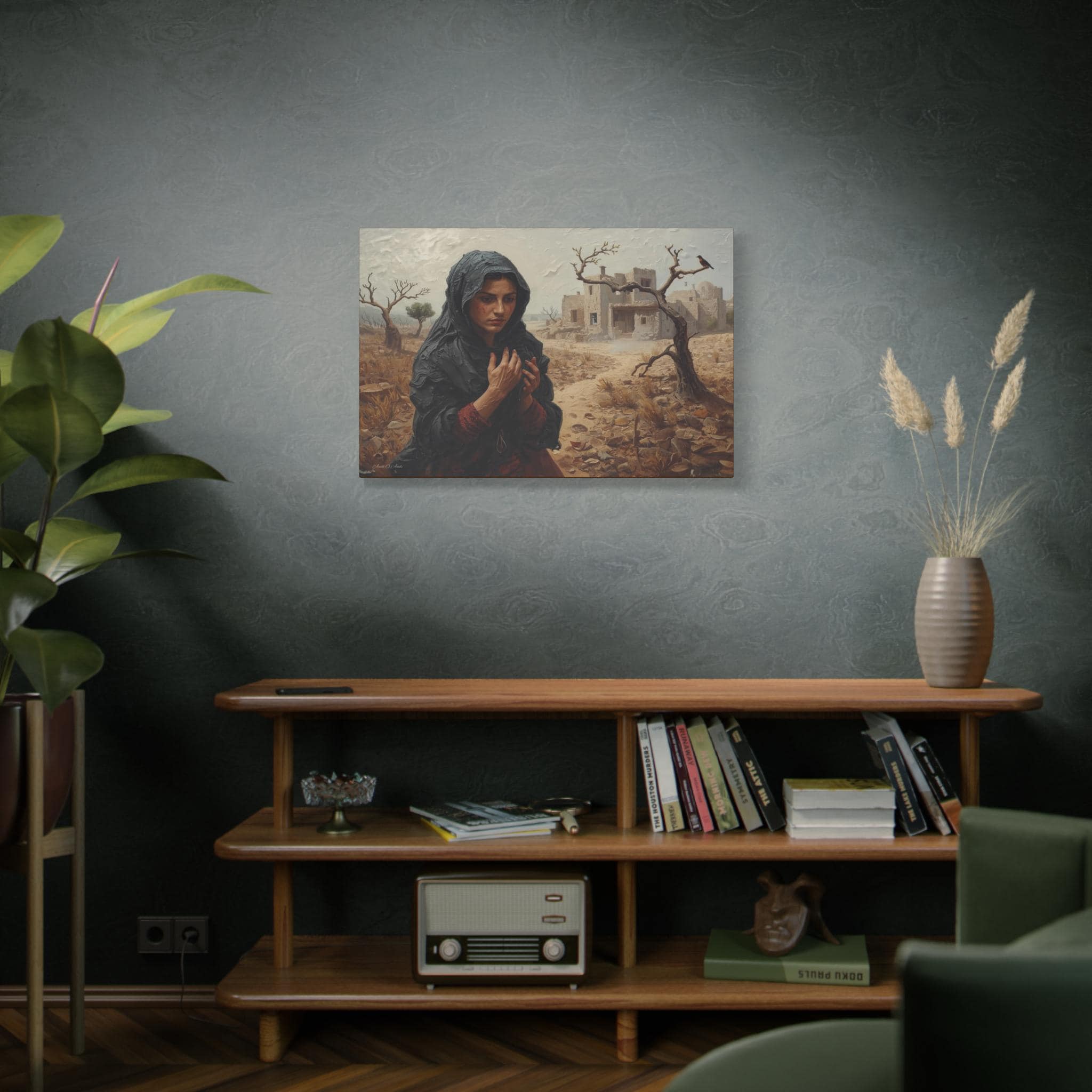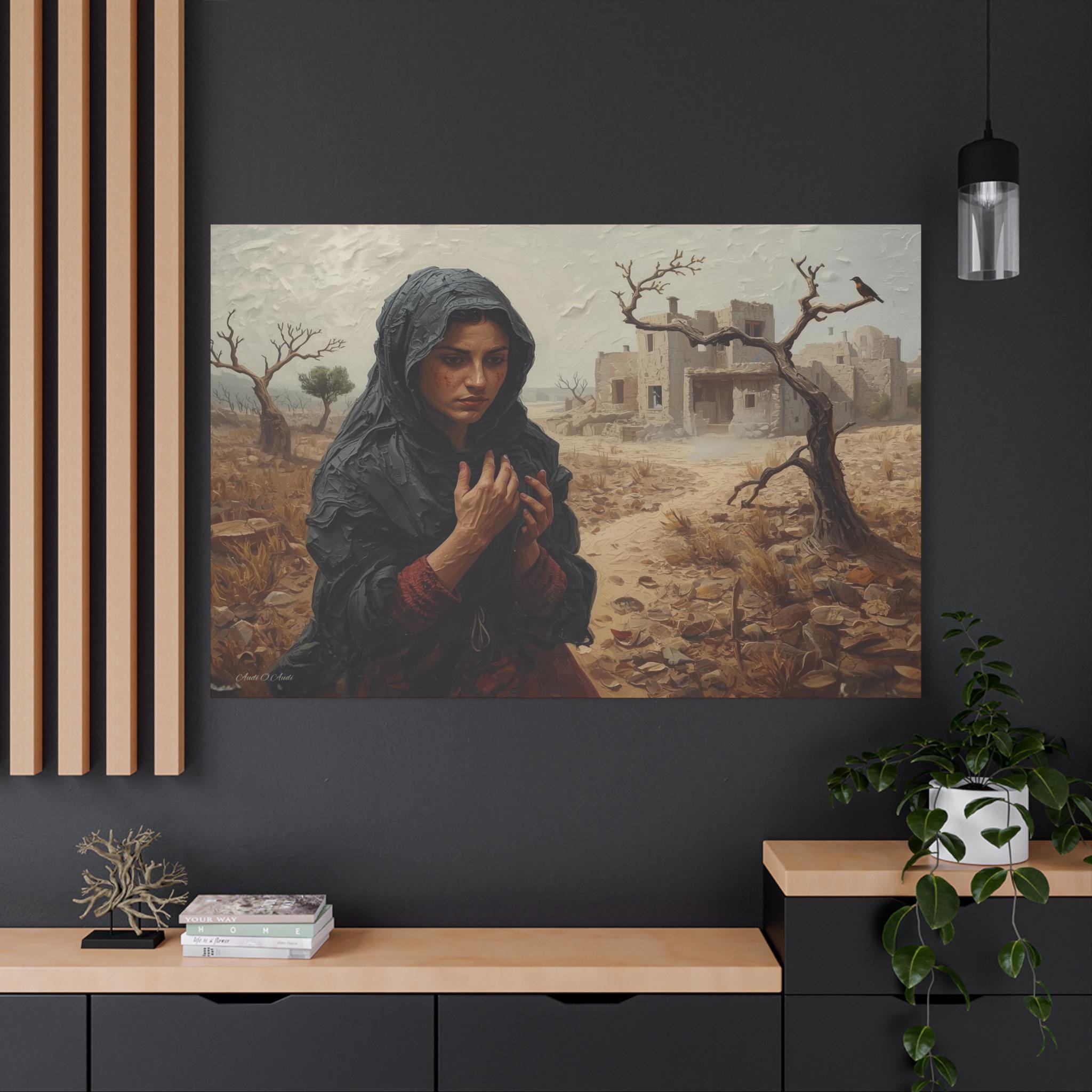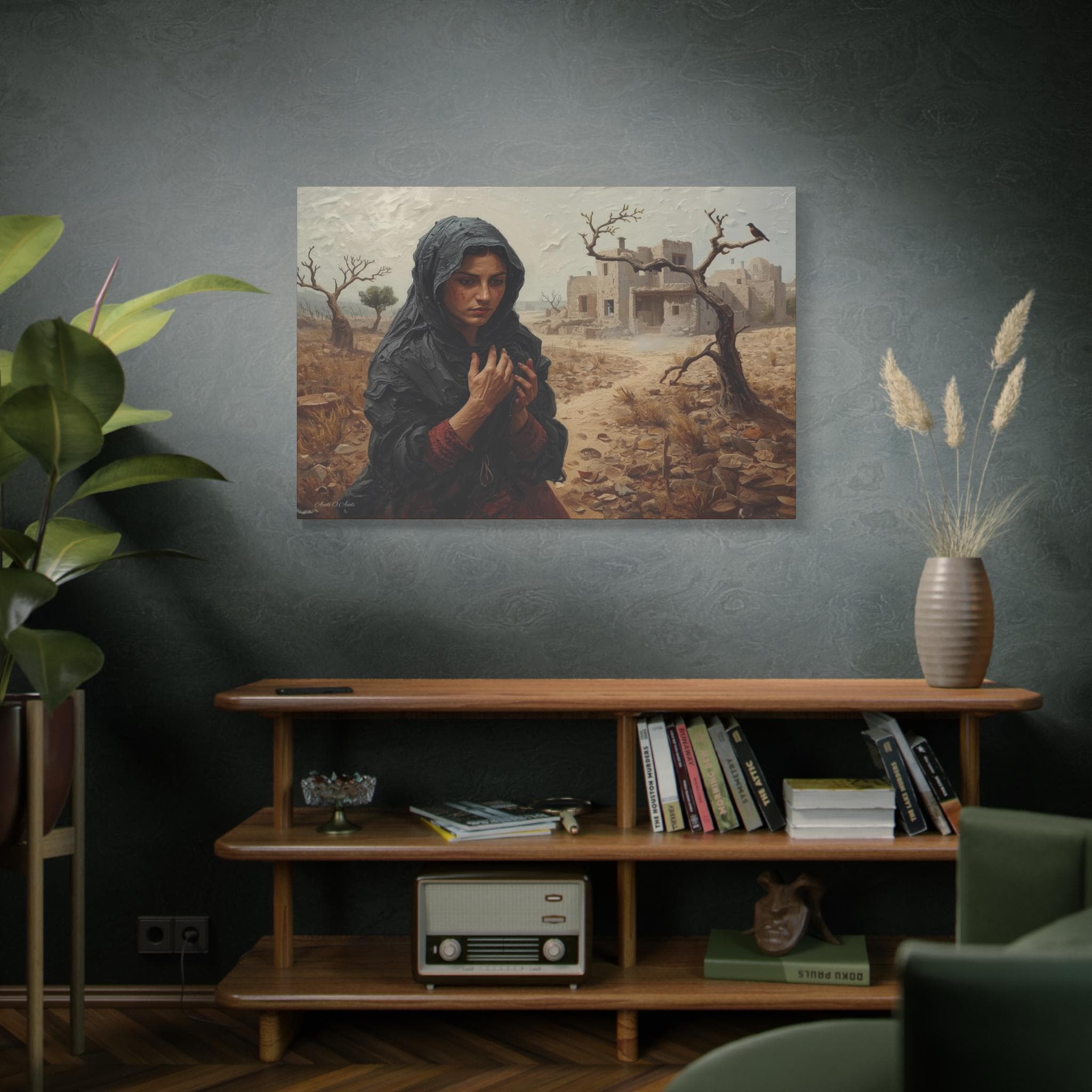 he Catastrophe, Solitary Woman in Torn Landscape Canvas Print, Middle East Art, Emotive Portrait, Rustic Decor, Gallery Wrap.