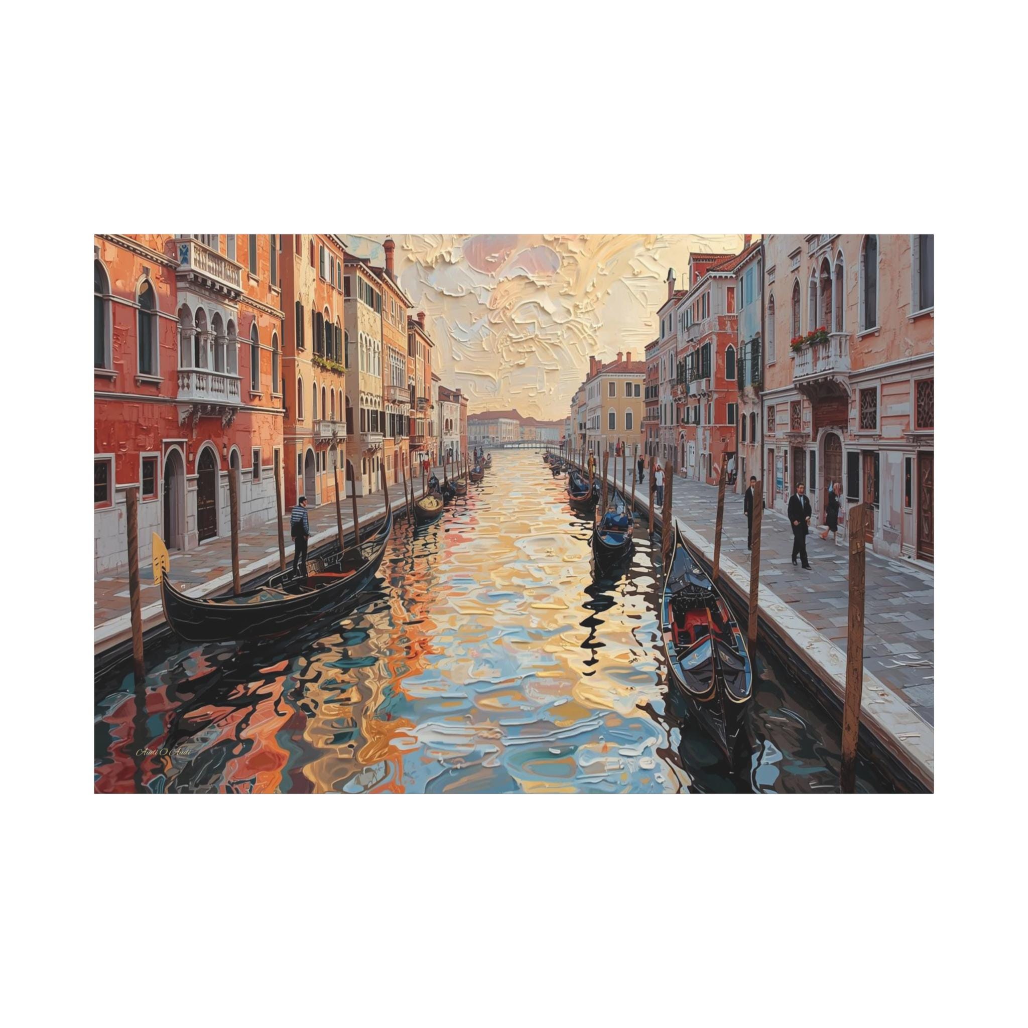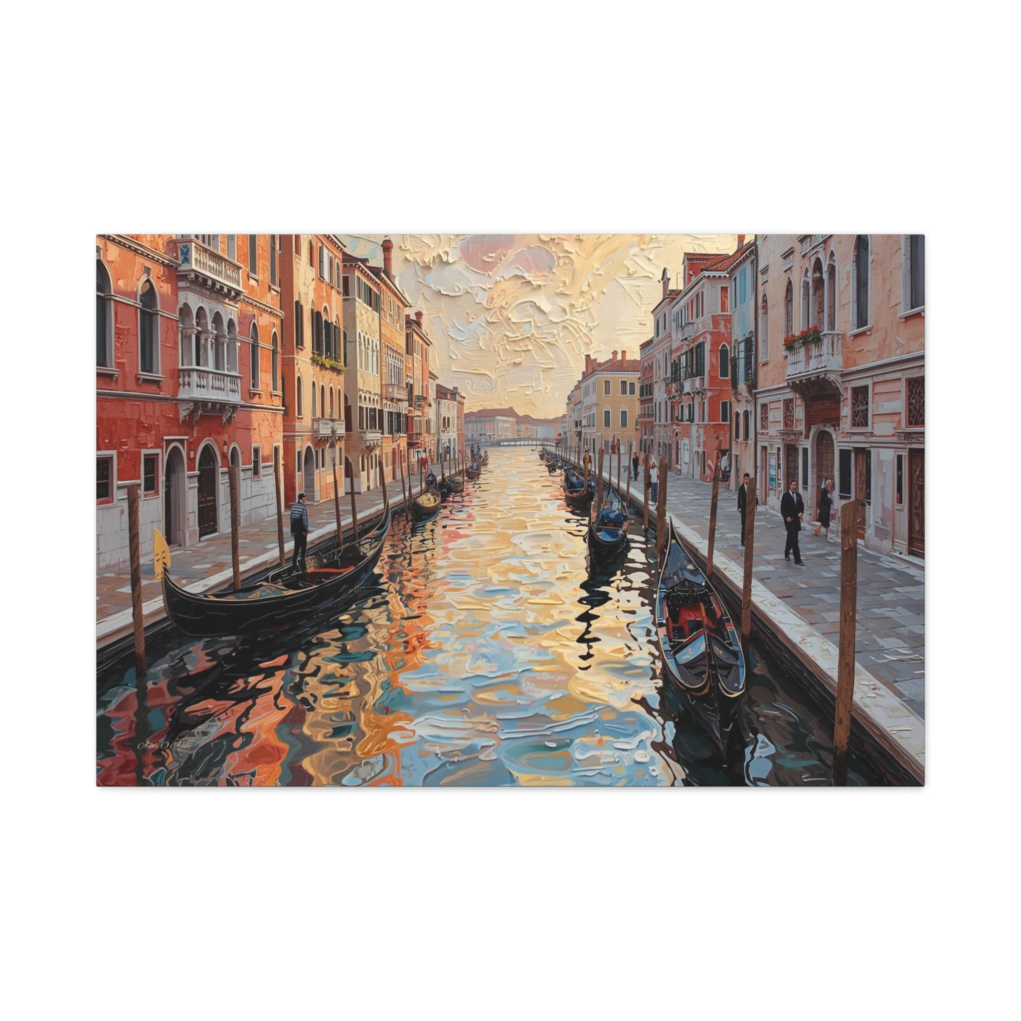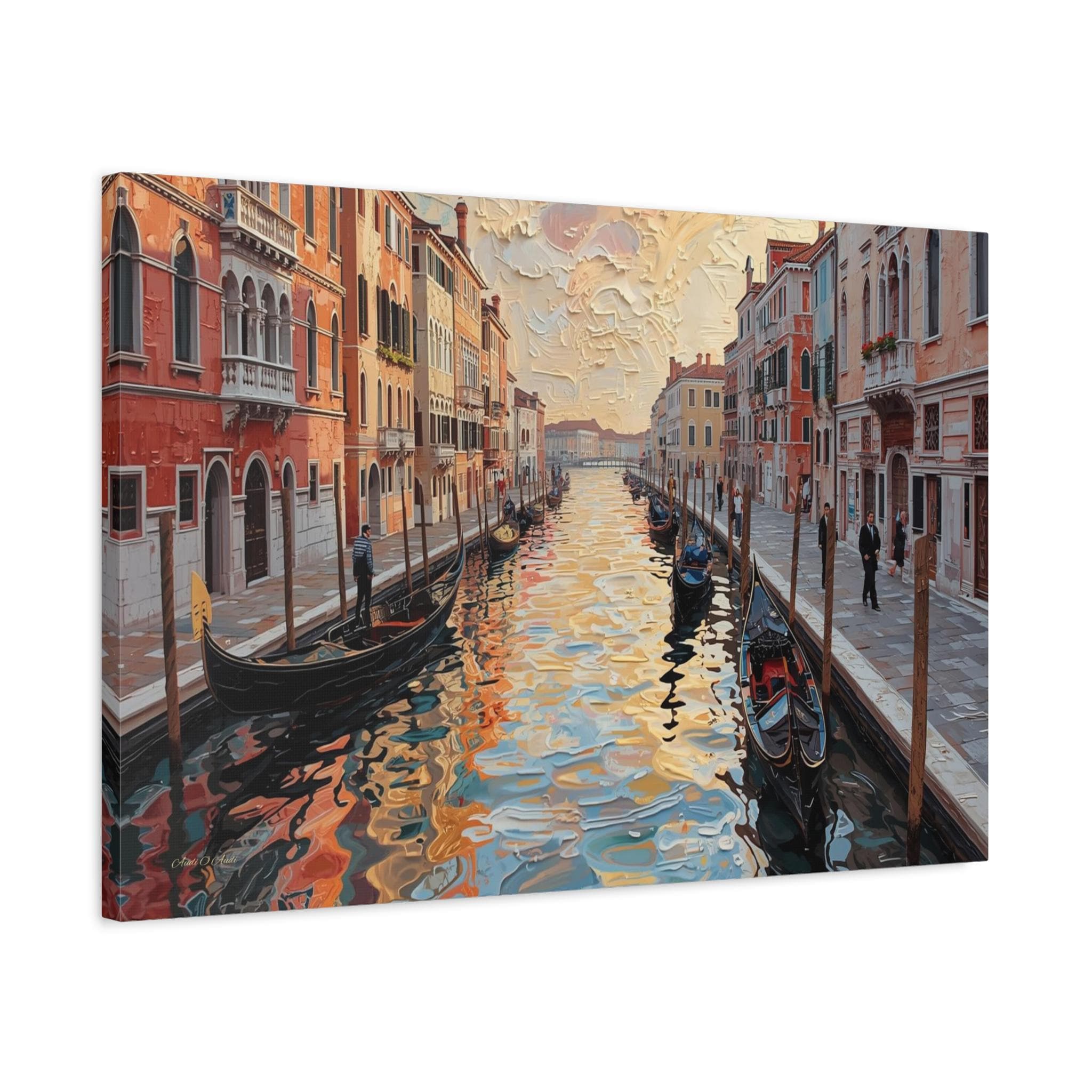 The iconic canal, bustling with traditional gondolas and subtle figures, is rendered with vibrant reflections that shimmer with an almost liquid quality, capturing the interplay of light and color from the surrounding architecture and the dramatic sky. The buildings, lining both sides of the waterway, are depicted in a warm palette of oranges, reds, and yellows, their facades gaining depth and character from the textured application of paint. The sky above is equally expressive, filled with voluminous, agitated clouds that mirror the energy of the water below. 'Venetian Impasto' is a captivating and visually arresting piece that blends the timeless charm of Venice with a powerful contemporary artistic vision, making it an exceptional focal point in any sophisticated interior."