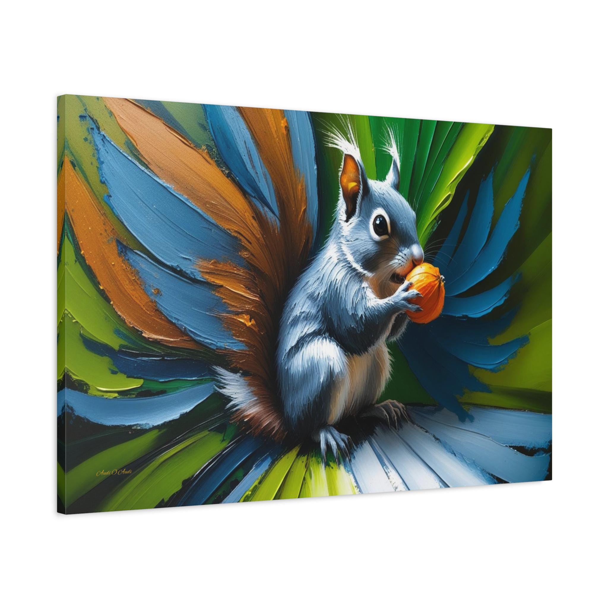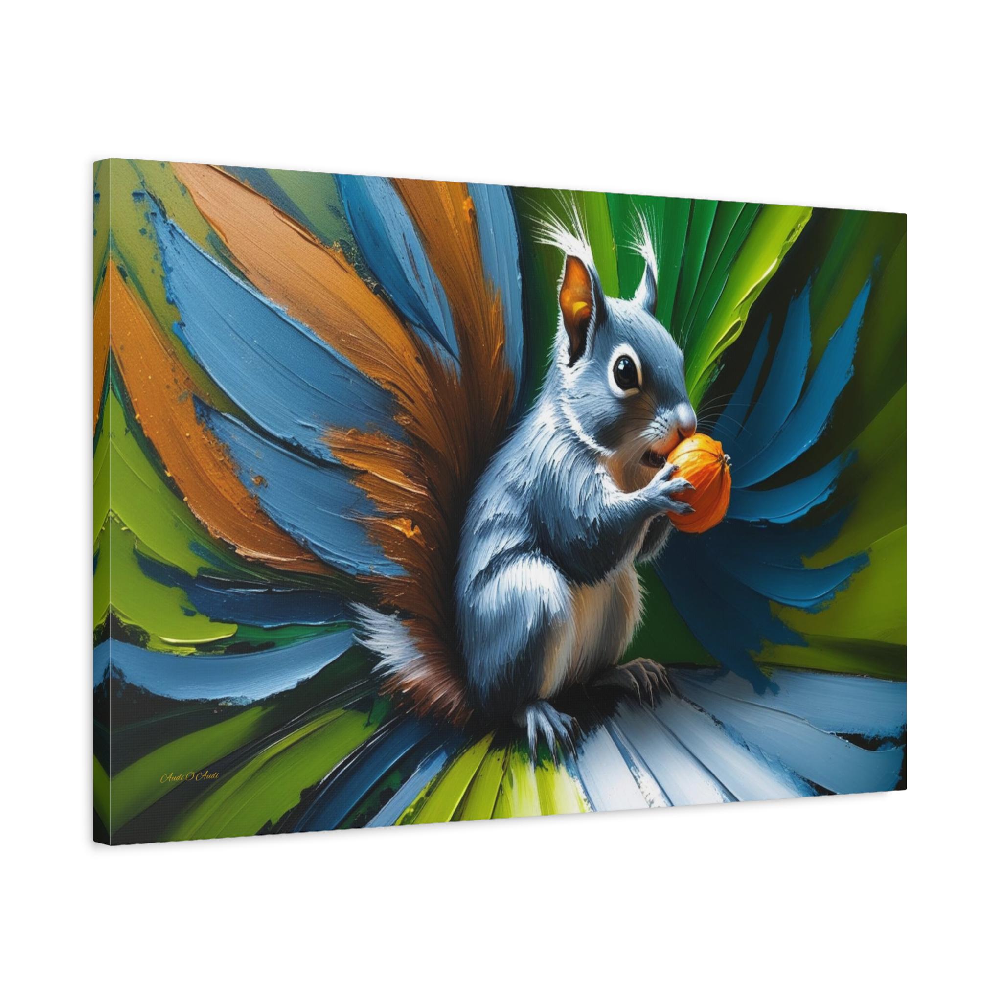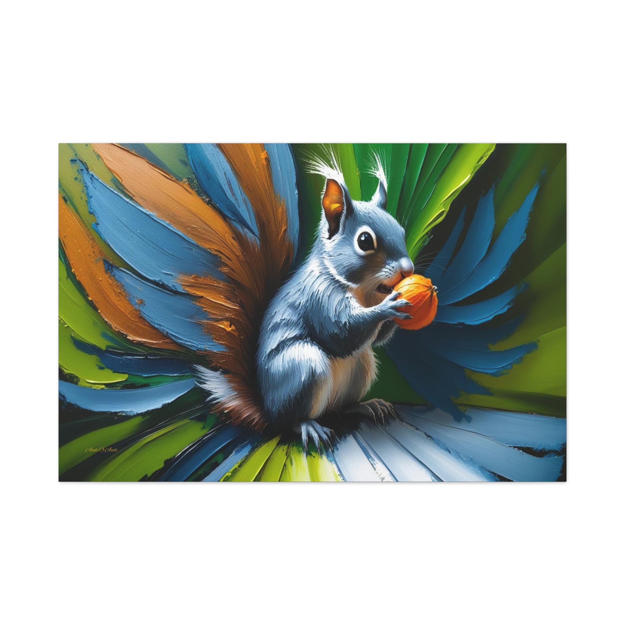 "This irresistibly charming canvas print, titled 'Nutty Impasto' presents a delightful and vibrantly stylized depiction of a squirrel in a moment of pure joy. The adorable creature, with its soft grey fur, bright eyes, and perky white ear tufts, is captured holding a perfectly ripe orange nut, its focus utterly endearing. What truly sets this artwork apart is its dynamic and expressive impasto technique, where thick, visible brushstrokes create a rich, almost sculptural texture throughout the entire composition.