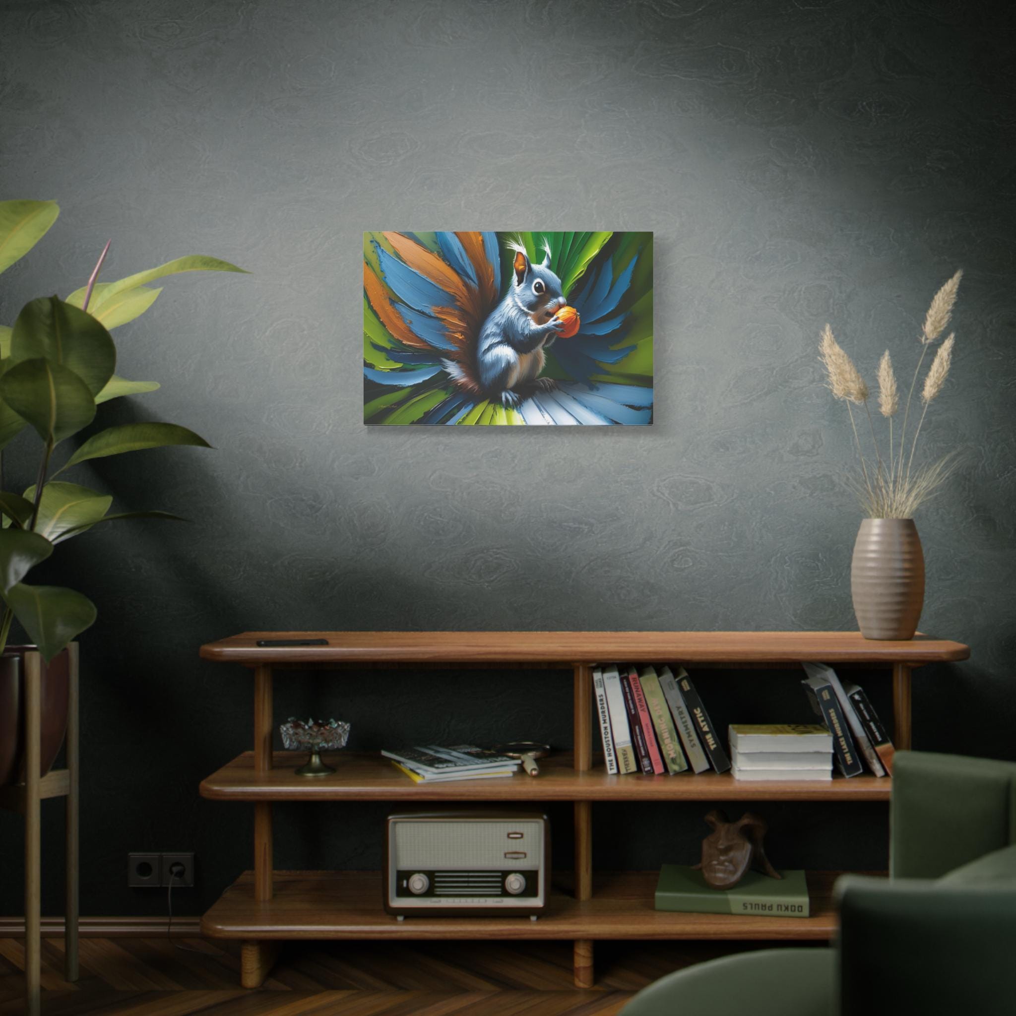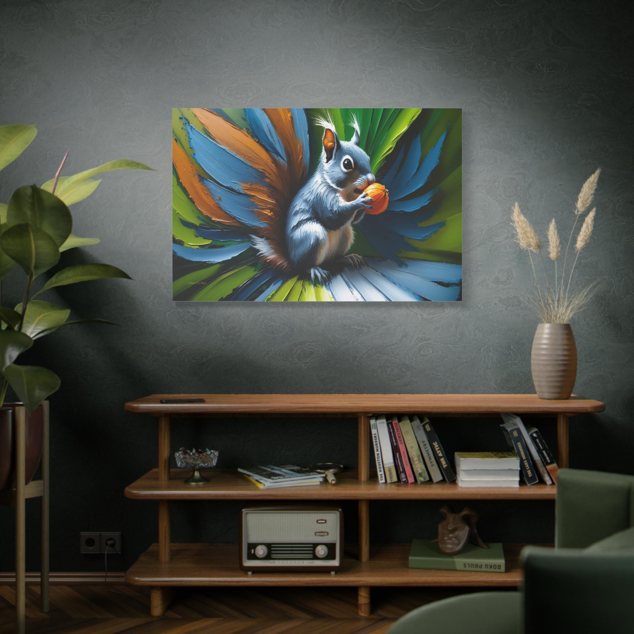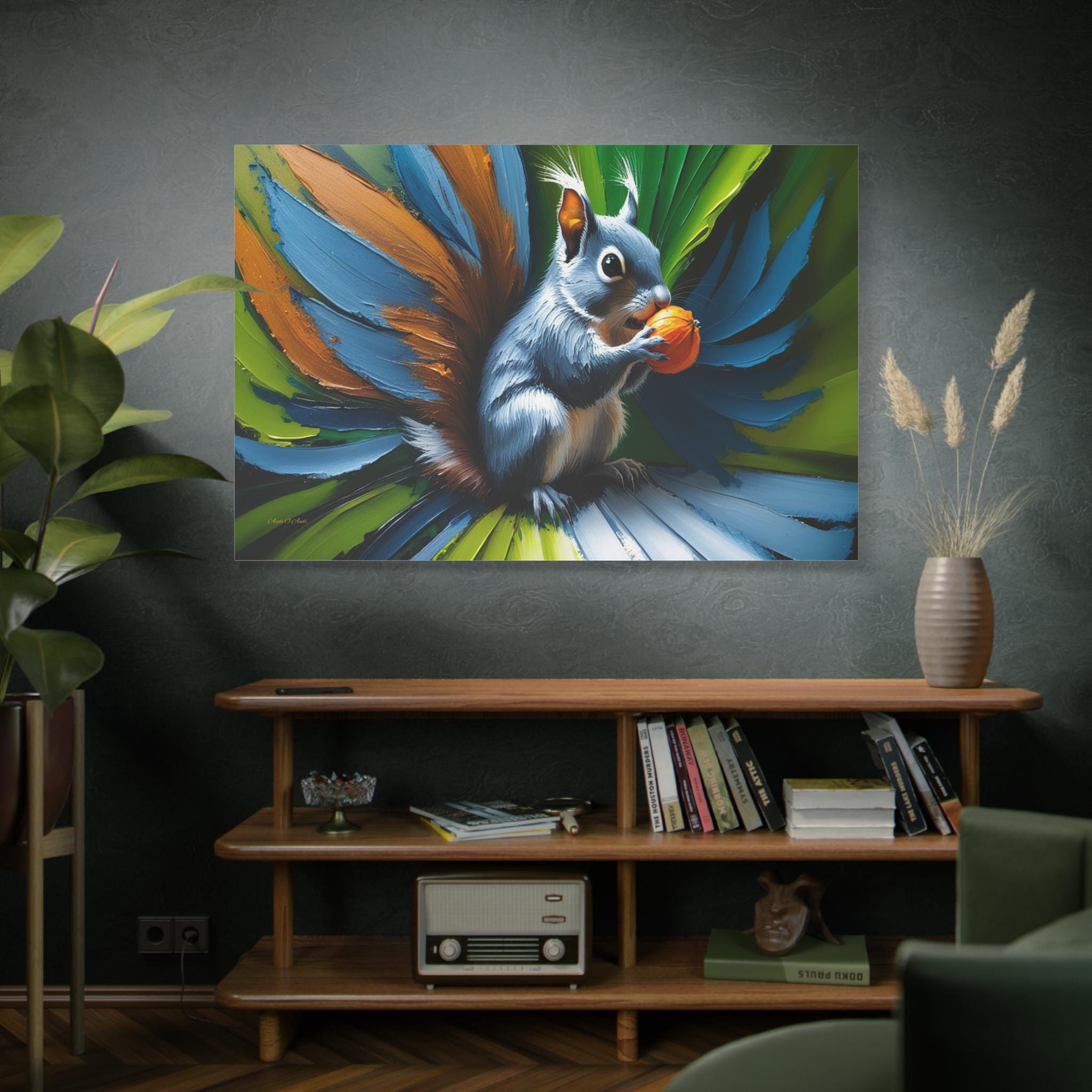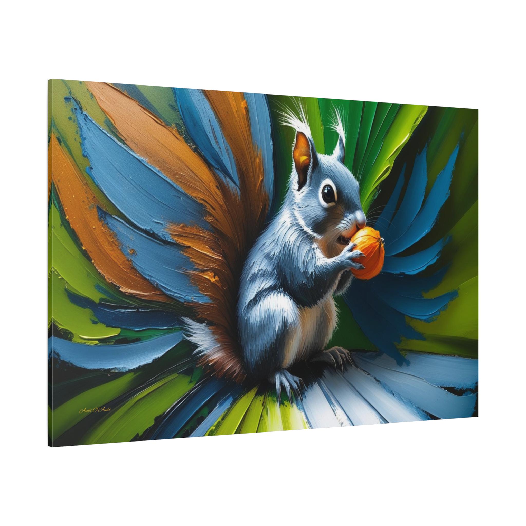 "This irresistibly charming canvas print, titled 'Nutty Impasto' presents a delightful and vibrantly stylized depiction of a squirrel in a moment of pure joy. The adorable creature, with its soft grey fur, bright eyes, and perky white ear tufts, is captured holding a perfectly ripe orange nut, its focus utterly endearing. What truly sets this artwork apart is its dynamic and expressive impasto technique, where thick, visible brushstrokes create a rich, almost sculptural texture throughout the entire composition.