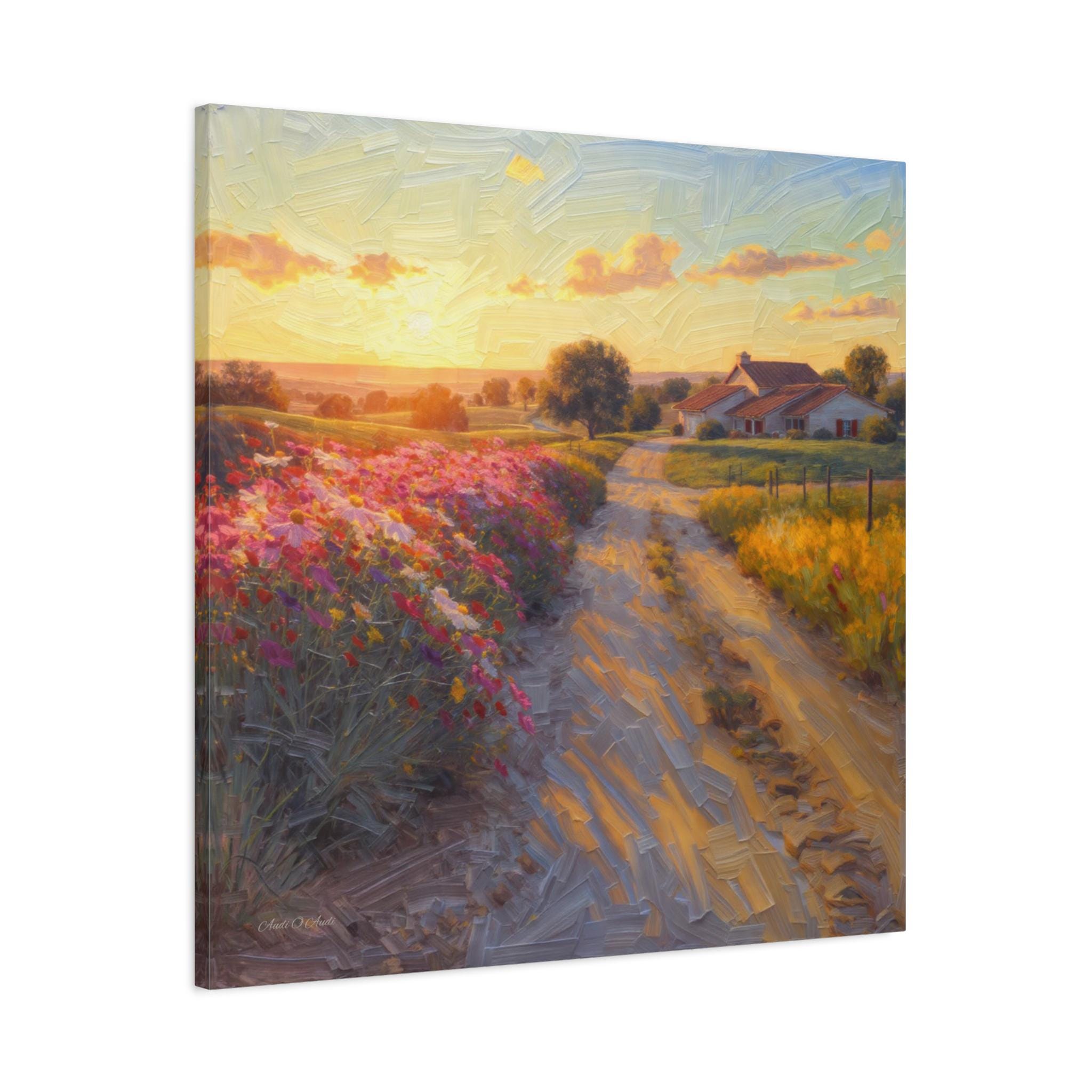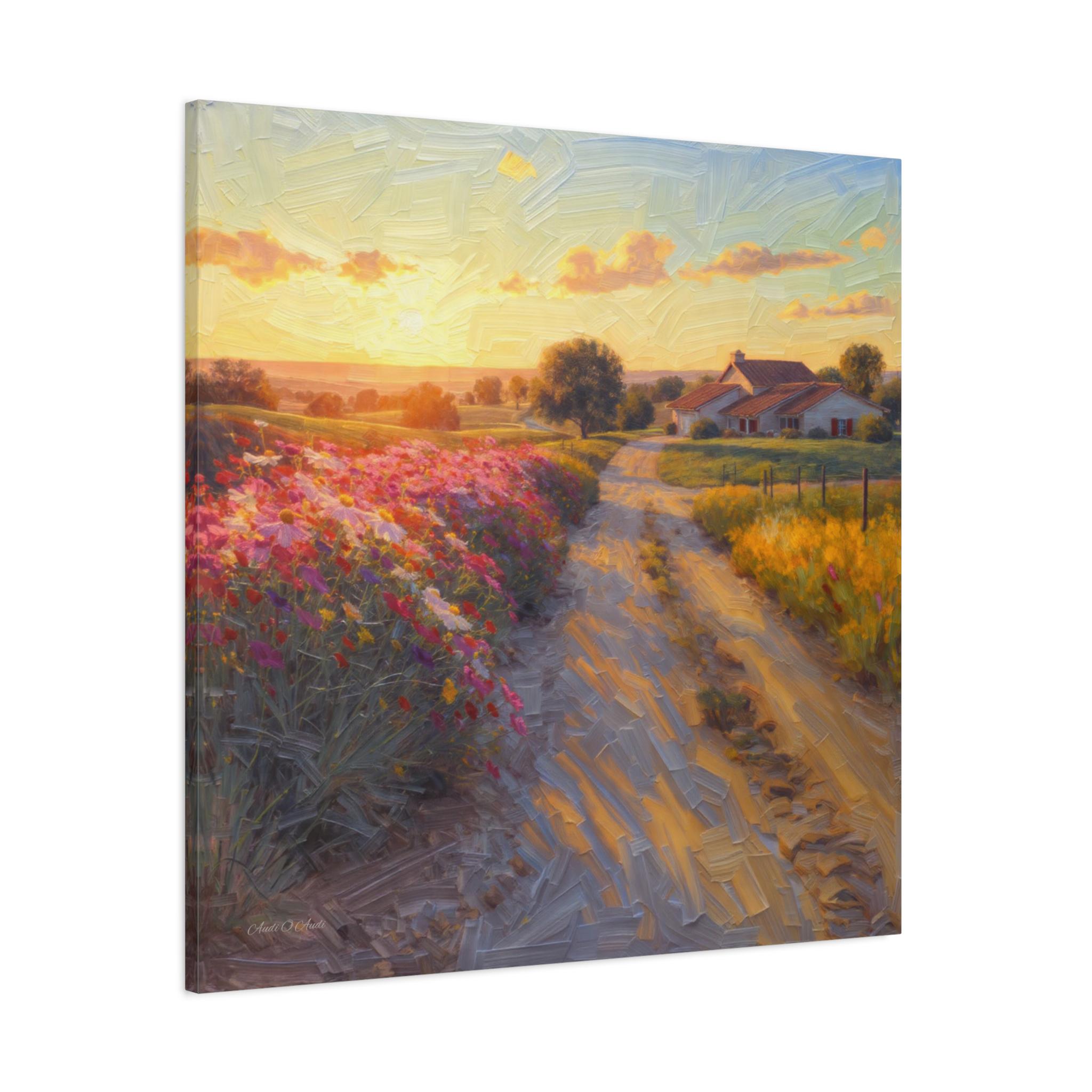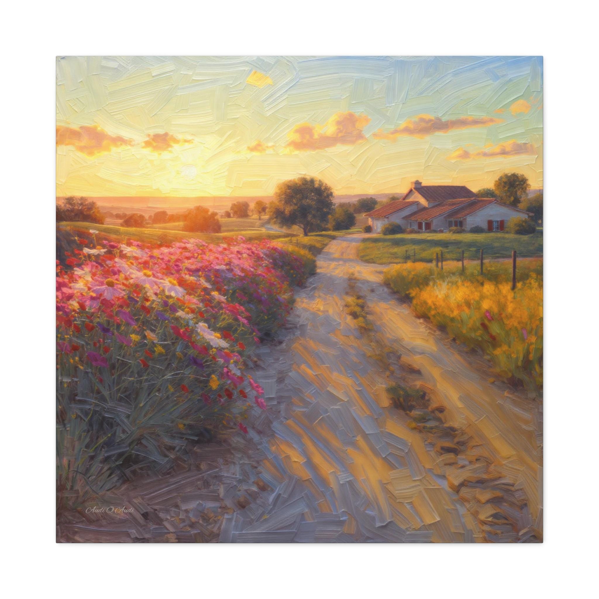 This breathtaking canvas print, titled 'Golden Valley Path' offers an enchanting journey into a vibrant, sun-drenched pastoral landscape. The artwork features a winding dirt road, illuminated by the warm glow of a low-hanging sun, leading the viewer through rolling hills adorned with an explosion of colorful wildflowers. The artist masterfully employs a rich, textured painterly style, where visible brushstrokes give a dynamic, almost three-dimensional quality to the lush foliage, the sun-kissed clouds, and the charming, distant cottages with thatched roofs nestled amongst the trees.