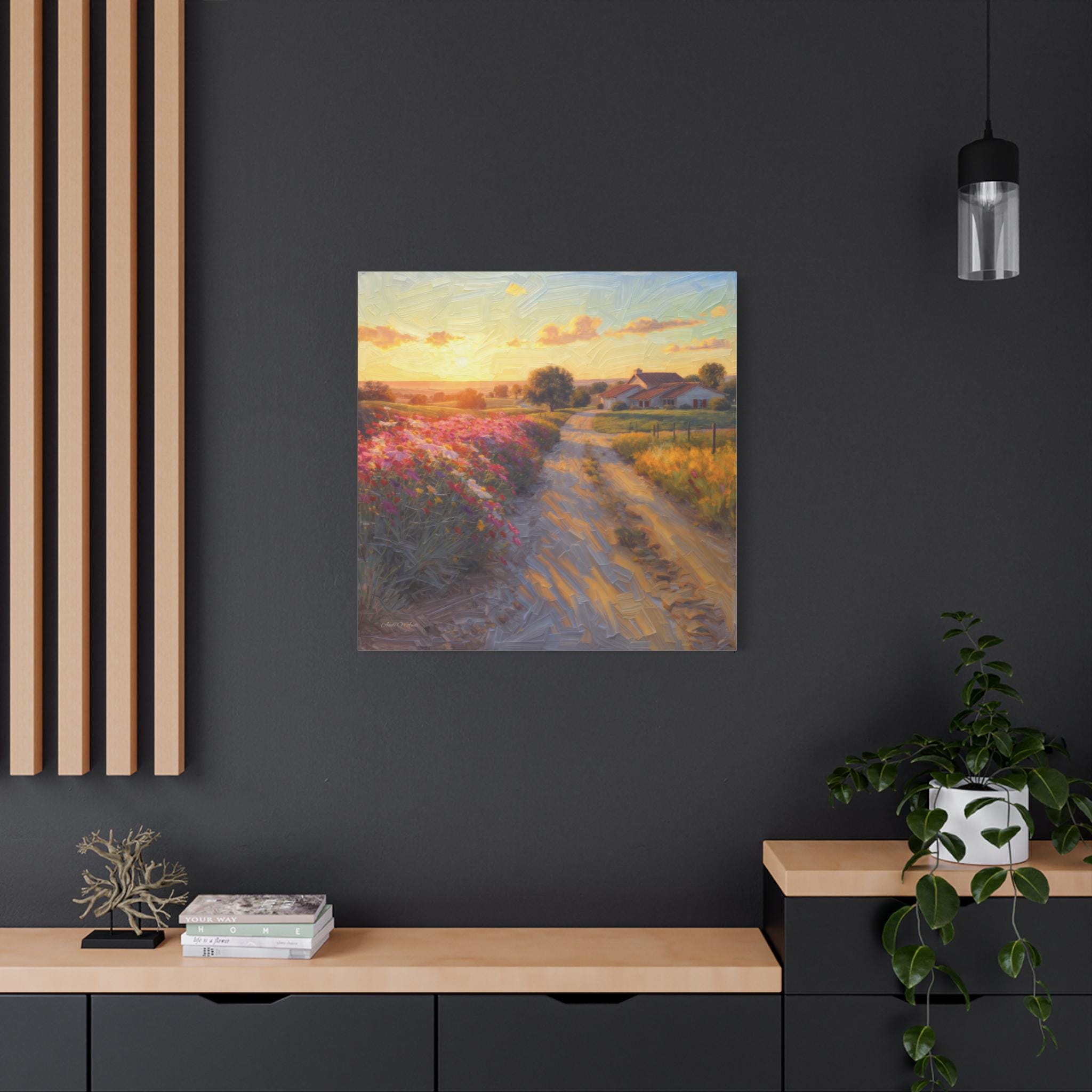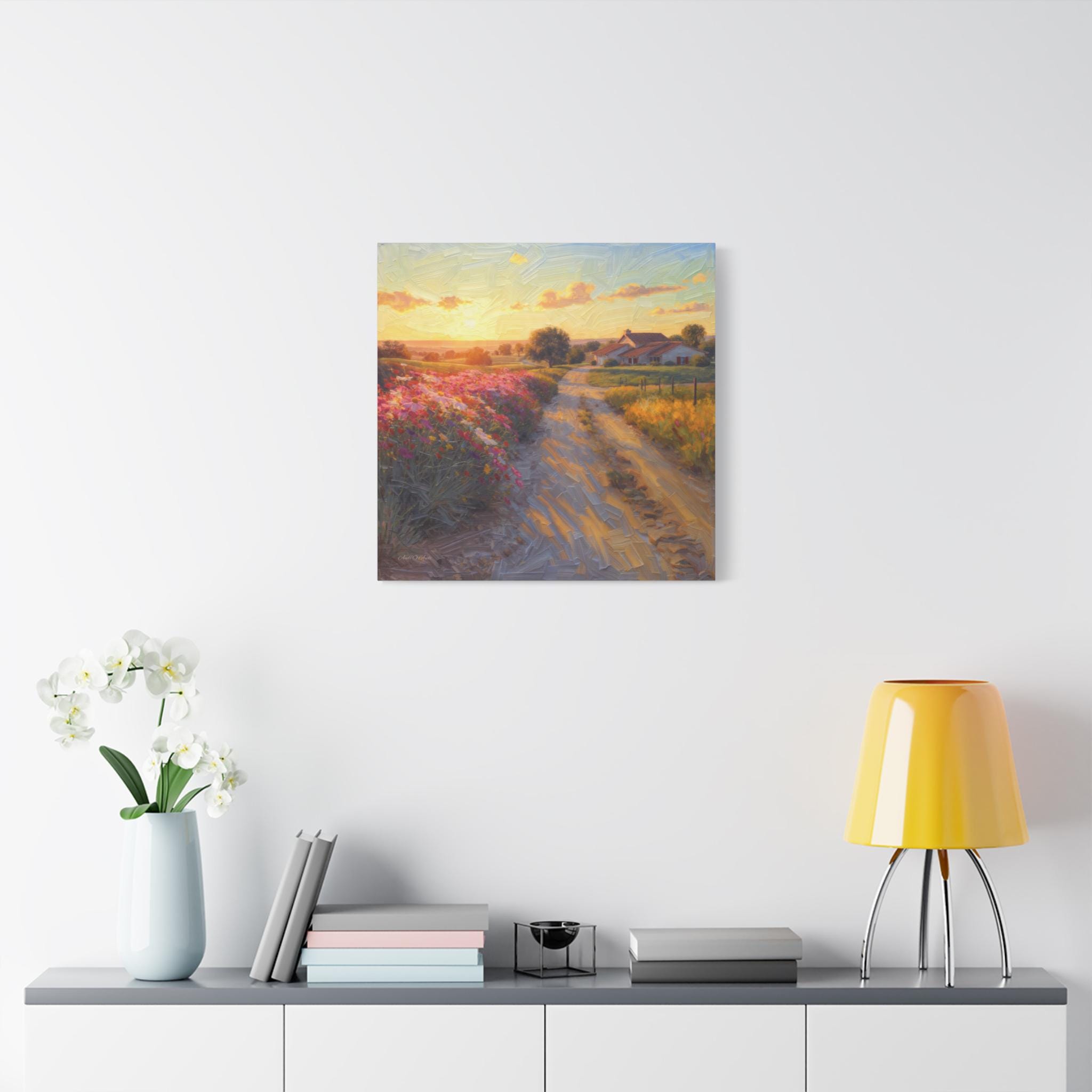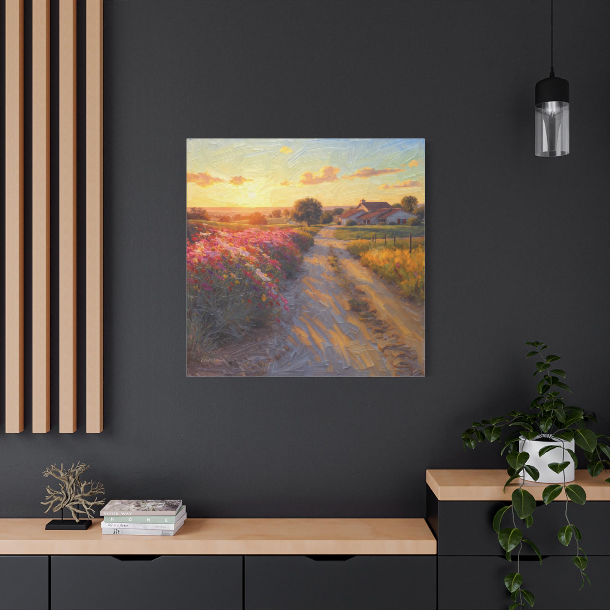 This breathtaking canvas print, titled 'Golden Valley Path' offers an enchanting journey into a vibrant, sun-drenched pastoral landscape. The artwork features a winding dirt road, illuminated by the warm glow of a low-hanging sun, leading the viewer through rolling hills adorned with an explosion of colorful wildflowers. The artist masterfully employs a rich, textured painterly style, where visible brushstrokes give a dynamic, almost three-dimensional quality to the lush foliage, the sun-kissed clouds, and the charming, distant cottages with thatched roofs nestled amongst the trees.