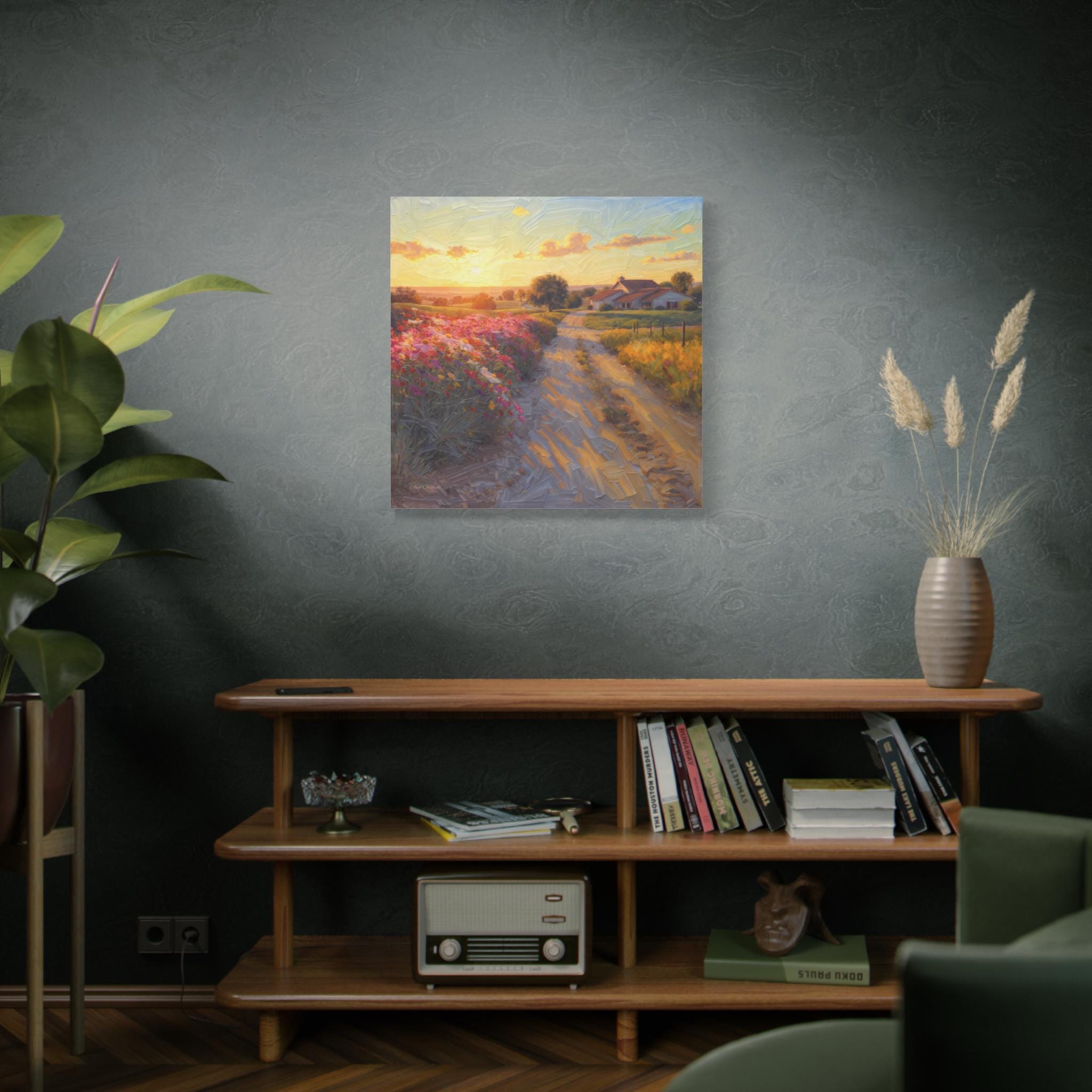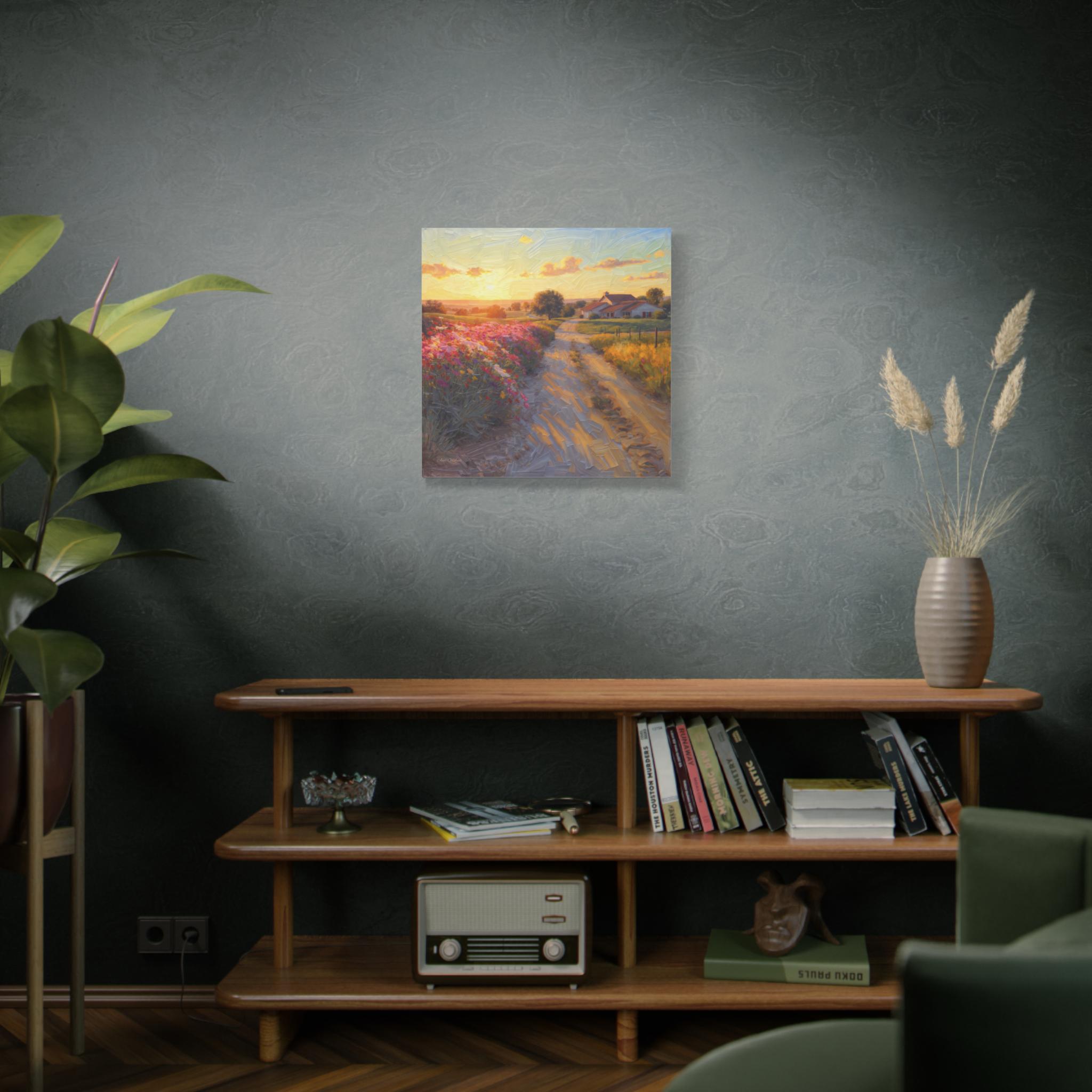 The sky is a spectacular display of golden yellows, soft oranges, and delicate blues, reflecting the tranquil beauty of either dawn or dusk. Rolling hills in various shades of blue and green recede into the distance, adding profound depth to the scene. This piece evokes a powerful sense of peace, nostalgia, and the simple beauty of rural life. 'Golden Valley Path' is an extraordinary and immersive artwork that celebrates the serene majesty of nature and the timeless appeal of a quiet, sunlit countryside, making it a captivating and sophisticated statement piece for any interior seeking warmth and natural beauty."