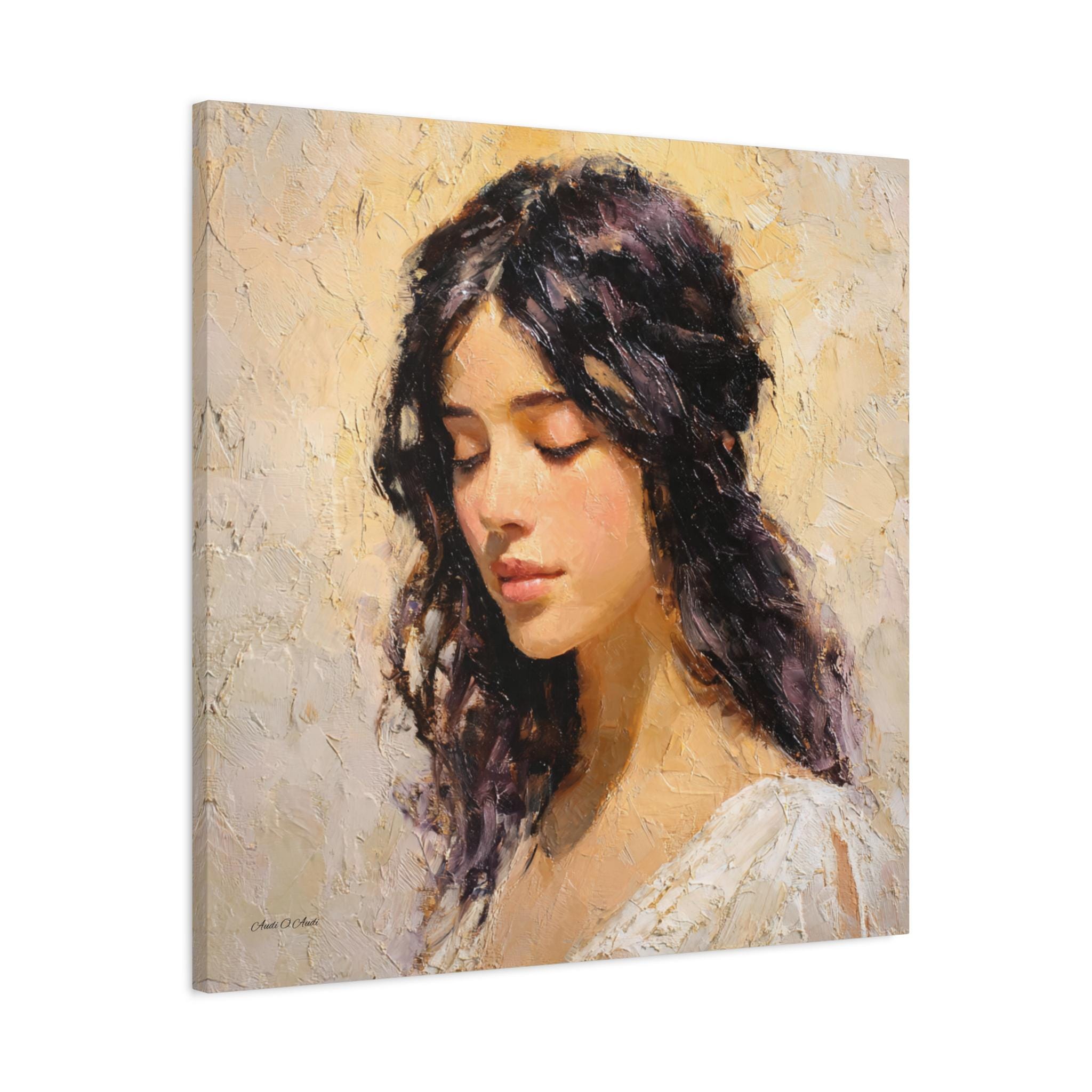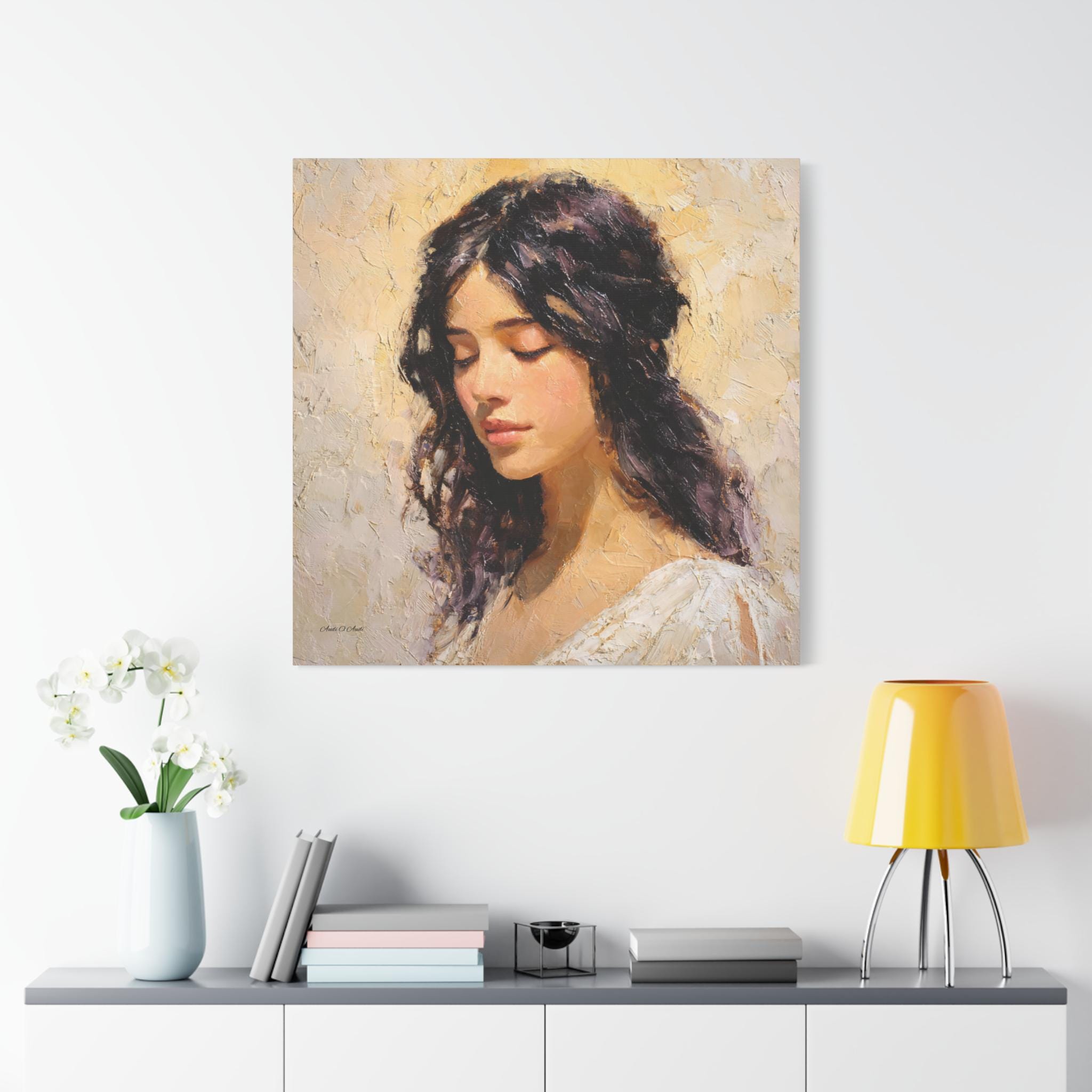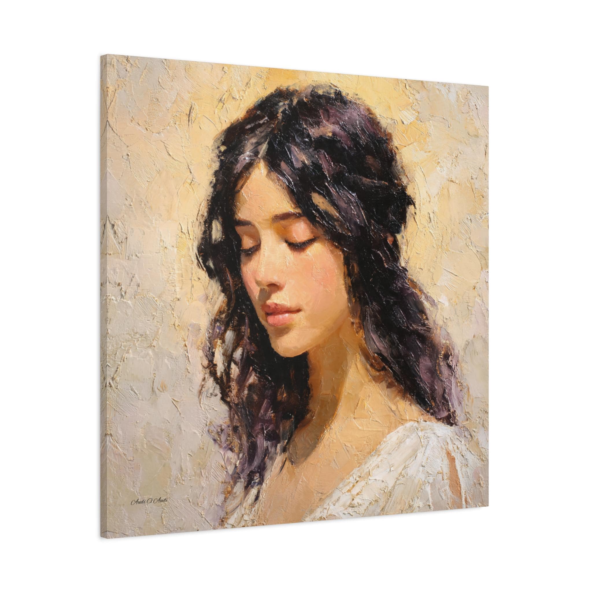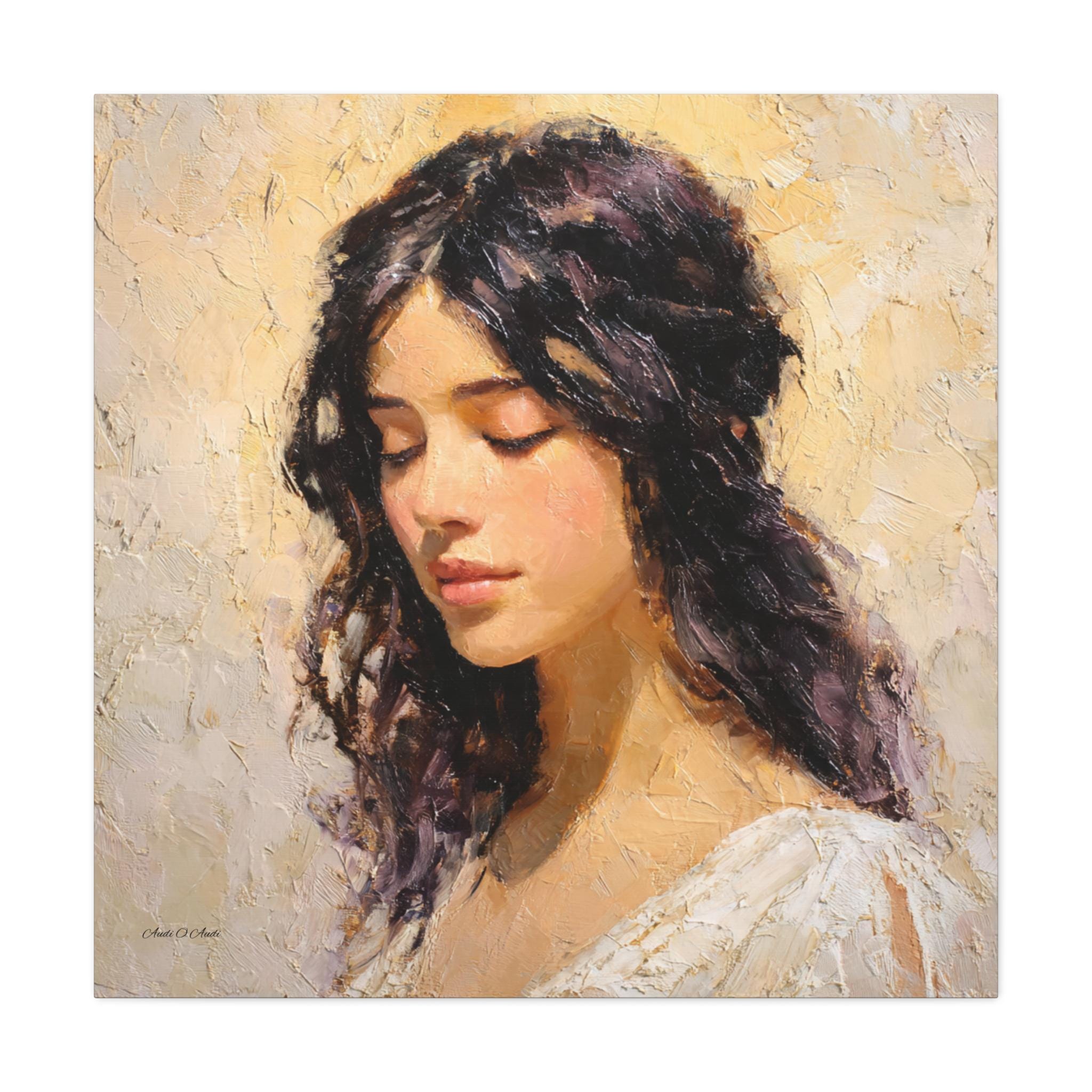 "This exquisite canvas print, titled 'Serene Reverie' presents a captivating portrait of a young woman immersed in a moment of tranquil introspection. Her eyes are gently closed, her expression soft and peaceful, illuminated by a warm, golden light that seems to emanate from within. The artist masterfully employs a distinctive impasto technique, where thick, visible brushstrokes create a rich, sculptural texture throughout the entire composition, from the luminous background to the flowing dark hair and the subtle folds of her garment.
