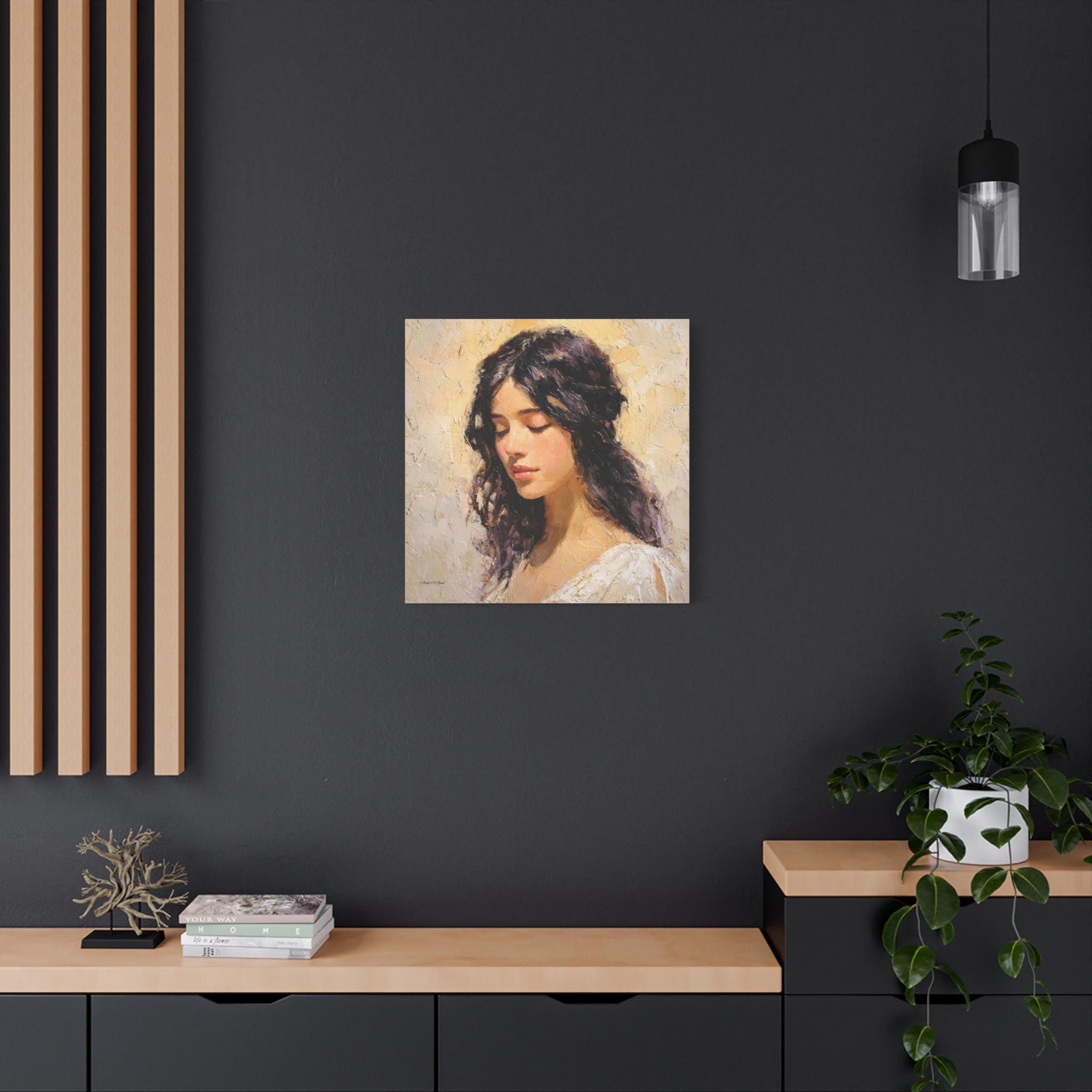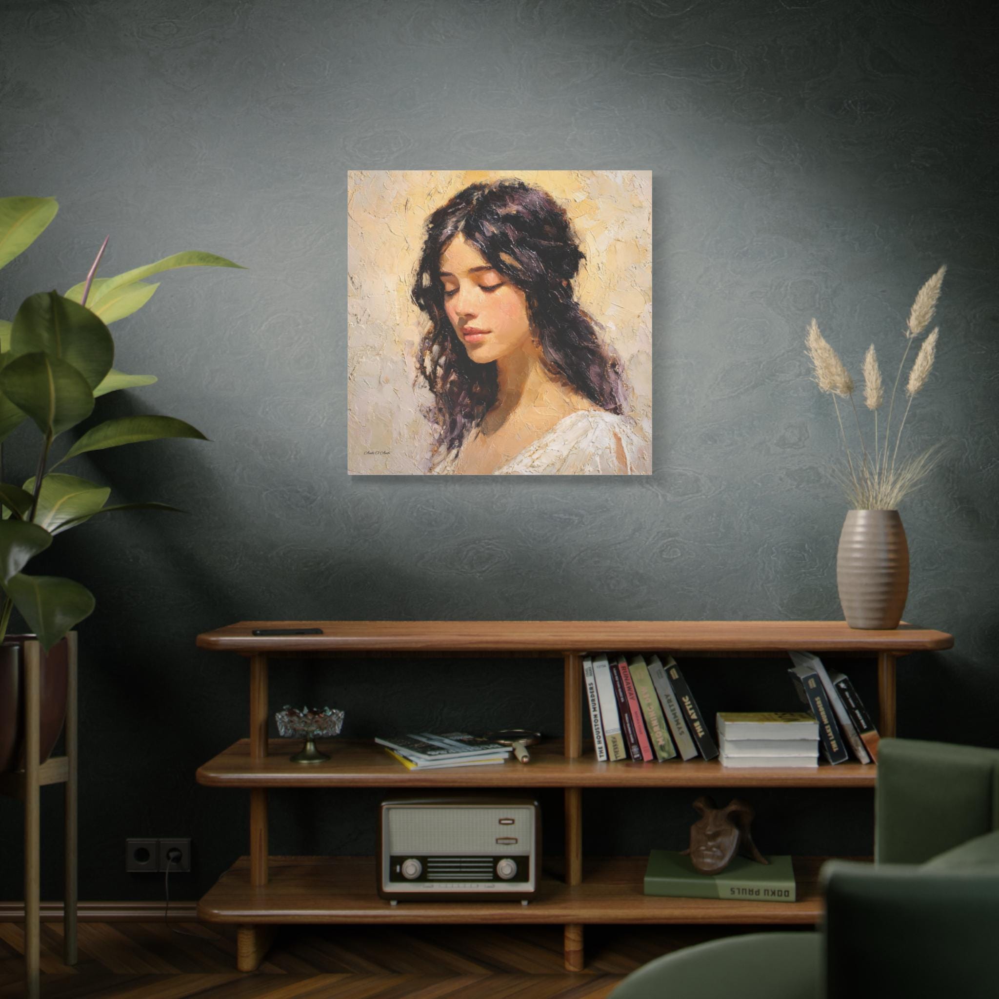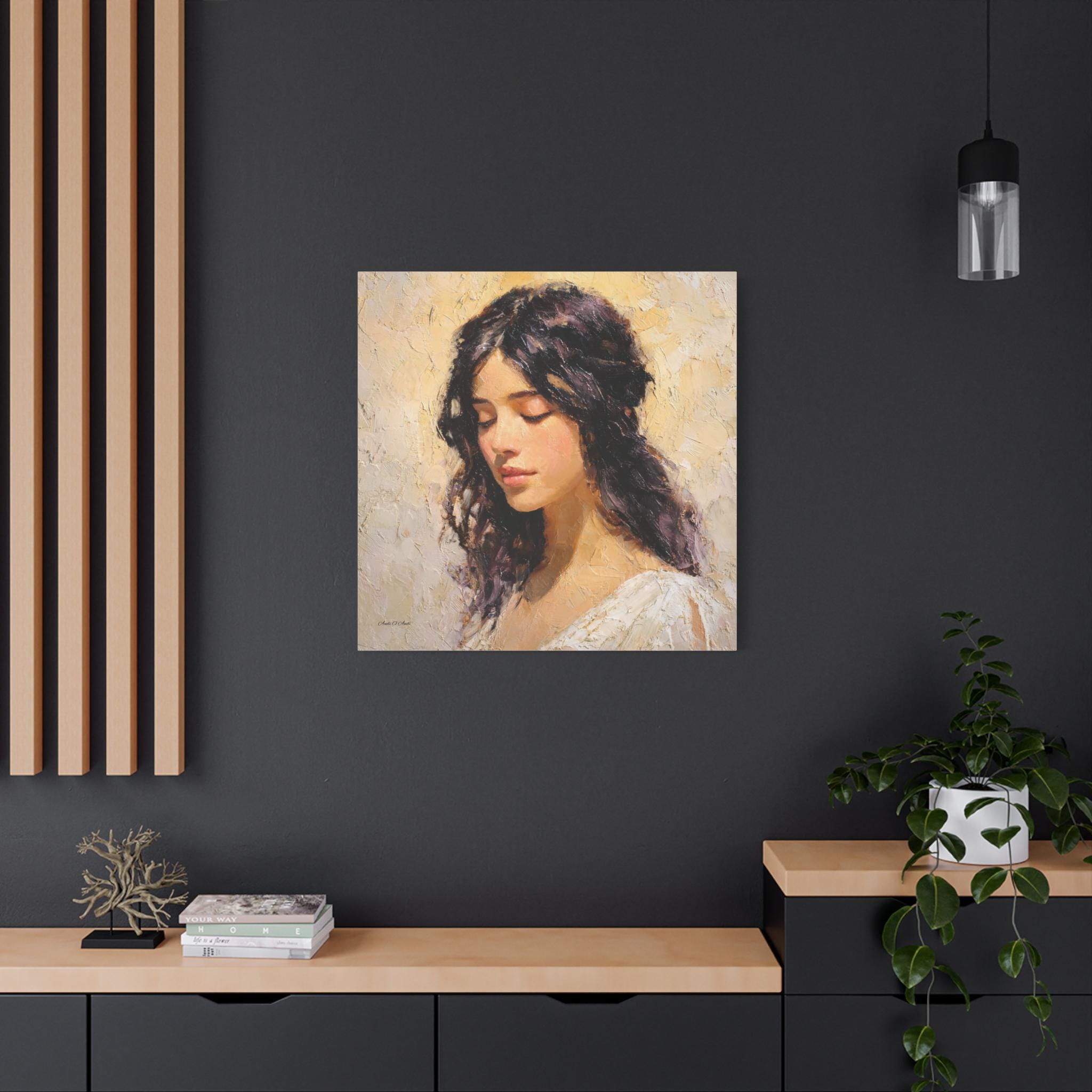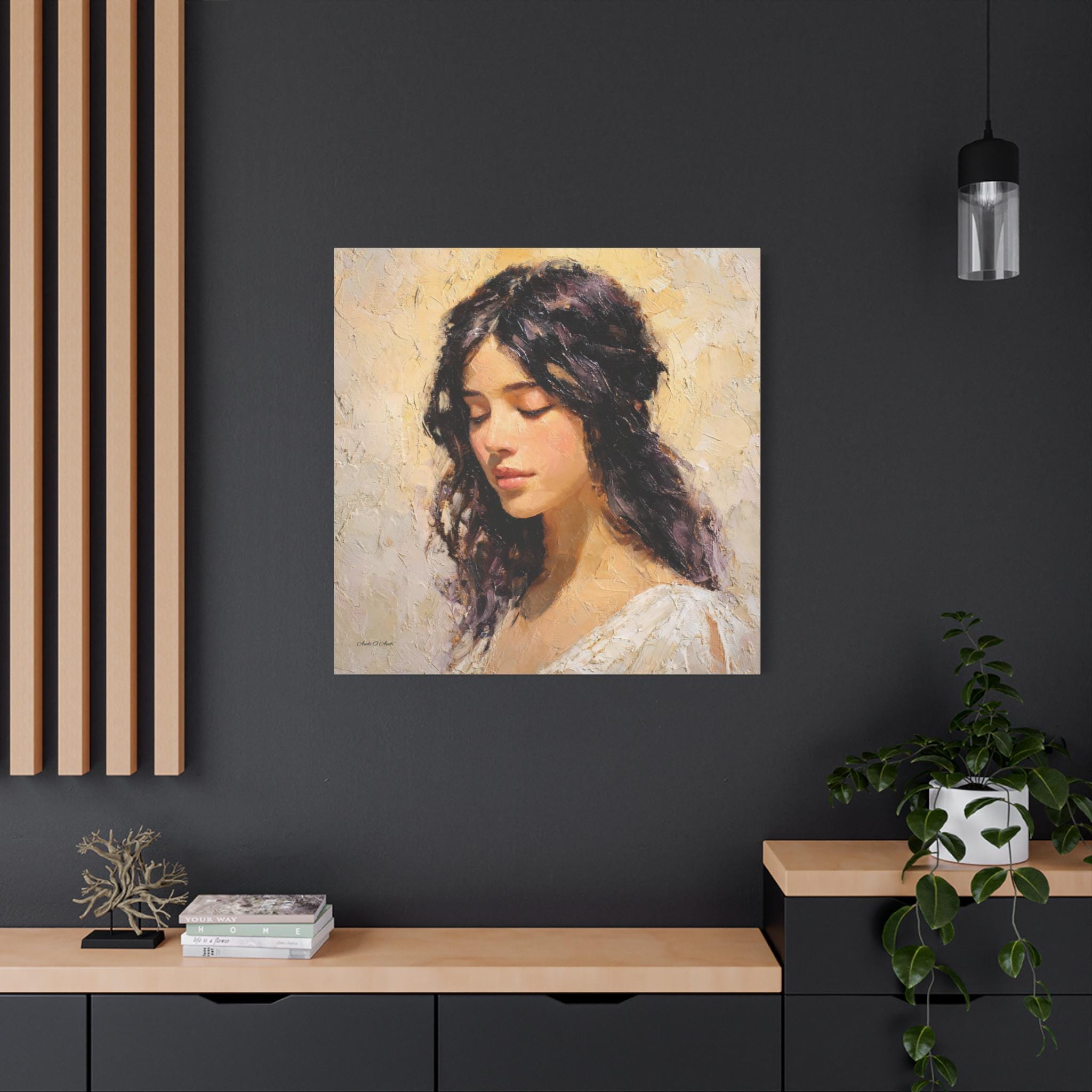 "This exquisite canvas print, titled 'Serene Reverie' presents a captivating portrait of a young woman immersed in a moment of tranquil introspection. Her eyes are gently closed, her expression soft and peaceful, illuminated by a warm, golden light that seems to emanate from within. The artist masterfully employs a distinctive impasto technique, where thick, visible brushstrokes create a rich, sculptural texture throughout the entire composition, from the luminous background to the flowing dark hair and the subtle folds of her garment.