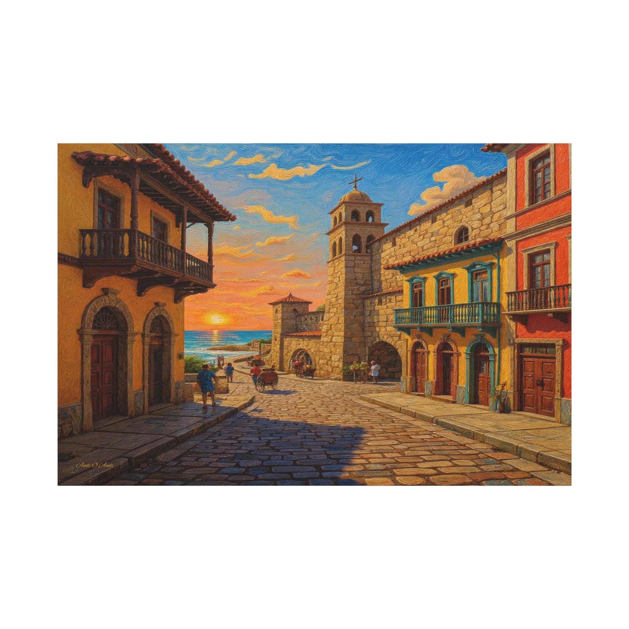"This captivating canvas print, titled 'Old City Glow' transports the viewer to a sun-drenched, historic coastal town pulsating with vibrant life and rich architectural beauty. The artwork depicts a winding cobblestone street framed by charming colonial buildings, their warm yellow and orange facades detailed with rustic textures and colorful accents like bright blue balconies and doors. In the distance, a majestic bell tower stands tall, hinting at a deep historical past.