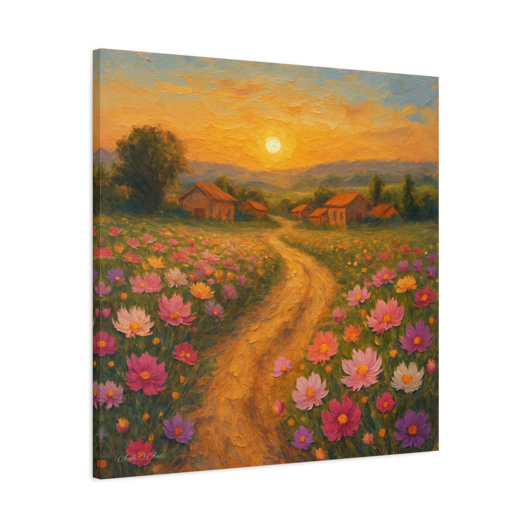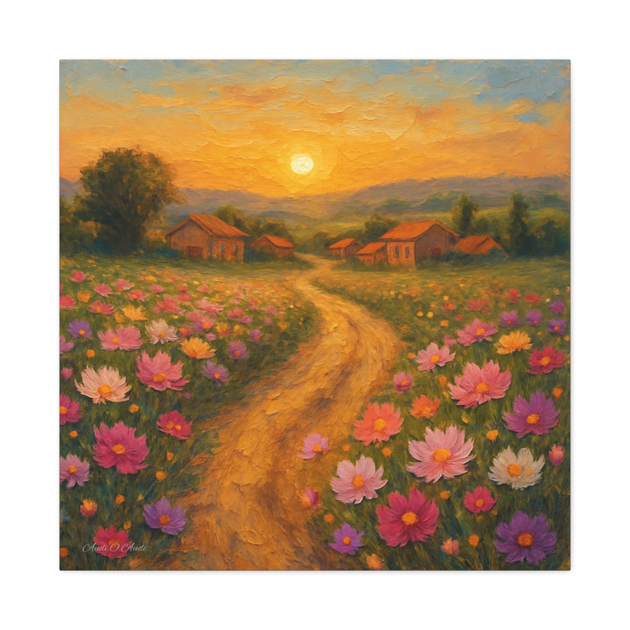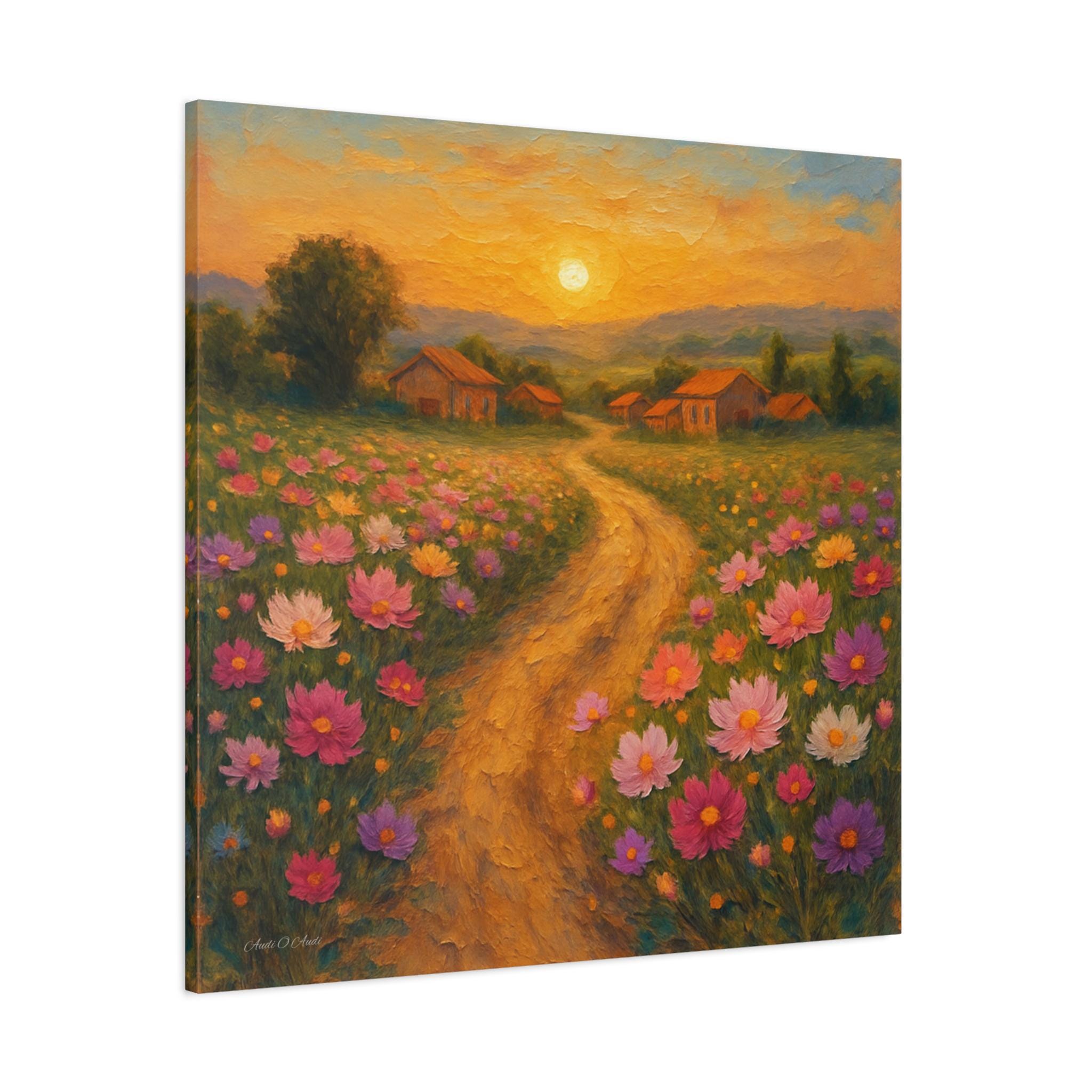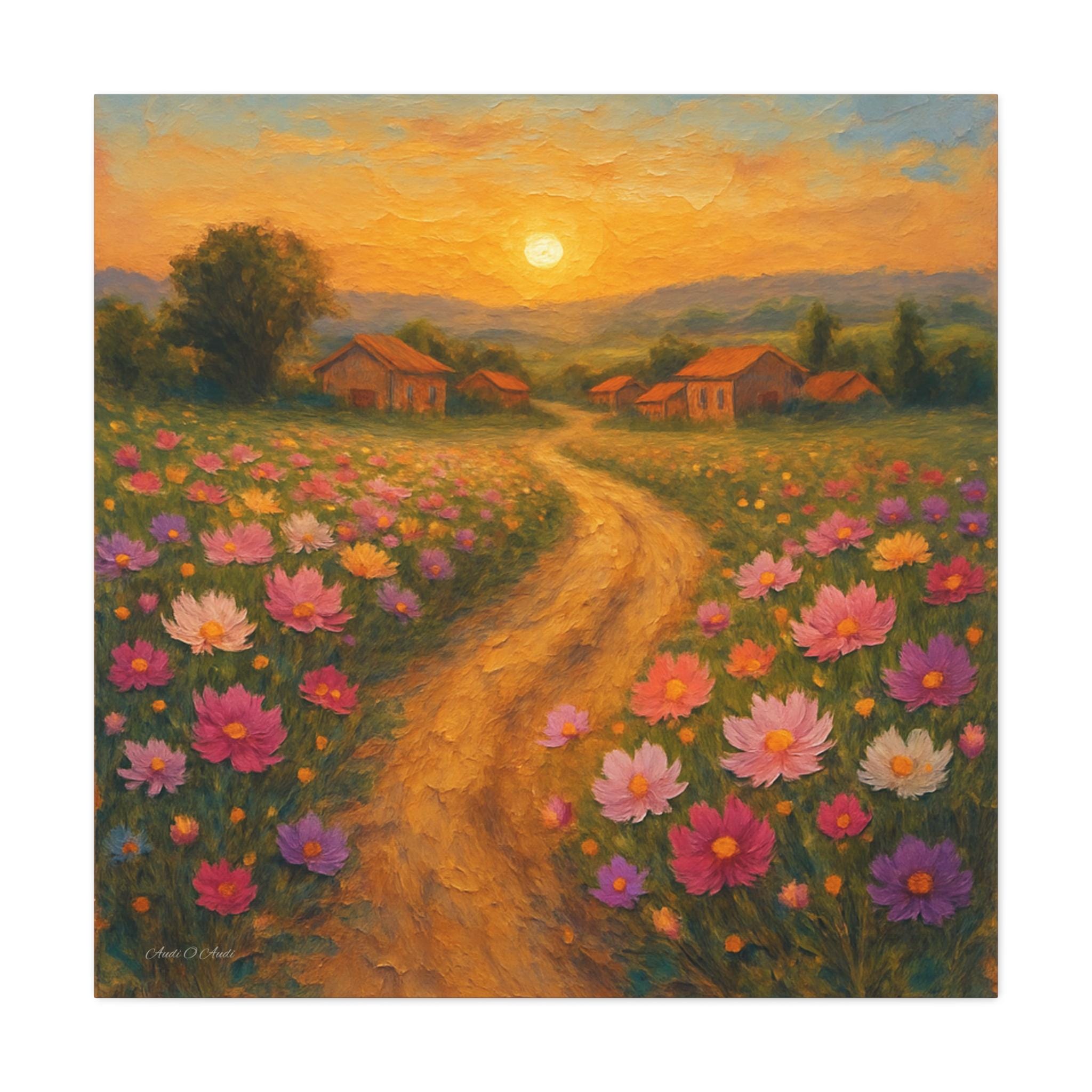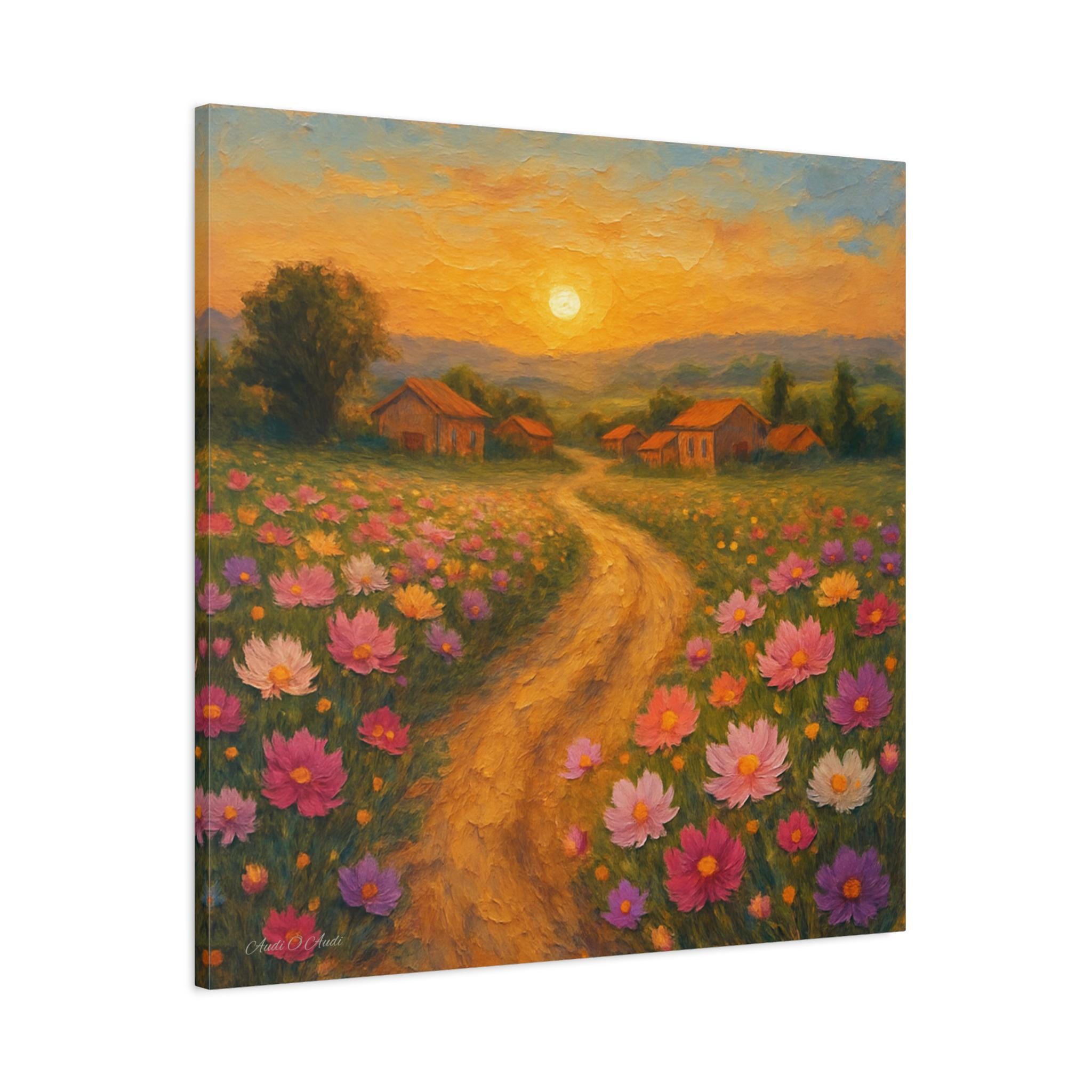 This captivating canvas print presents an idyllic rural landscape bathed in the warm, radiant light of the golden hour. The artwork is defined by its masterful use of a heavy impasto technique, where thick, expressive layers of paint create a virtually three-dimensional tapestry of texture across the entire surface.