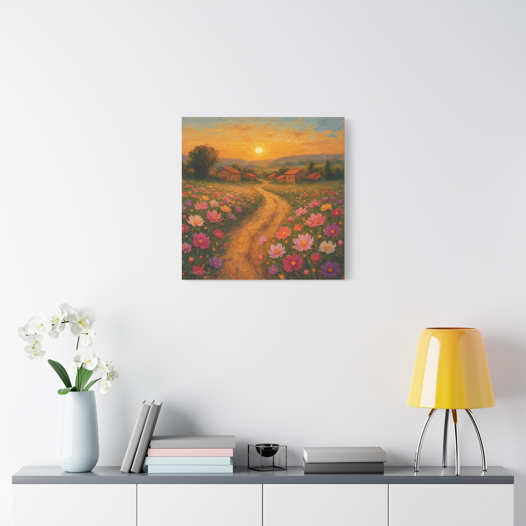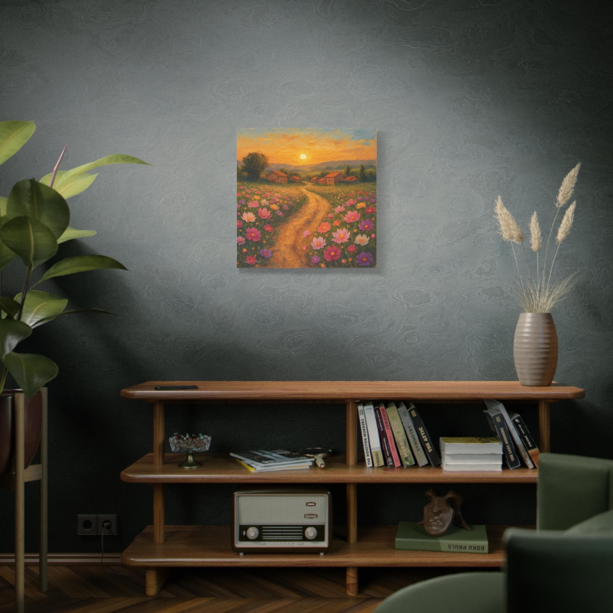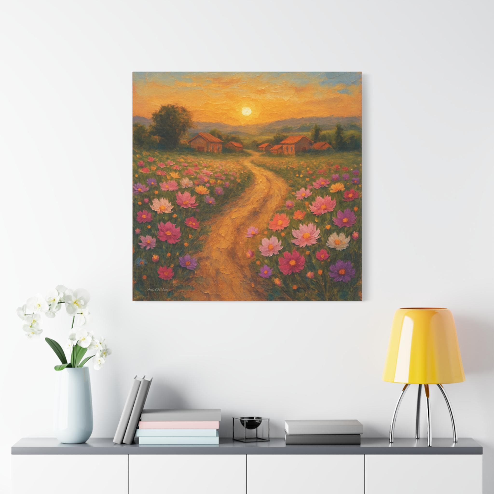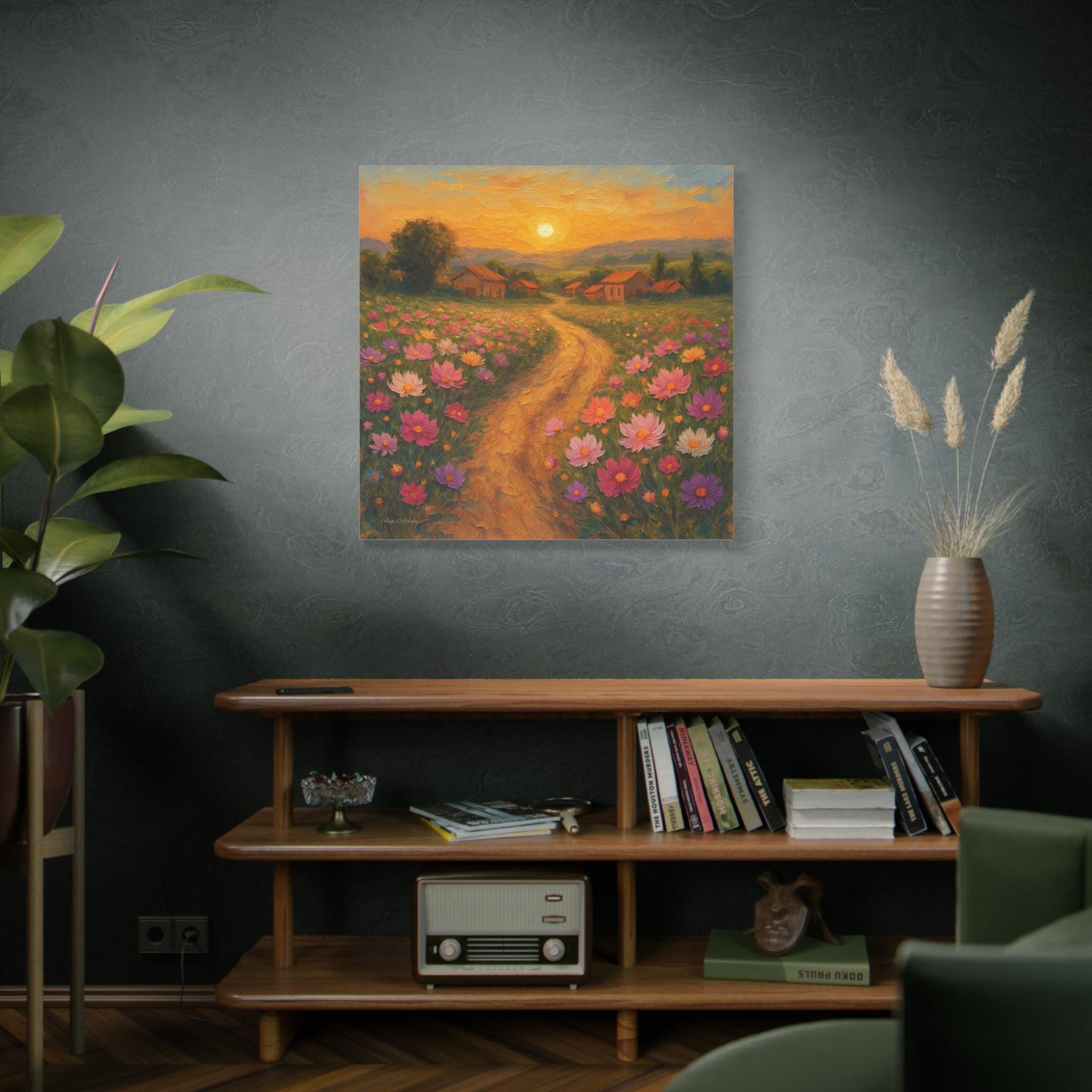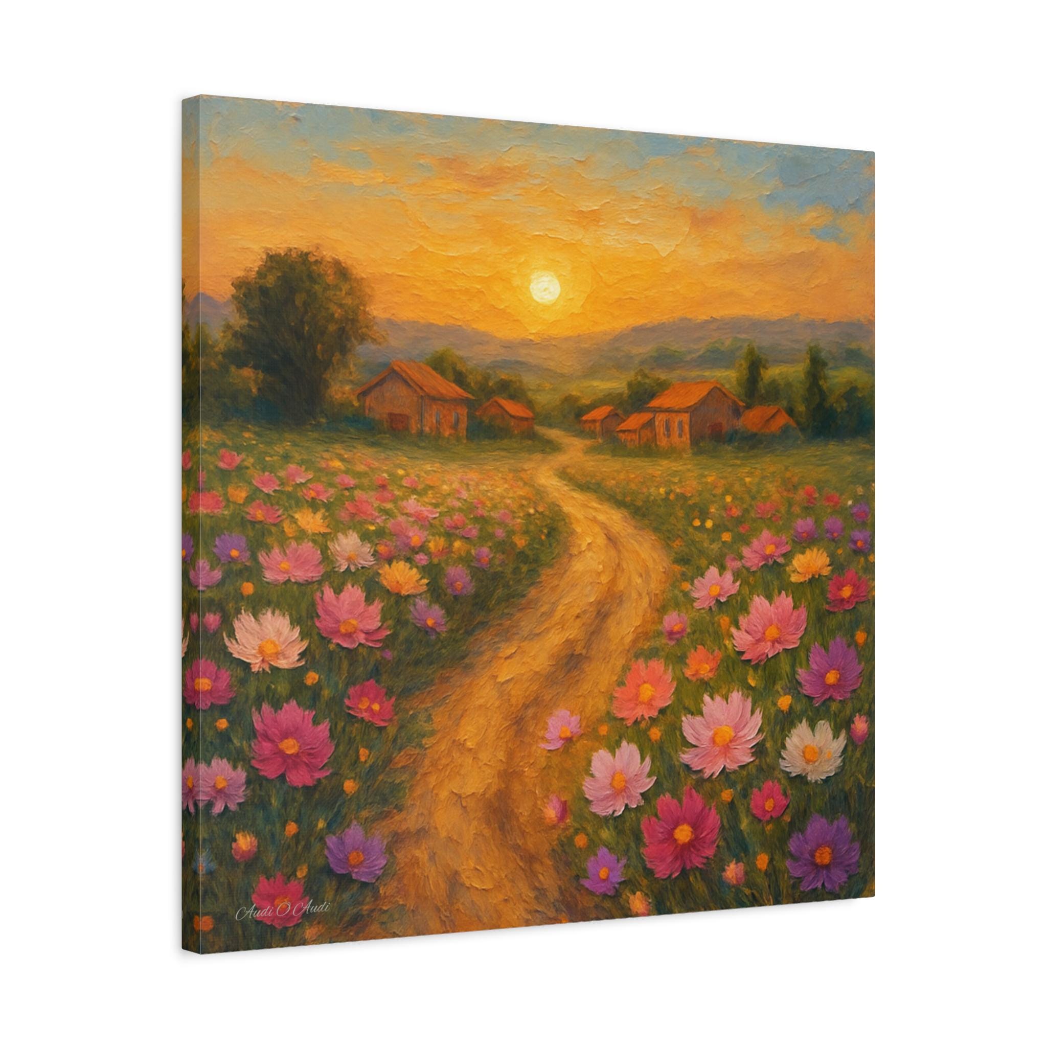 This captivating canvas print presents an idyllic rural landscape bathed in the warm, radiant light of the golden hour. The artwork is defined by its masterful use of a heavy impasto technique, where thick, expressive layers of paint create a virtually three-dimensional tapestry of texture across the entire surface.