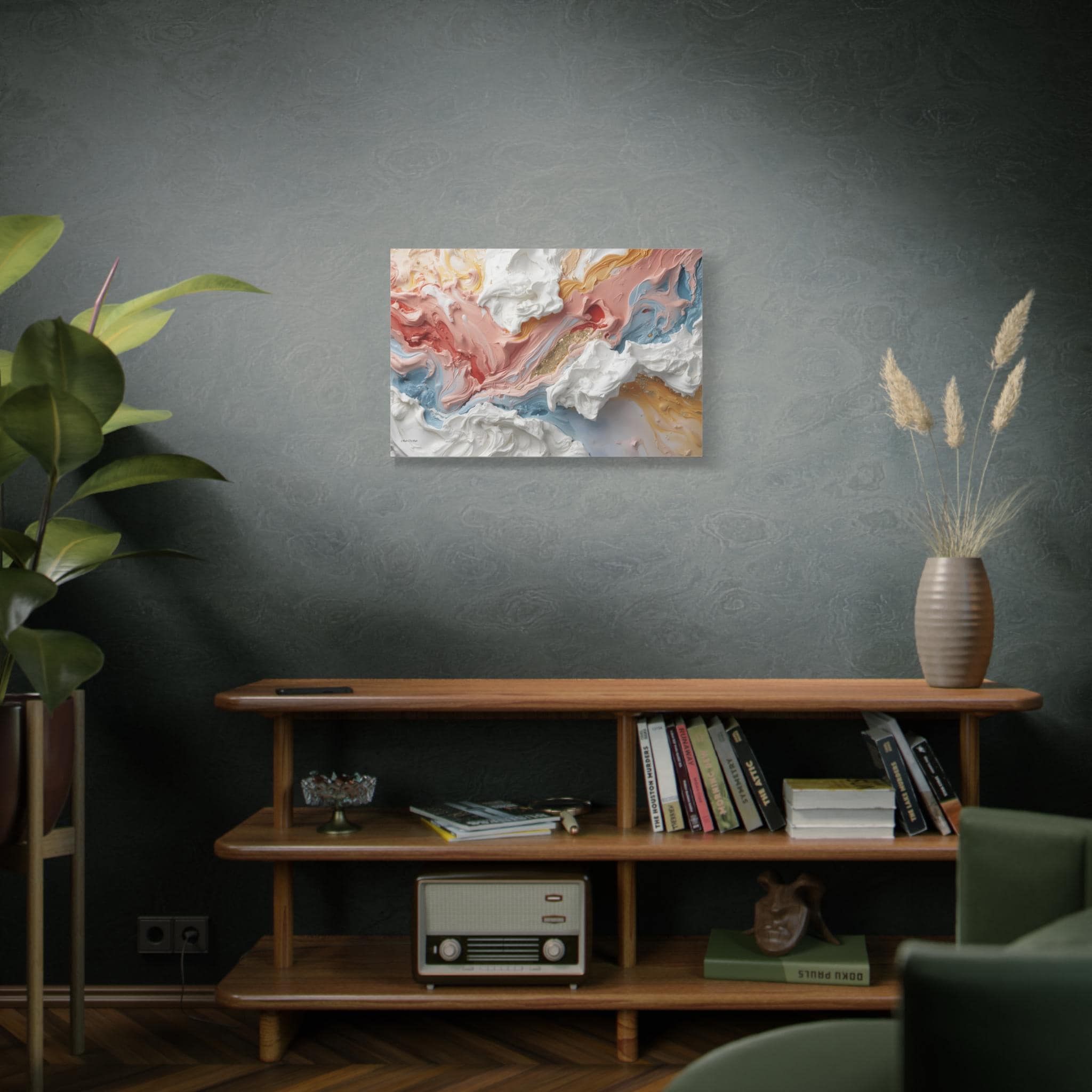The composition showcases a sophisticated interplay of colors that evoke both warmth and coolness: flowing pastel coral and peach intertwine with serene icy blues and pale lavender undertones. Critical to its luxury appeal is the integration of iridescent metallic gold flecks embedded within the swirls. These accents catch the light at every angle, adding a shimmering, high-end finish that sets this piece apart.