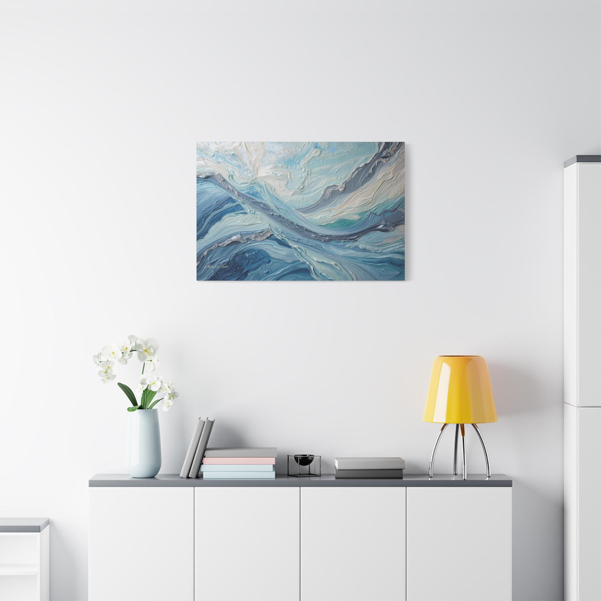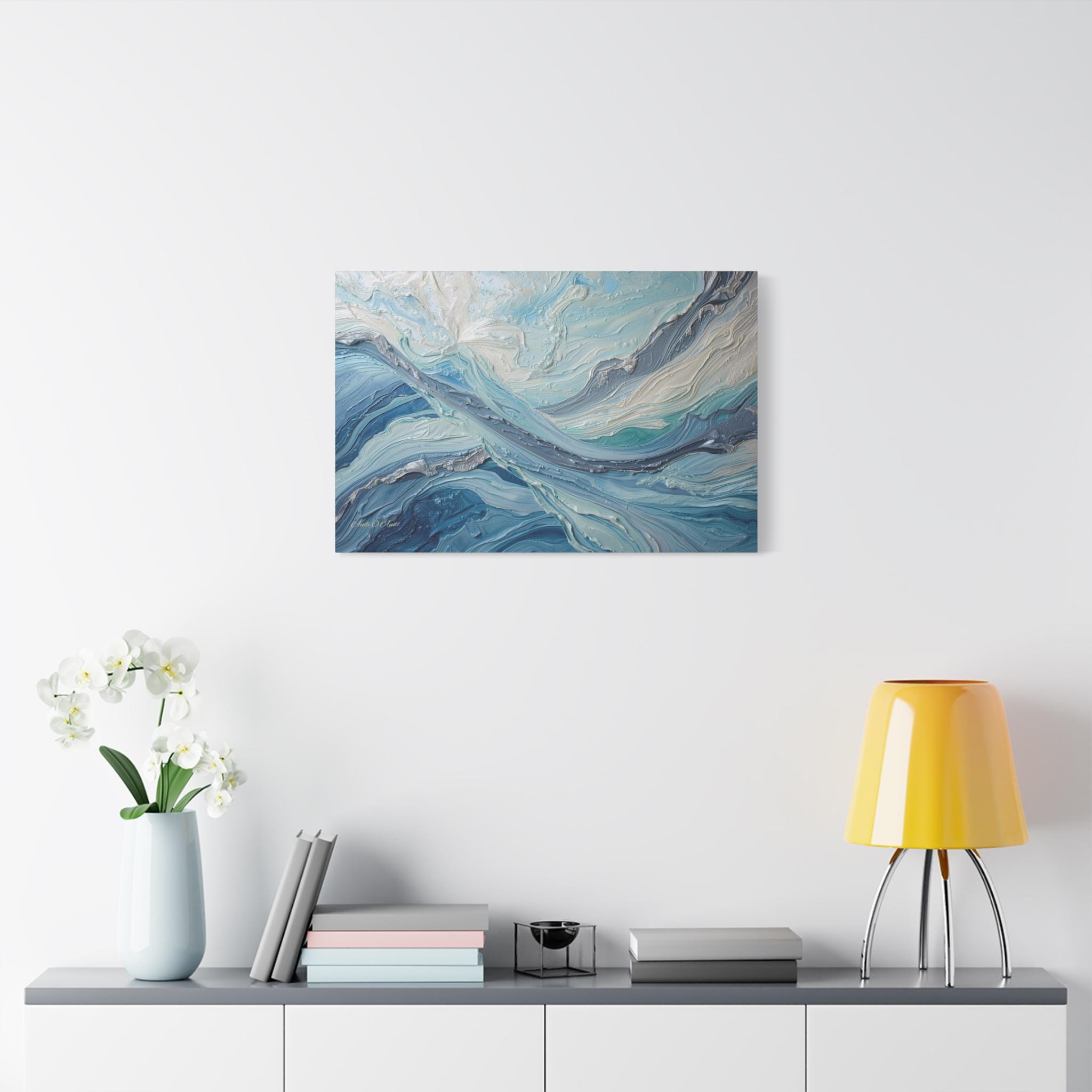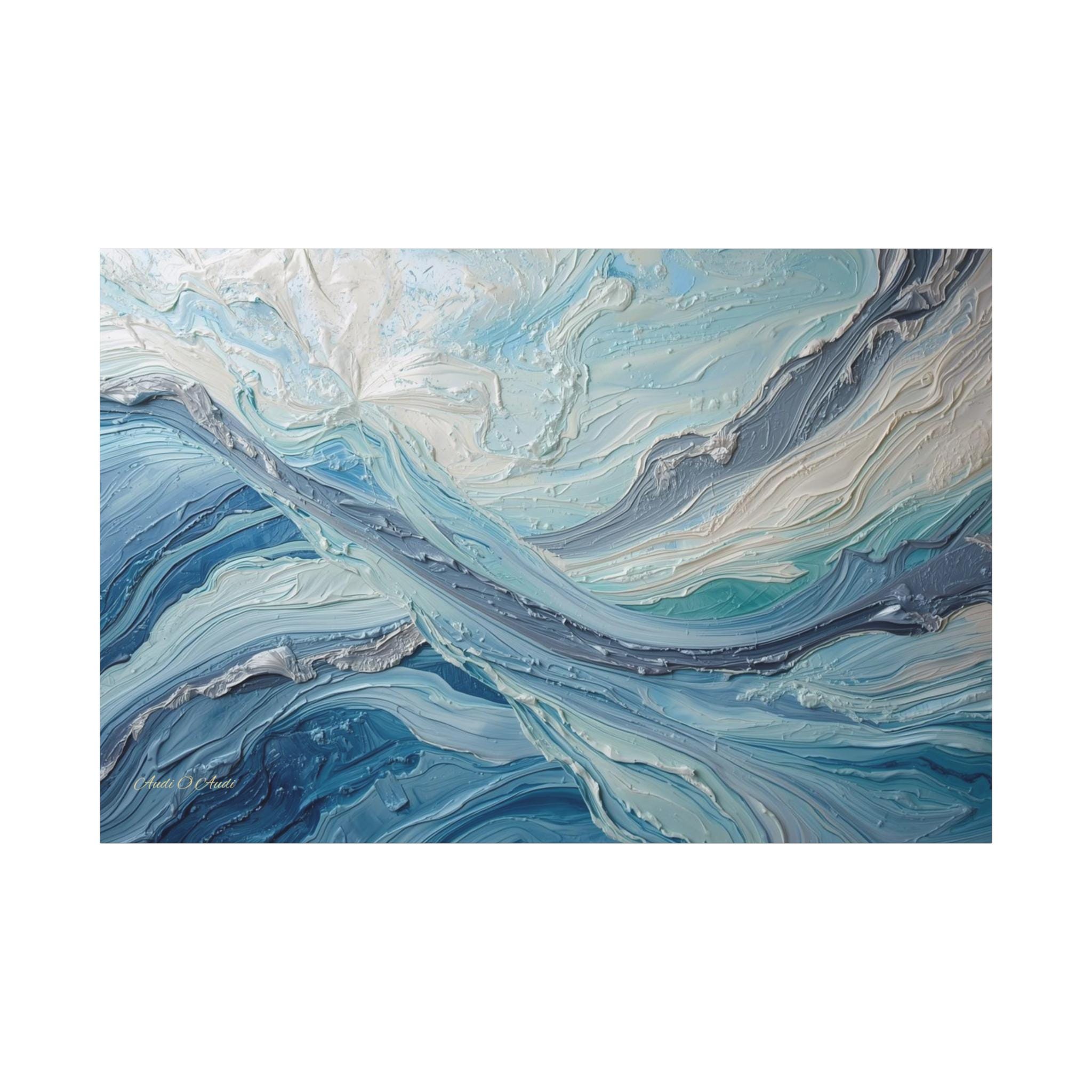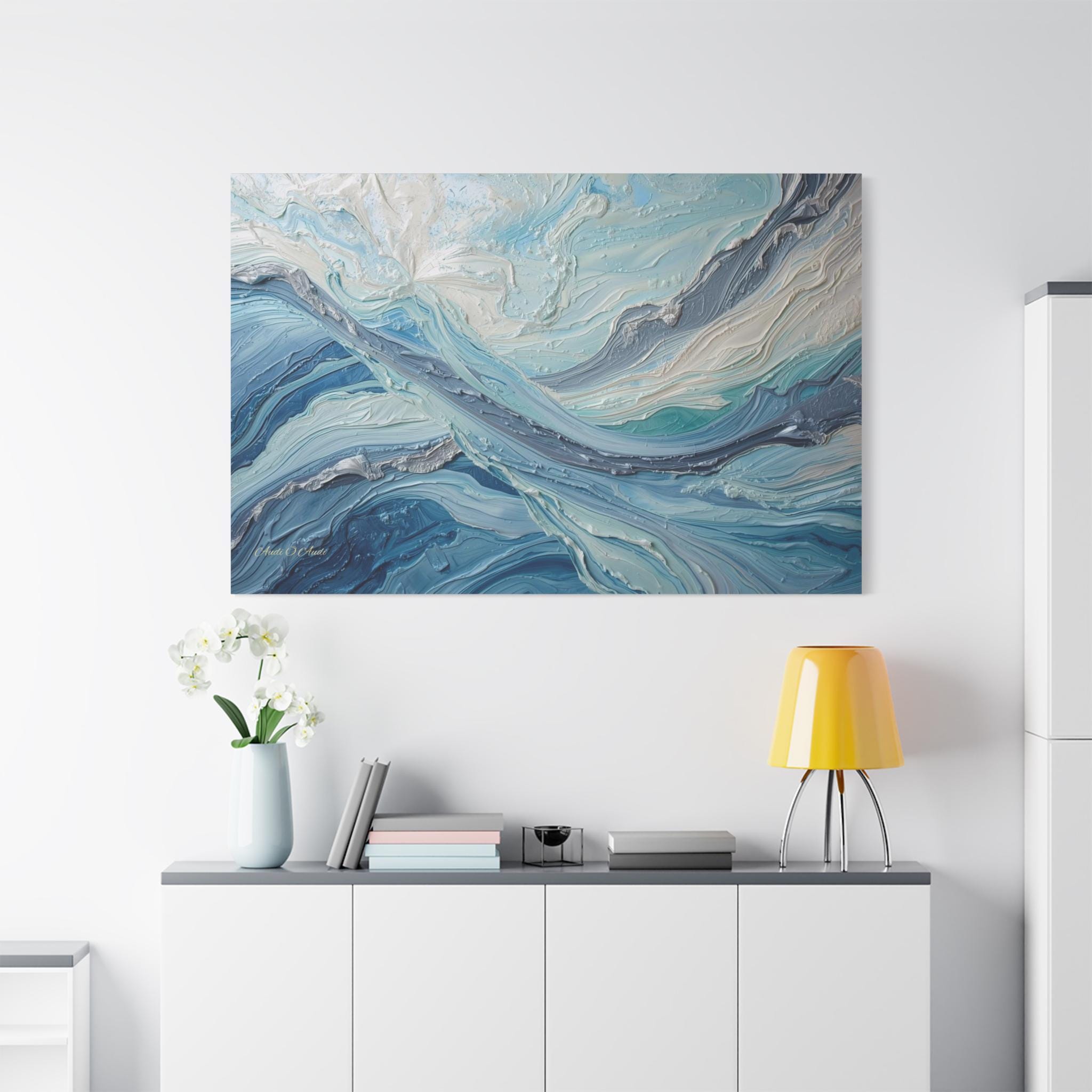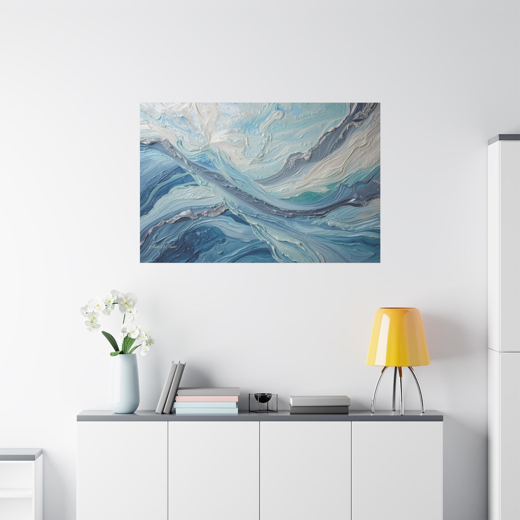 The Art & Technique: Originally executed using a precise Impasto technique, this print beautifully reproduces the long, directional, and layered strokes of thick paint. The interplay of high-relief white peaks—suggesting foam or bright light—with deep indigo channels creates an incredible sense of depth and energy. The sophisticated palette of Ice White, Steel Gray, Cerulean, and Deep Sea Blue is both calming and dramatically arresting.