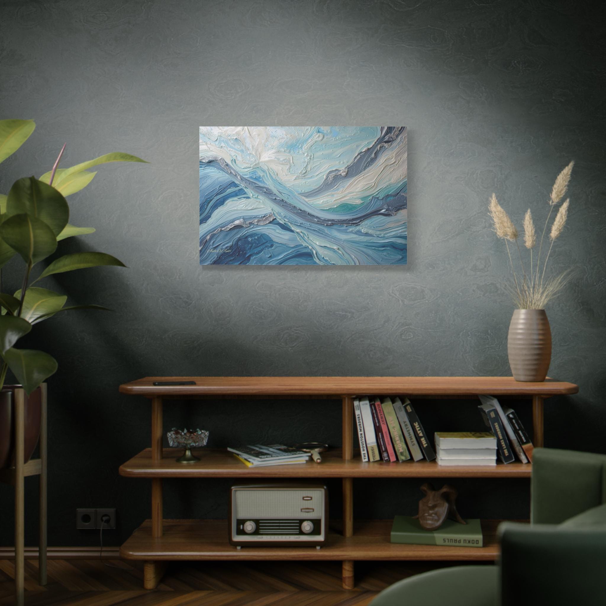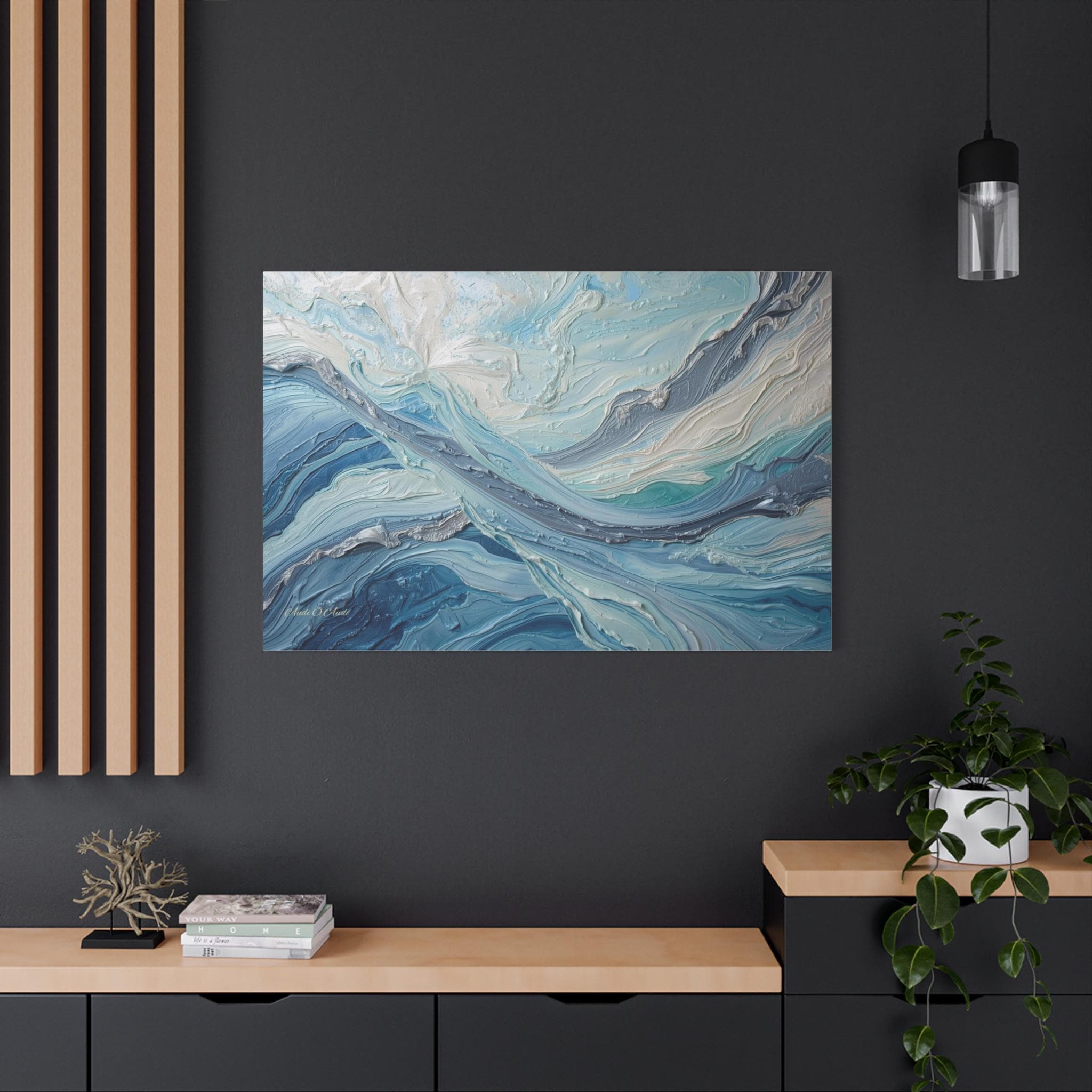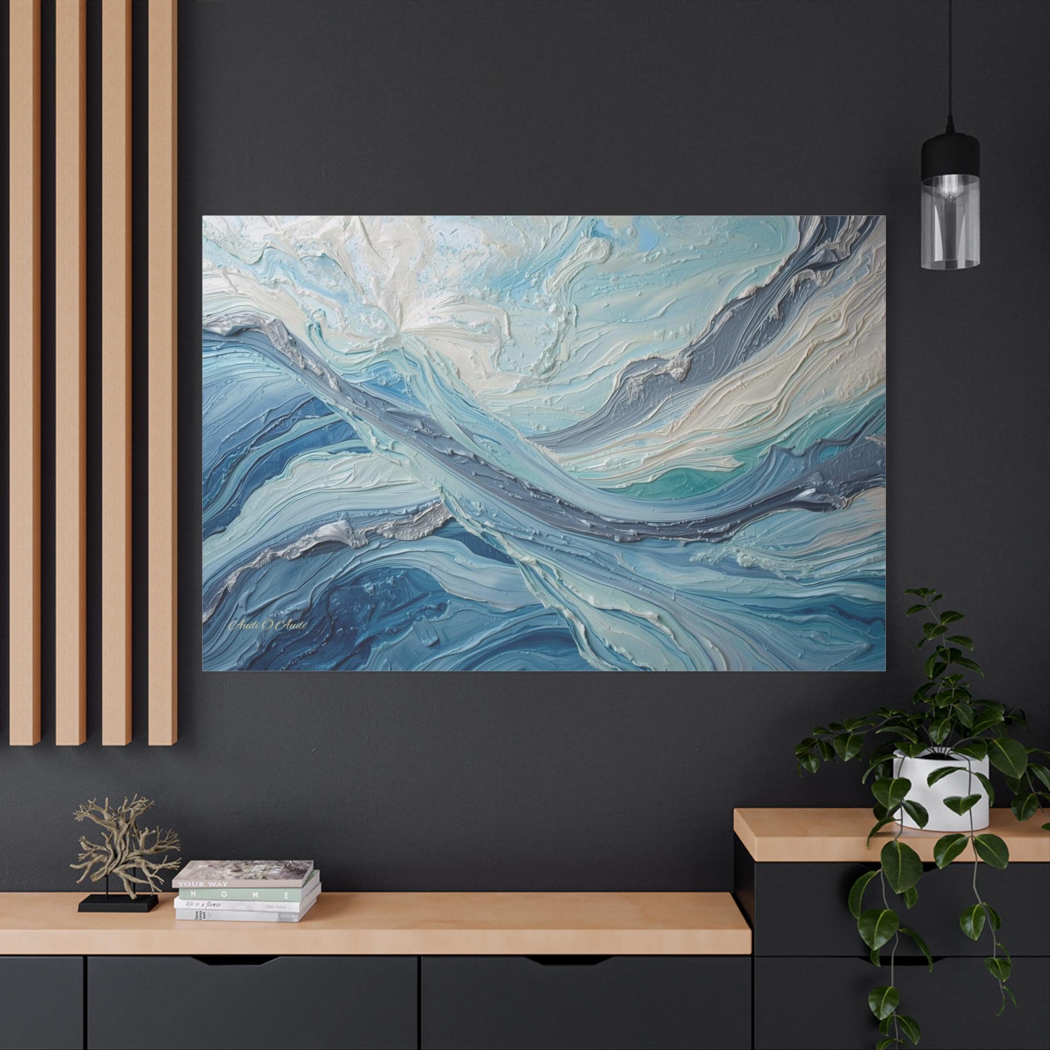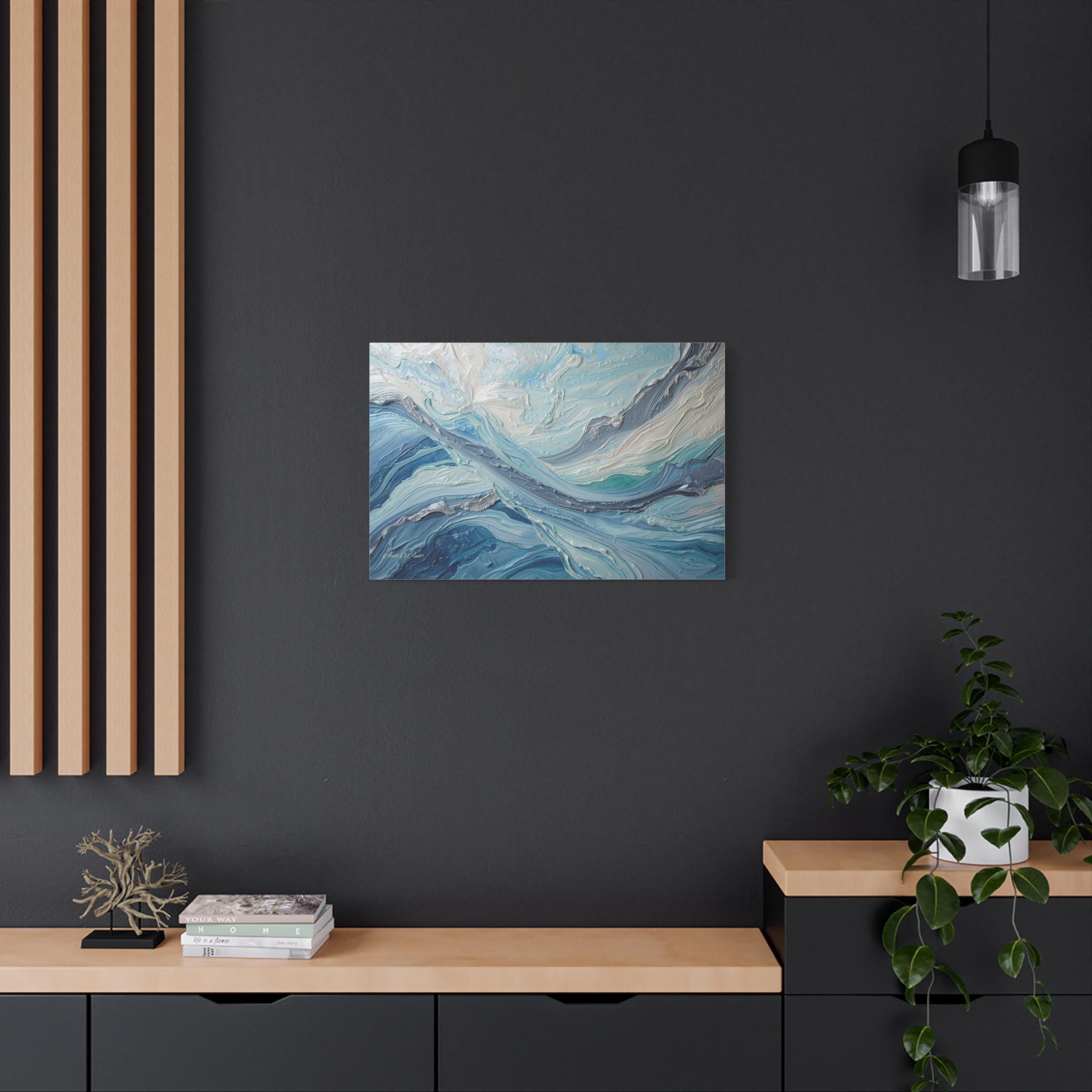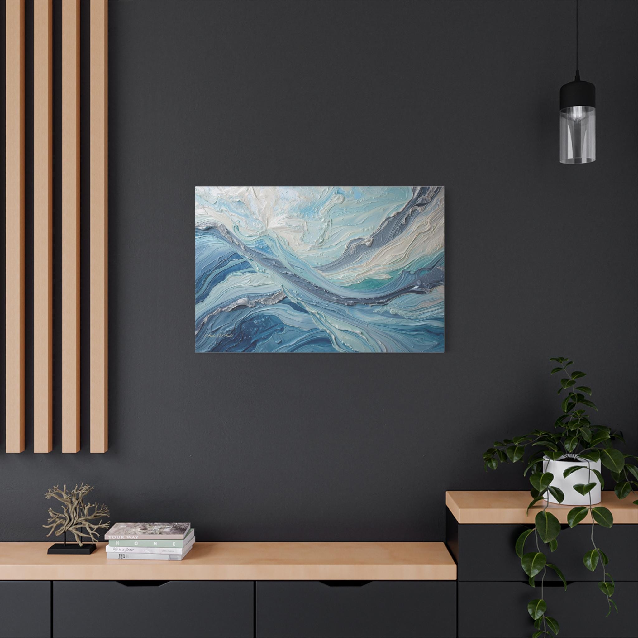 The Art & Technique: Originally executed using a precise Impasto technique, this print beautifully reproduces the long, directional, and layered strokes of thick paint. The interplay of high-relief white peaks—suggesting foam or bright light—with deep indigo channels creates an incredible sense of depth and energy. The sophisticated palette of Ice White, Steel Gray, Cerulean, and Deep Sea Blue is both calming and dramatically arresting.