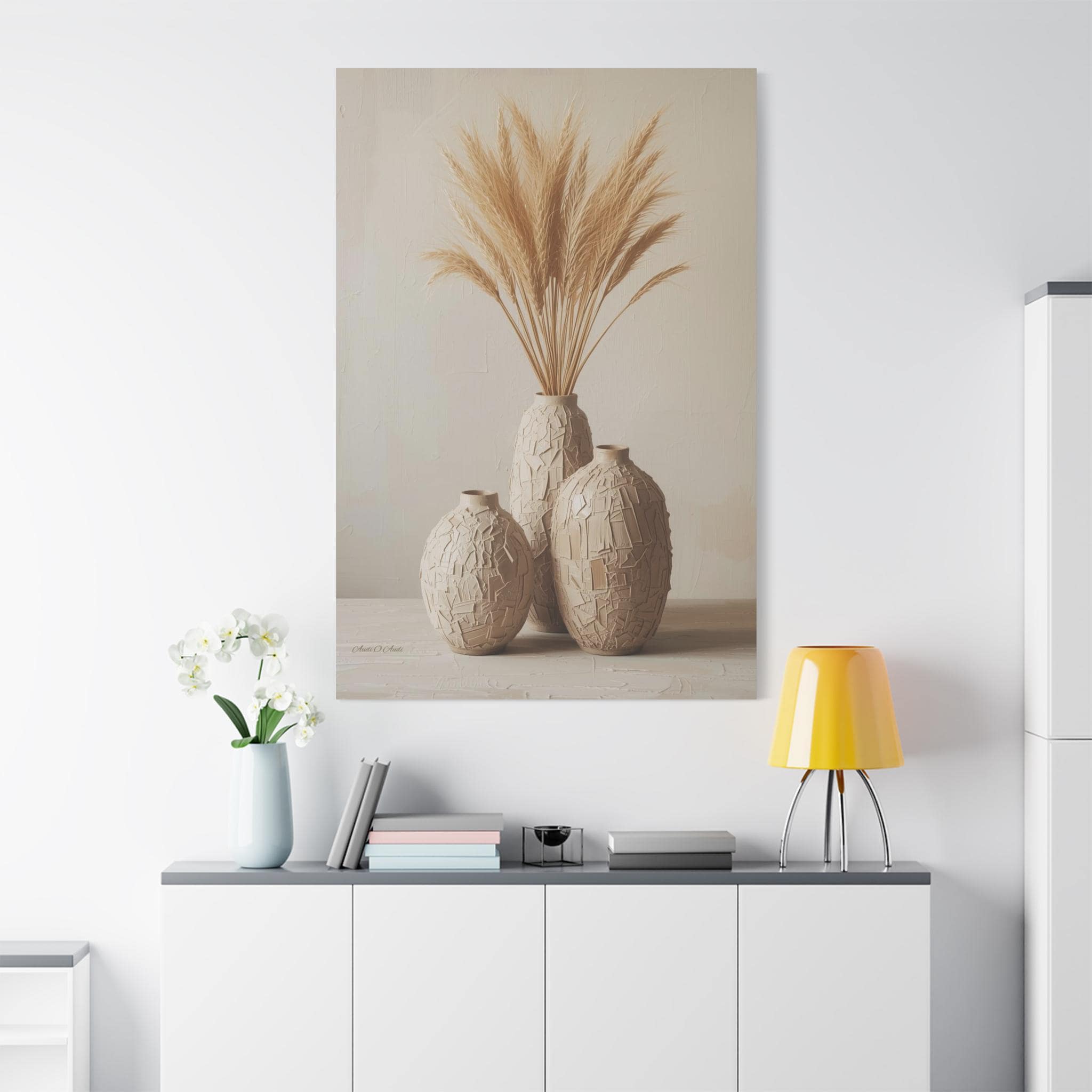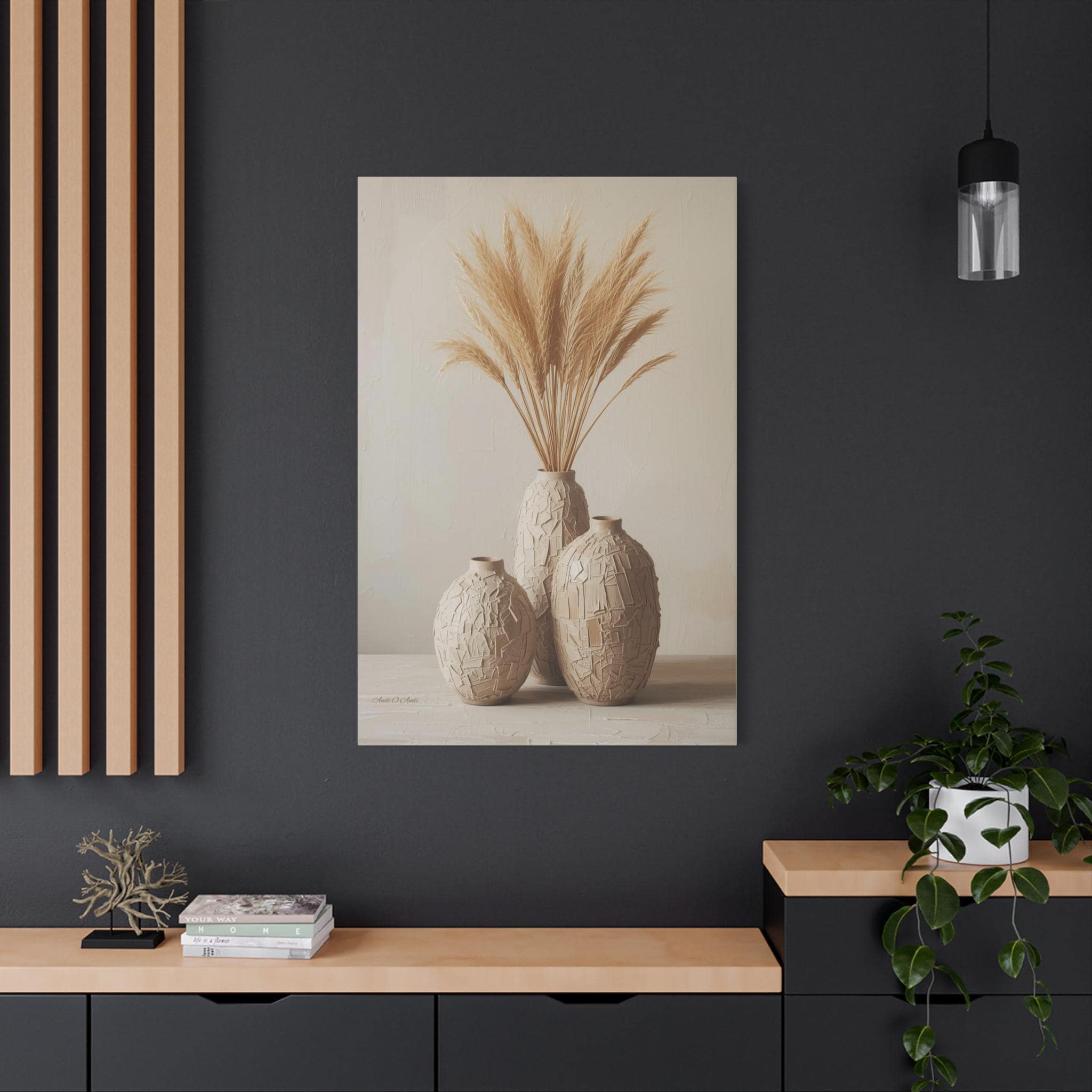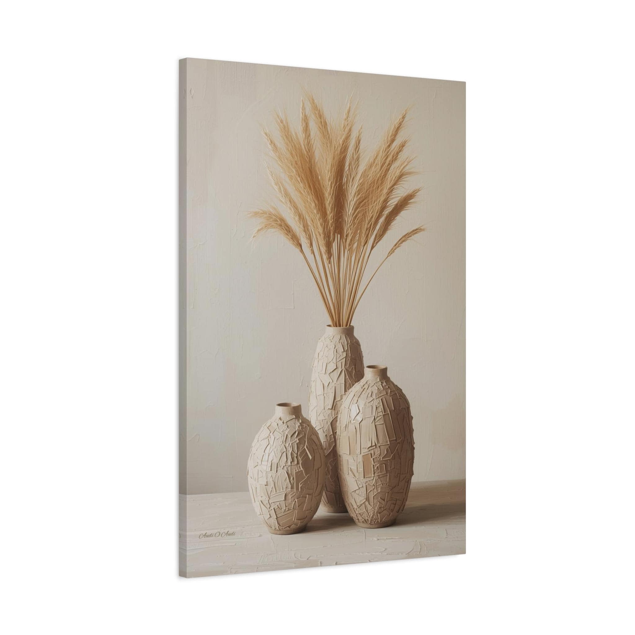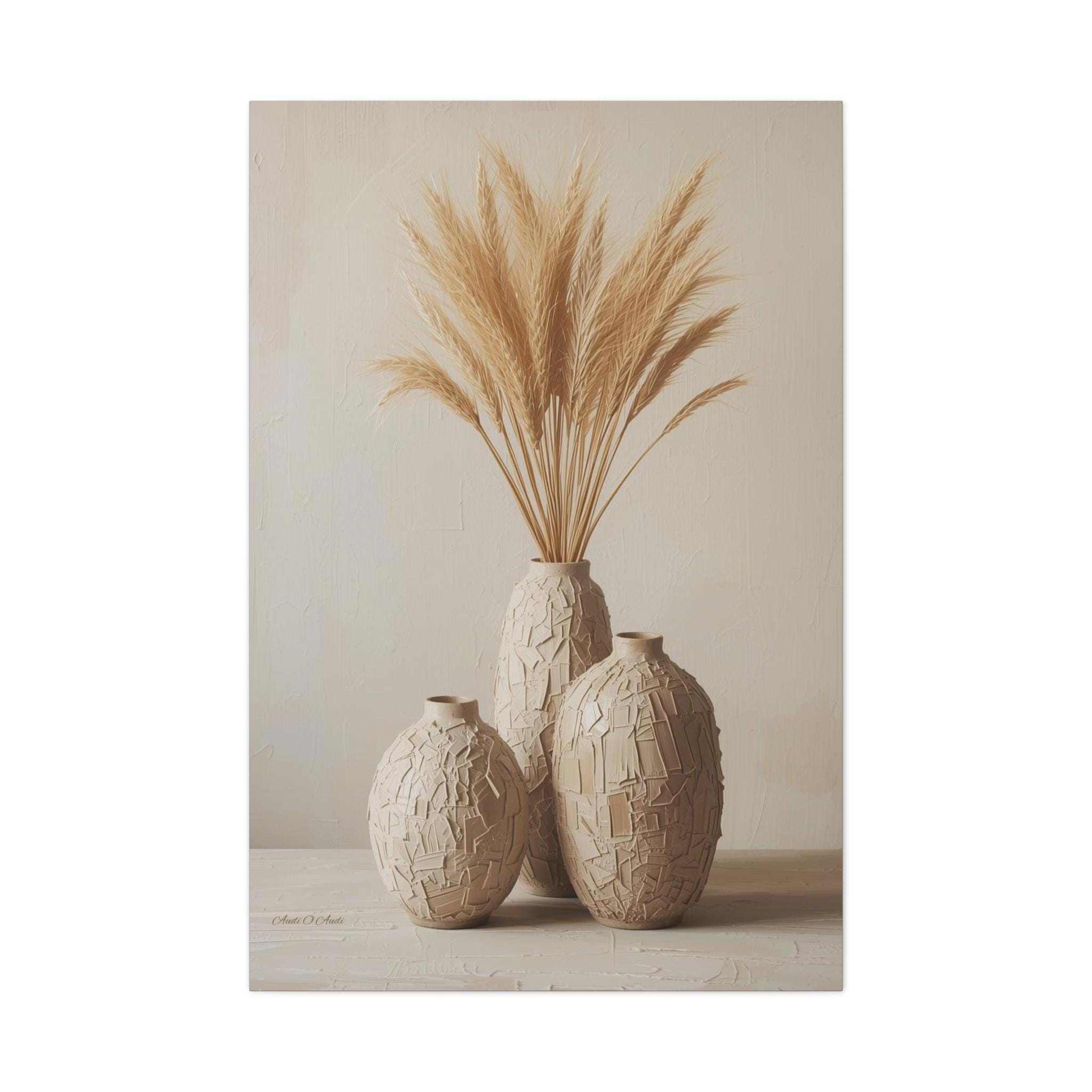 Elevate your interior with this tranquil yet architecturally fascinating canvas print. "Patchwork Stillness" showcases a trio of sculptural earthenware vessels, each rendered in a distinctive mosaic-like Impasto technique, set against a serene neutral backdrop and crowned by the wispy elegance of dried wheat.