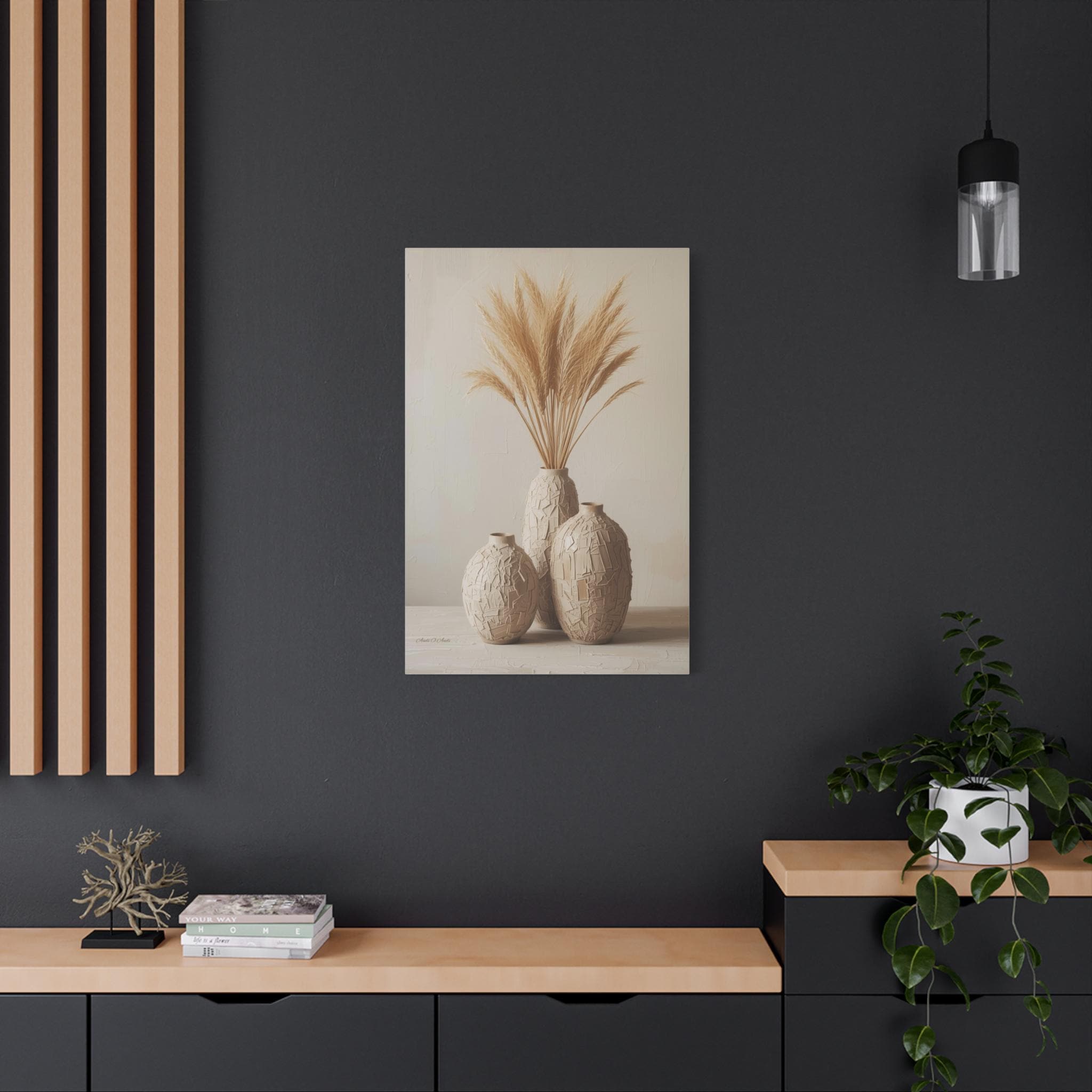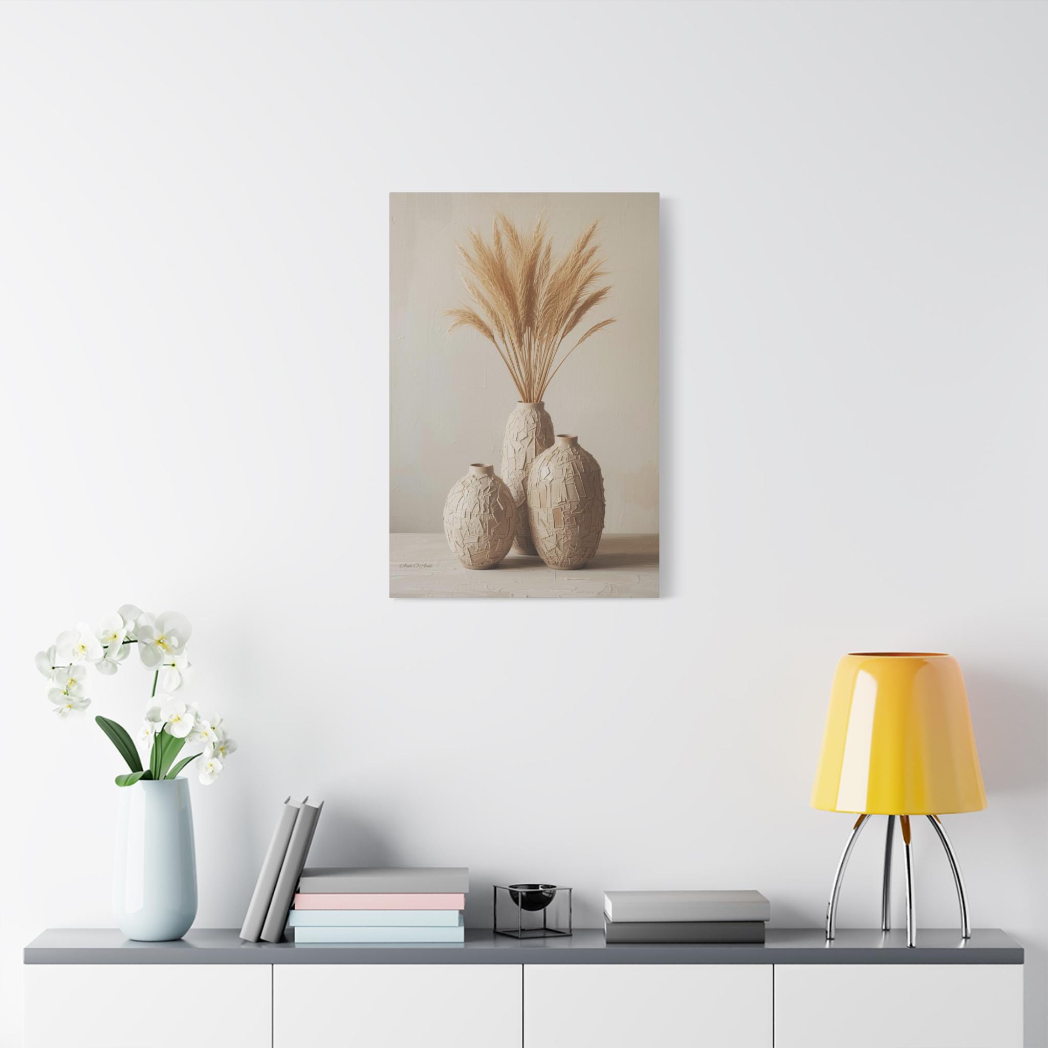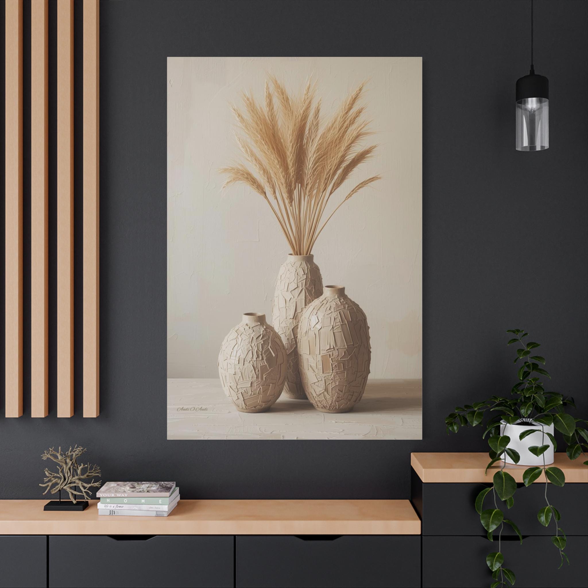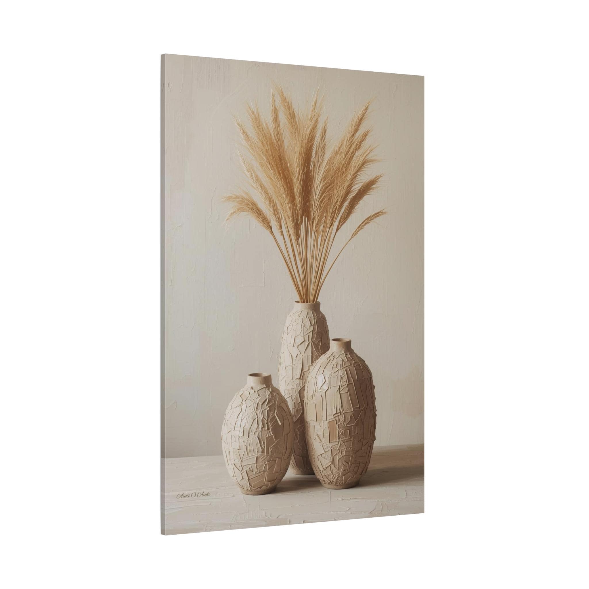 Elevate your interior with this tranquil yet architecturally fascinating canvas print. "Patchwork Stillness" showcases a trio of sculptural earthenware vessels, each rendered in a distinctive mosaic-like Impasto technique, set against a serene neutral backdrop and crowned by the wispy elegance of dried wheat.