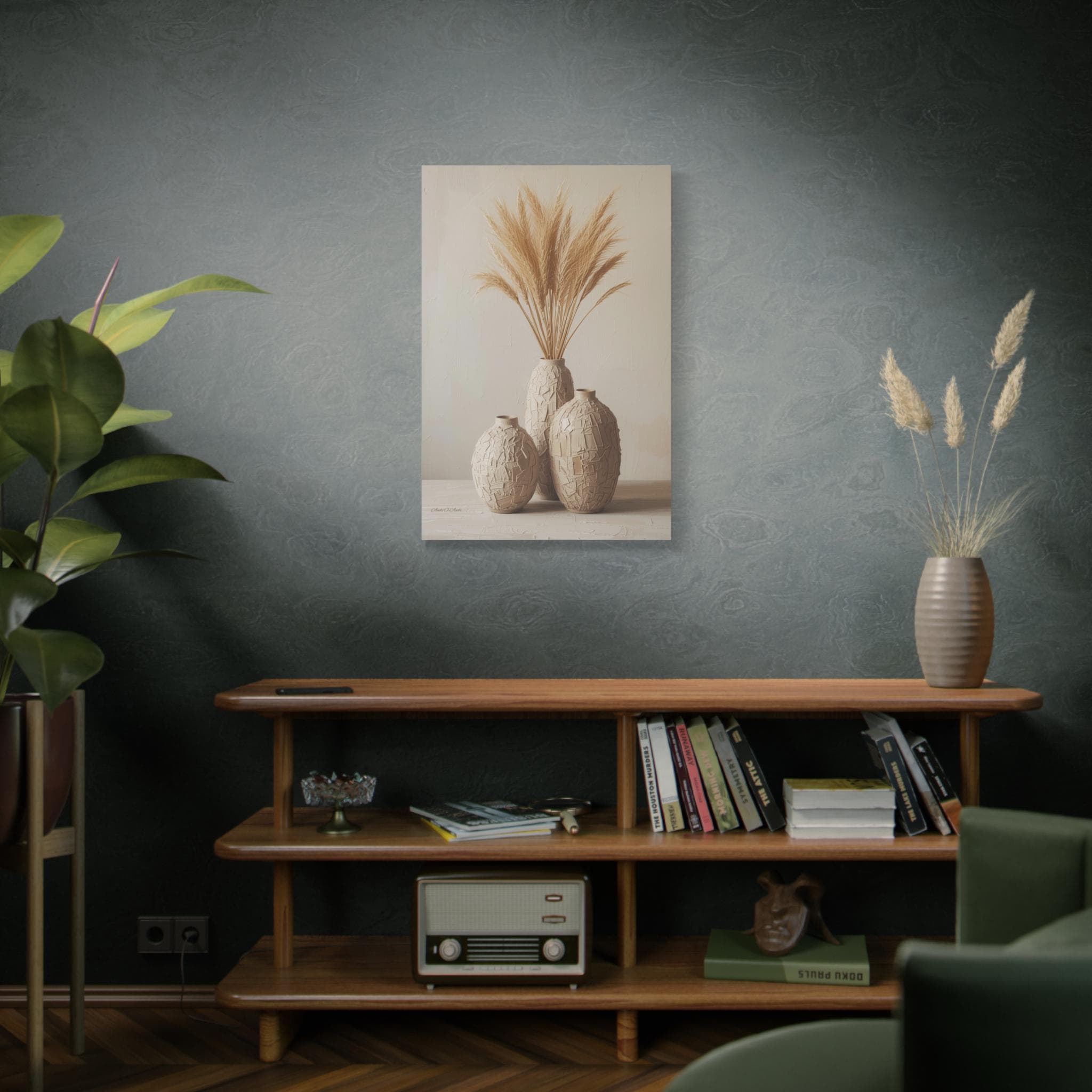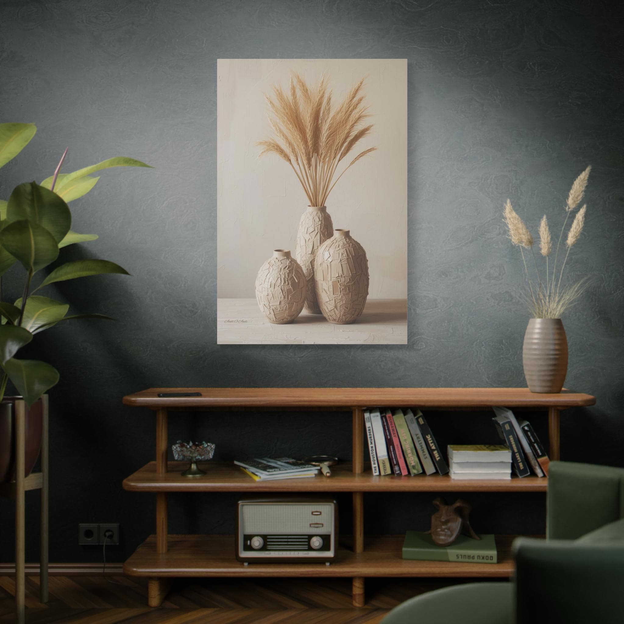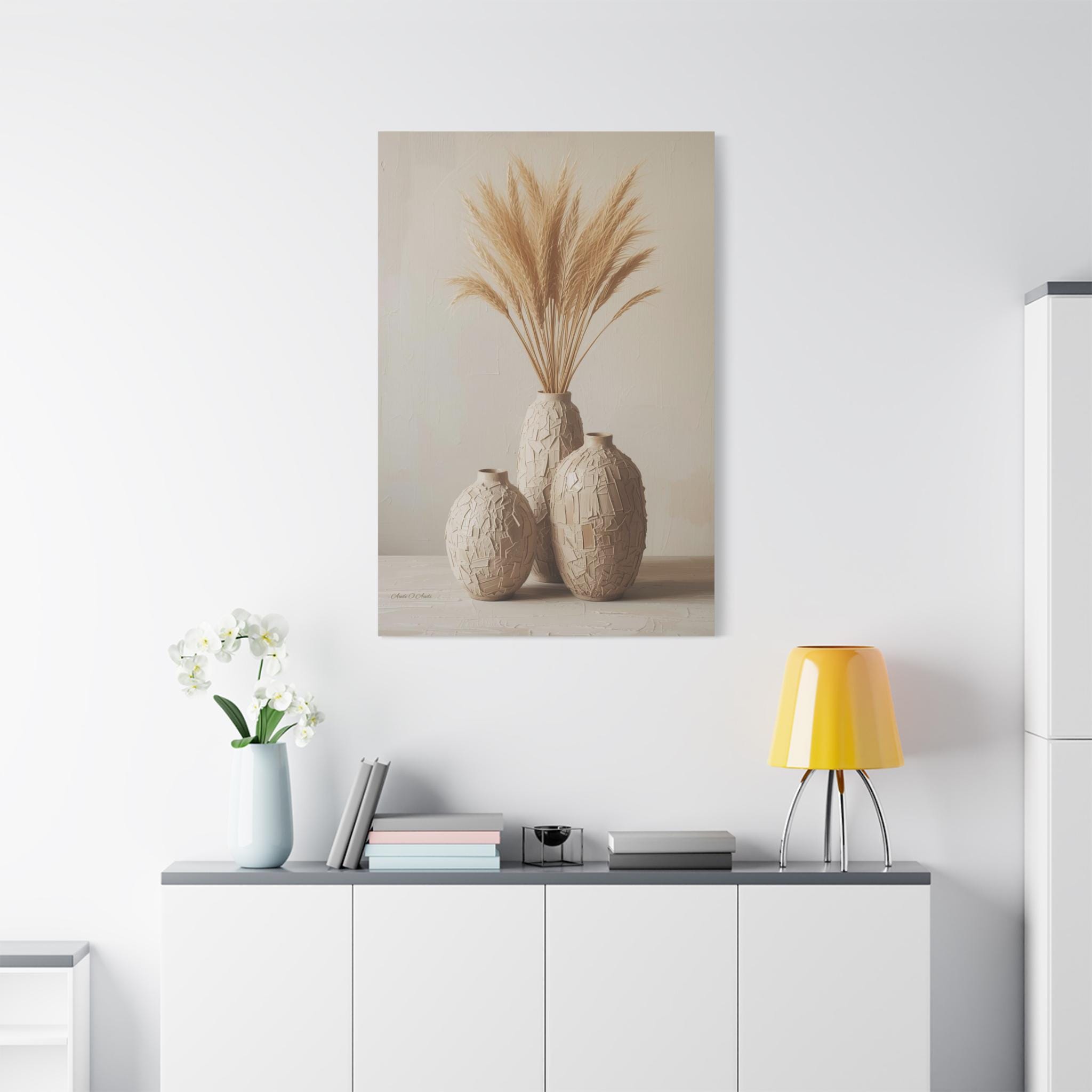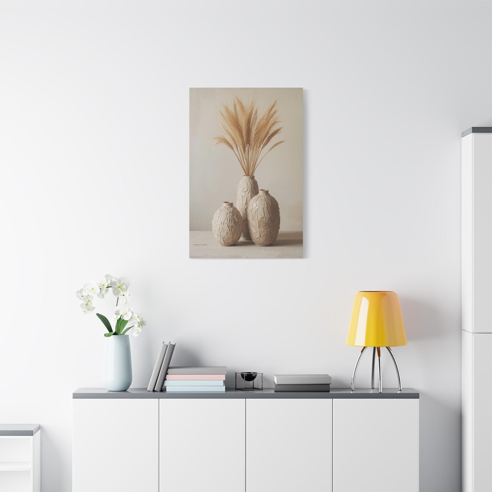 Elevate your interior with this tranquil yet architecturally fascinating canvas print. "Patchwork Stillness" showcases a trio of sculptural earthenware vessels, each rendered in a distinctive mosaic-like Impasto technique, set against a serene neutral backdrop and crowned by the wispy elegance of dried wheat.