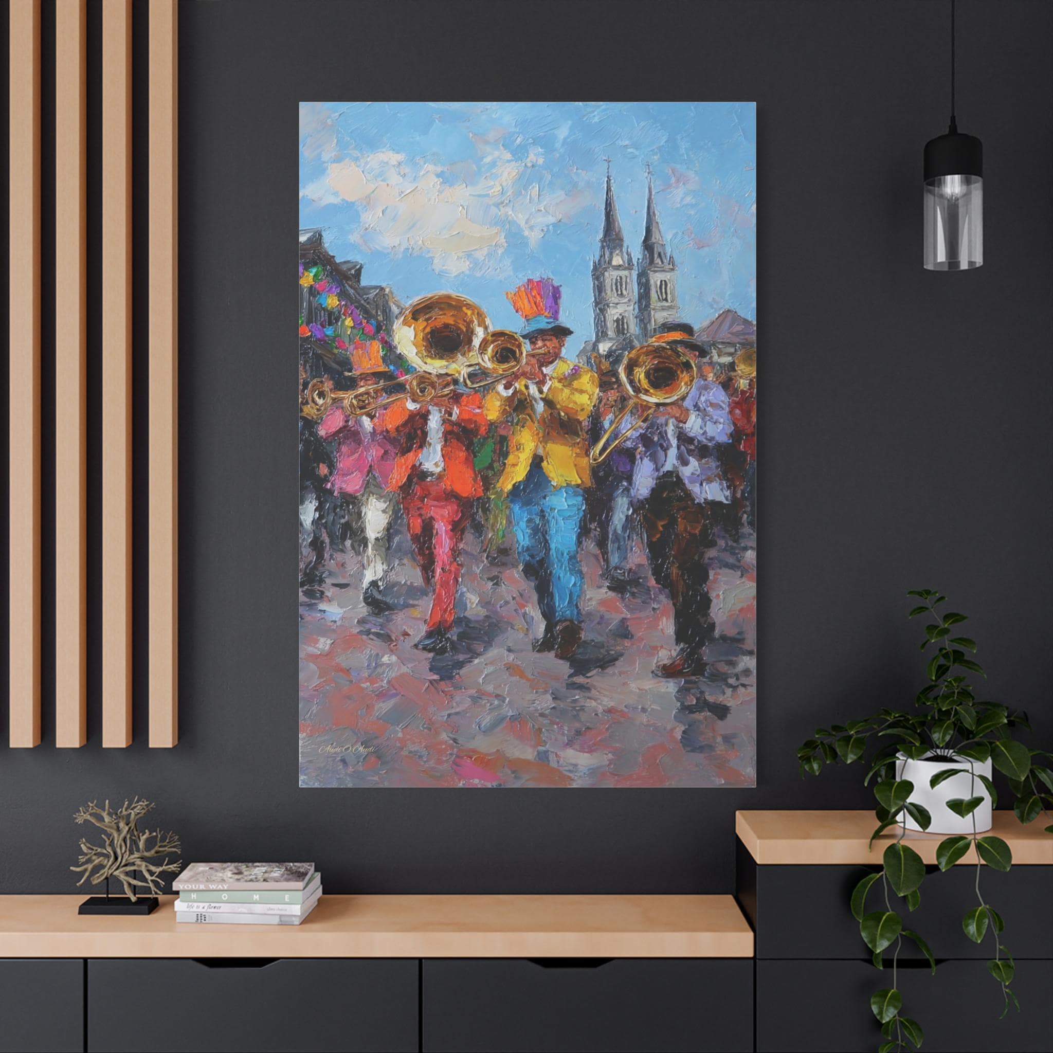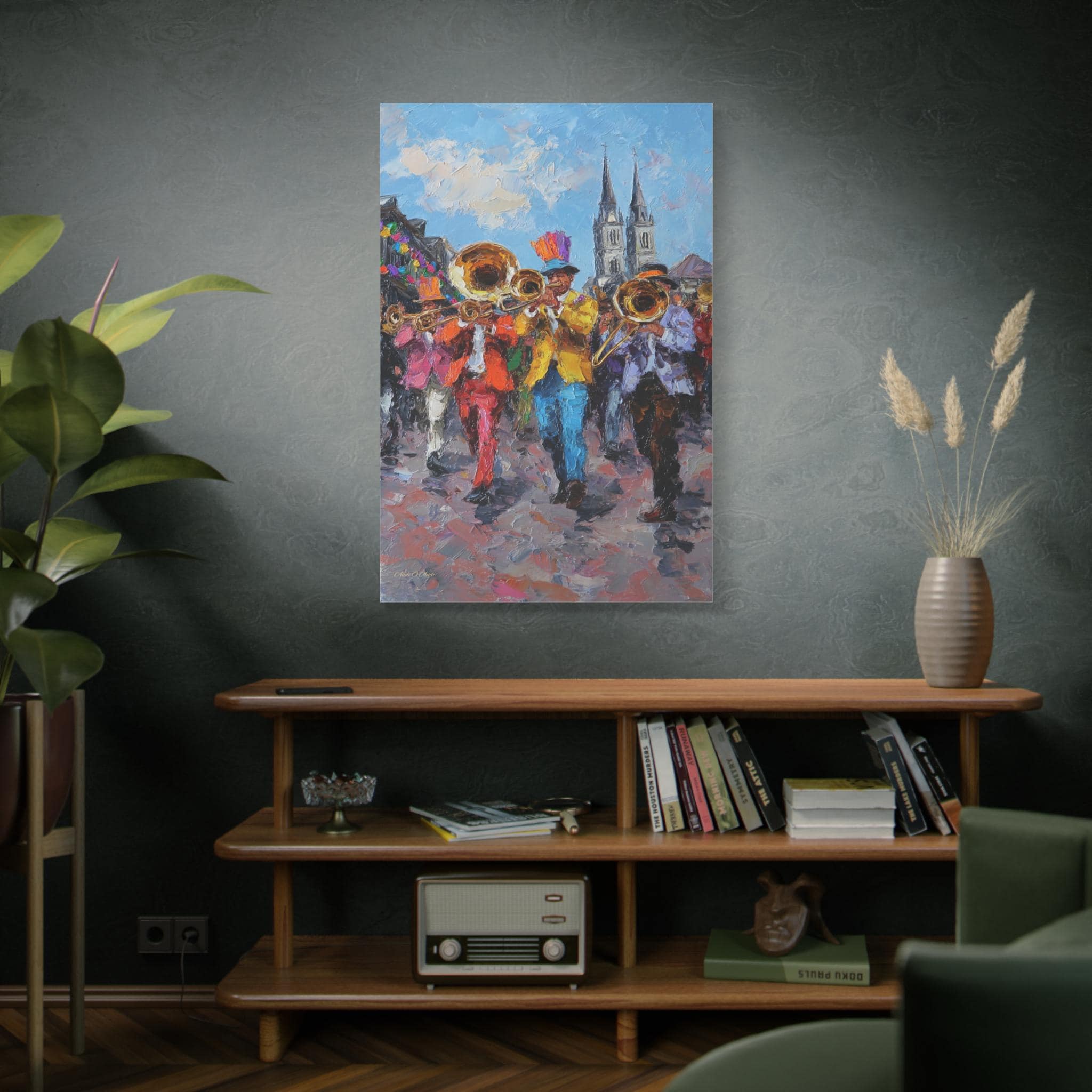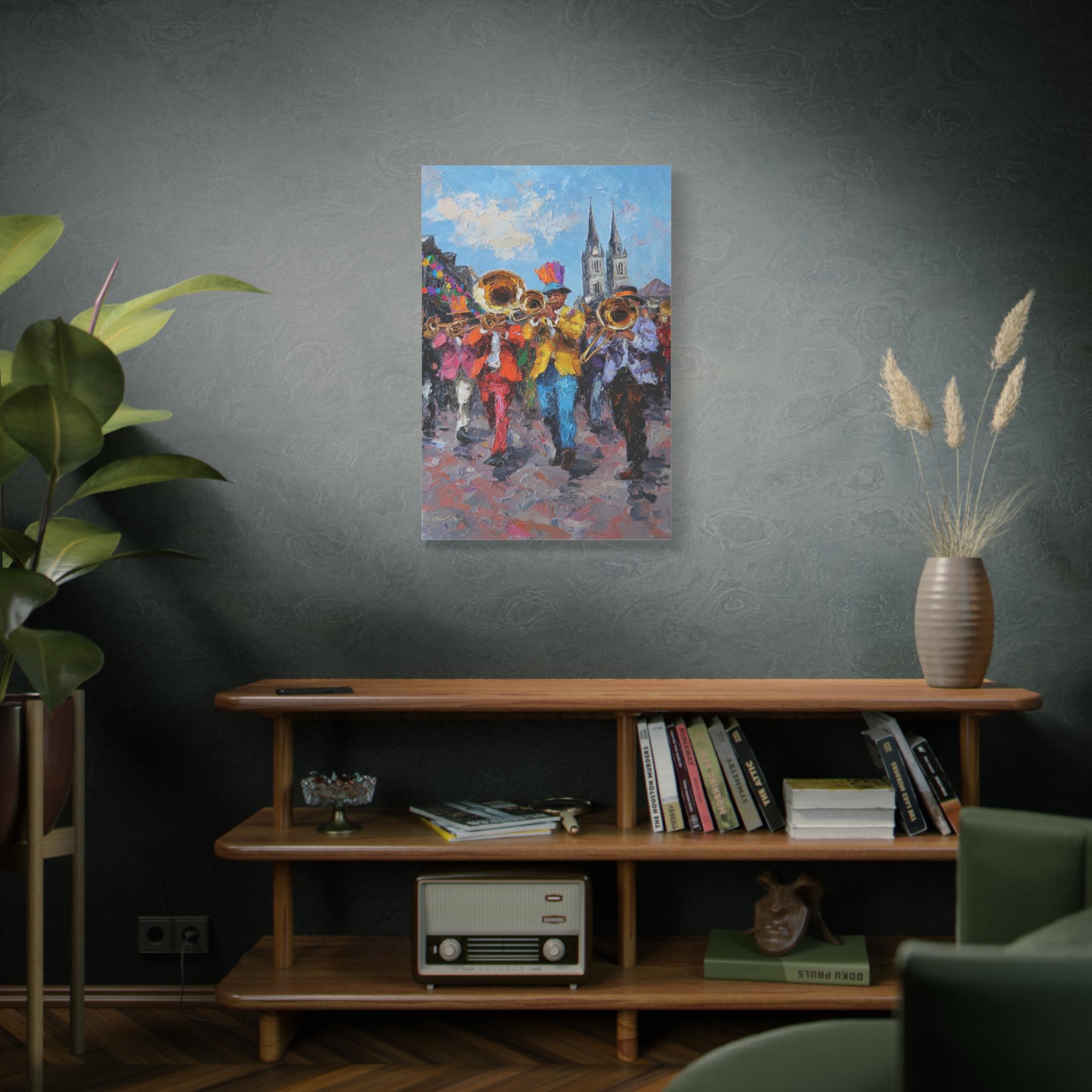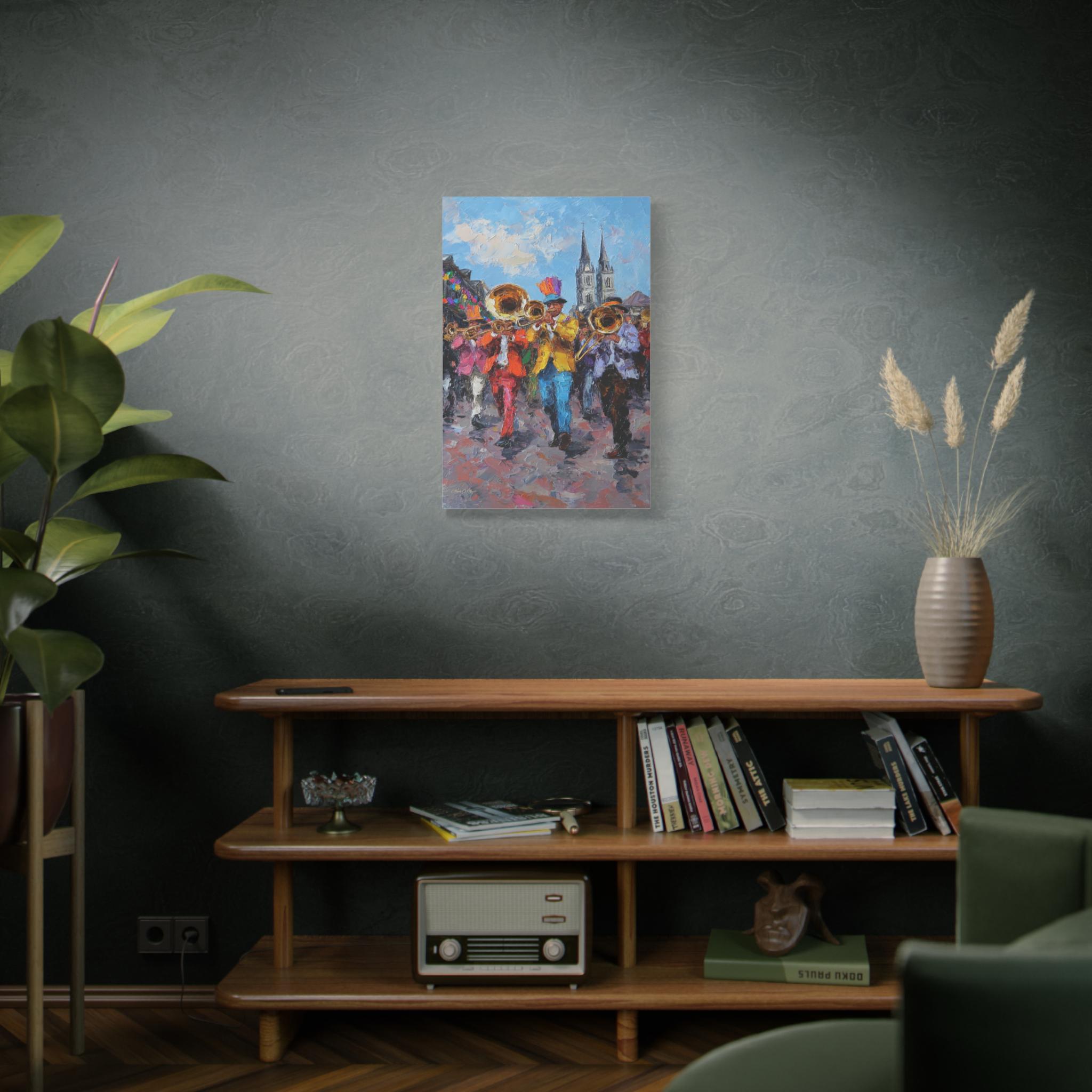 Bring the spirited sound and infectious rhythm of the streets home with this exhilarating canvas print. "Second Line Tempo" captures a moment of pure celebration, featuring a brightly dressed brass band marching forward with powerful, collective energy, set against the historic towers of a distant city.
