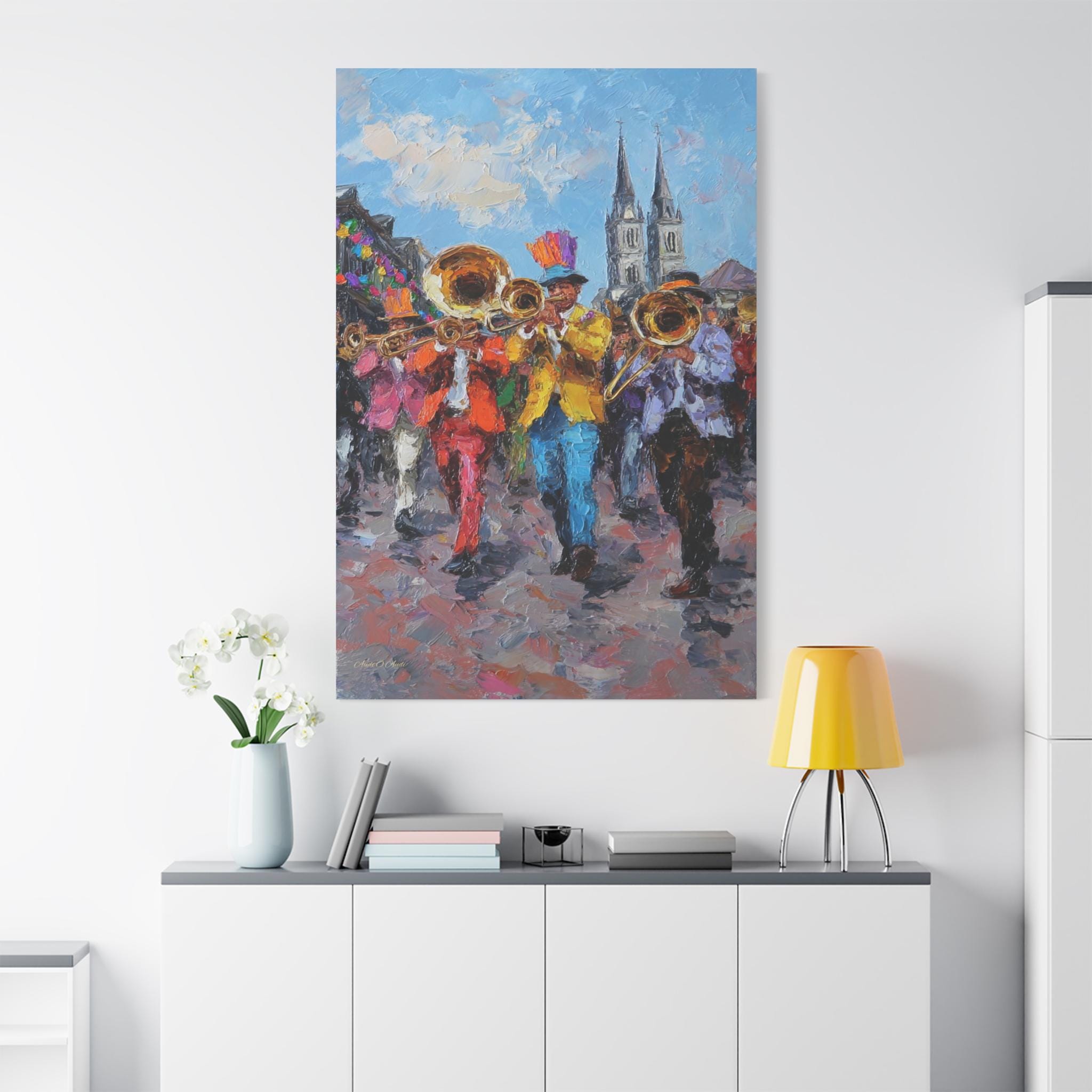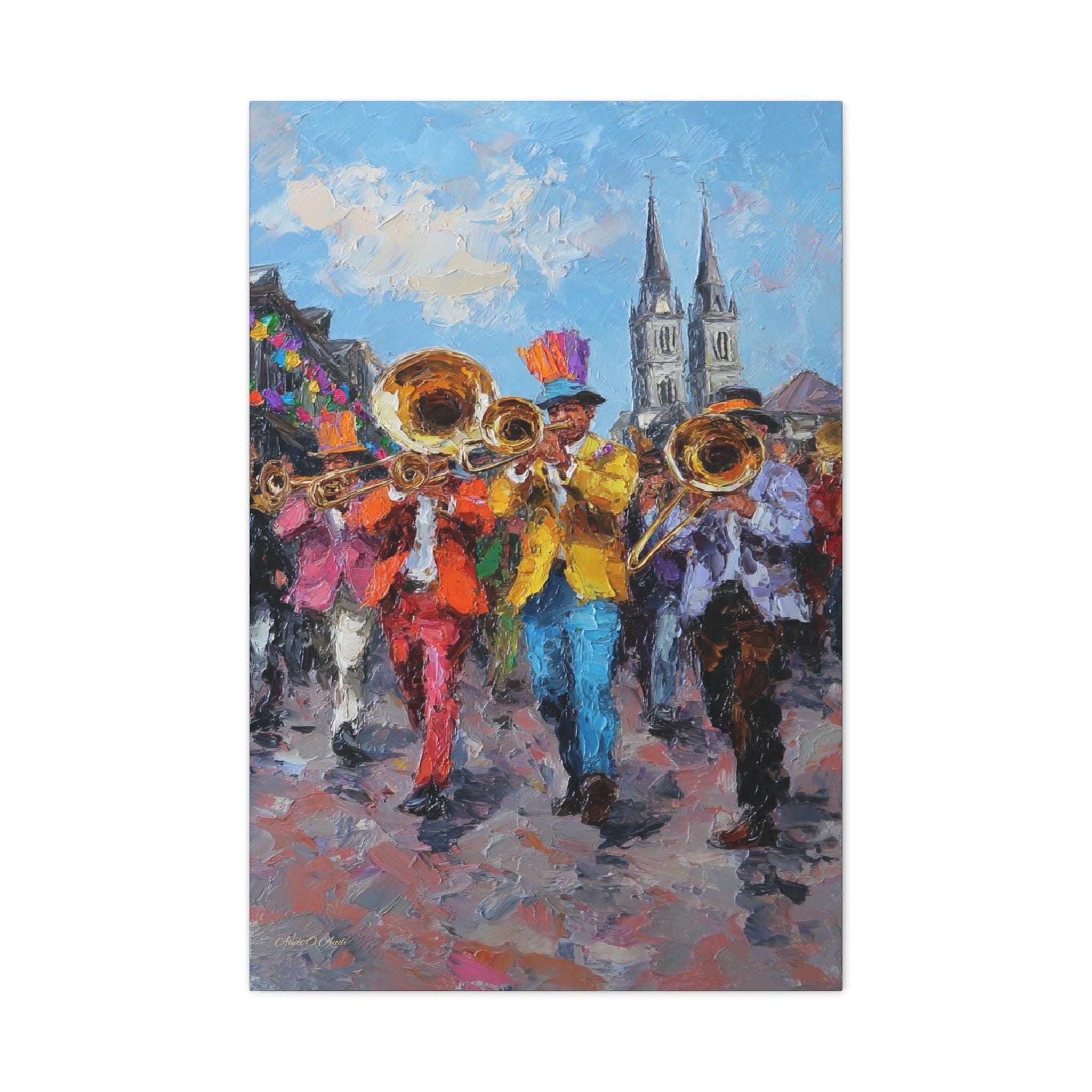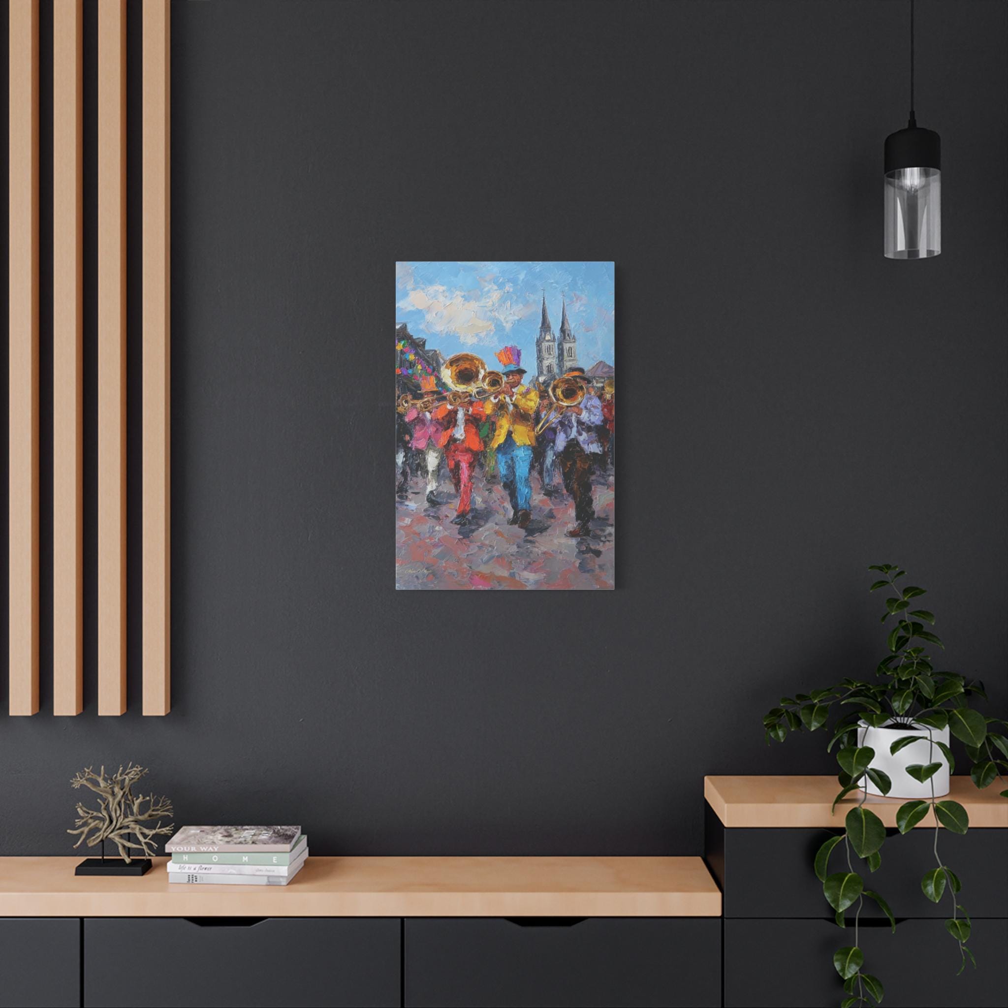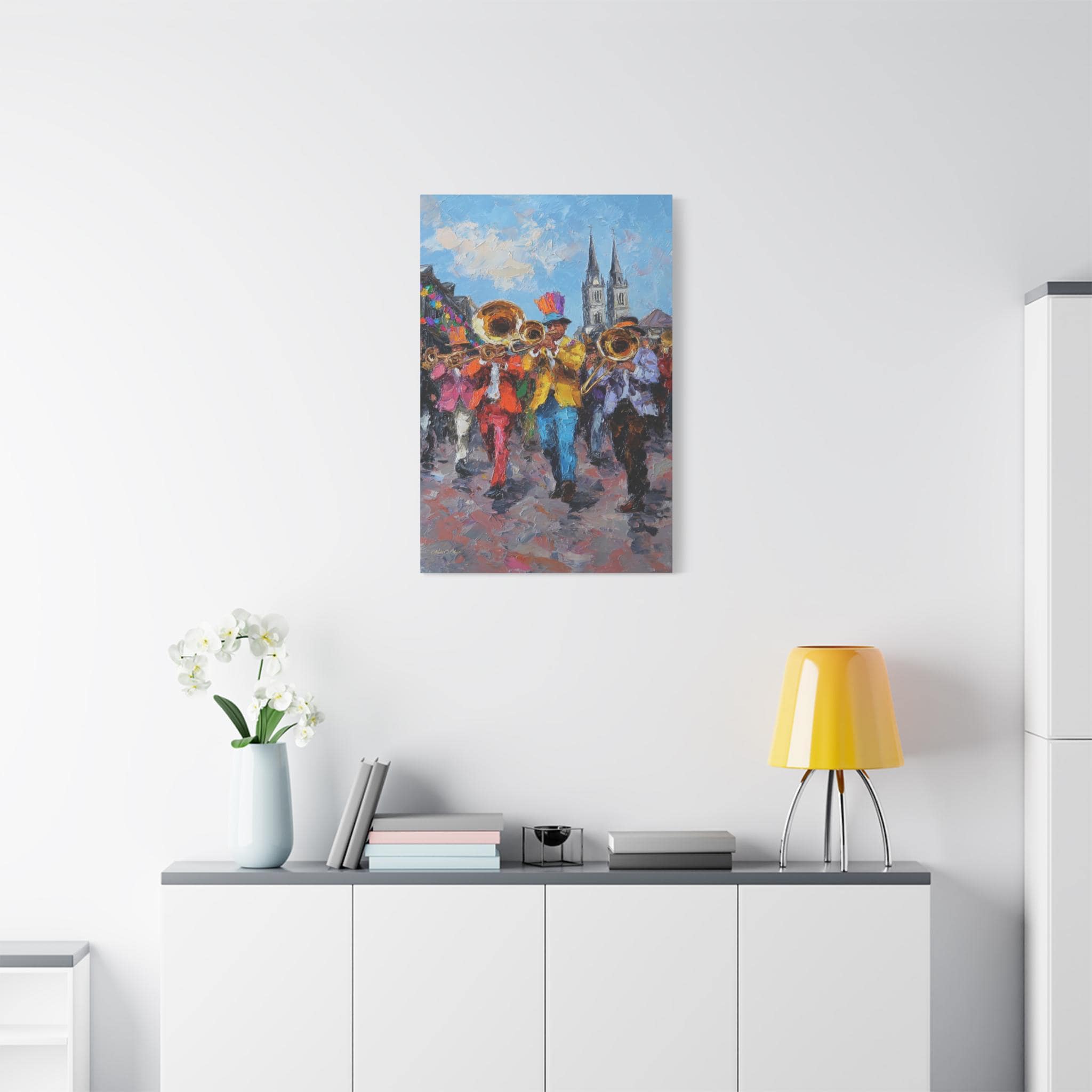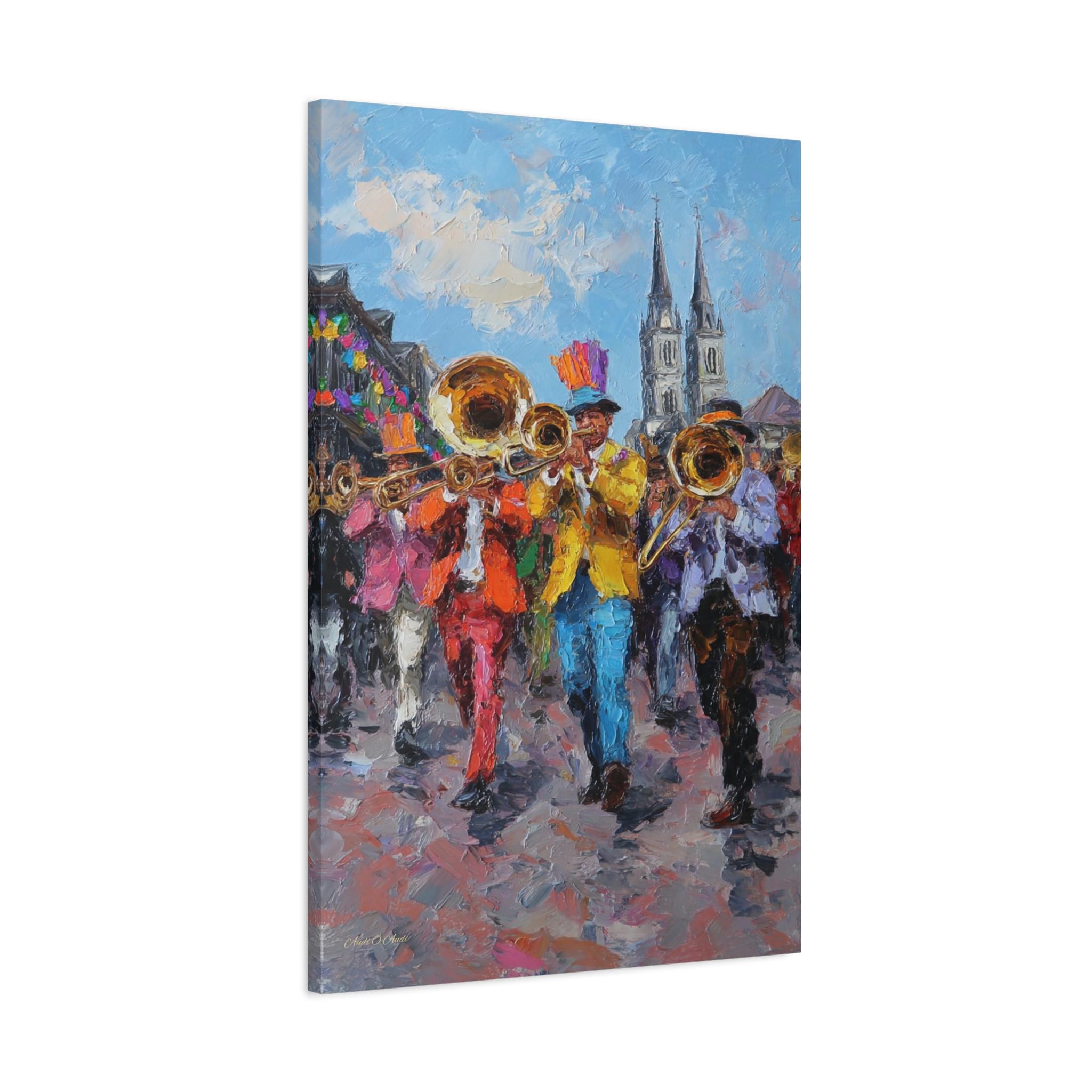 Bring the spirited sound and infectious rhythm of the streets home with this exhilarating canvas print. "Second Line Tempo" captures a moment of pure celebration, featuring a brightly dressed brass band marching forward with powerful, collective energy, set against the historic towers of a distant city.