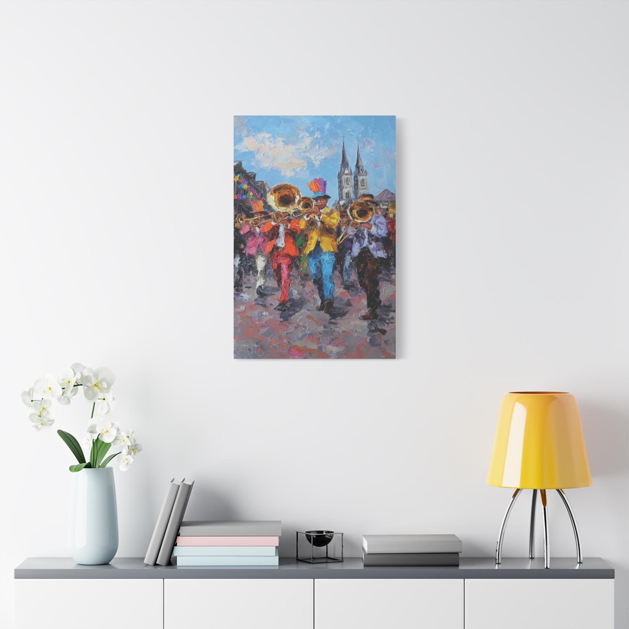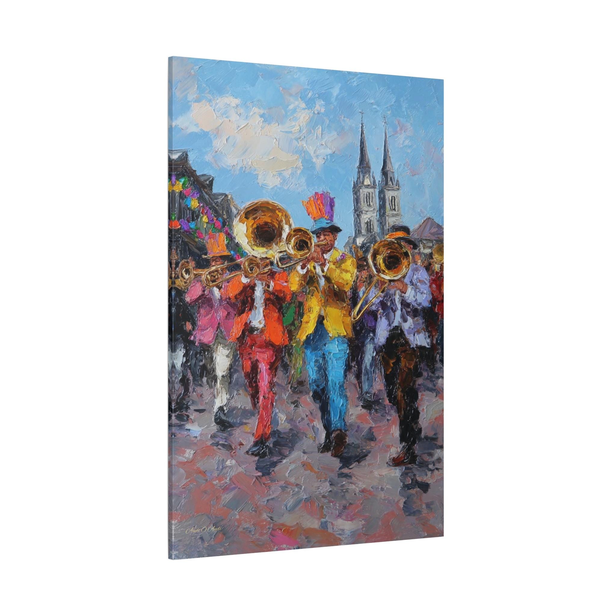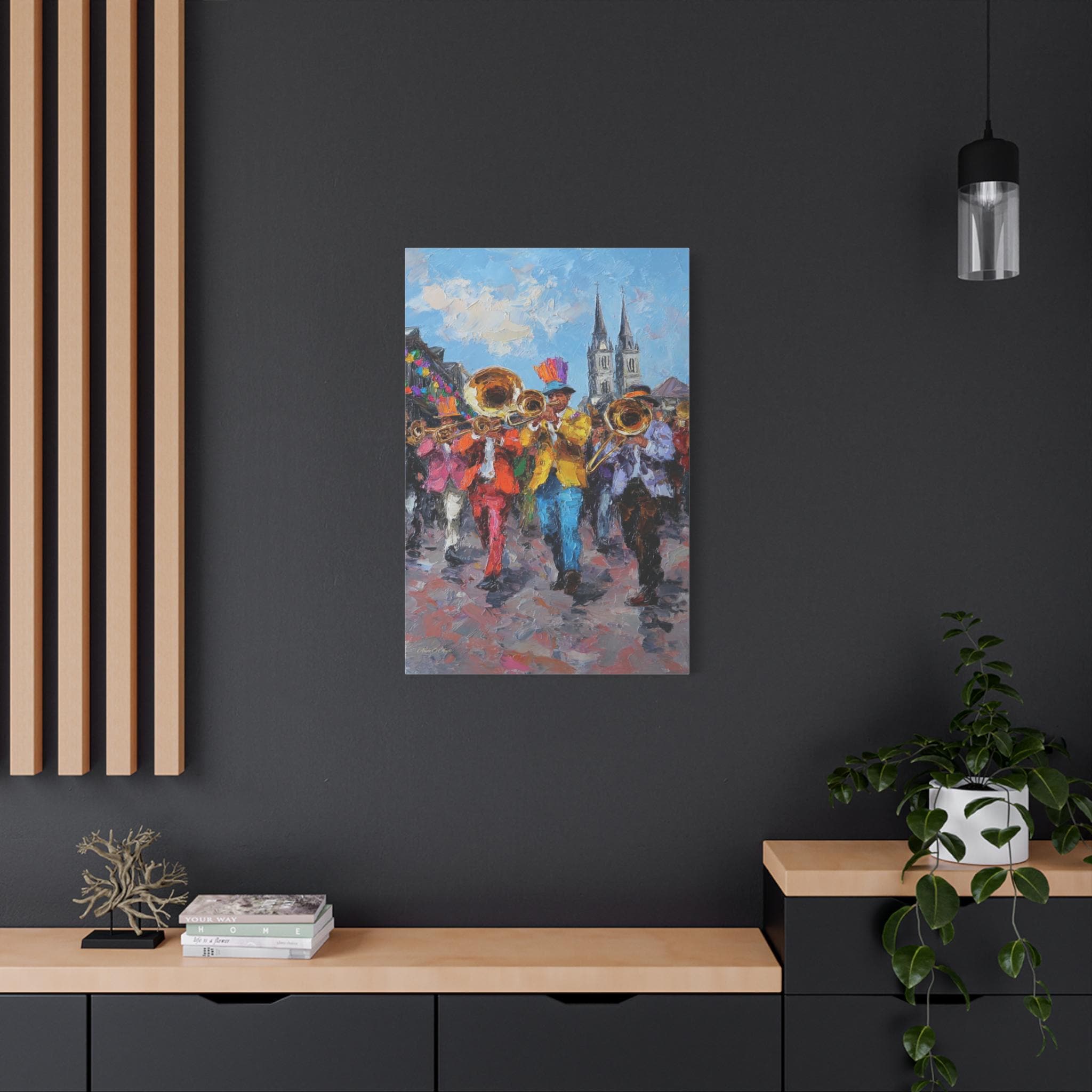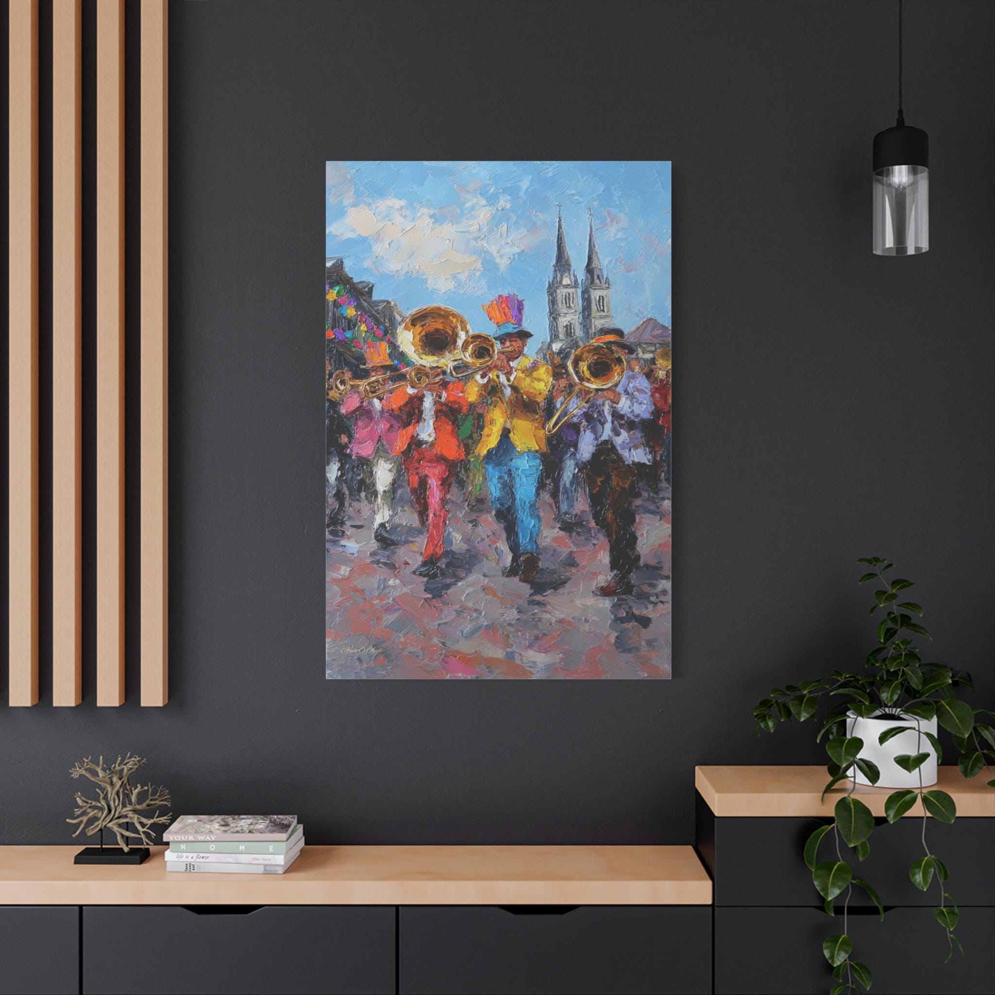 Bring the spirited sound and infectious rhythm of the streets home with this exhilarating canvas print. "Second Line Tempo" captures a moment of pure celebration, featuring a brightly dressed brass band marching forward with powerful, collective energy, set against the historic towers of a distant city.