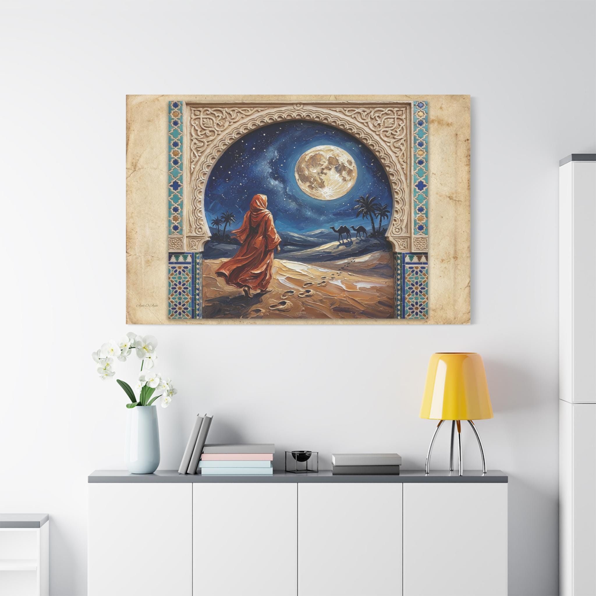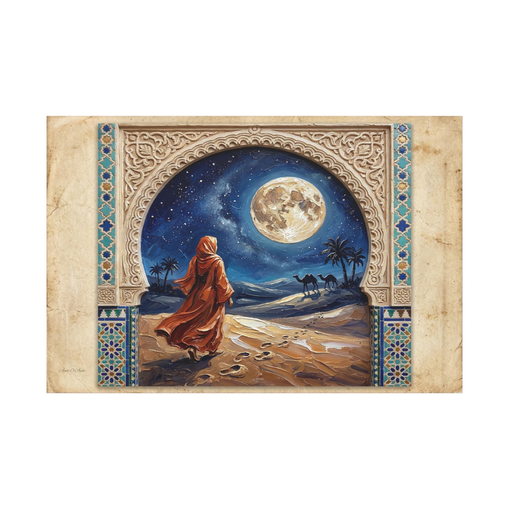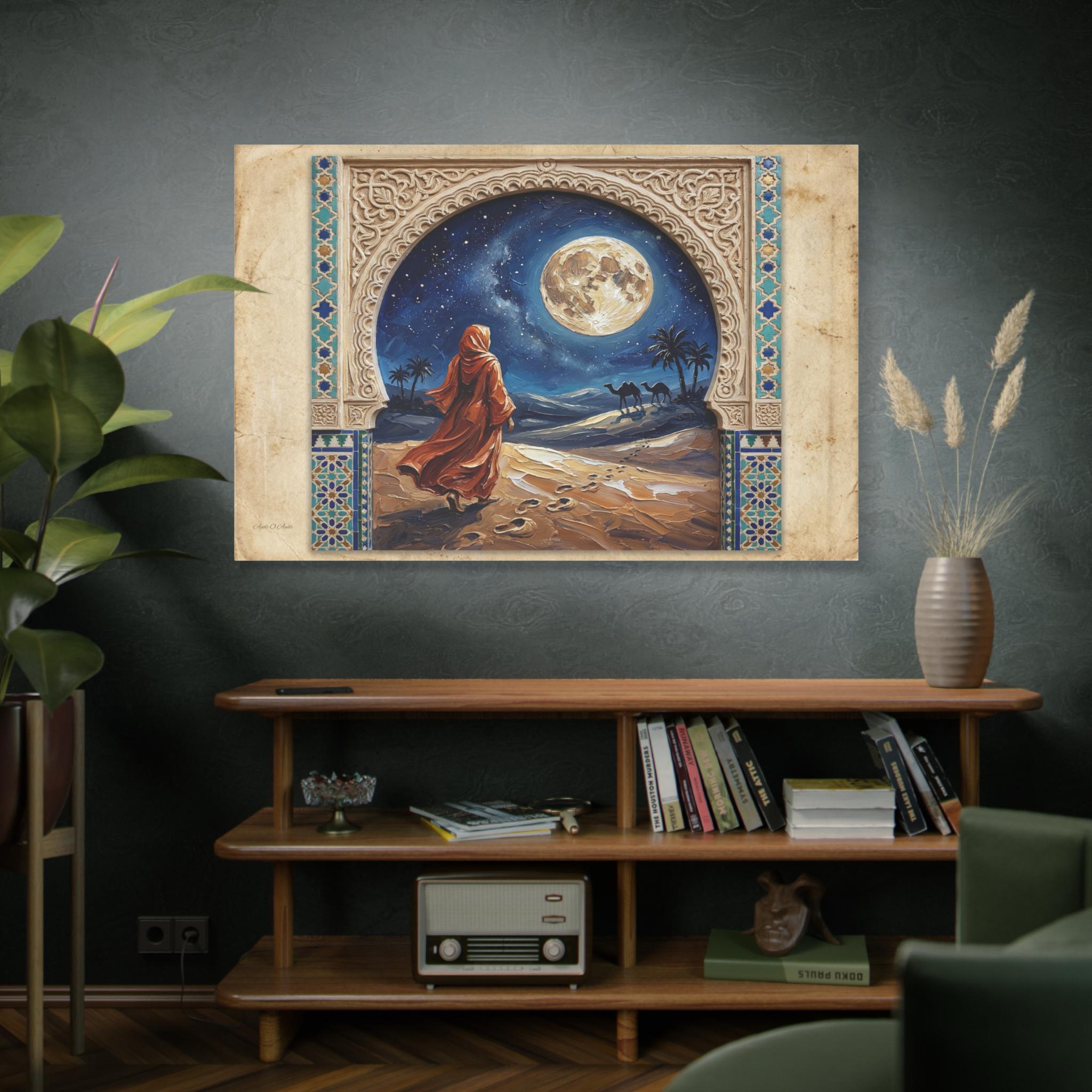 The Art & Technique: The central painting is rendered in an intensely rich Impasto technique, where thick, swirling paint brings the enormous, luminous full moon, the flowing, fiery-orange robes, and the textured desert dunes to life. The high-quality print faithfully reproduces the contrasting textures: the smooth, clean lines of the stylized frame and the dynamic, three-dimensional energy of the central artwork. This creates a mesmerizing effect of looking into a vivid, moonlit dream through an antique window.